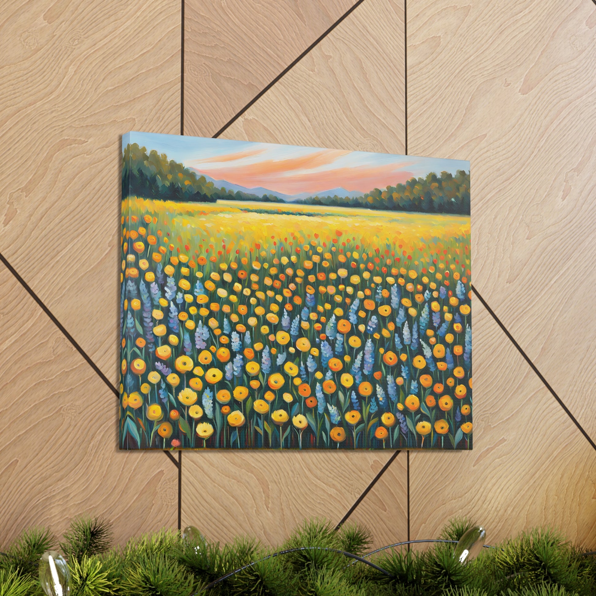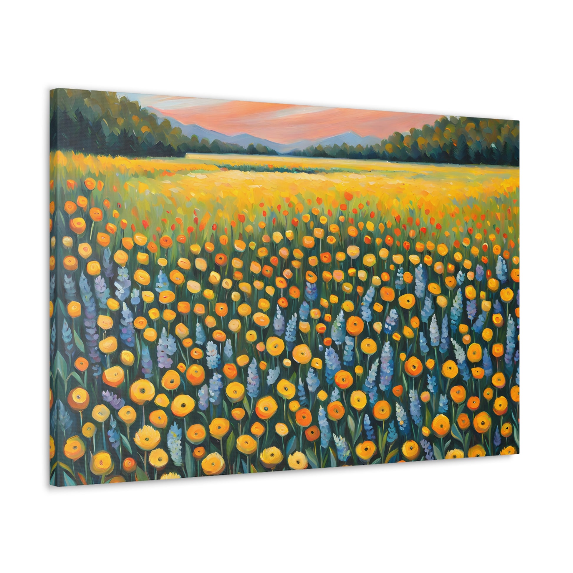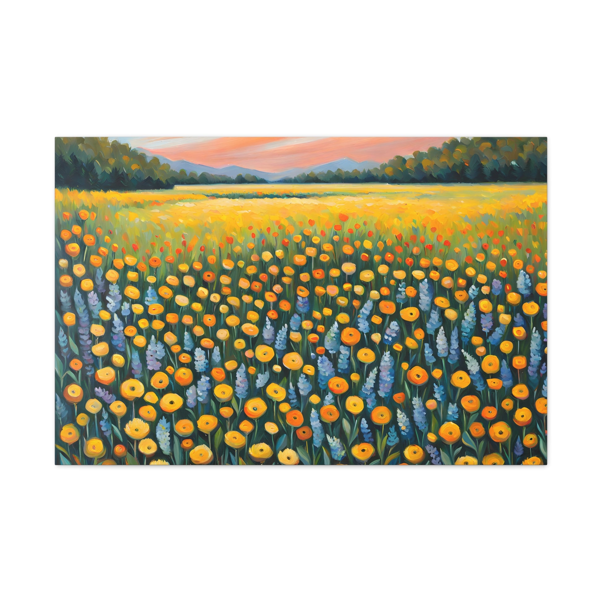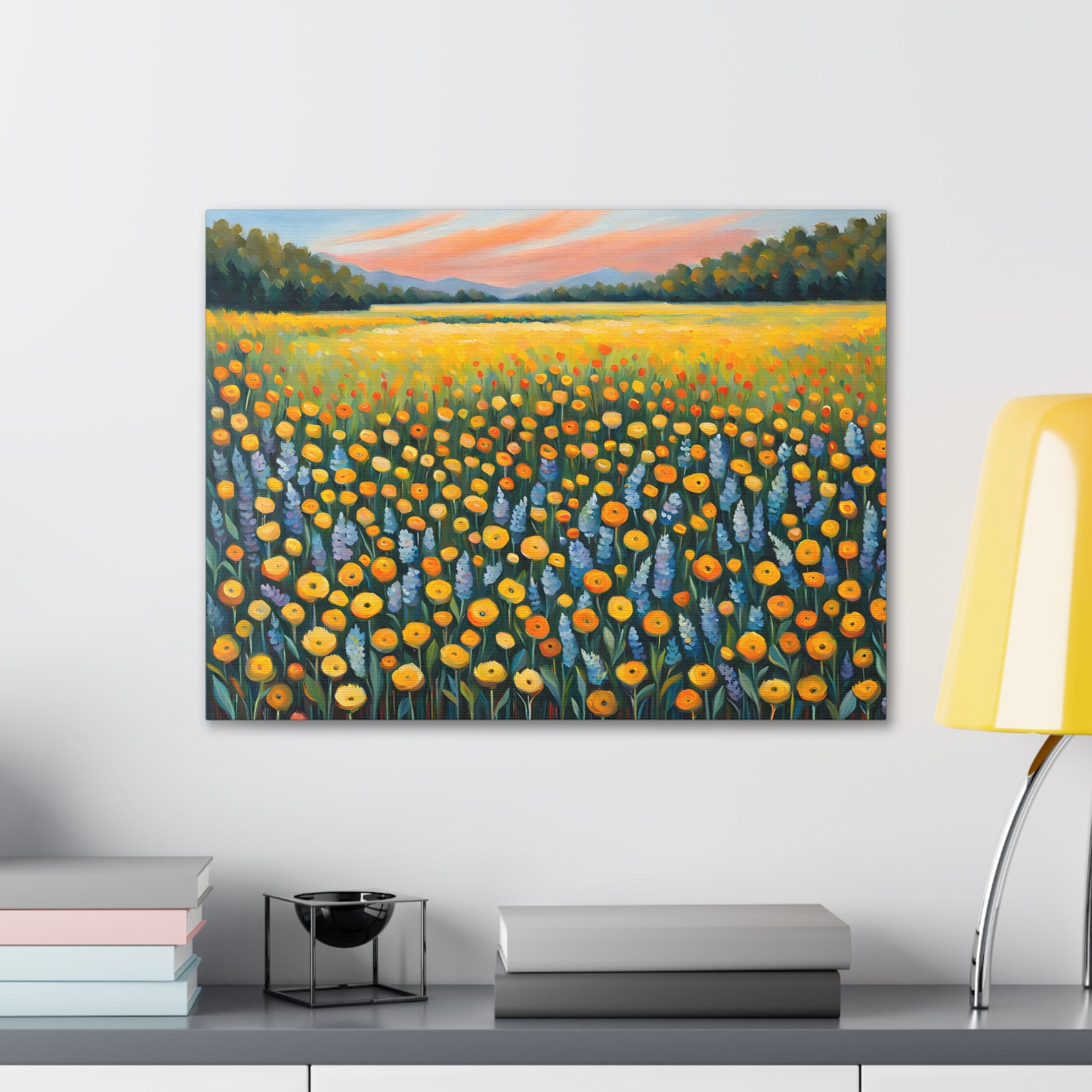 "Peaceful Meadow" is a vibrant oil painting that captures the vivid colors of a blooming meadow under a serene sky. Crafted on high-quality cotton canvas, this piece features a lively array of wildflowers, set against a backdrop of distant mountains and a glowing sunset. Ideal for brightening up any room, "Peaceful Meadow" is designed for indoor use, bringing a cheerful touch of nature into your home.