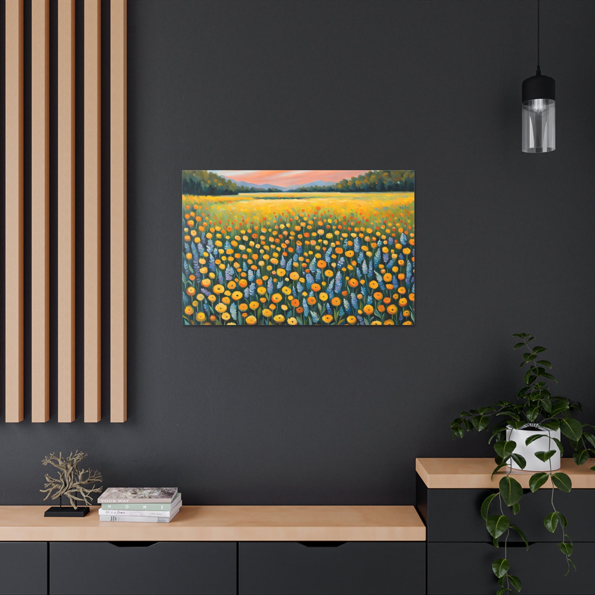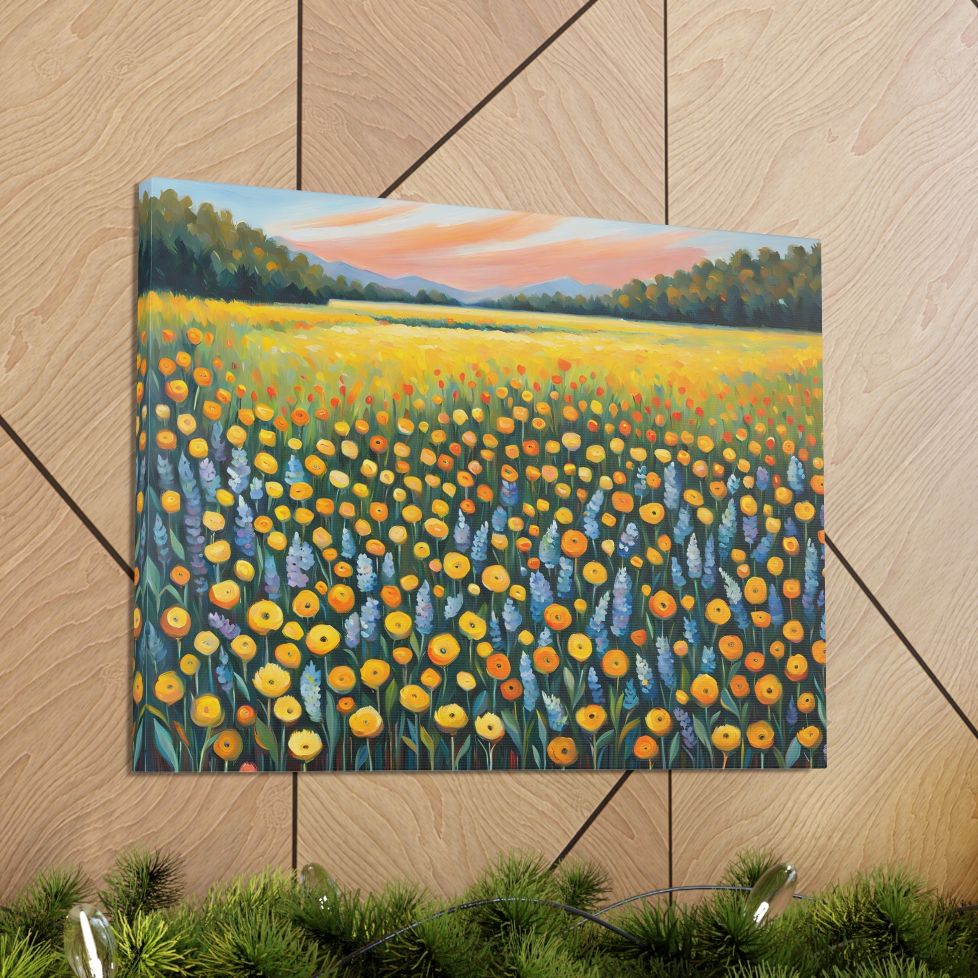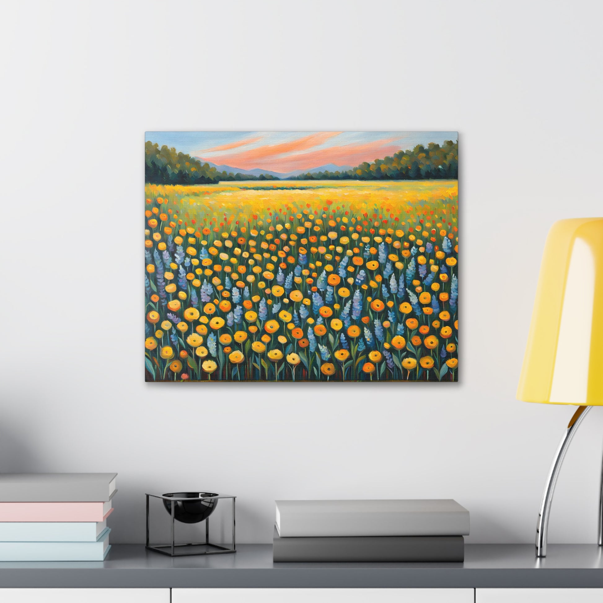 "Peaceful Meadow" is a vibrant oil painting that captures the vivid colors of a blooming meadow under a serene sky. Crafted on high-quality cotton canvas, this piece features a lively array of wildflowers, set against a backdrop of distant mountains and a glowing sunset. Ideal for brightening up any room, "Peaceful Meadow" is designed for indoor use, bringing a cheerful touch of nature into your home.