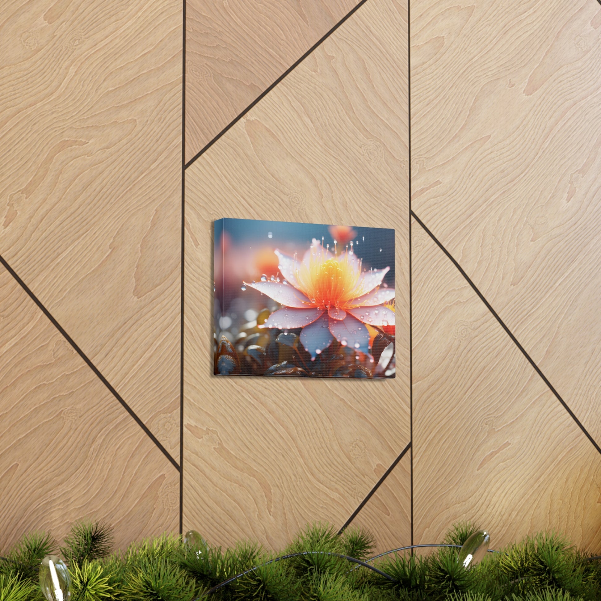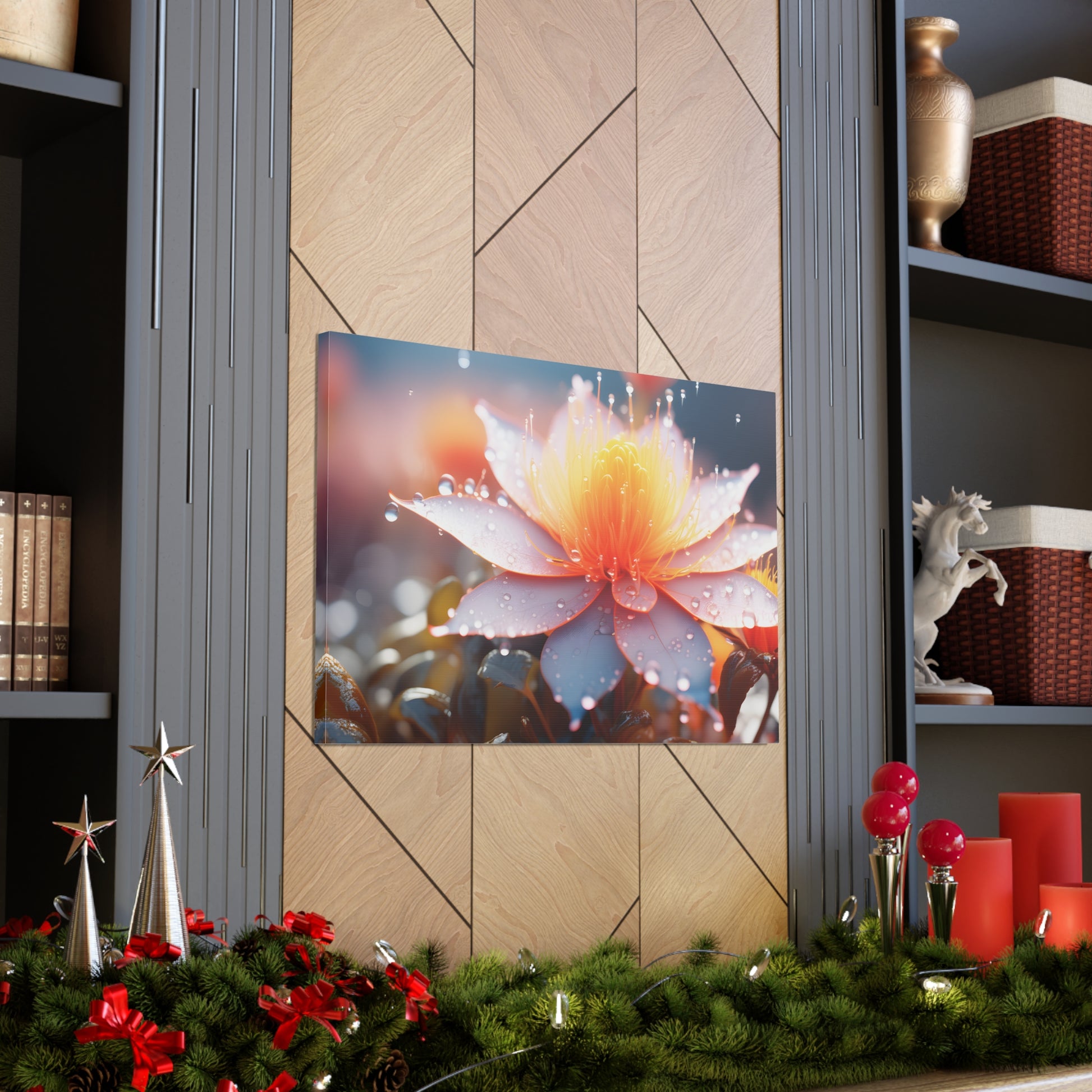 Immerse your space in the serene beauty of nature with "Rainy Blossom," a captivating canvas artwork that portrays the enchantment of a close-up flower drenched in rain, featuring delicate white petals, a vibrant orange center, and the graceful touch of raindrops.