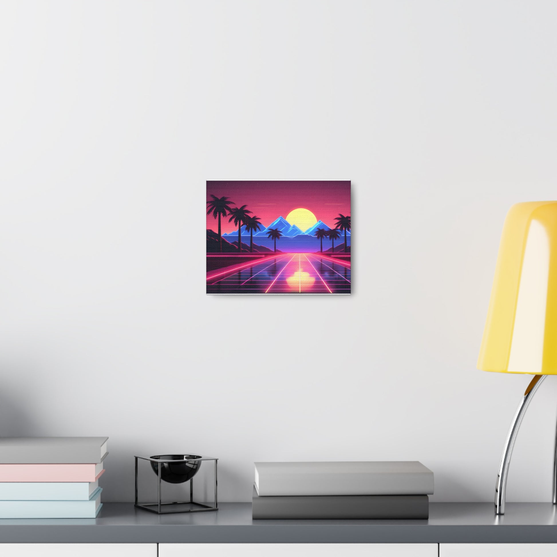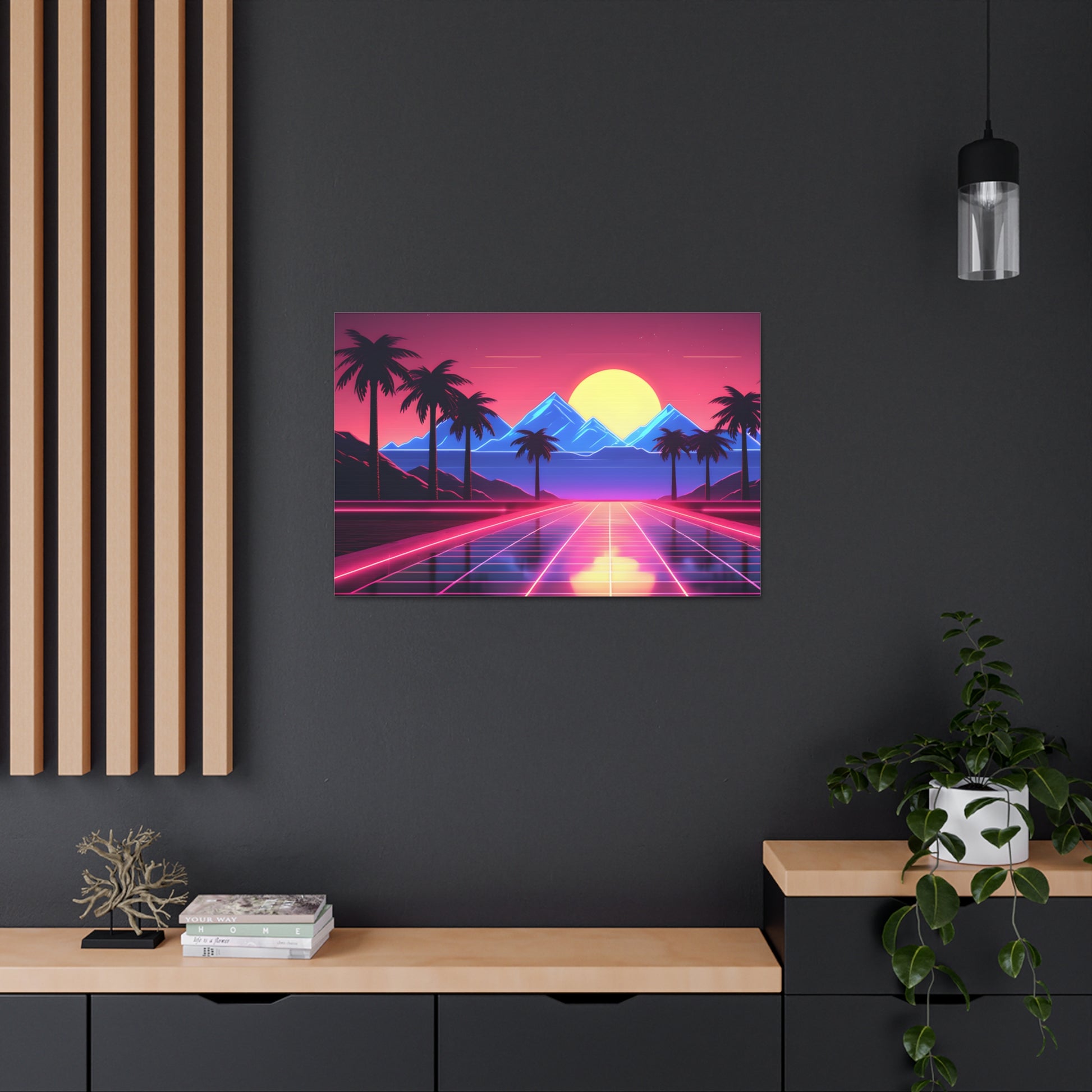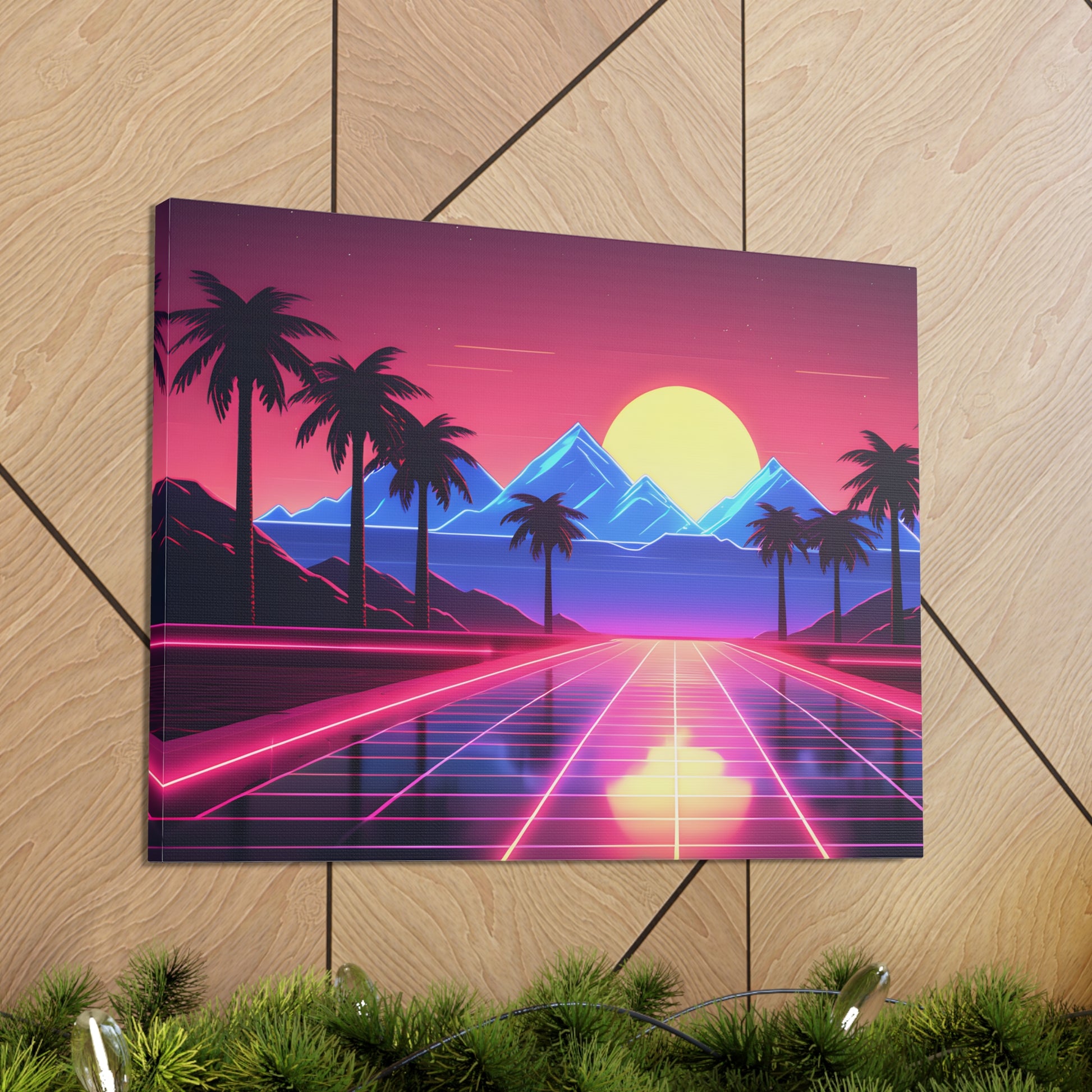 Transport your space to the vibrant heart of the 80s with "Retro Tropic Hues: Outrun Wall Décor." This captivating canvas artwork captures the essence of the outrun aesthetic, featuring a mesmerizing blend of retro tropic hues that evoke a sense of nostalgia and sophistication.