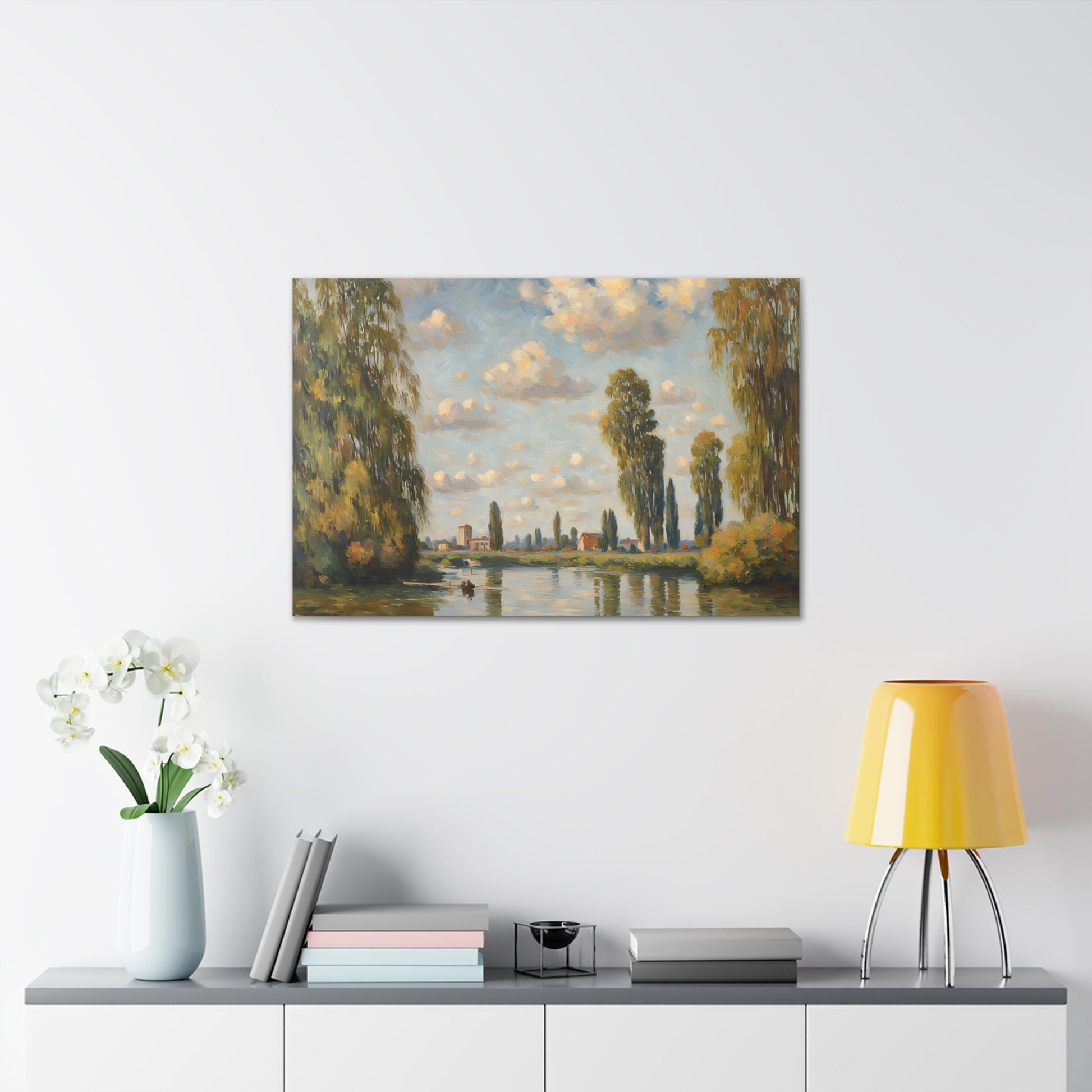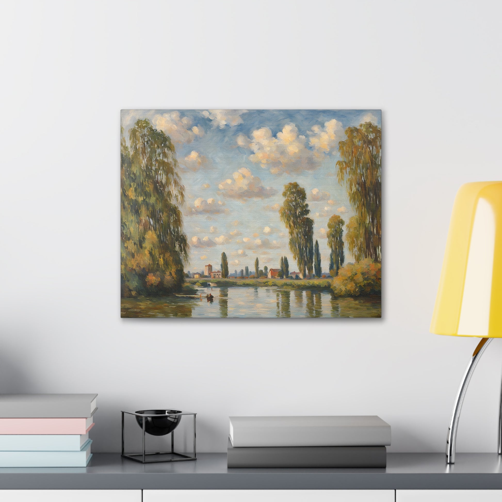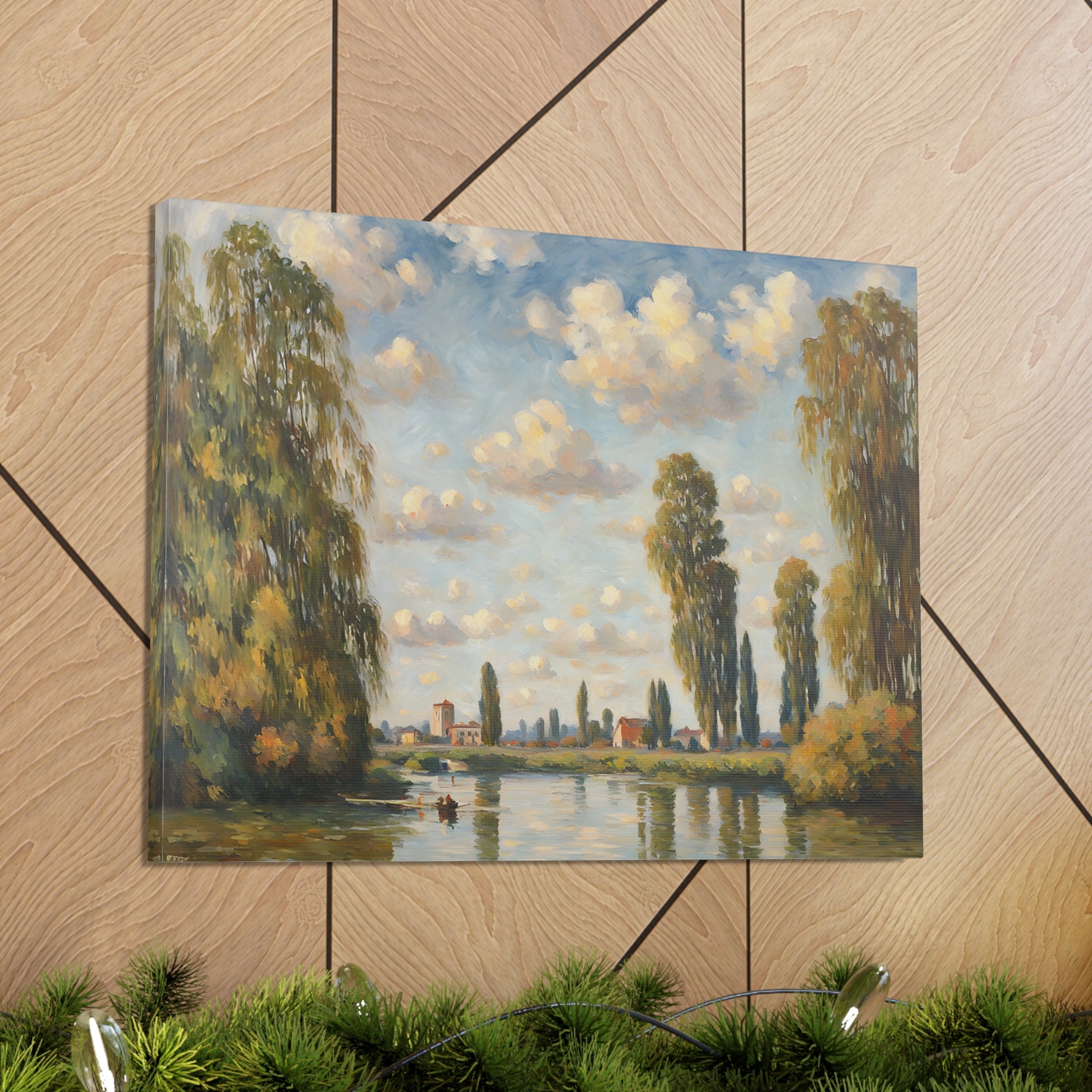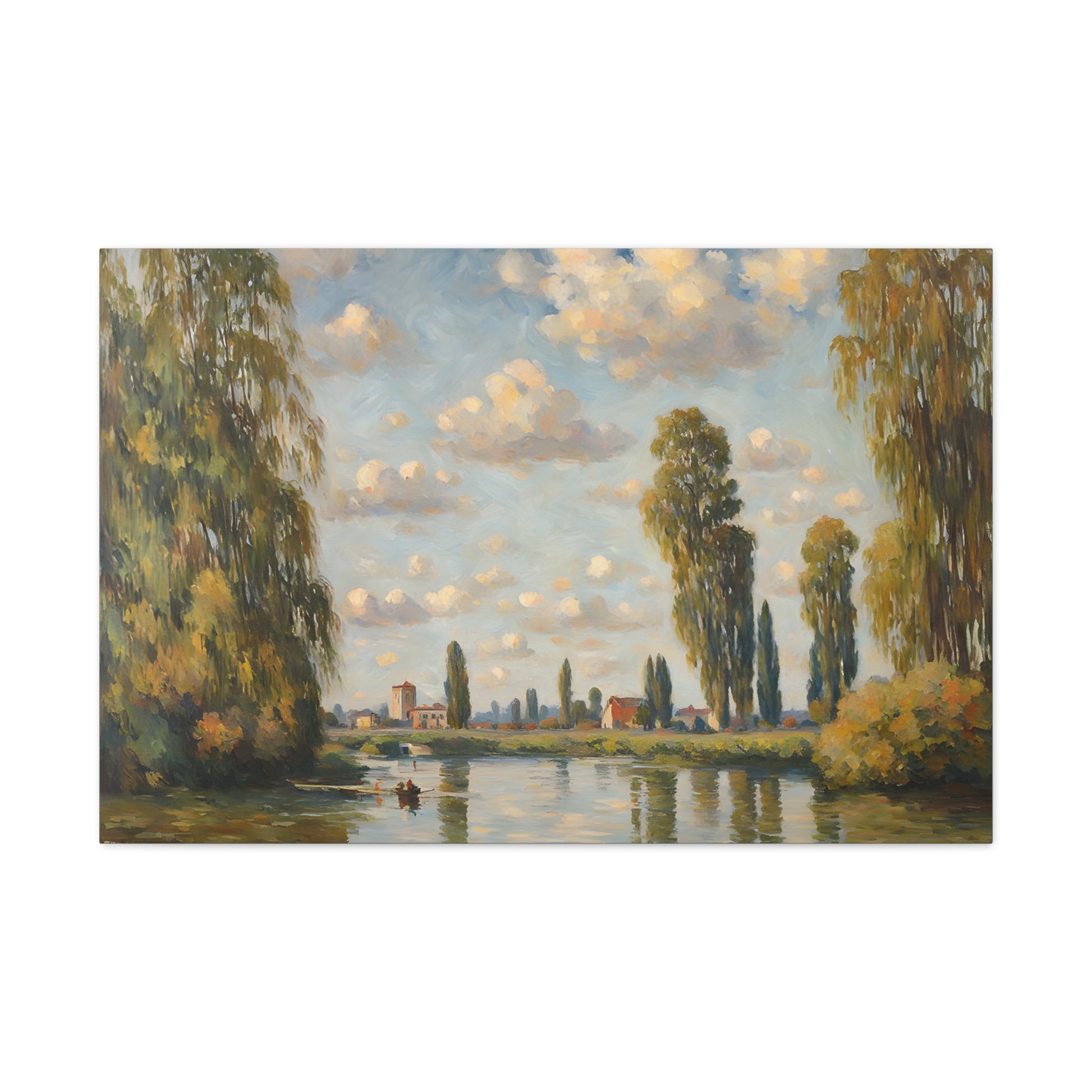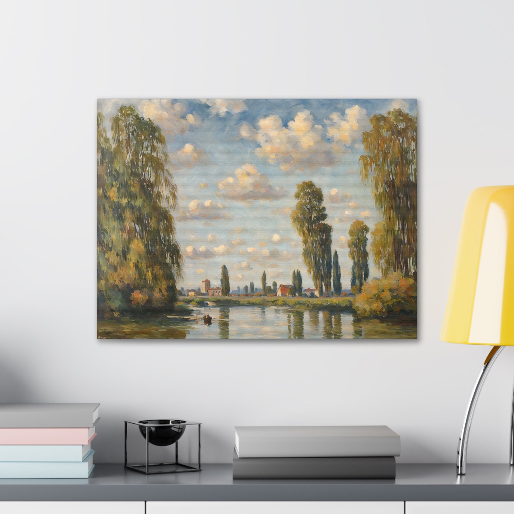 Immerse yourself in the tranquil beauty of "Riverbank Reverie," a captivating canvas art piece that transports you to the peaceful serenity of a riverside retreat. Expertly crafted on premium-quality cotton canvas, this artwork captures the essence of nature's calm and invites you to pause and reflect in its gentle embrace.