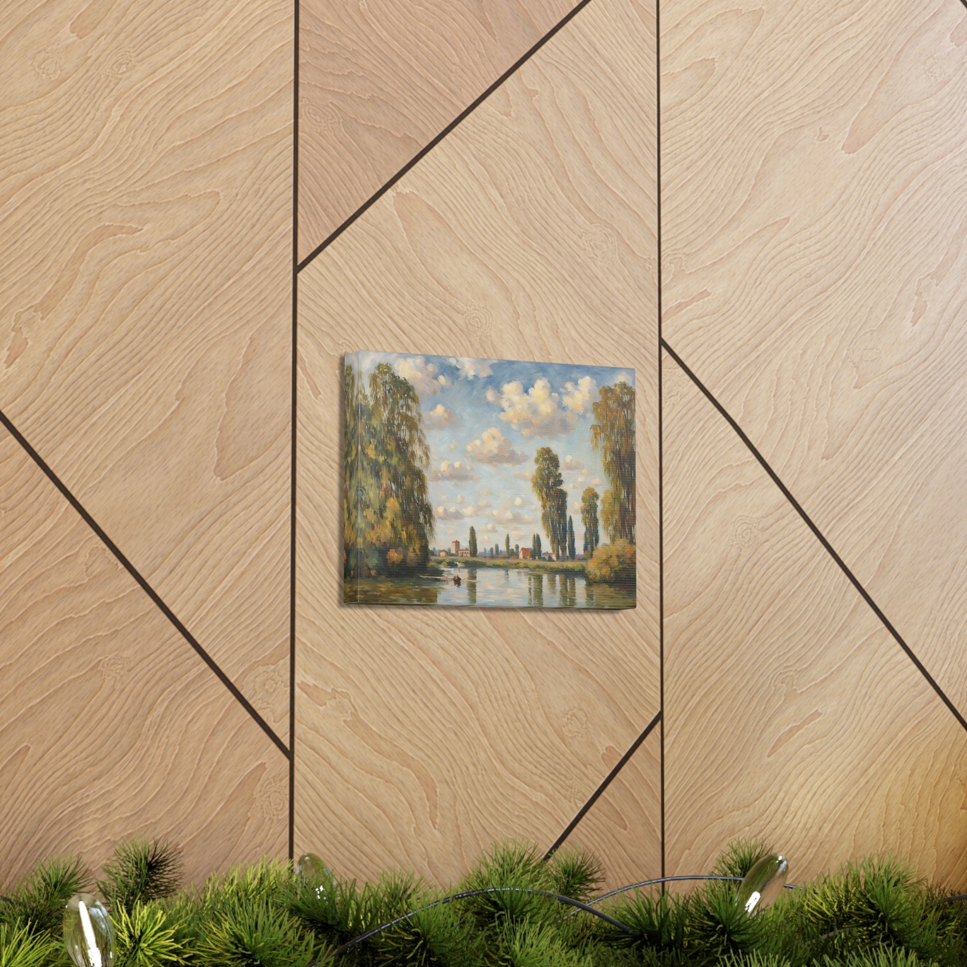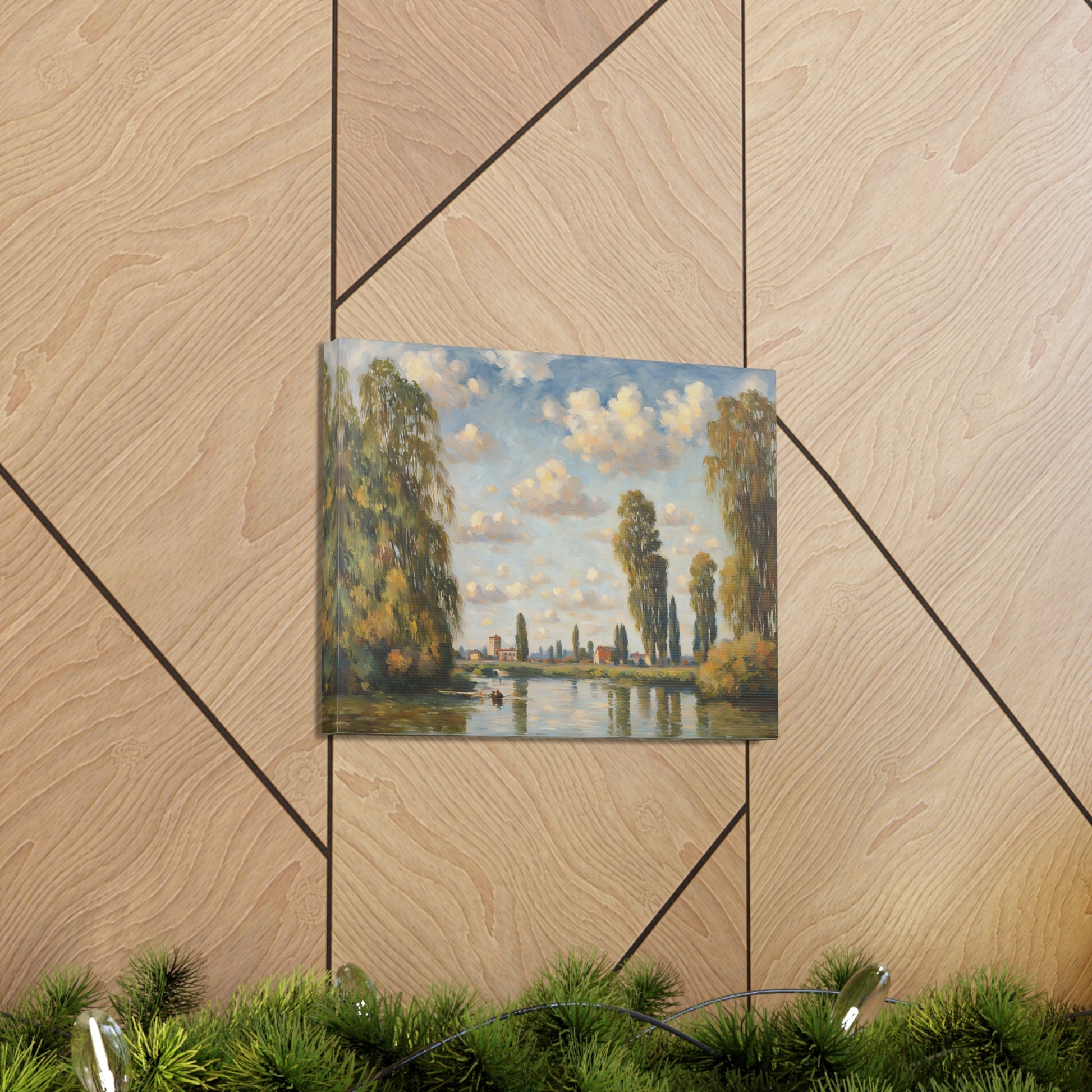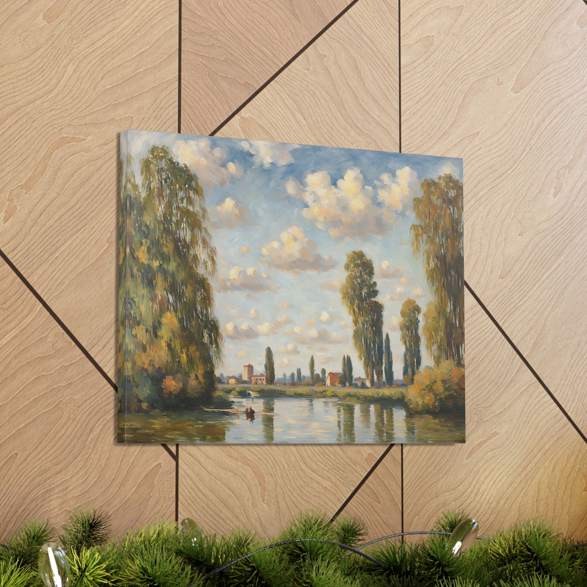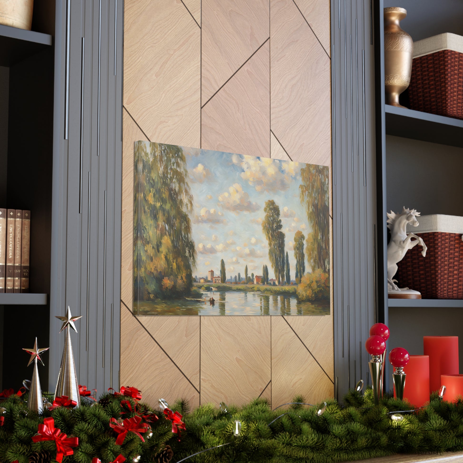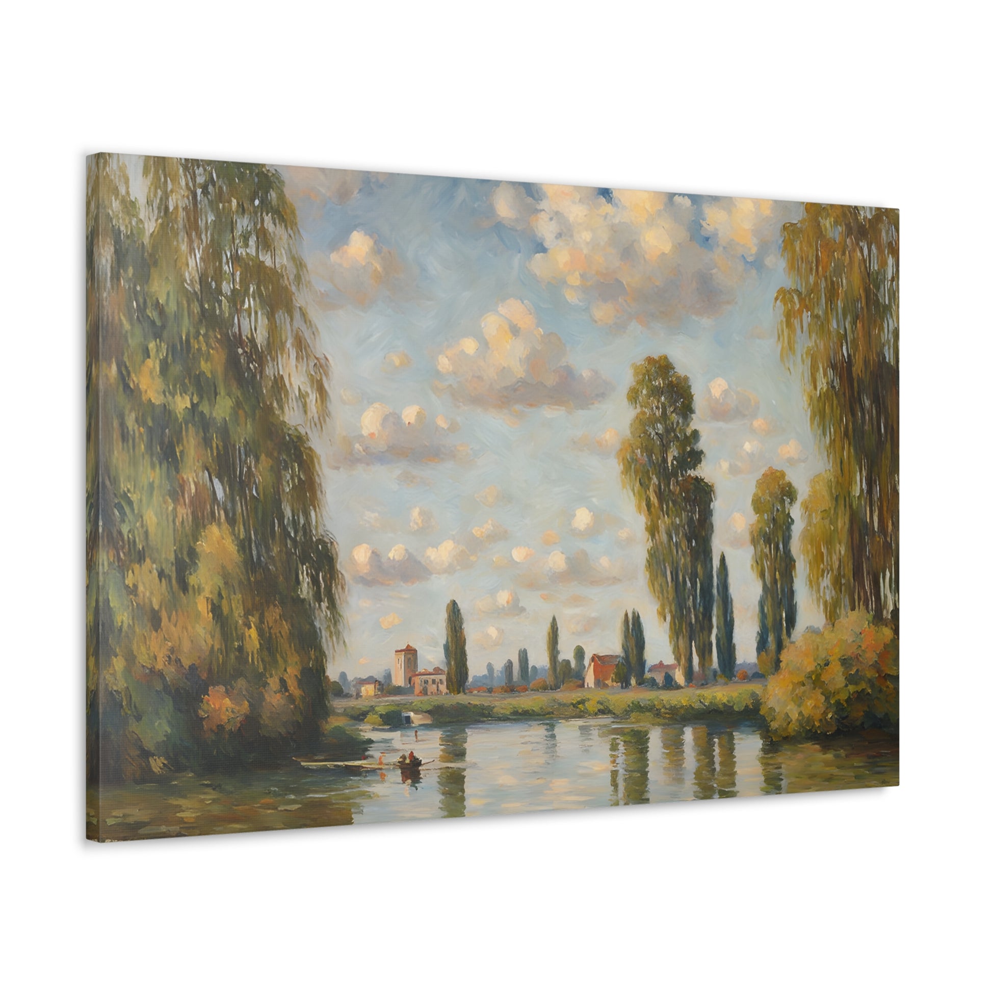 Immerse yourself in the tranquil beauty of "Riverbank Reverie," a captivating canvas art piece that transports you to the peaceful serenity of a riverside retreat. Expertly crafted on premium-quality cotton canvas, this artwork captures the essence of nature's calm and invites you to pause and reflect in its gentle embrace.