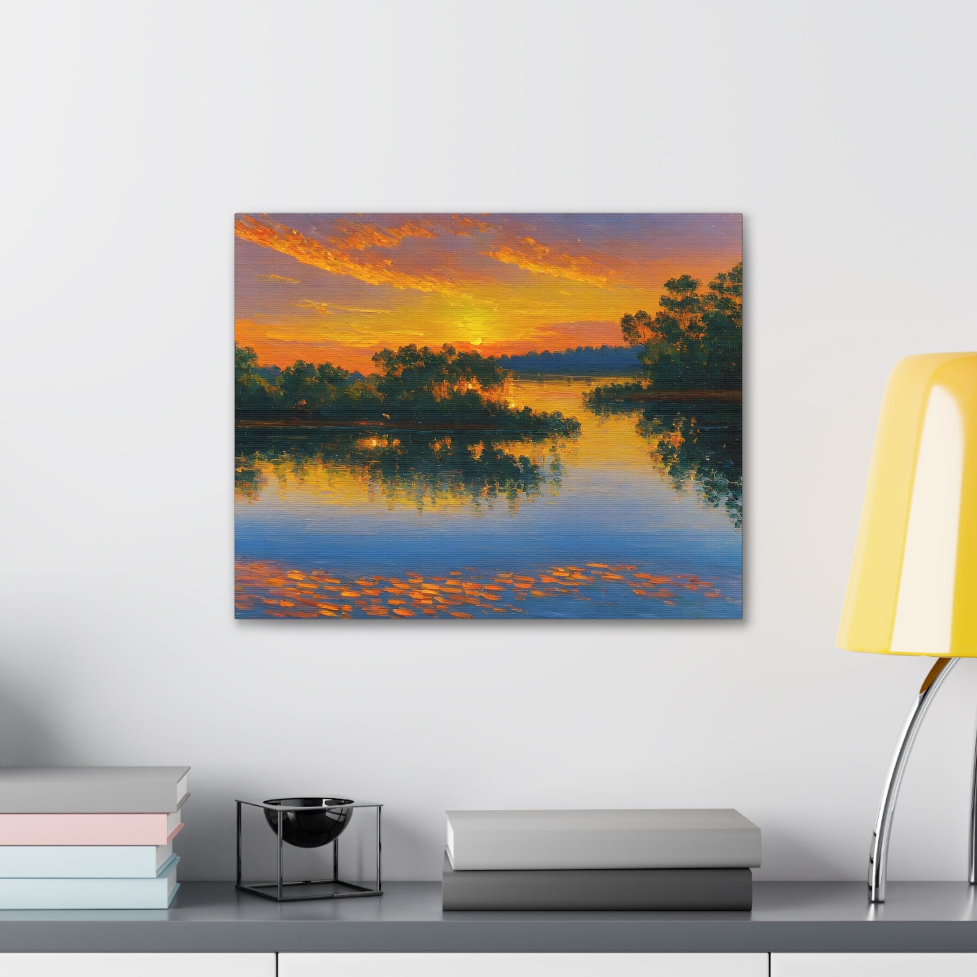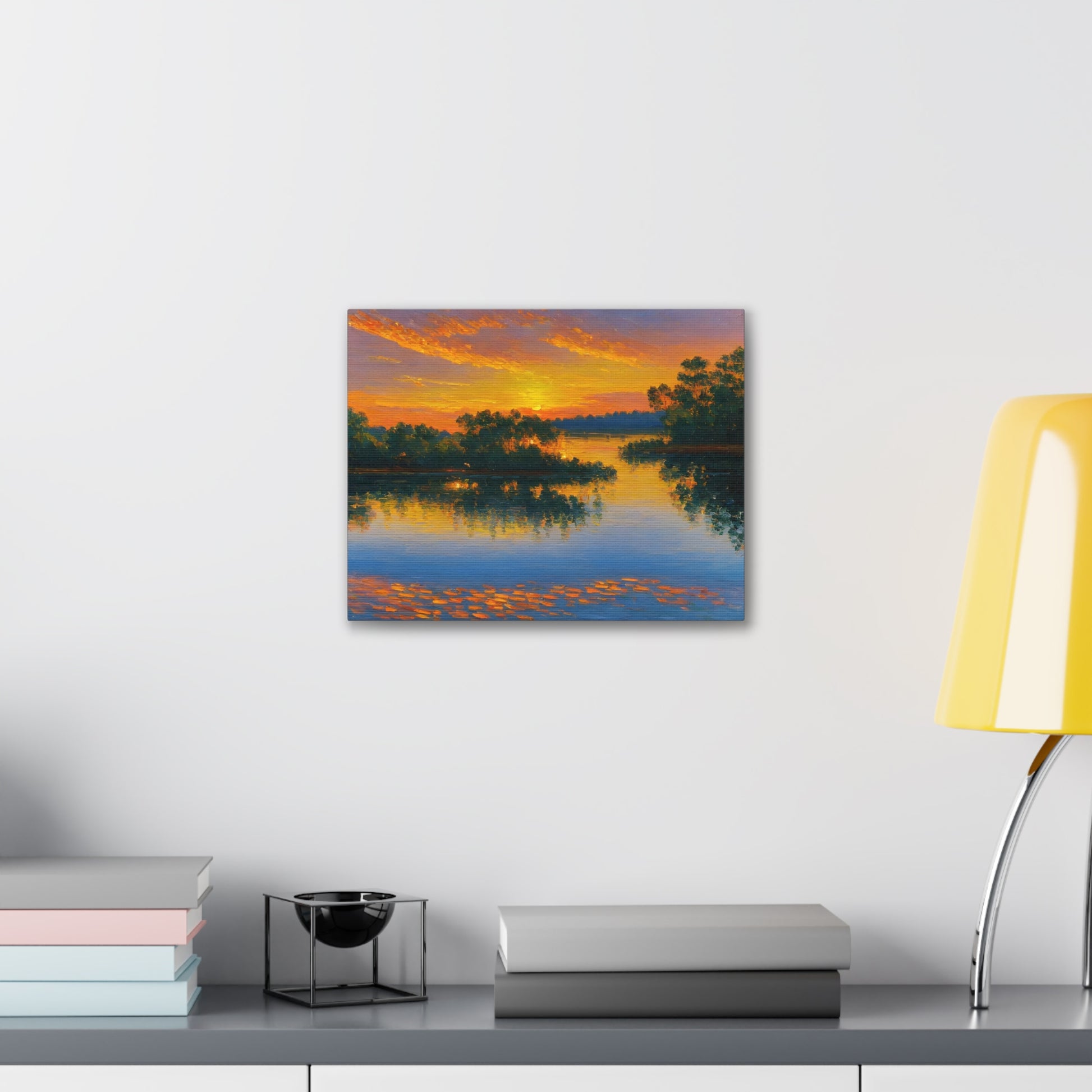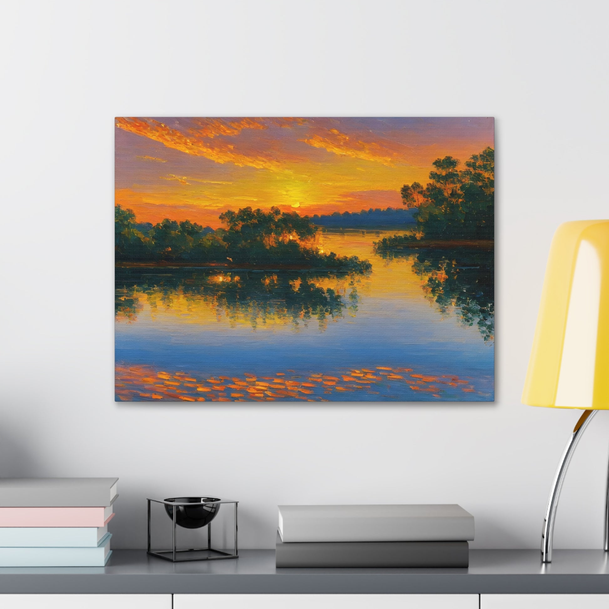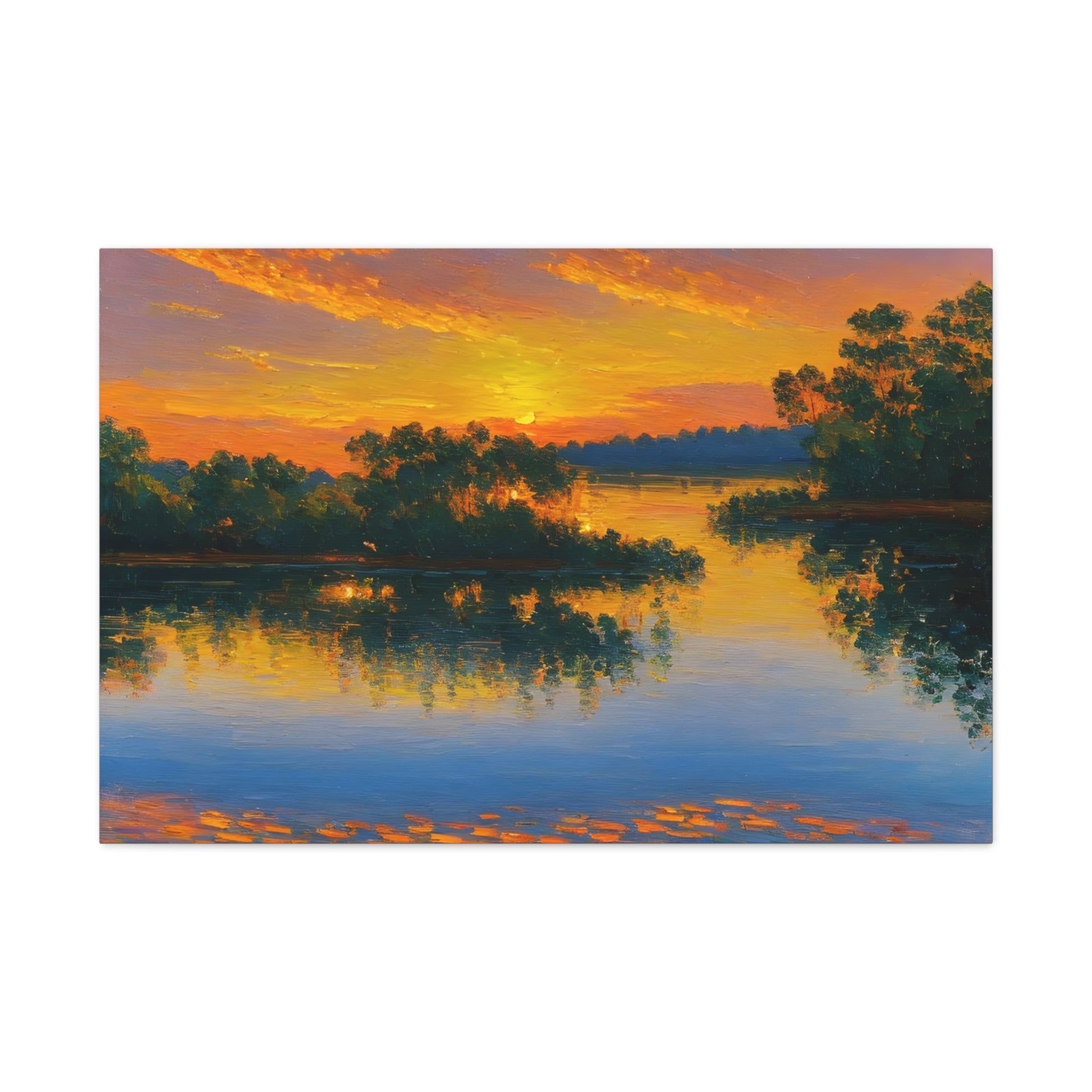 "Serene Lakeside" brings the calm beauty of nature into your home. The soft colors of a setting sun reflecting on the lake make this artwork ideal for creating a peaceful environment indoors.