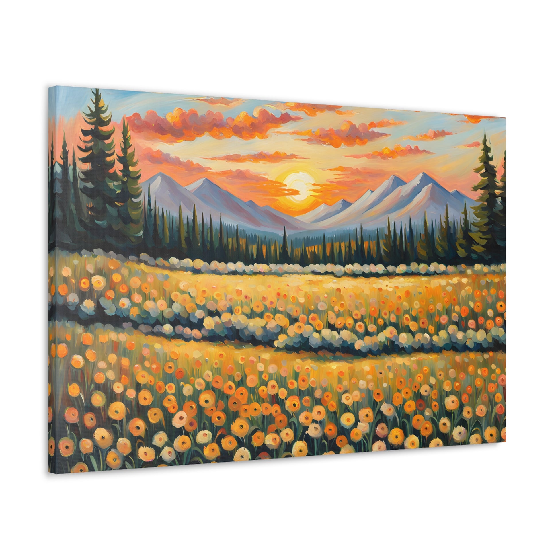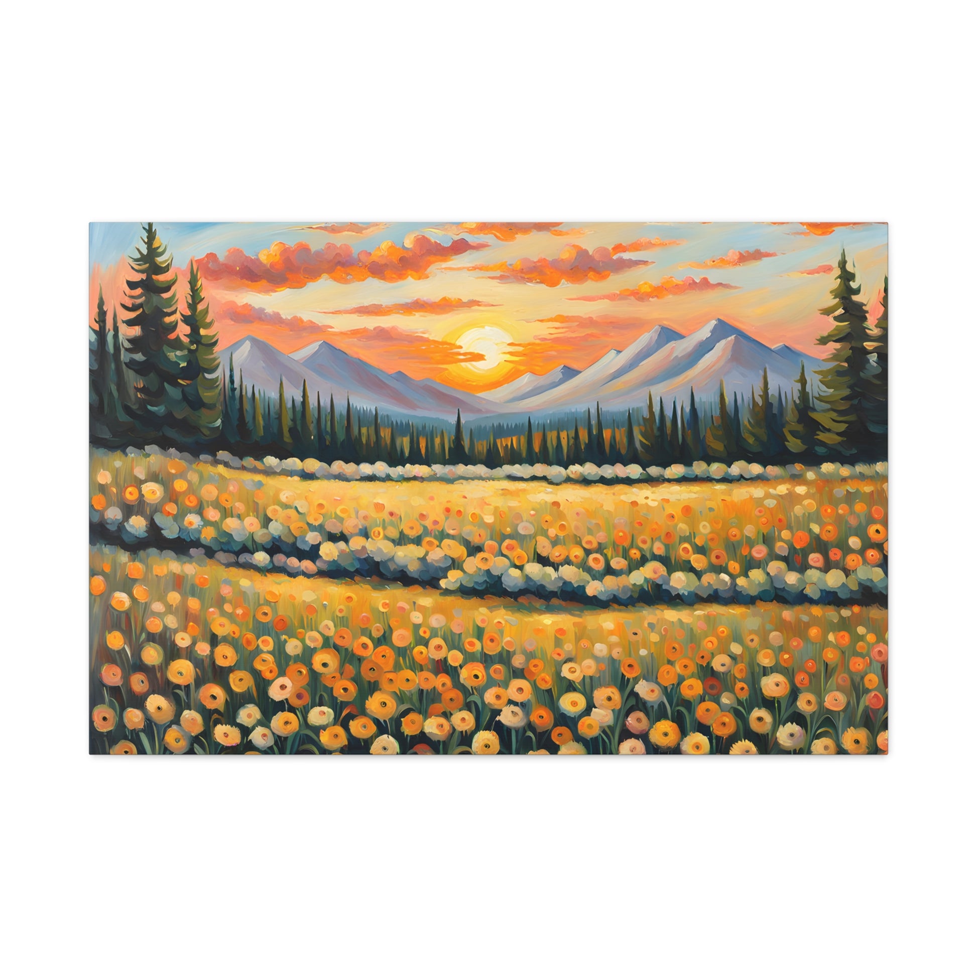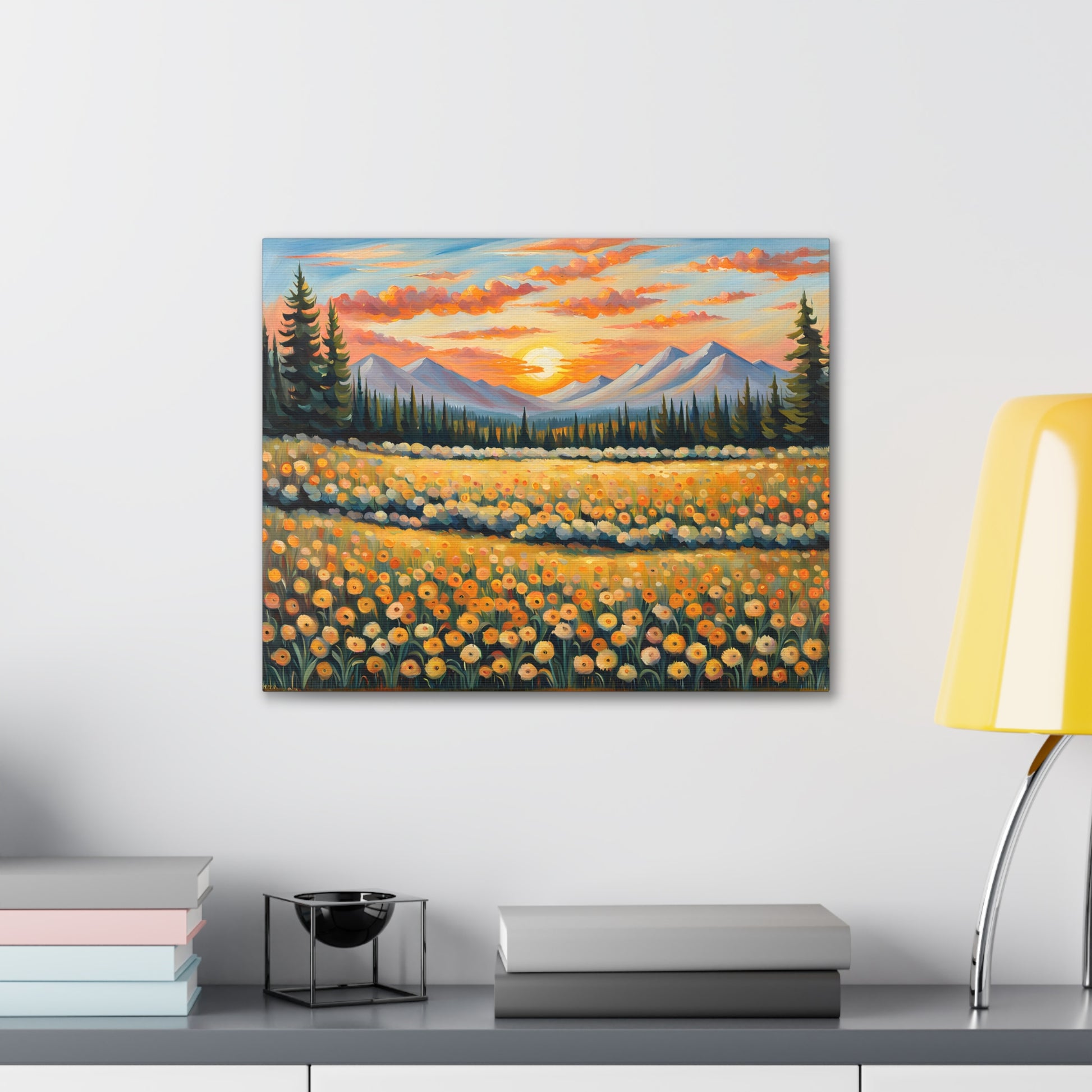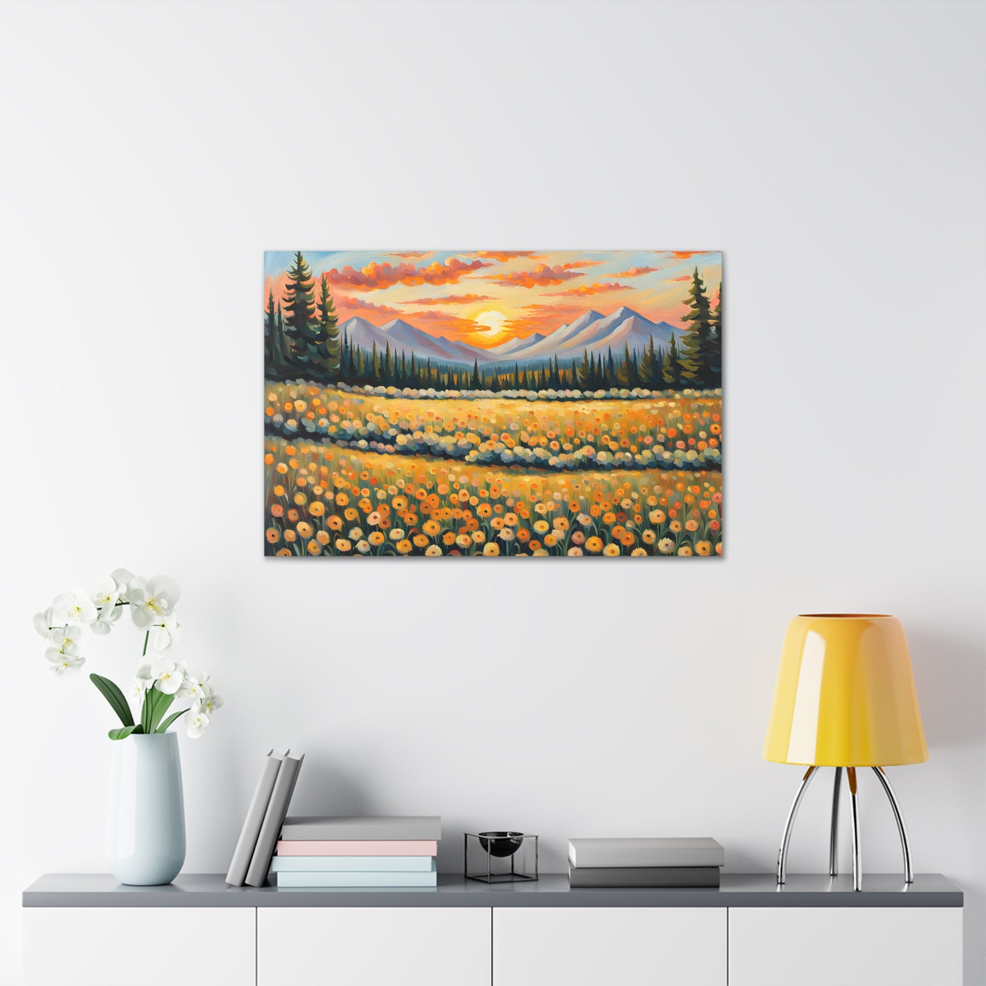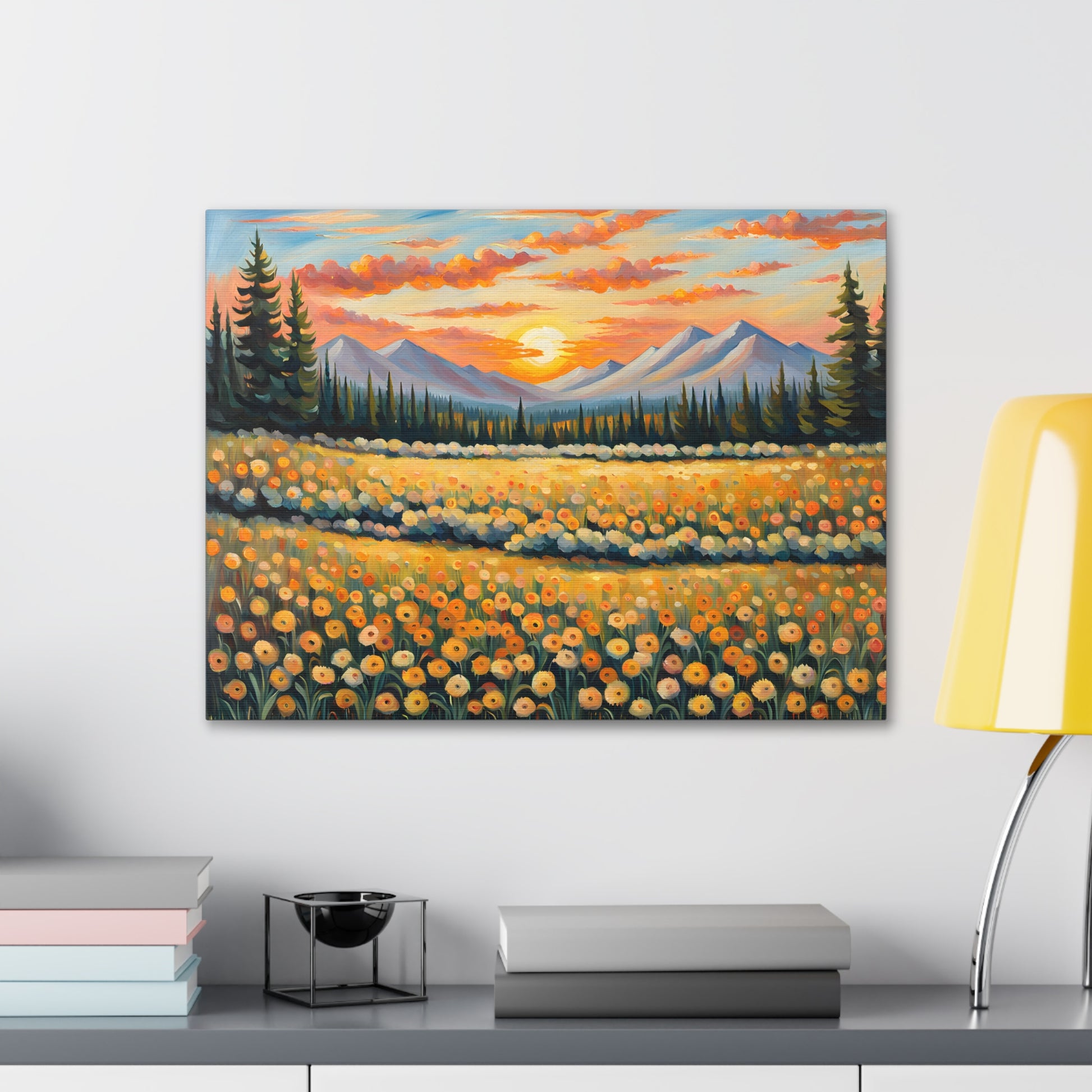 Elevate your space with the radiant beauty of "Amber Horizon." This captivating oil painting depicts a stunning sunset over a field of golden flowers, with majestic mountains in the distance. Its warm hues and serene landscape bring a touch of natural wonder into your home.