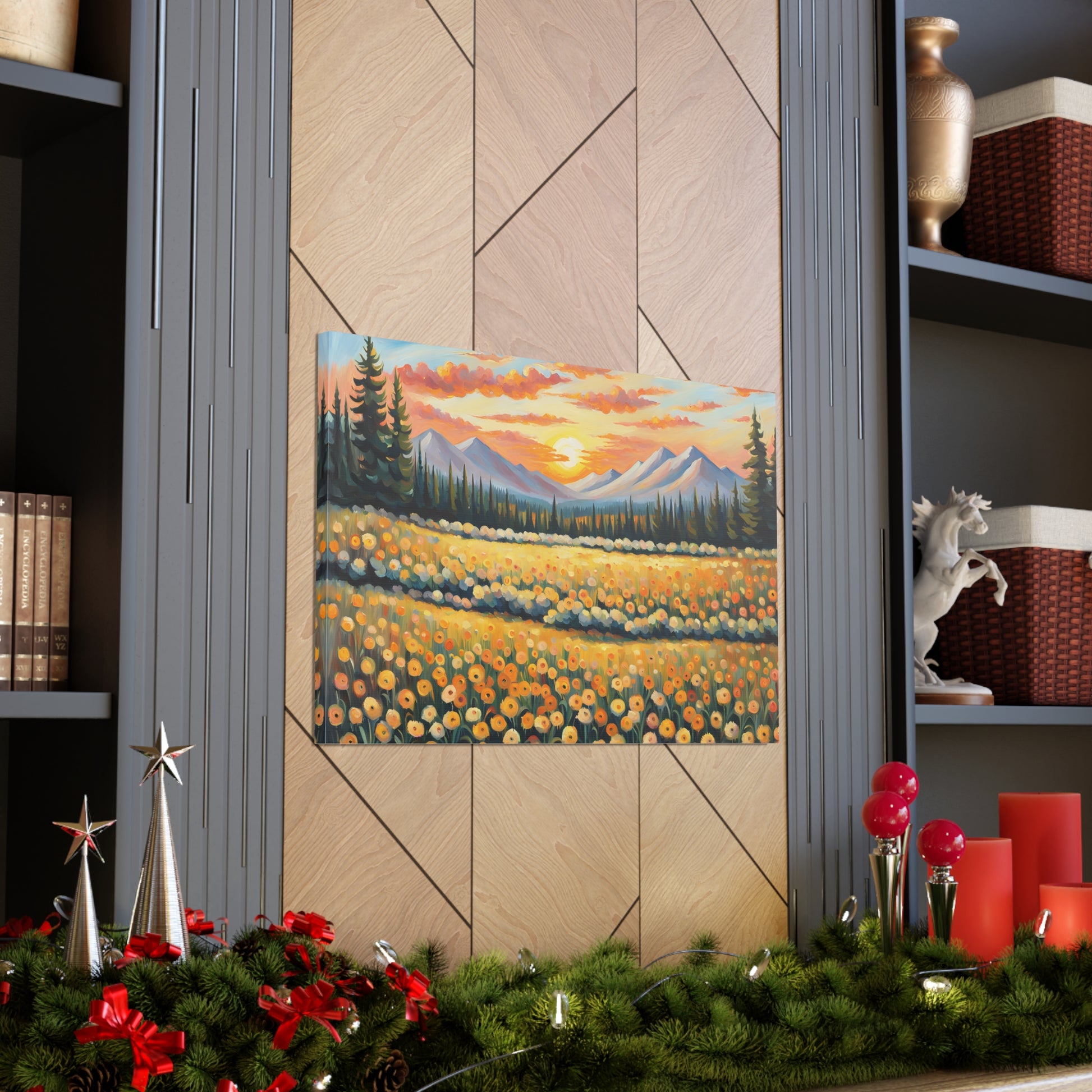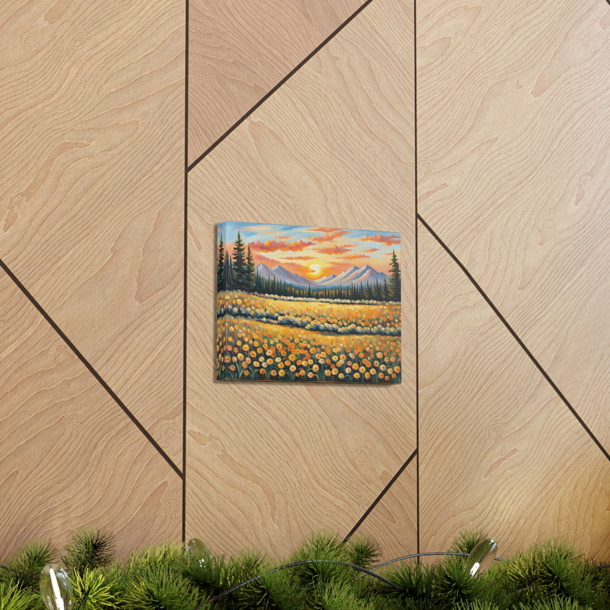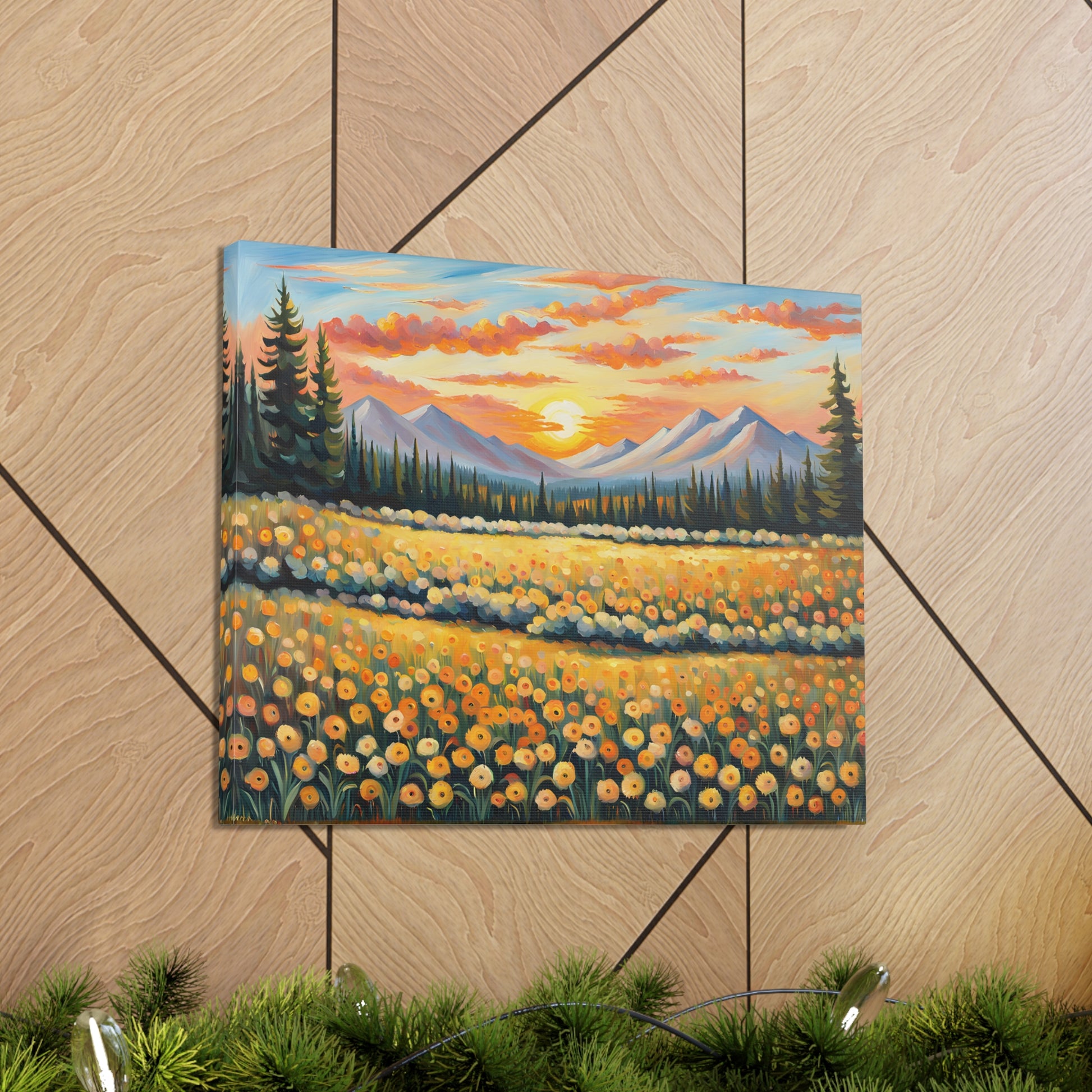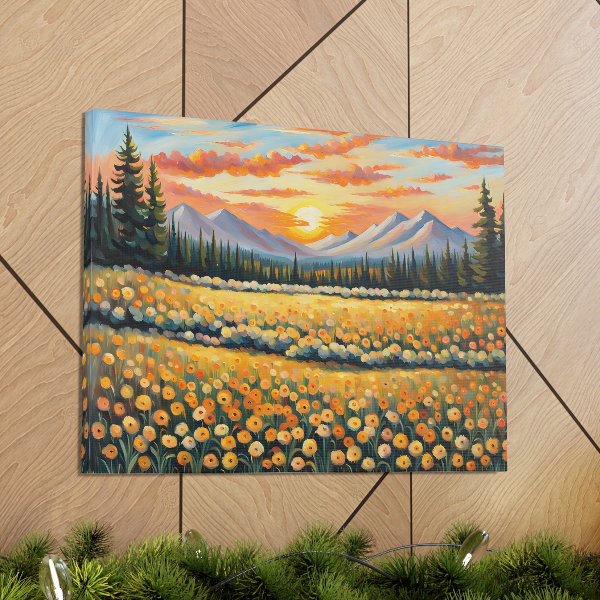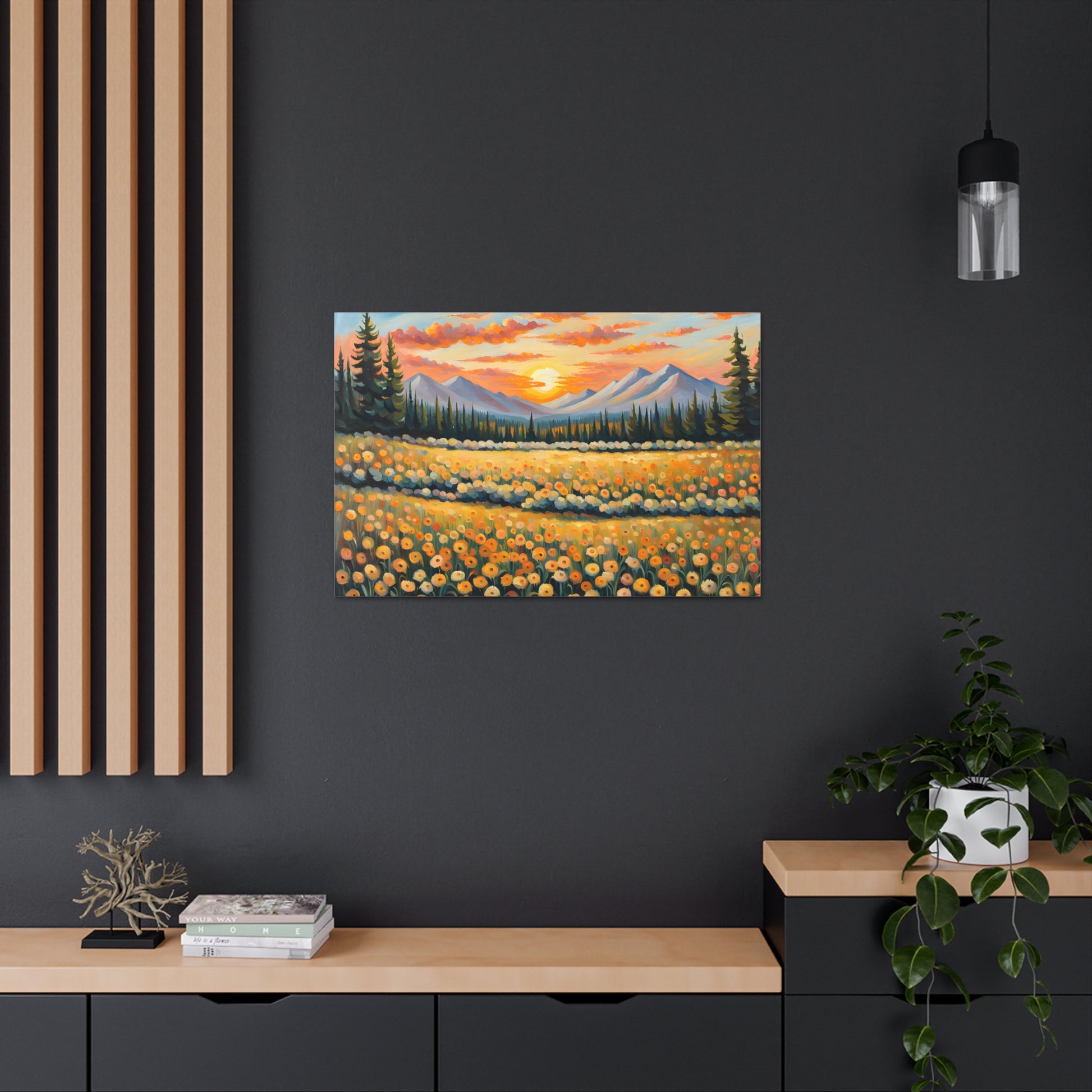 Elevate your space with the radiant beauty of "Amber Horizon." This captivating oil painting depicts a stunning sunset over a field of golden flowers, with majestic mountains in the distance. Its warm hues and serene landscape bring a touch of natural wonder into your home.