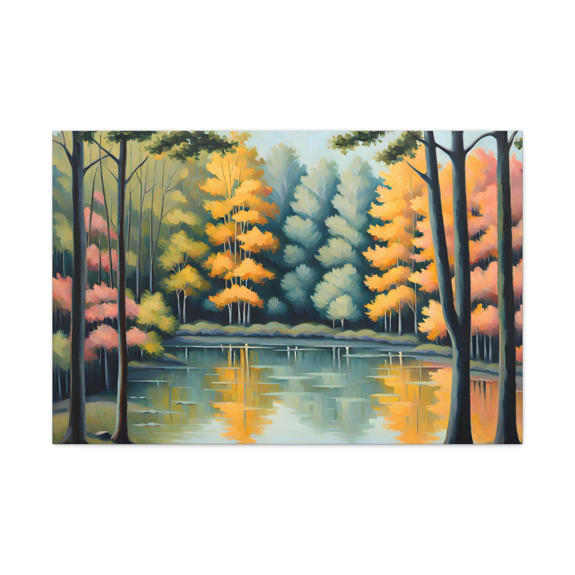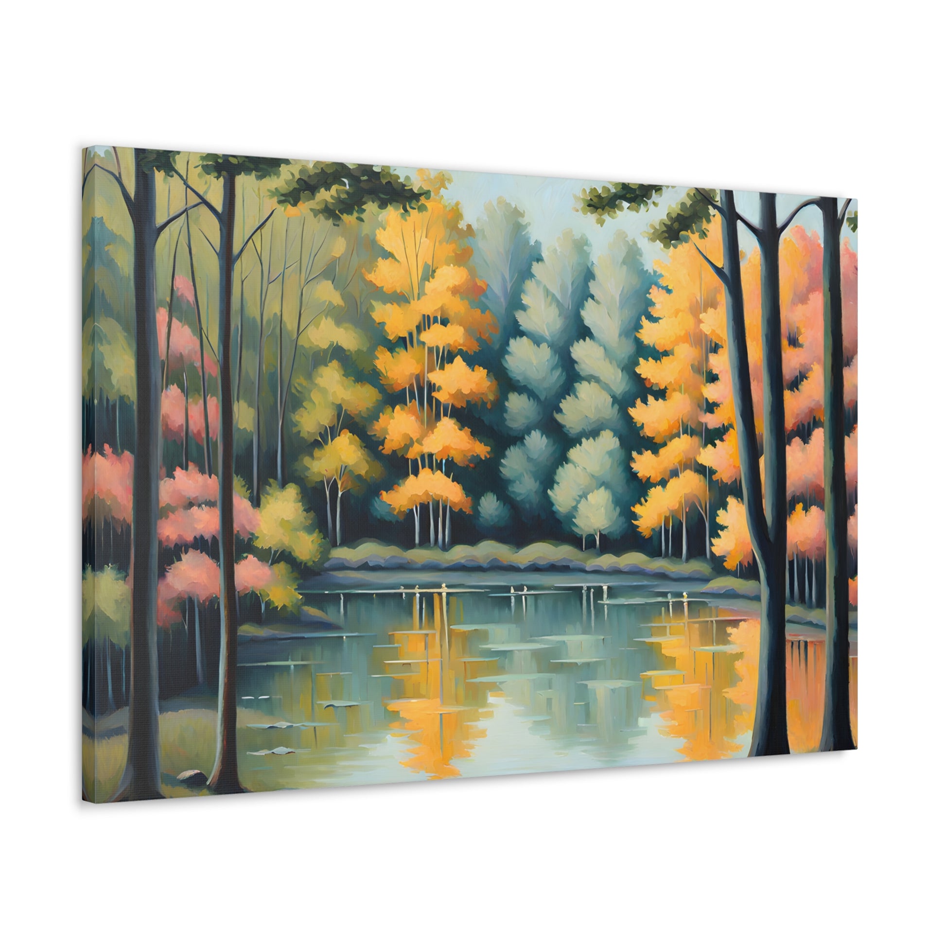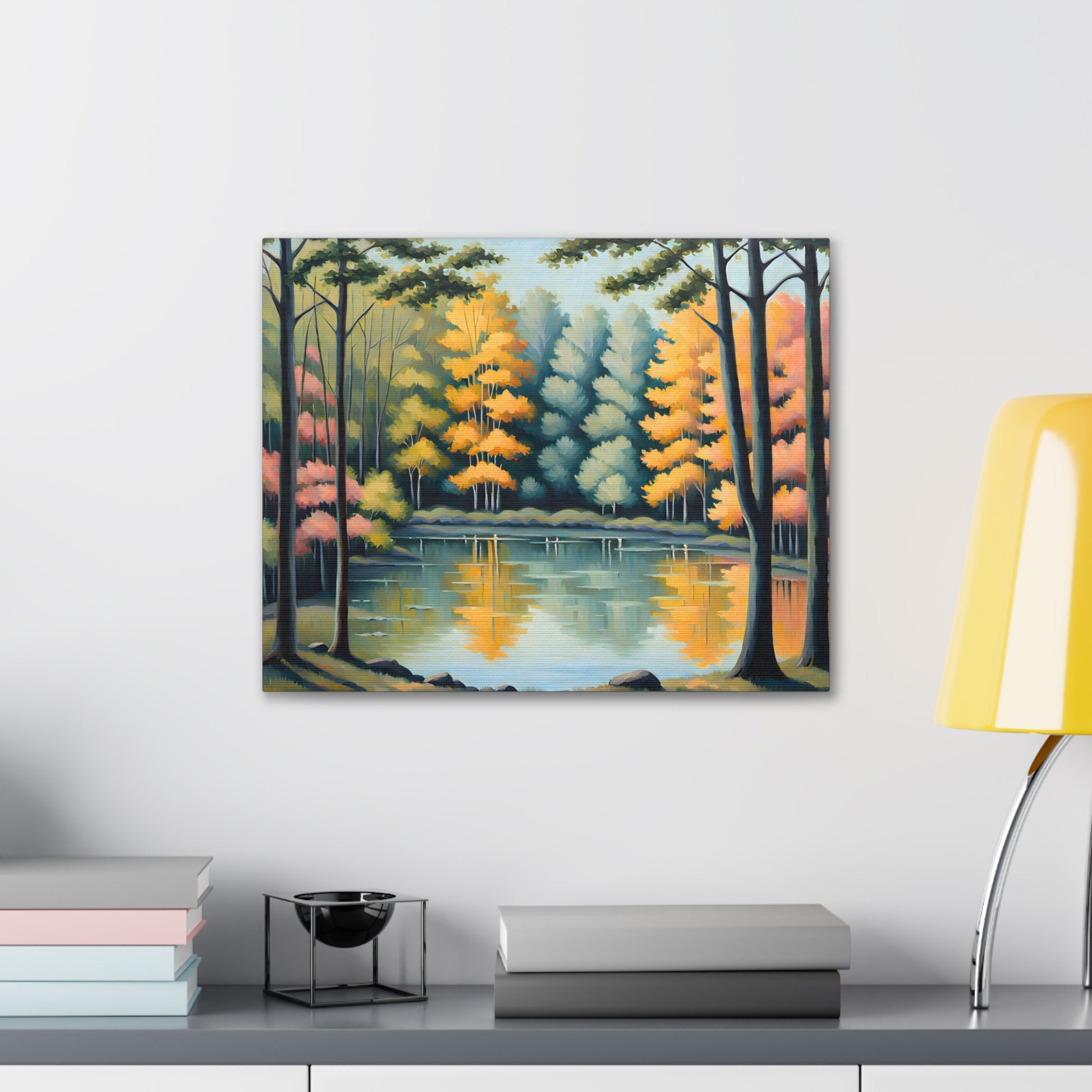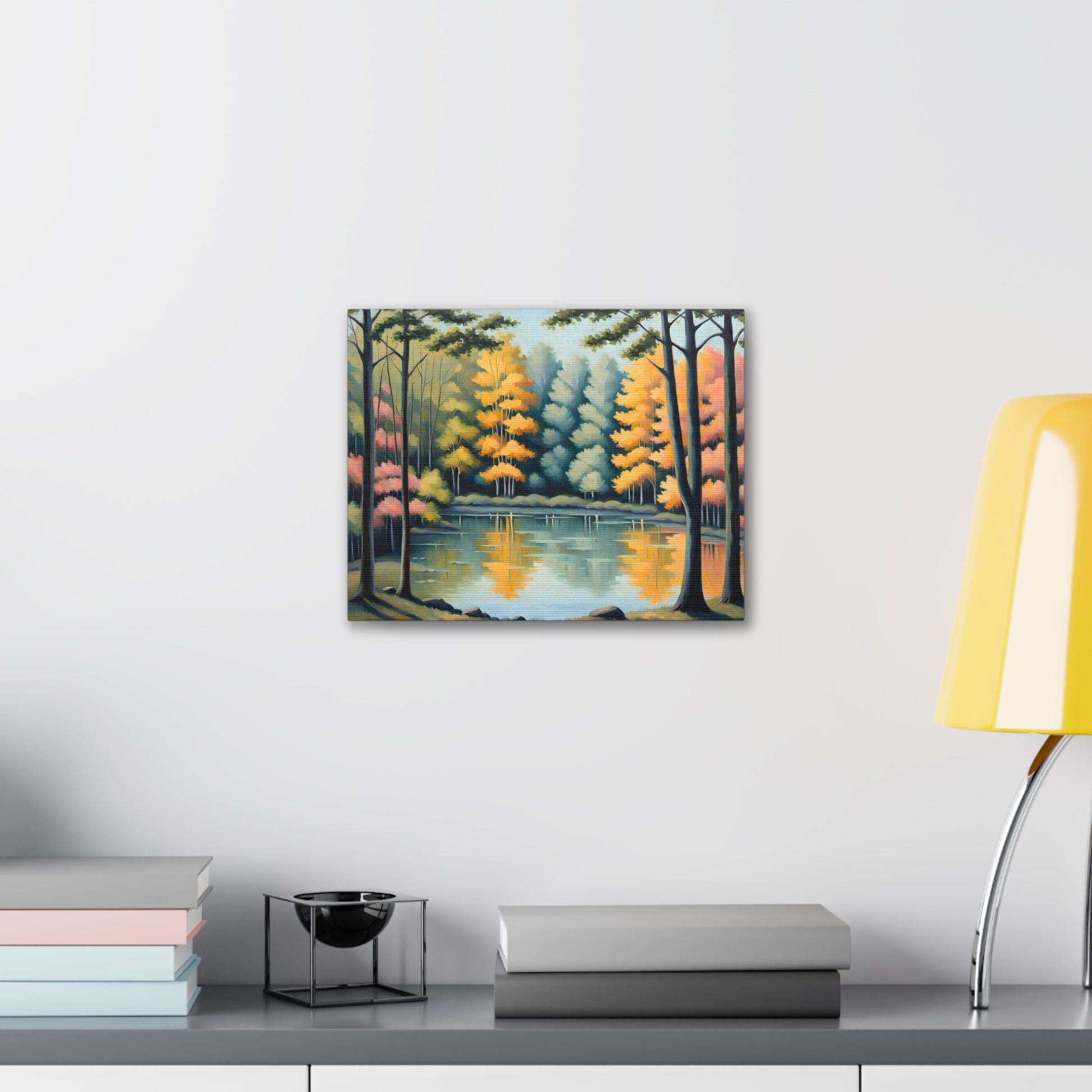 Step into a tranquil woodland oasis with "Serene Woodland." This oil painting depicts a peaceful forest by a still lake, capturing the soothing beauty of autumnal trees reflected in the water.