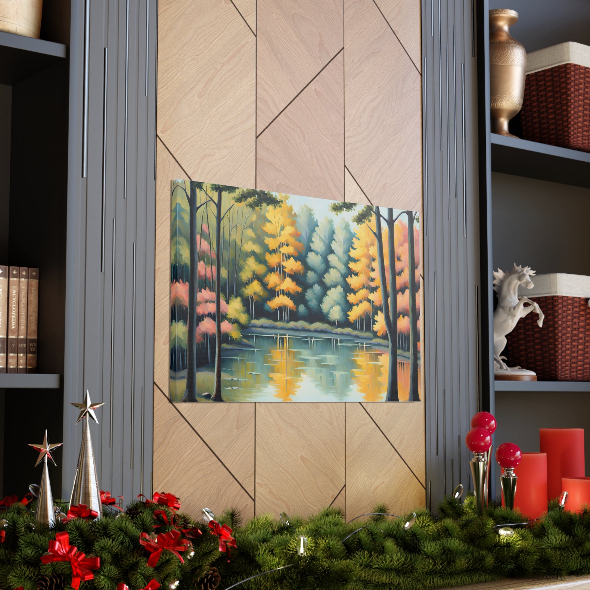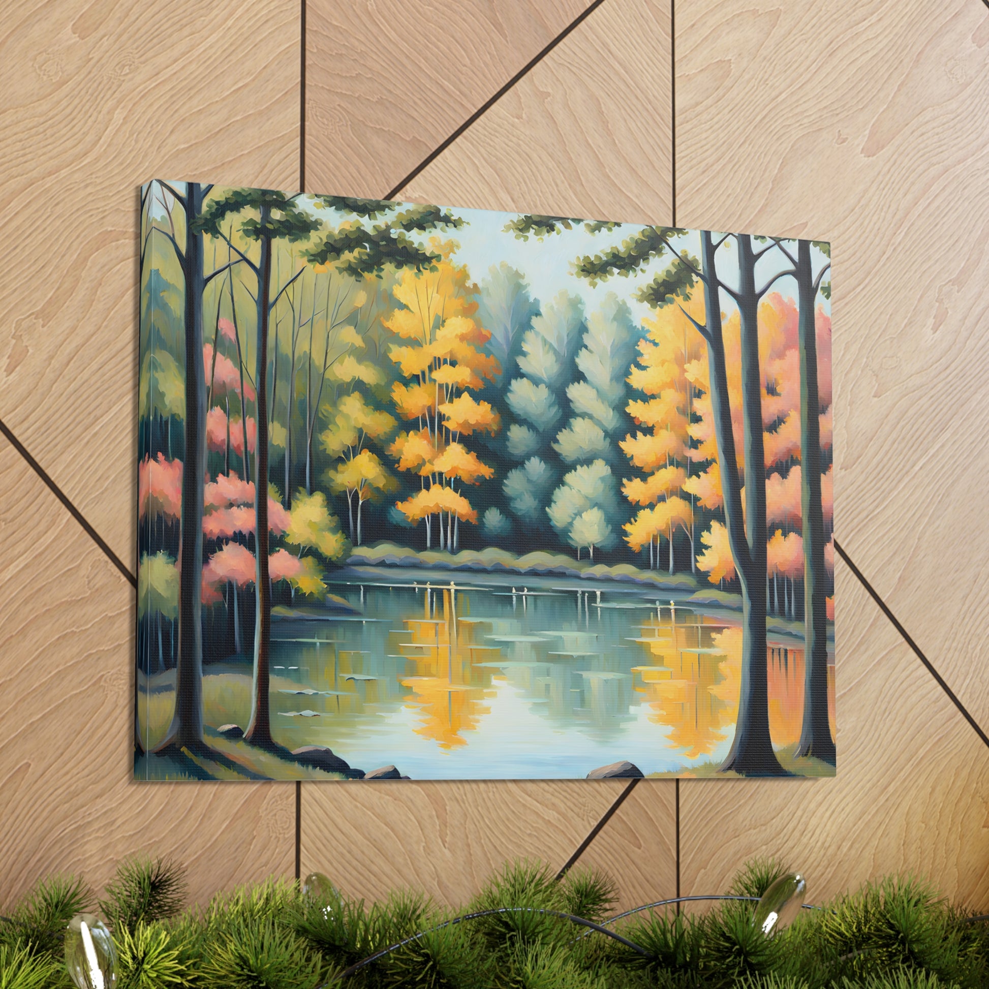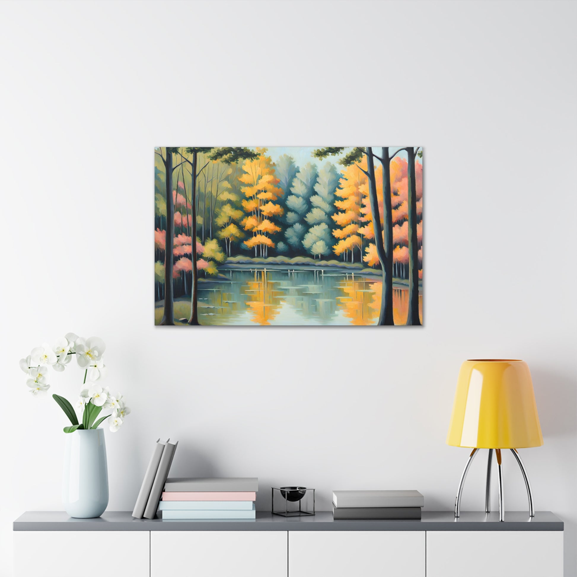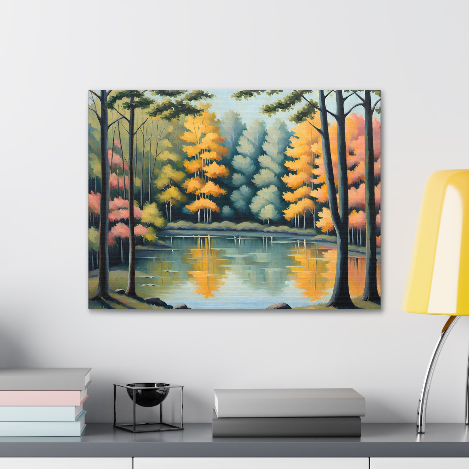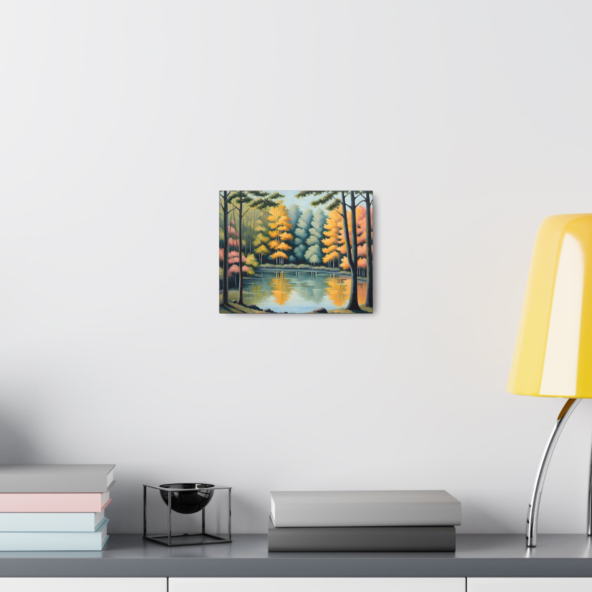 Step into a tranquil woodland oasis with "Serene Woodland." This oil painting depicts a peaceful forest by a still lake, capturing the soothing beauty of autumnal trees reflected in the water.