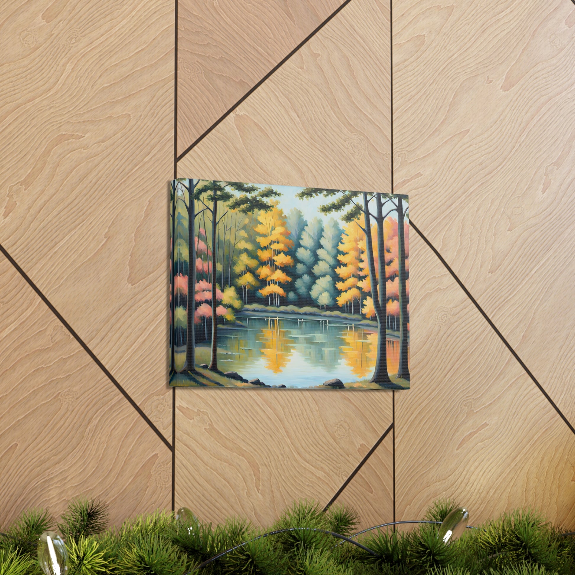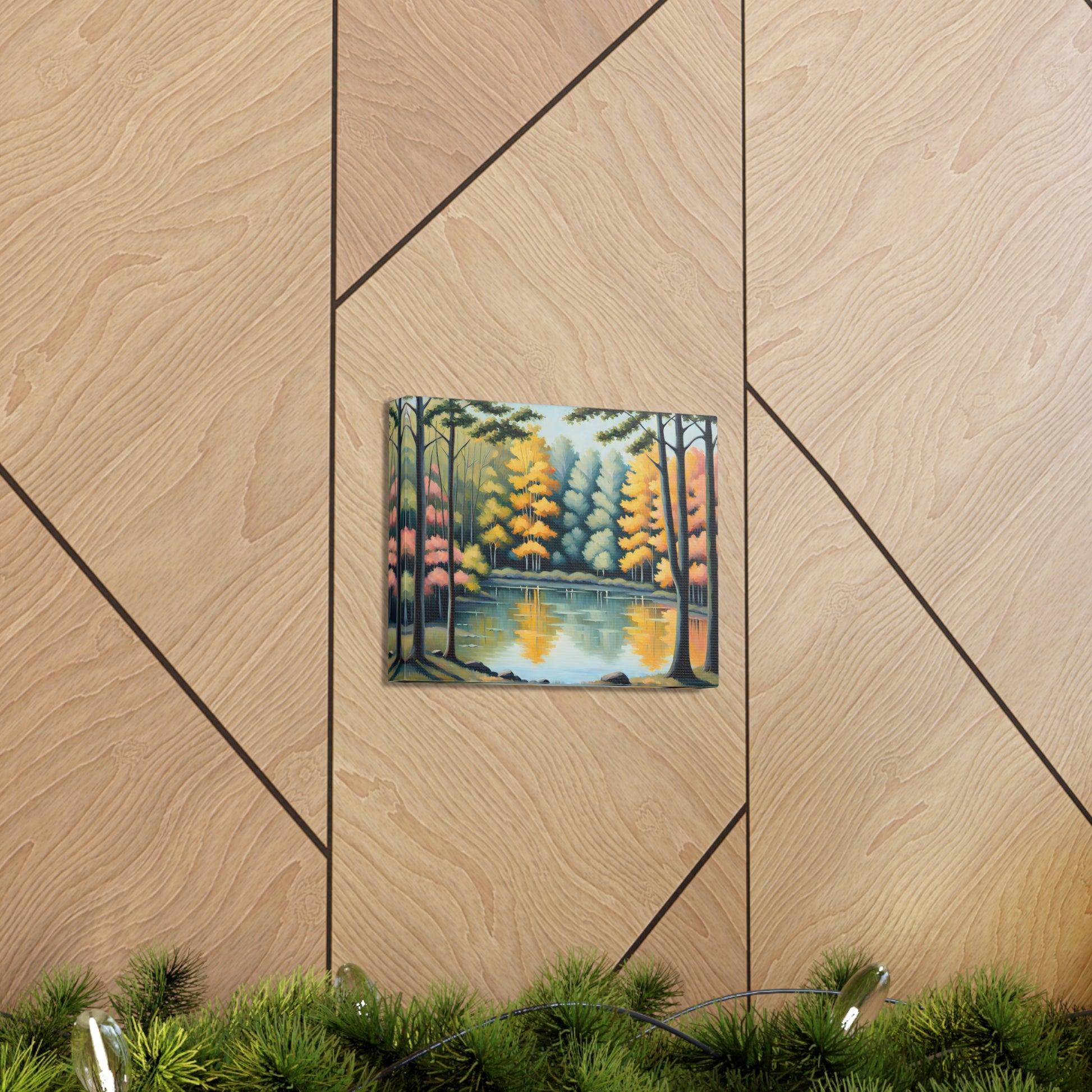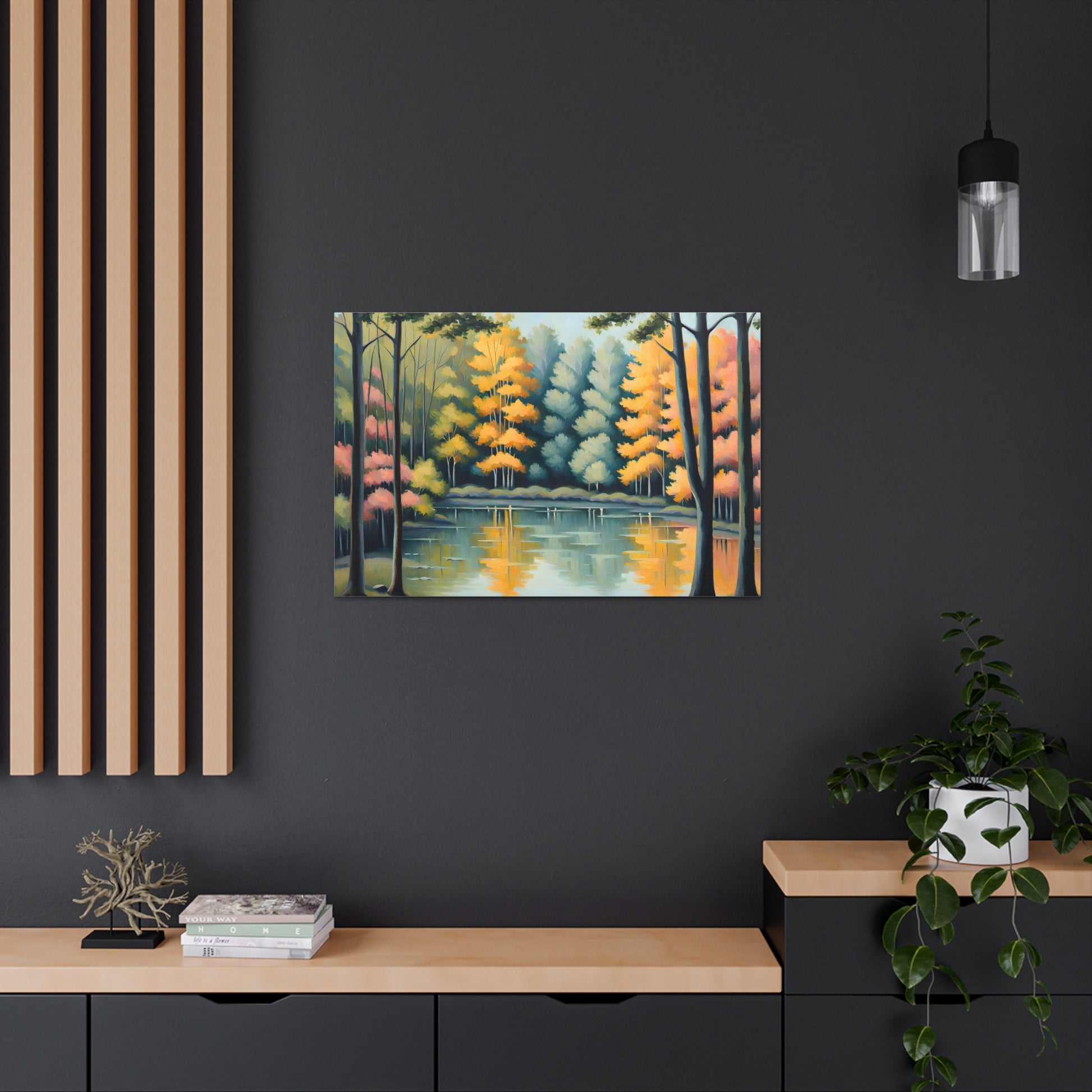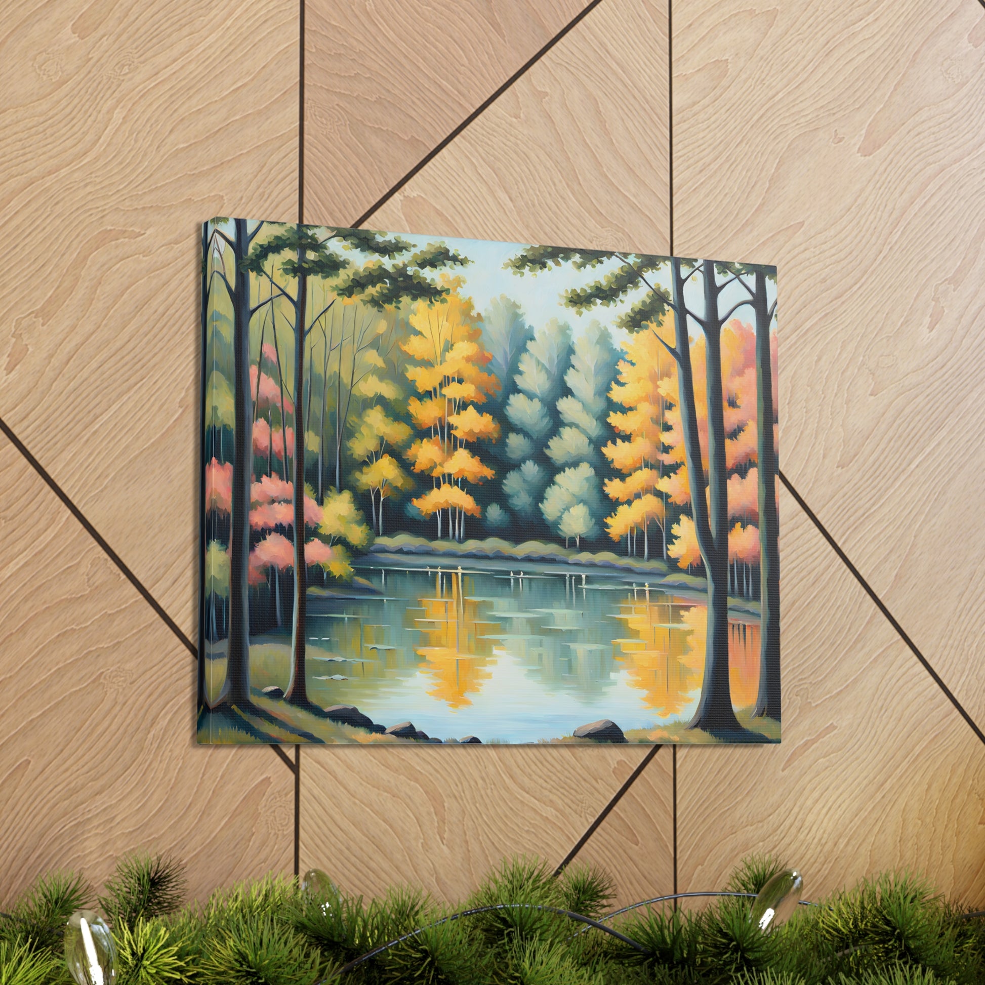 Step into a tranquil woodland oasis with "Serene Woodland." This oil painting depicts a peaceful forest by a still lake, capturing the soothing beauty of autumnal trees reflected in the water.