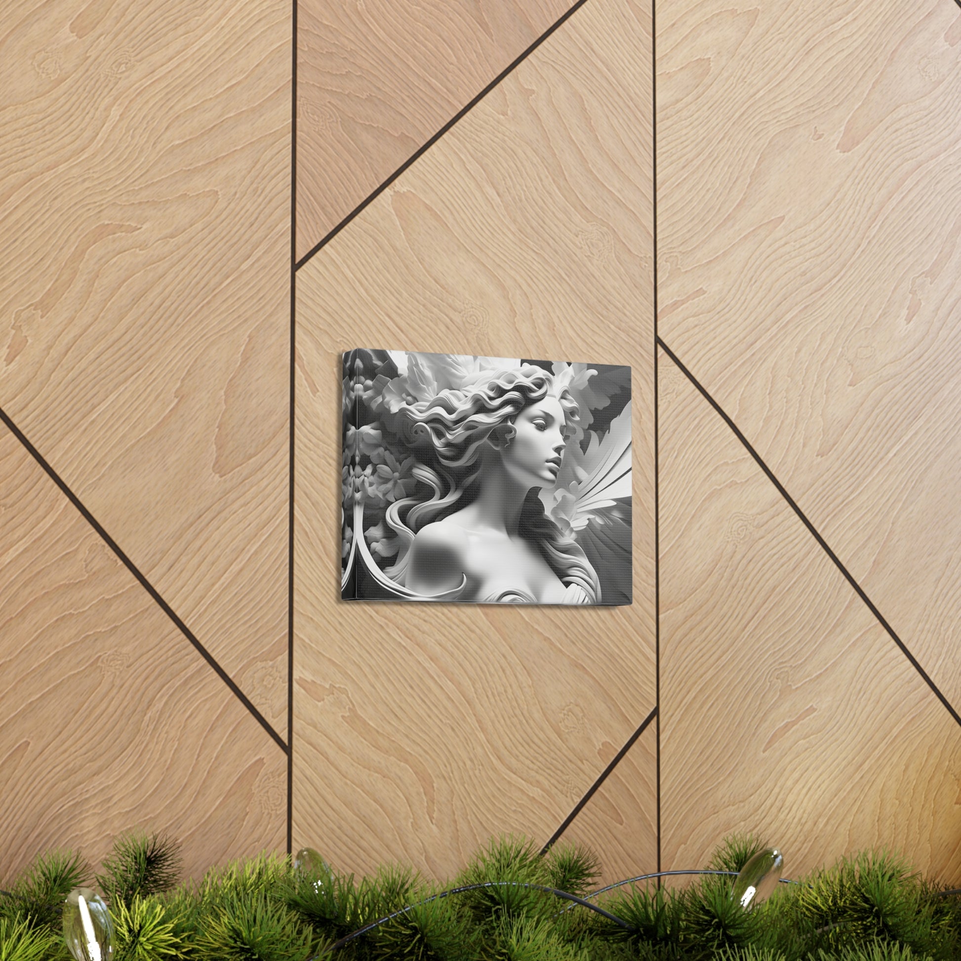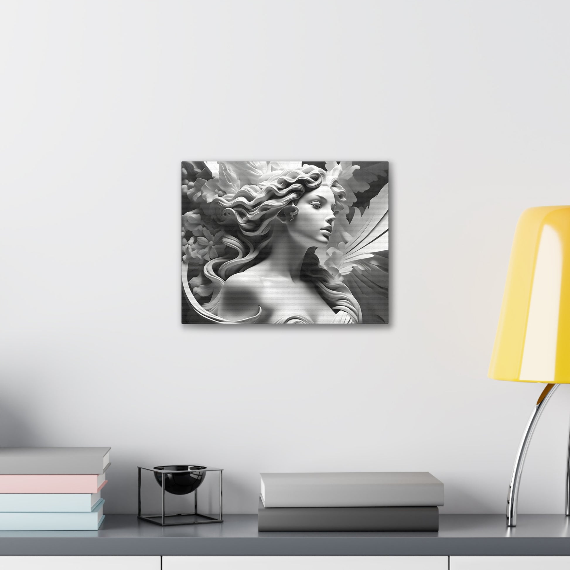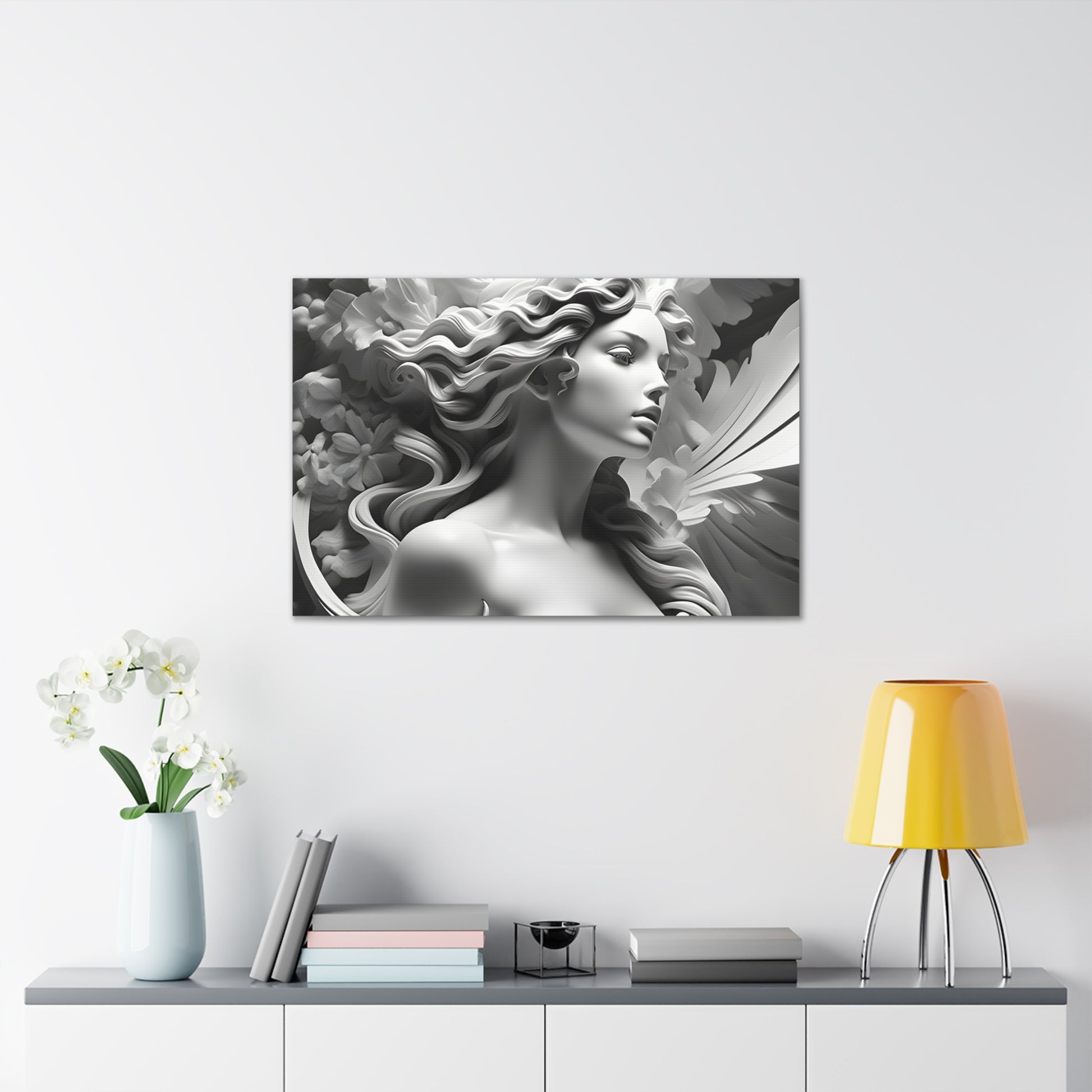 Crafted meticulously from premium-quality cotton, "Statue in Bloom" embodies both durability and sophistication. Its monochromatic allure enhances indoor settings, infusing an aura of timeless beauty and tranquility into your home or office walls. Please note, this artwork is exclusively designed for indoor use, adding a touch of refined style to your interior spaces.