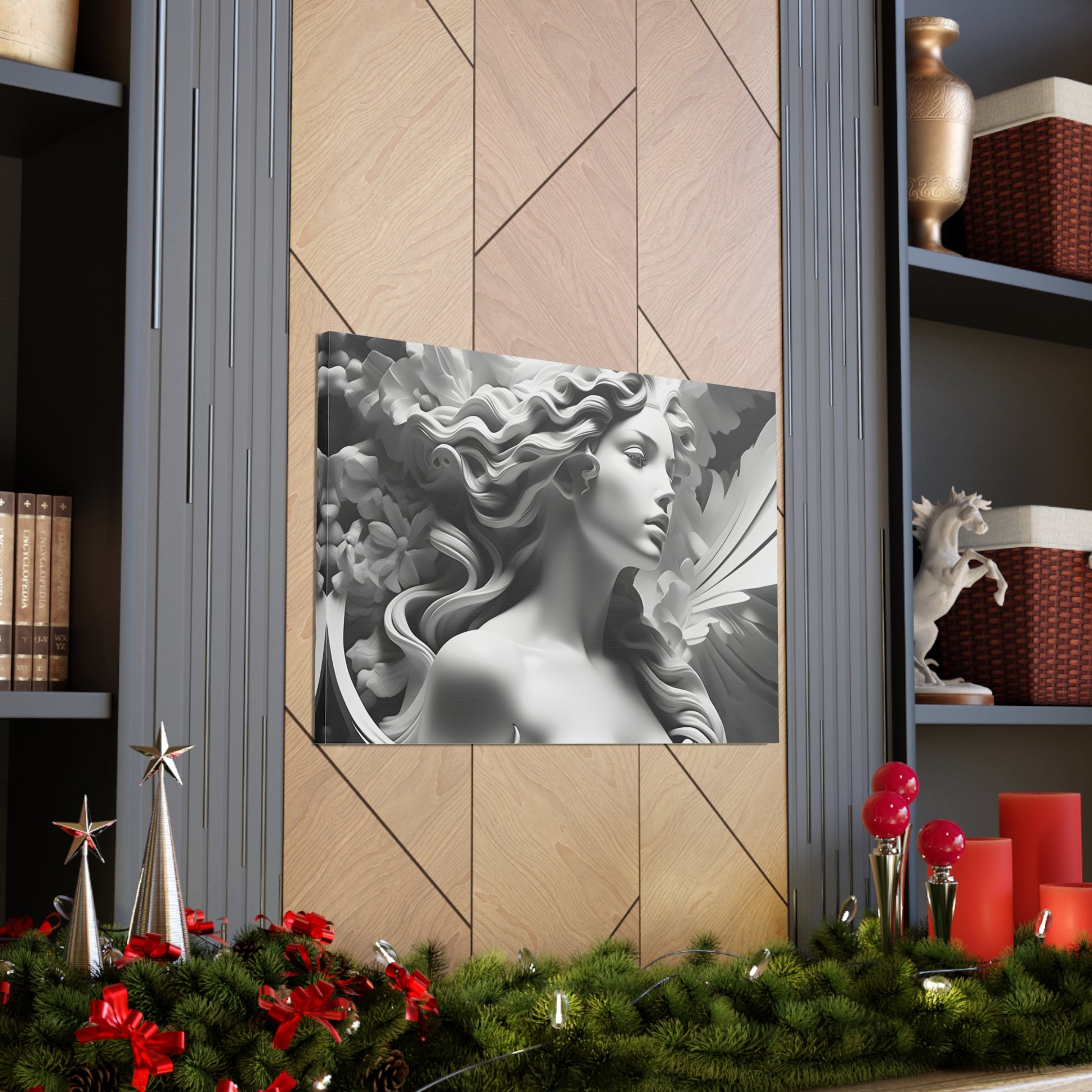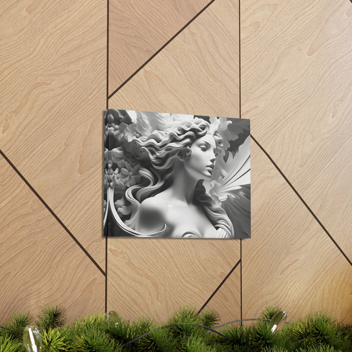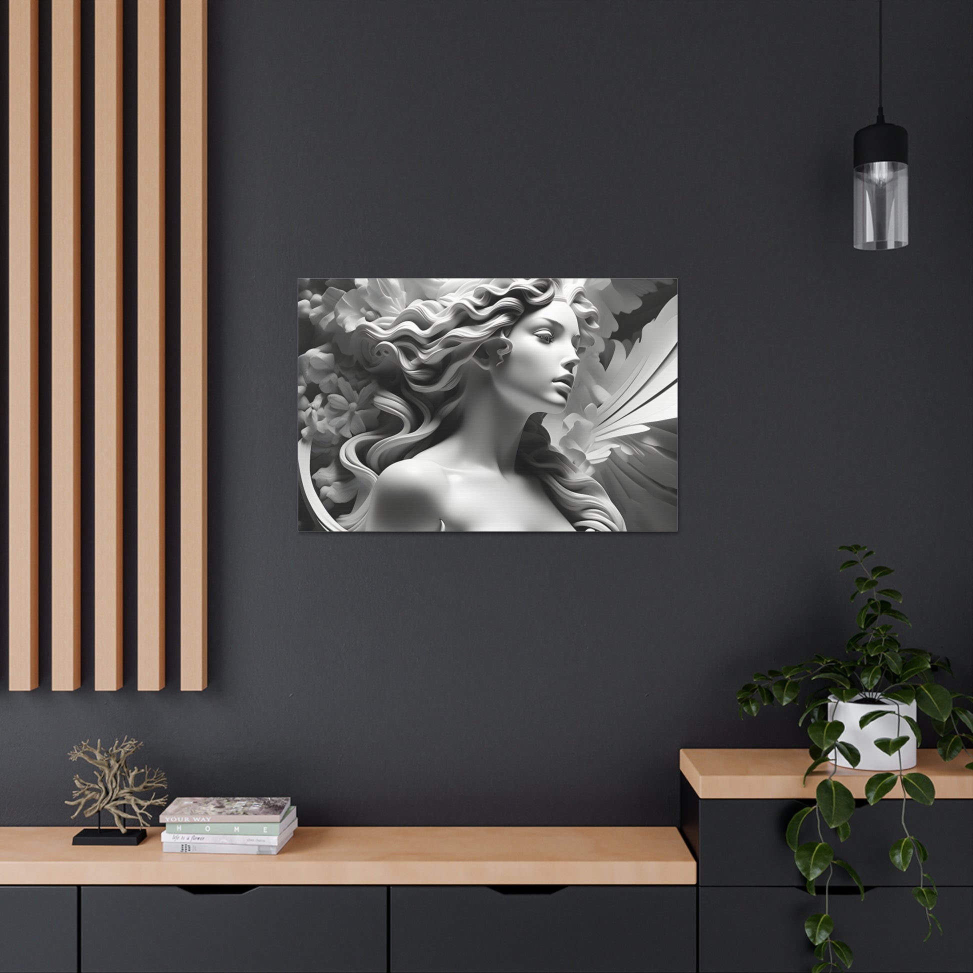 Crafted meticulously from premium-quality cotton, "Statue in Bloom" embodies both durability and sophistication. Its monochromatic allure enhances indoor settings, infusing an aura of timeless beauty and tranquility into your home or office walls. Please note, this artwork is exclusively designed for indoor use, adding a touch of refined style to your interior spaces.