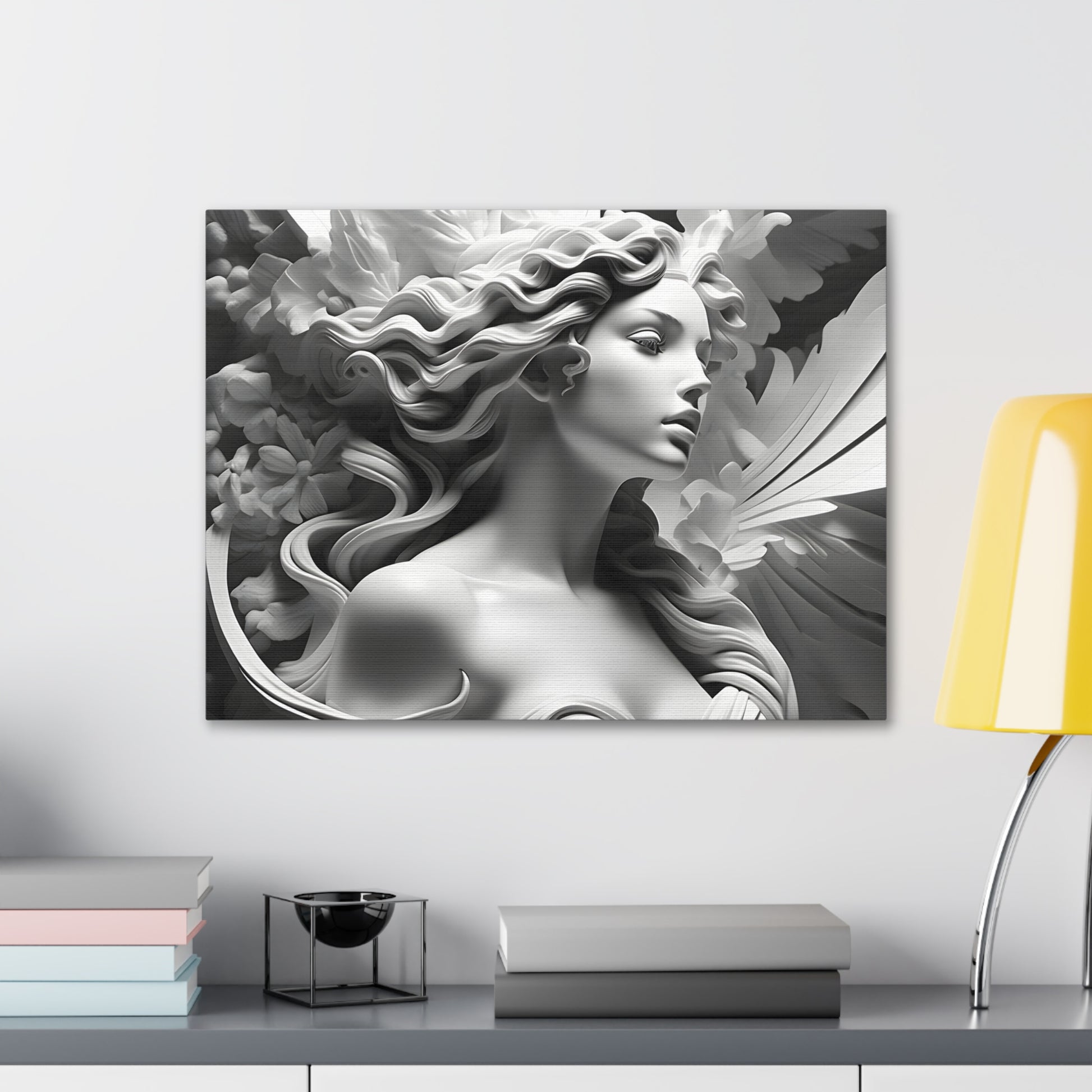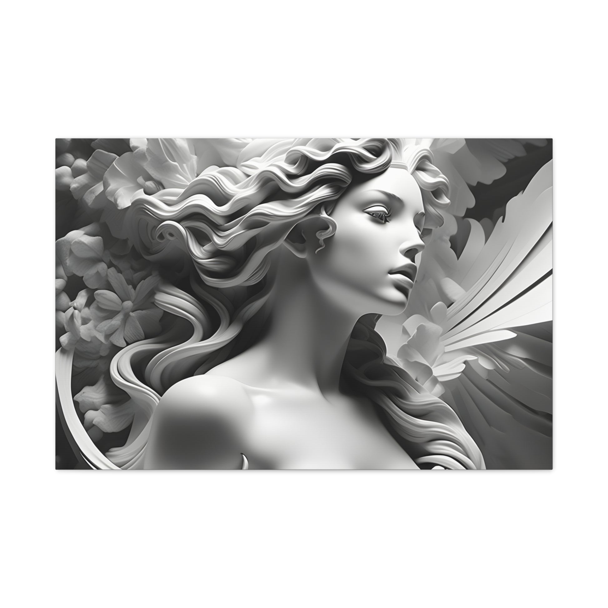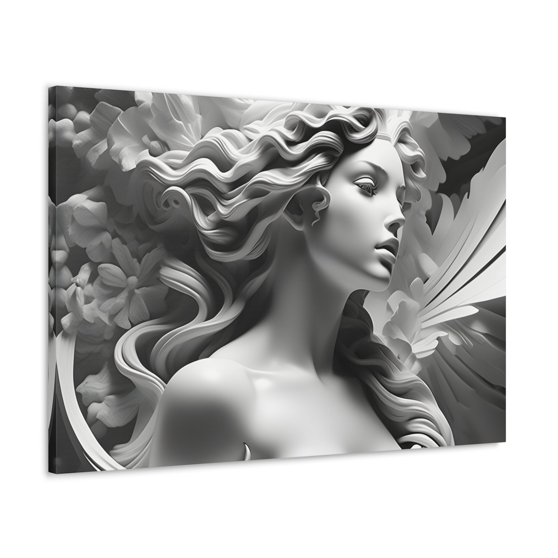 Elevate your space with "Statue in Bloom," a captivating black and white canvas artwork featuring a stunning portrayal of a woman's statue surrounded by blooming flowers. This mesmerizing piece captures the essence of elegance and natural beauty, blending the graceful figure with delicate floral accents.