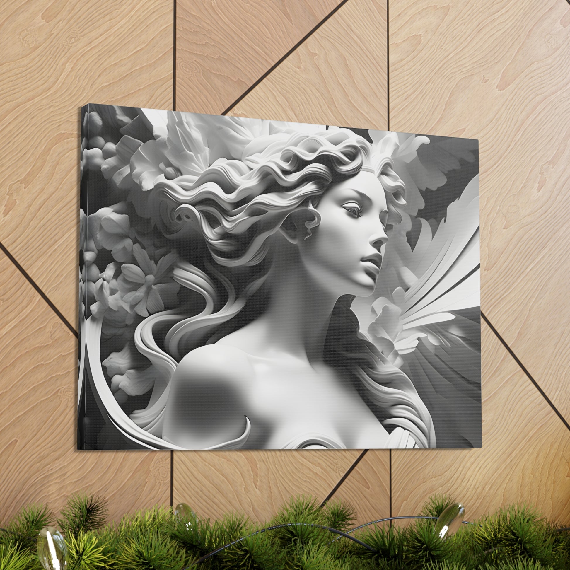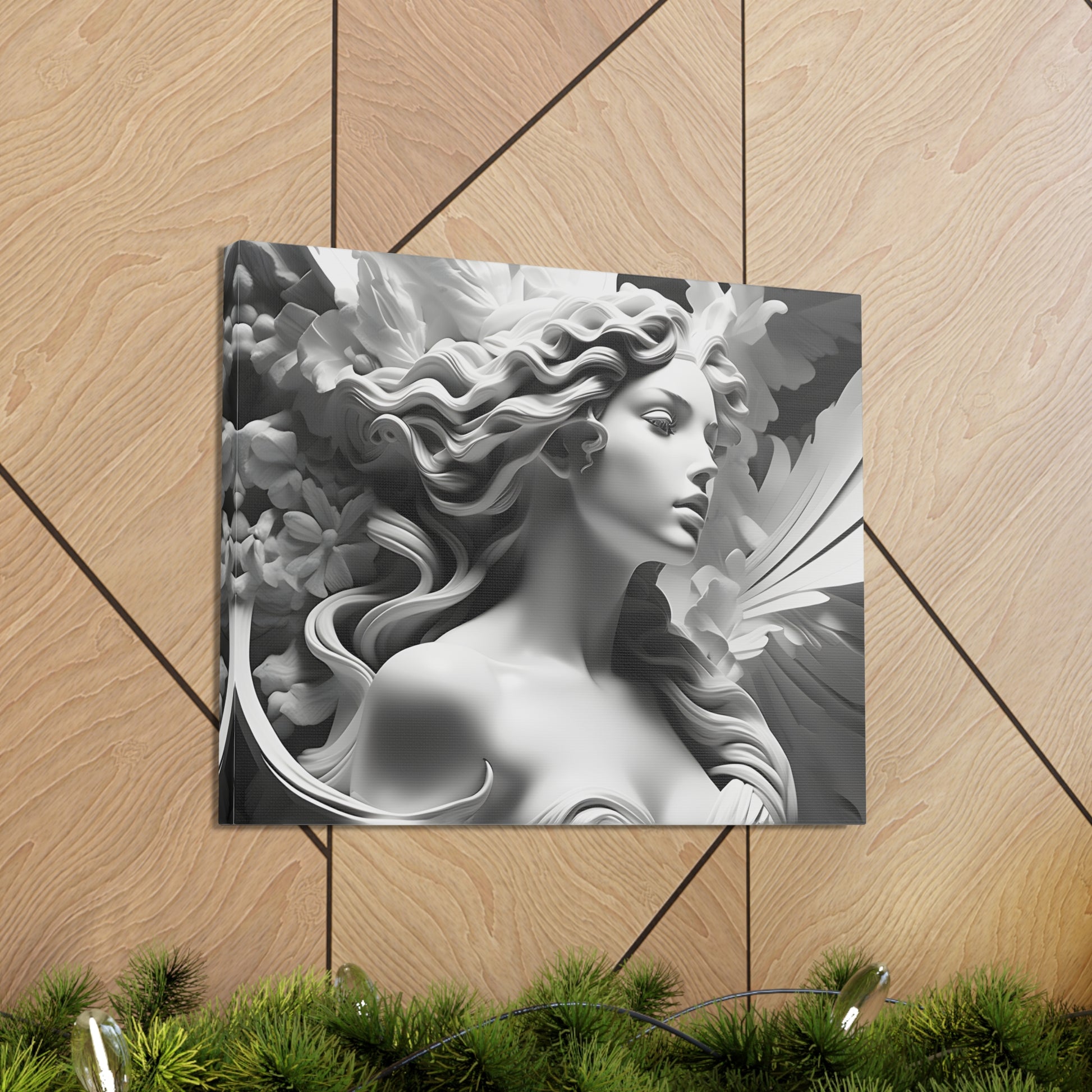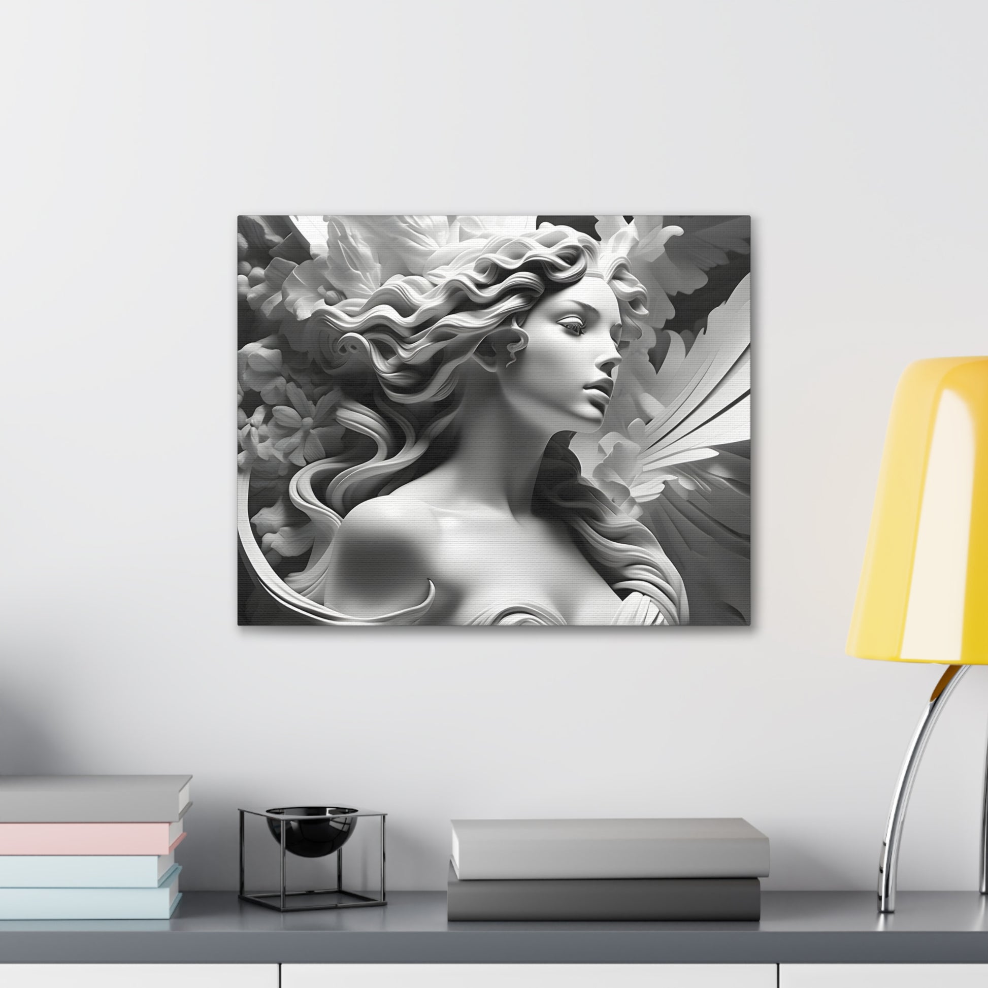 Elevate your space with "Statue in Bloom," a captivating black and white canvas artwork featuring a stunning portrayal of a woman's statue surrounded by blooming flowers. This mesmerizing piece captures the essence of elegance and natural beauty, blending the graceful figure with delicate floral accents.