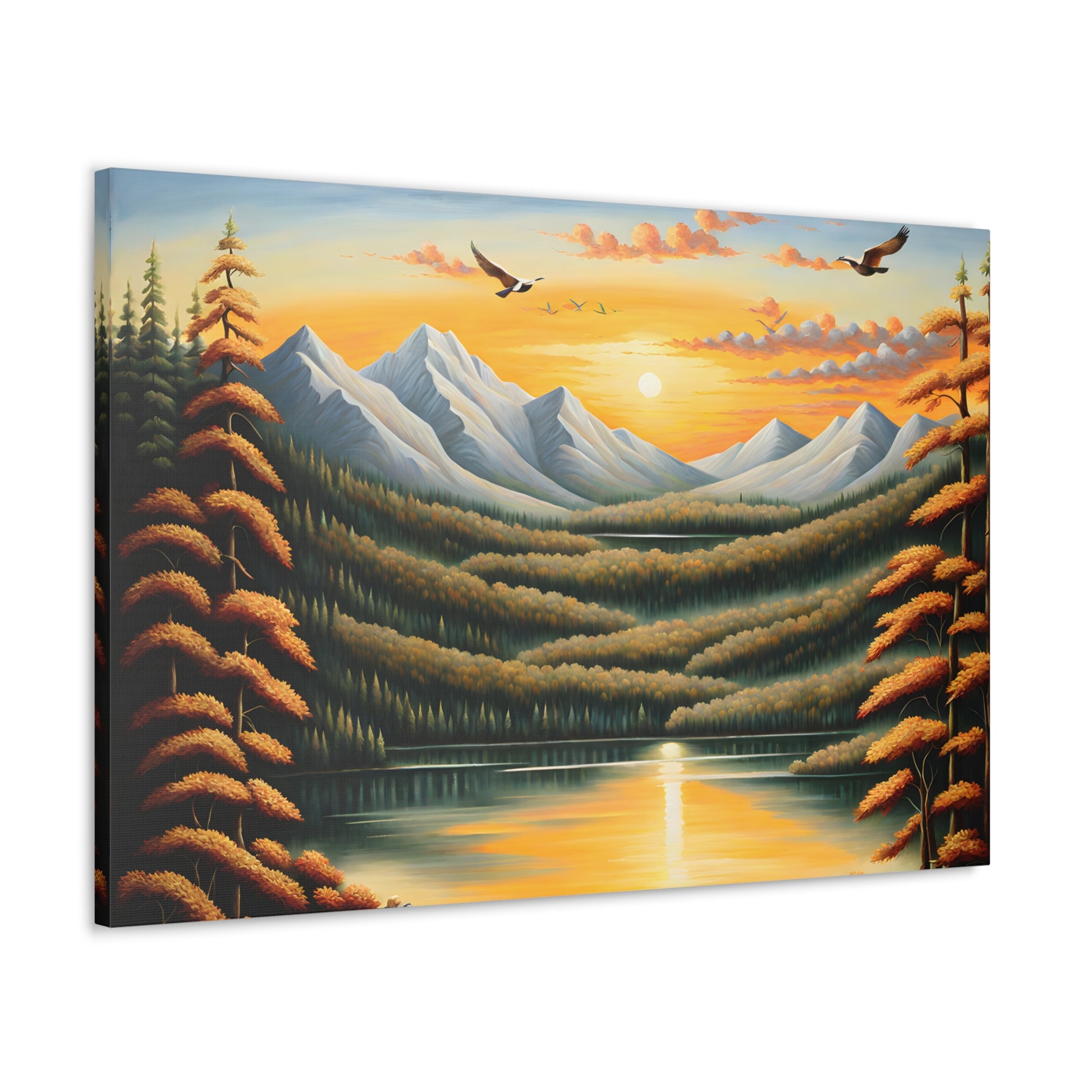 Immerse yourself in the glowing beauty of "Sunburst Valley." This oil painting features a majestic mountain range basking in the golden light of the rising sun, reflecting the tranquility of nature.