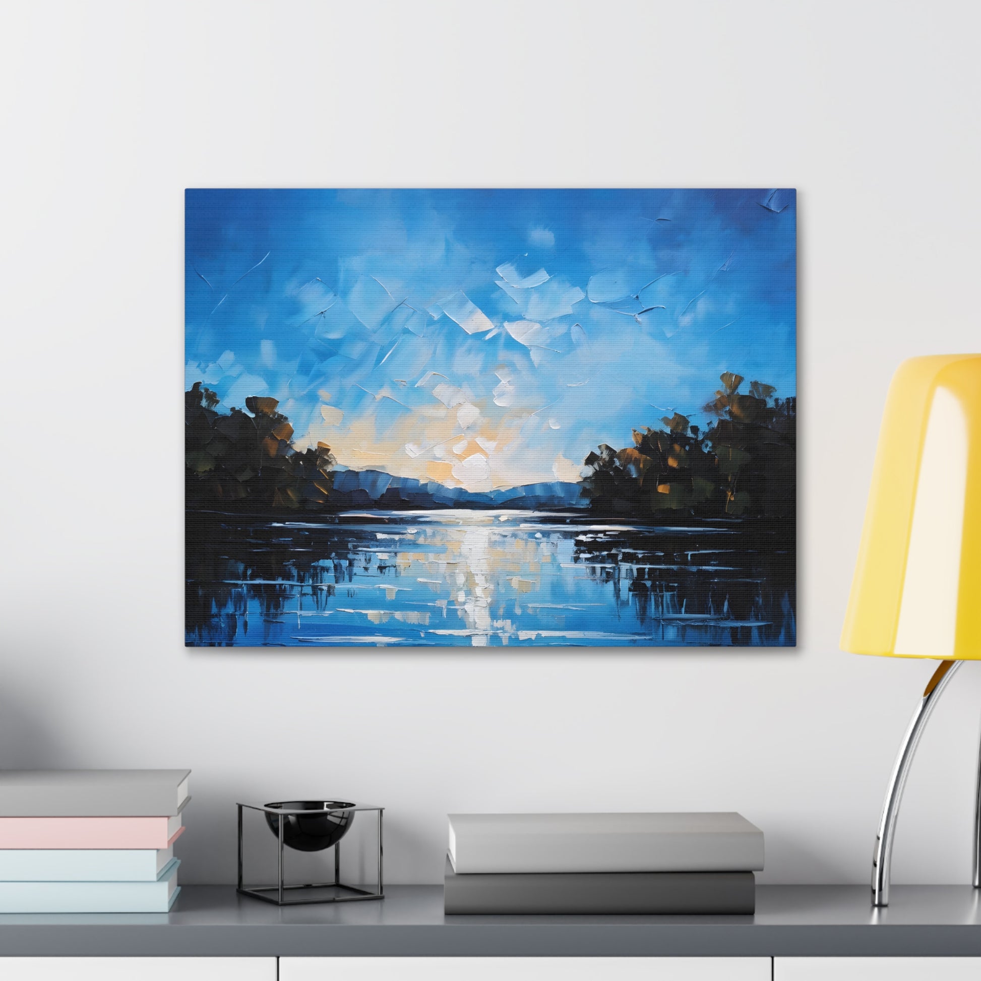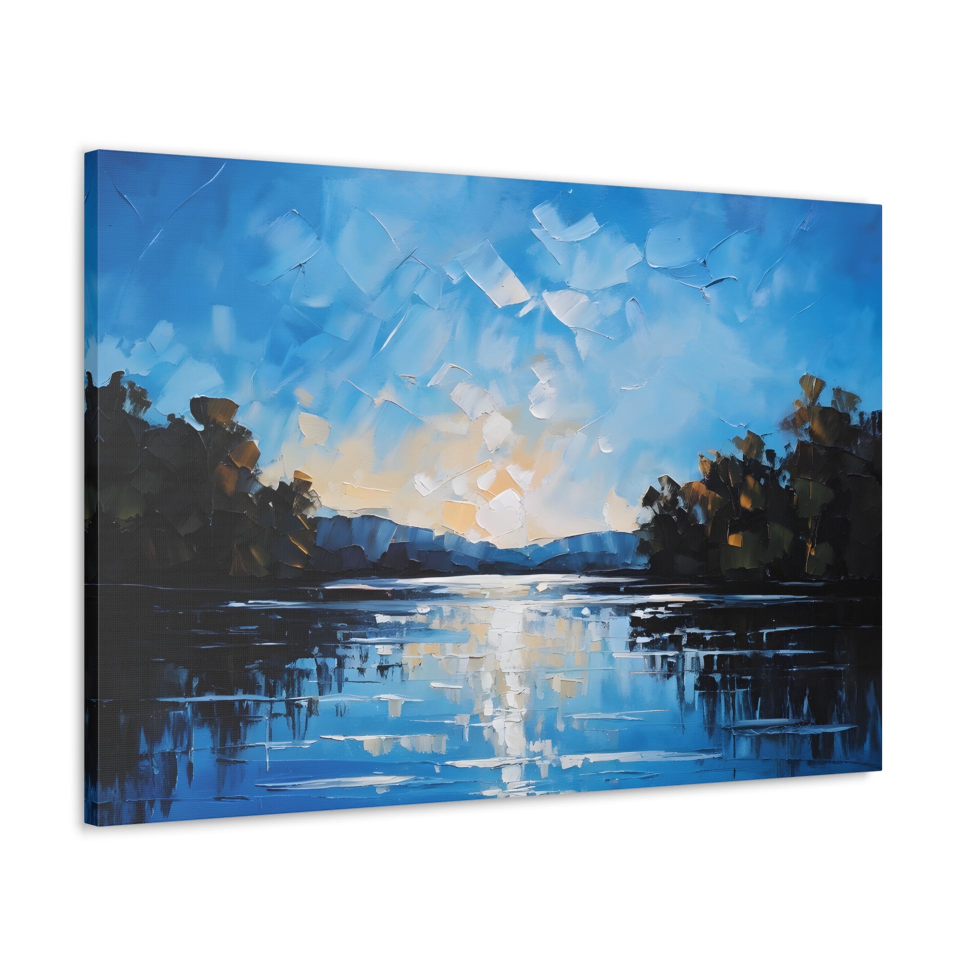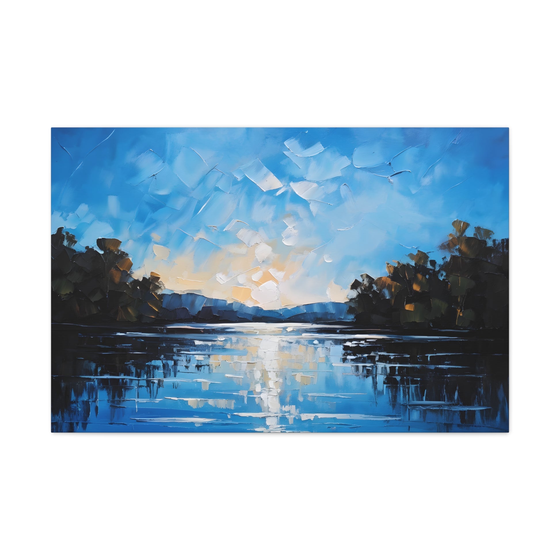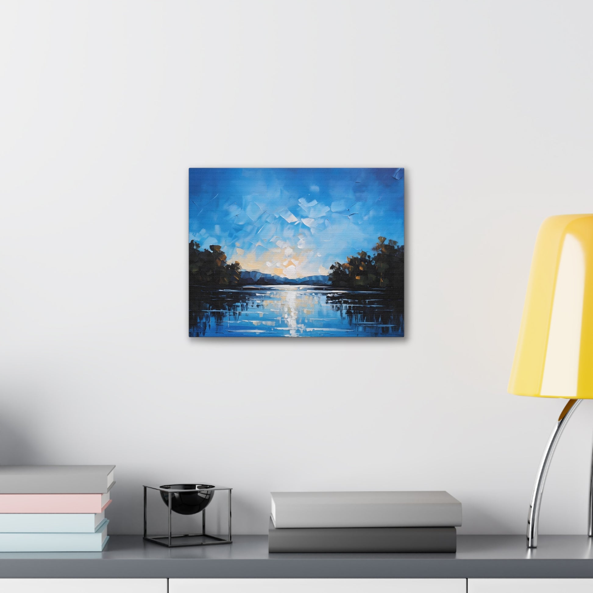 Experience the calm of the water with "Tranquil Bay." This serene oil painting on cotton canvas offers a peaceful view of a quiet bay at dusk, ideal for creating a relaxed atmosphere. NB! For indoor use only.