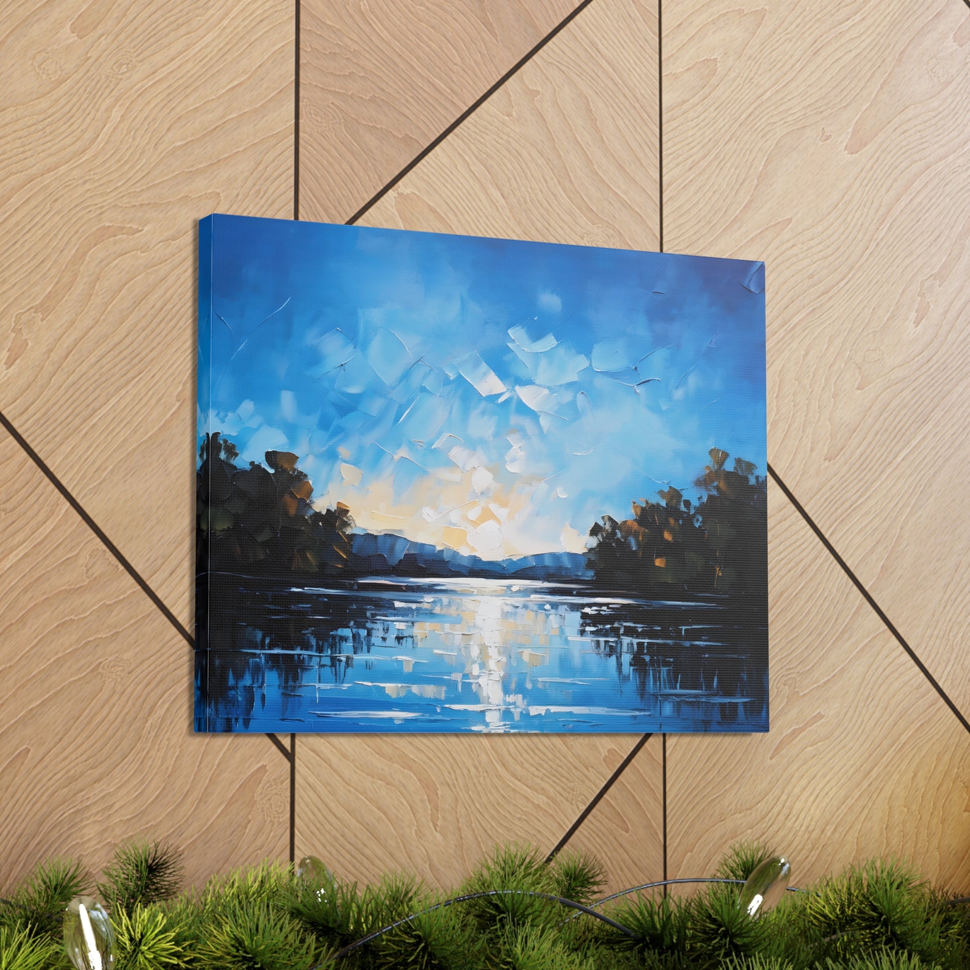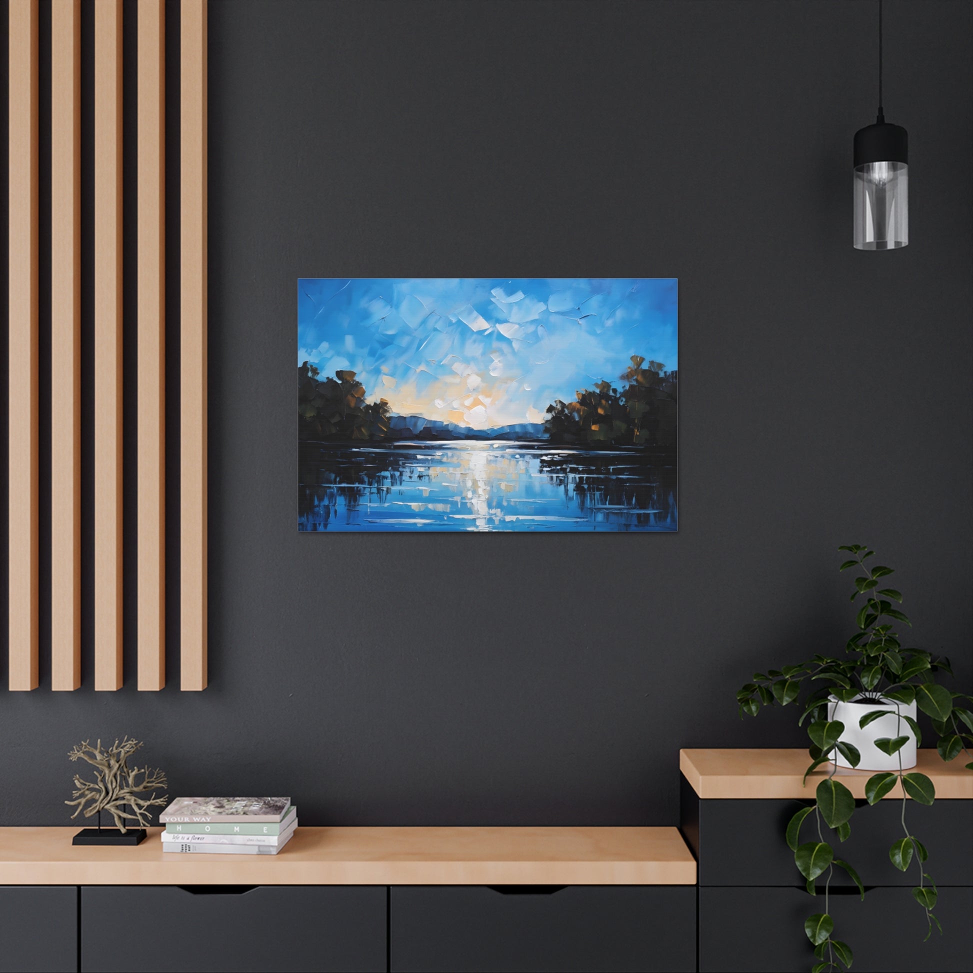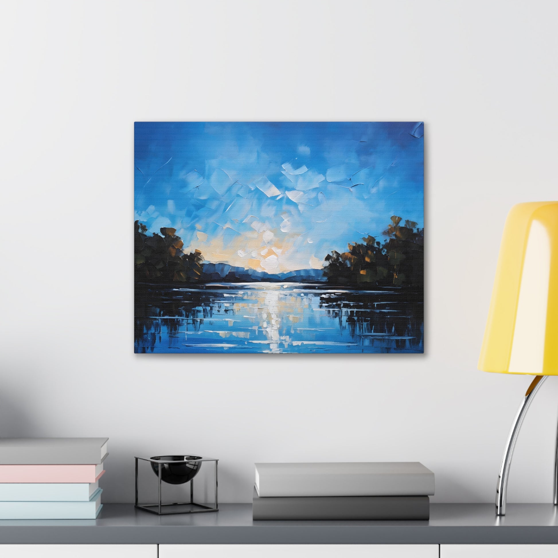 Experience the calm of the water with "Tranquil Bay." This serene oil painting on cotton canvas offers a peaceful view of a quiet bay at dusk, ideal for creating a relaxed atmosphere. NB! For indoor use only.