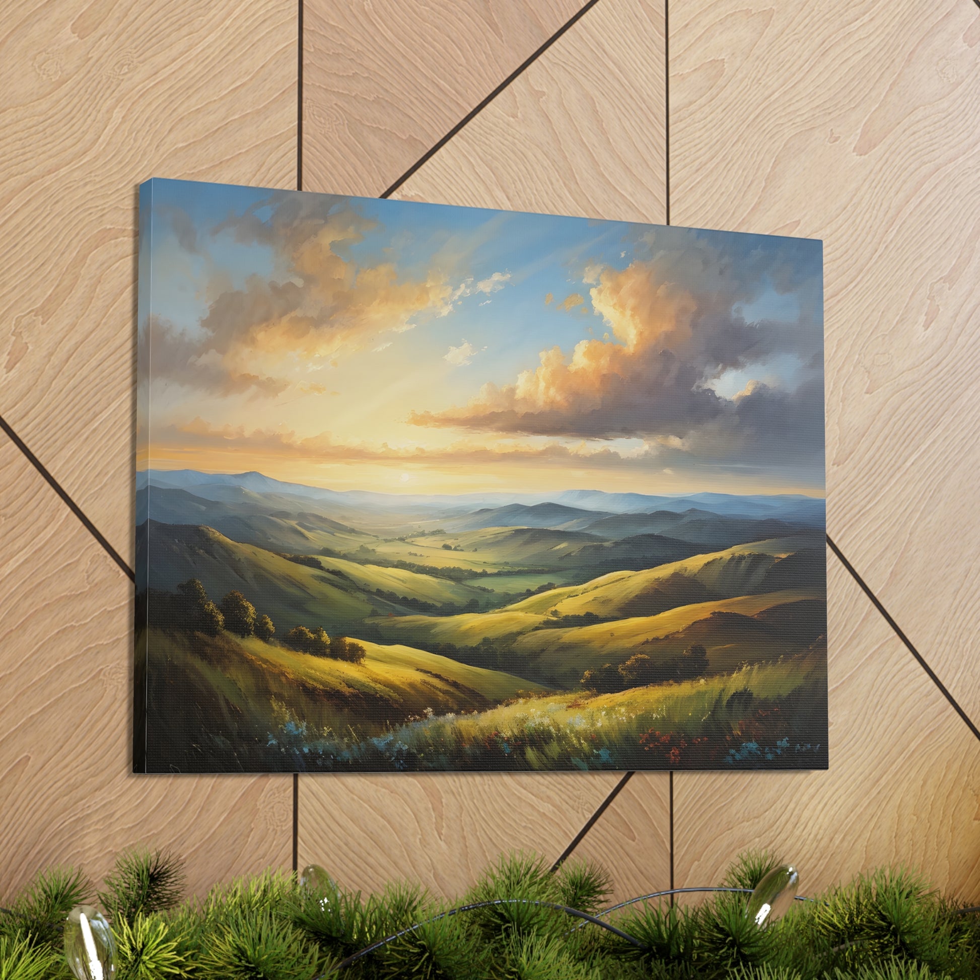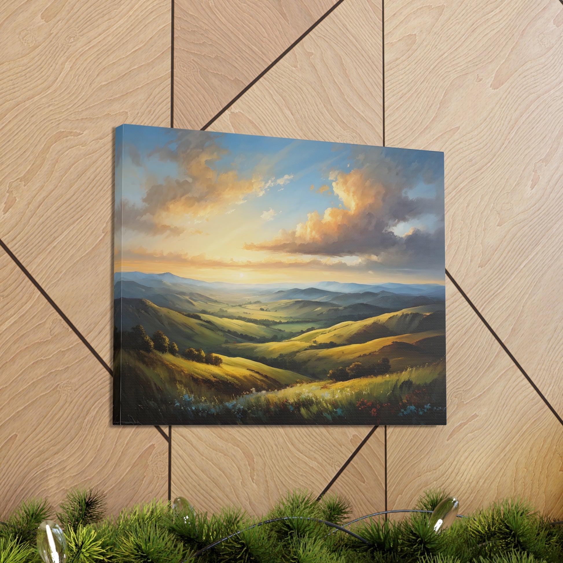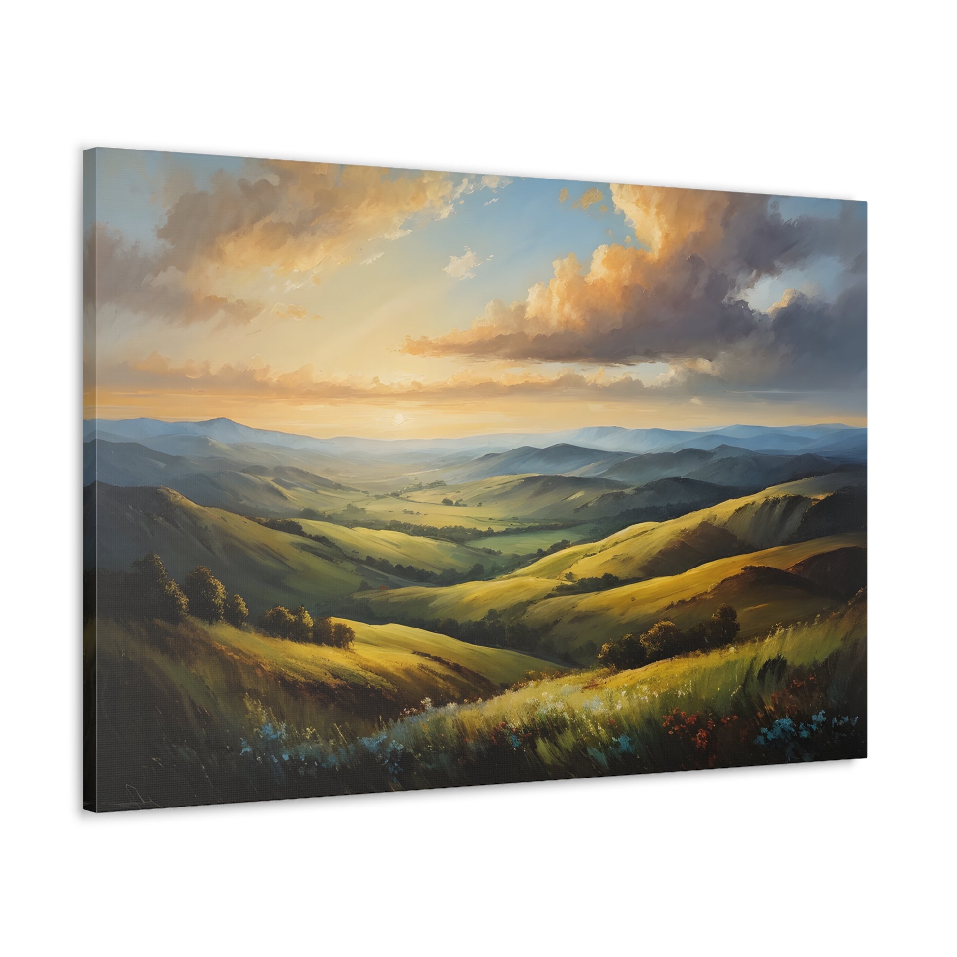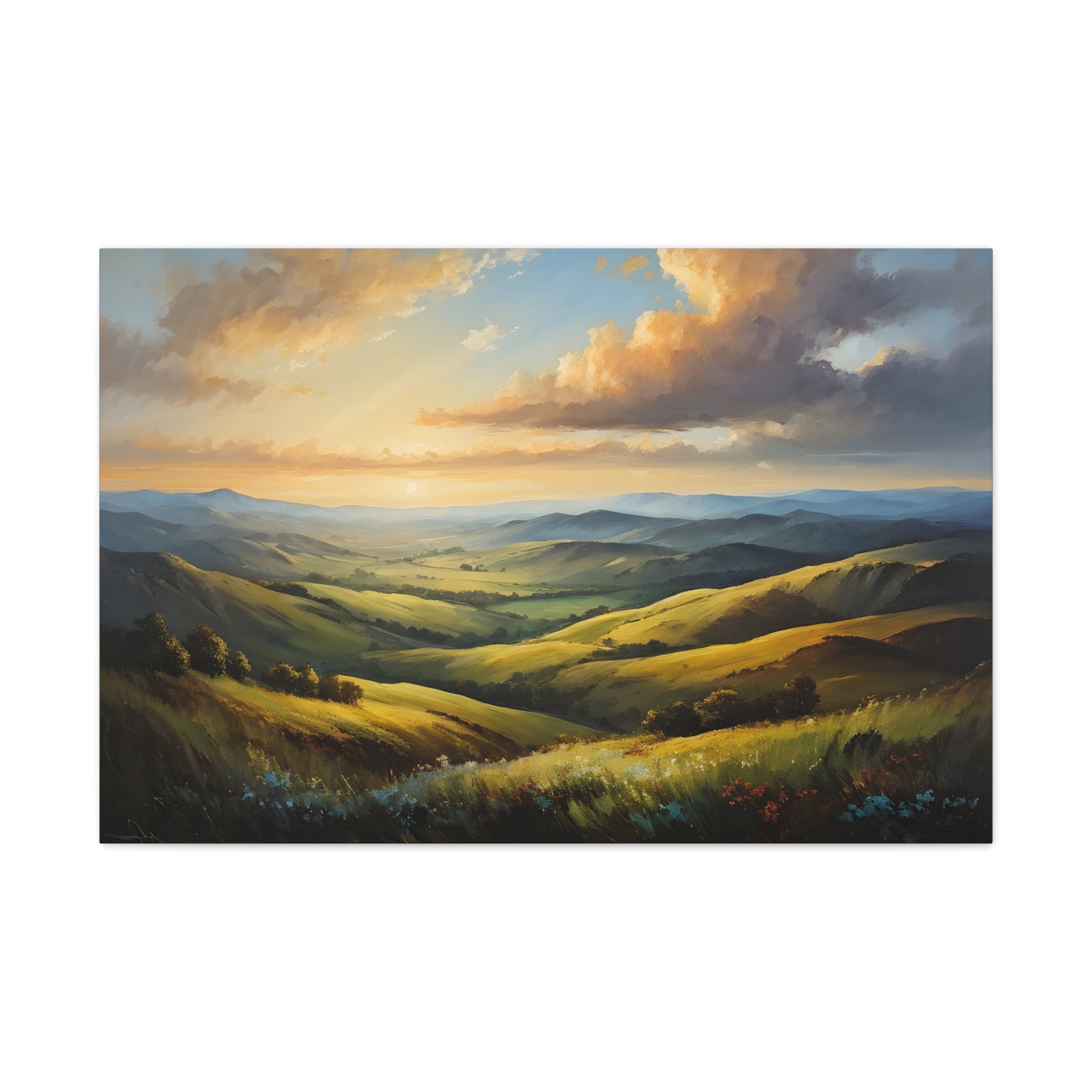 A stunning canvas featuring an oil painting of rolling grassy hills, perfect for adding a touch of nature and tranquility to any room. Ideal for art lovers and nature enthusiasts, this canvas is relevant for home decor, gifts for birthdays, housewarmings, Mother's Day, and anniversaries.