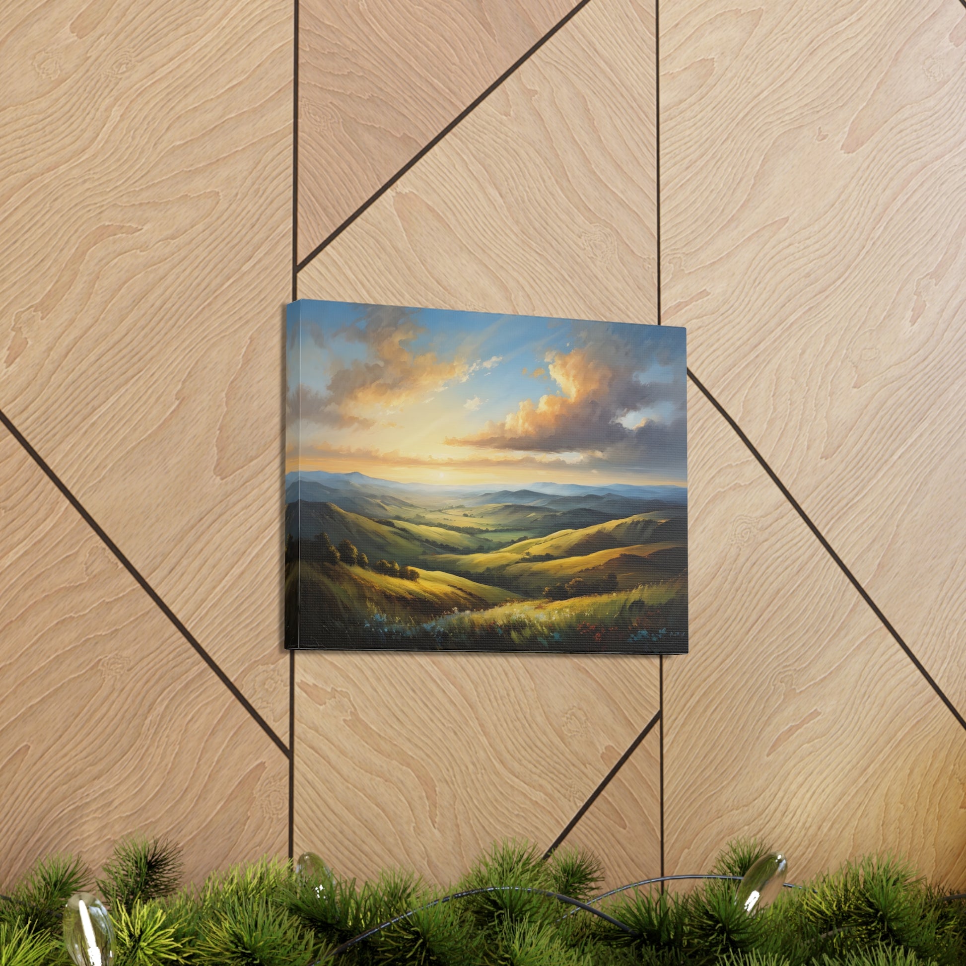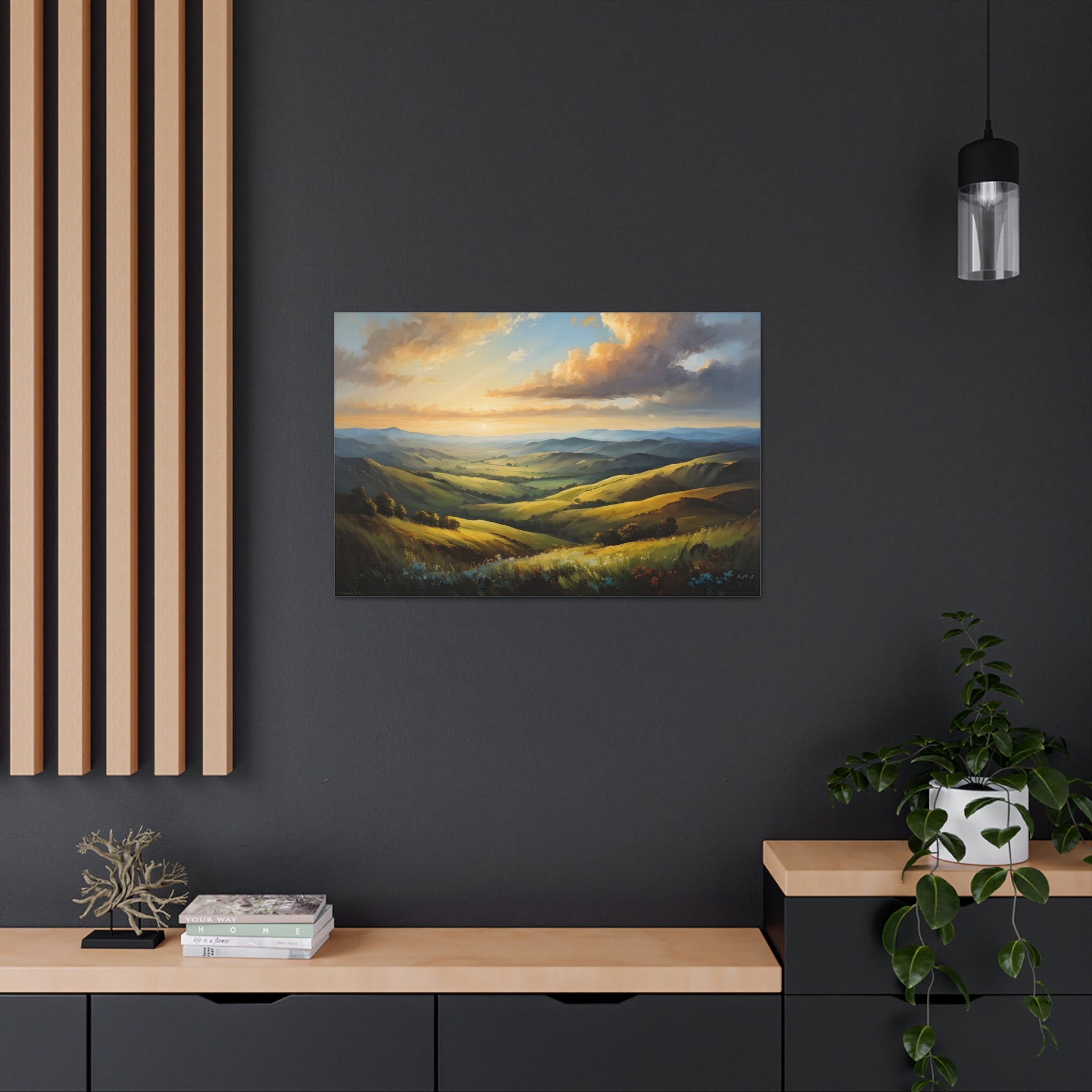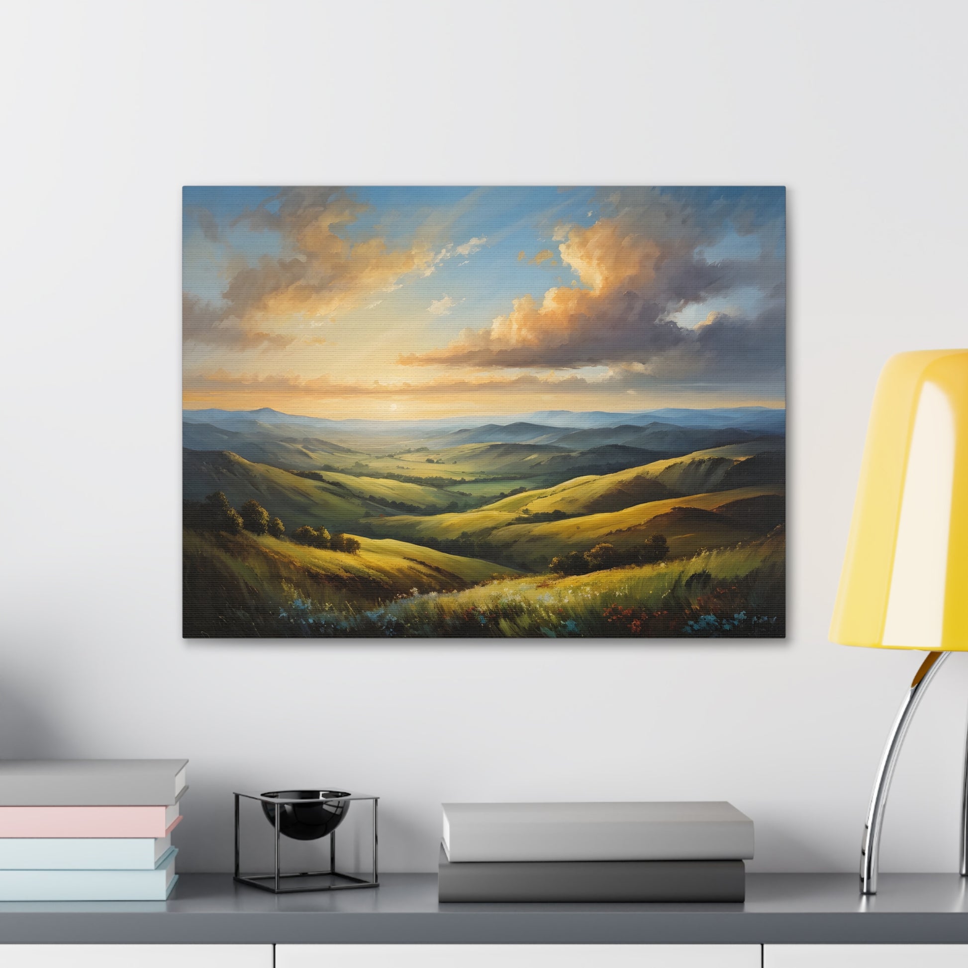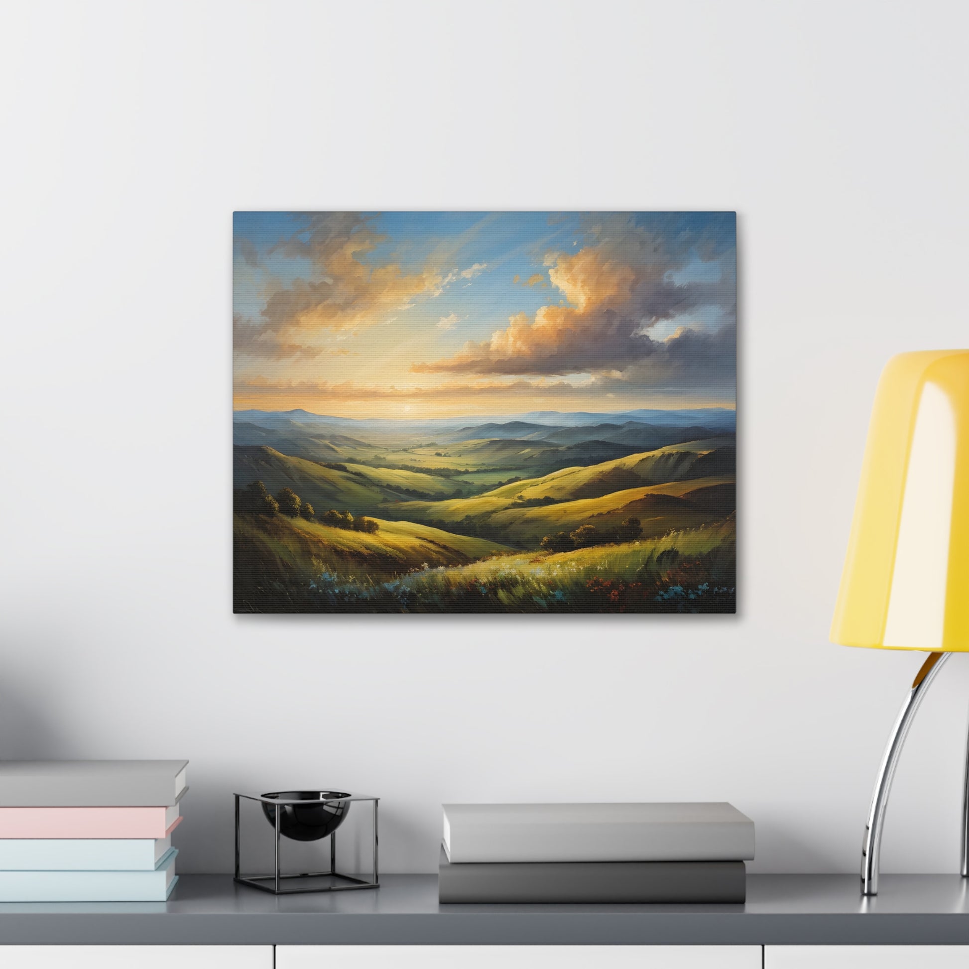 A stunning canvas featuring an oil painting of rolling grassy hills, perfect for adding a touch of nature and tranquility to any room. Ideal for art lovers and nature enthusiasts, this canvas is relevant for home decor, gifts for birthdays, housewarmings, Mother's Day, and anniversaries.