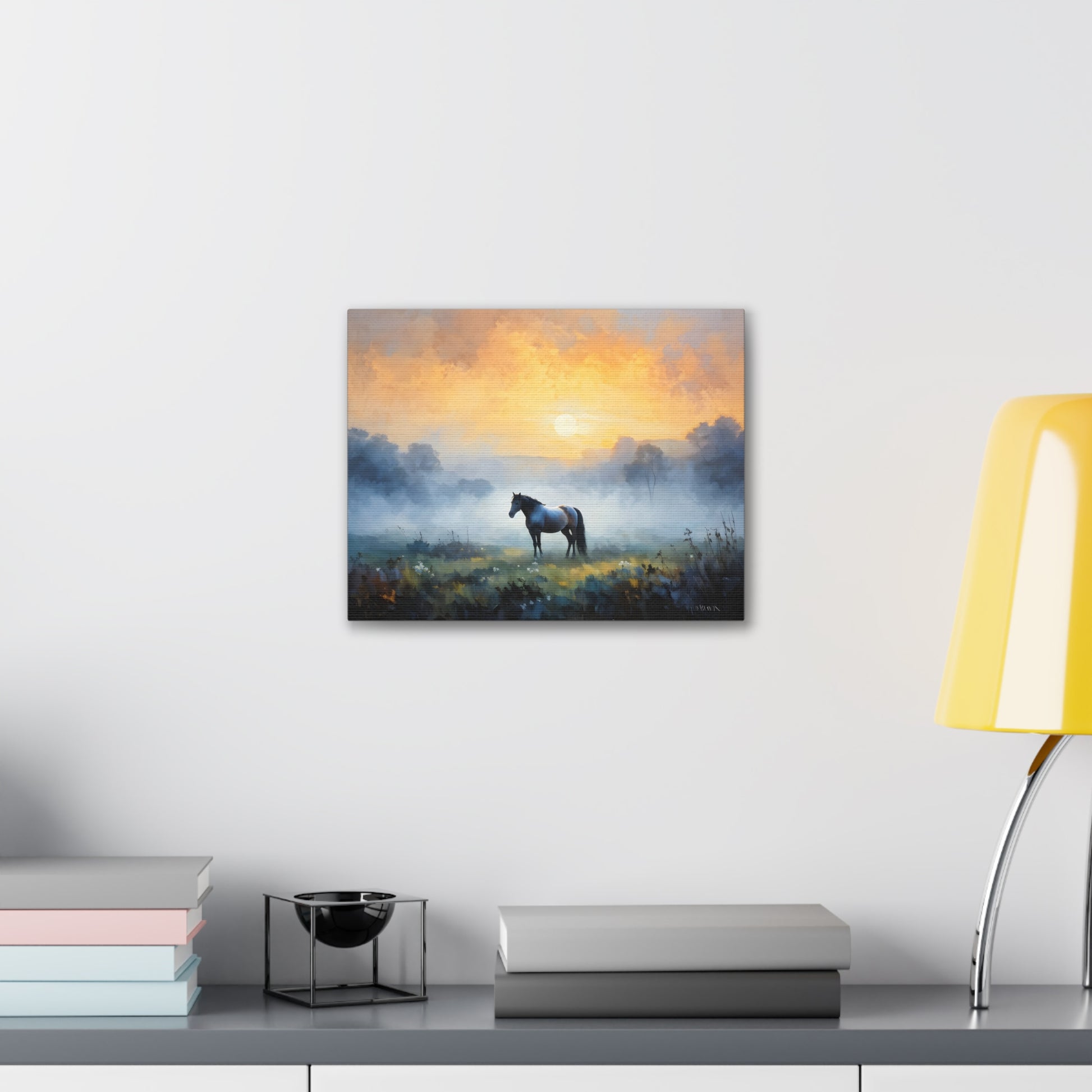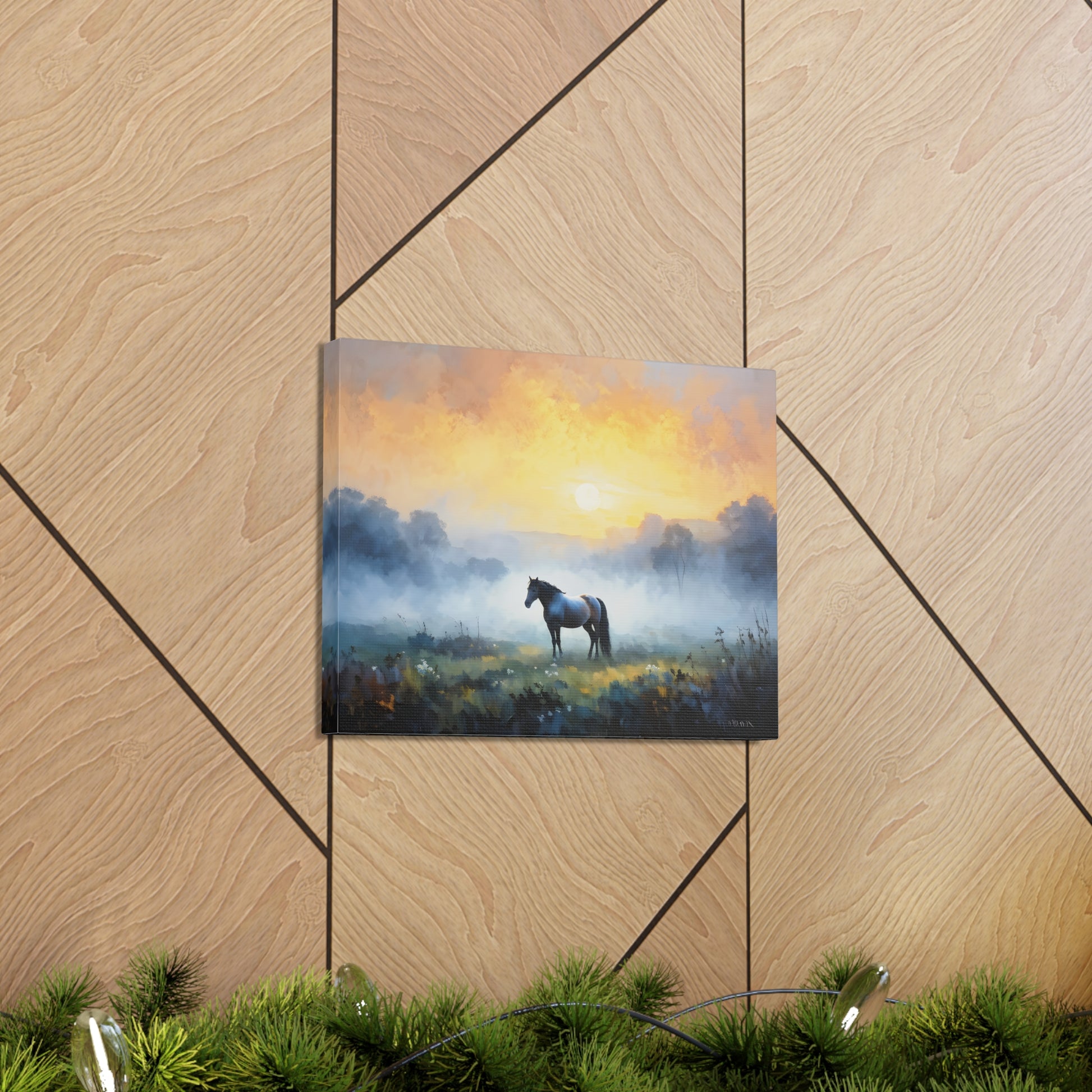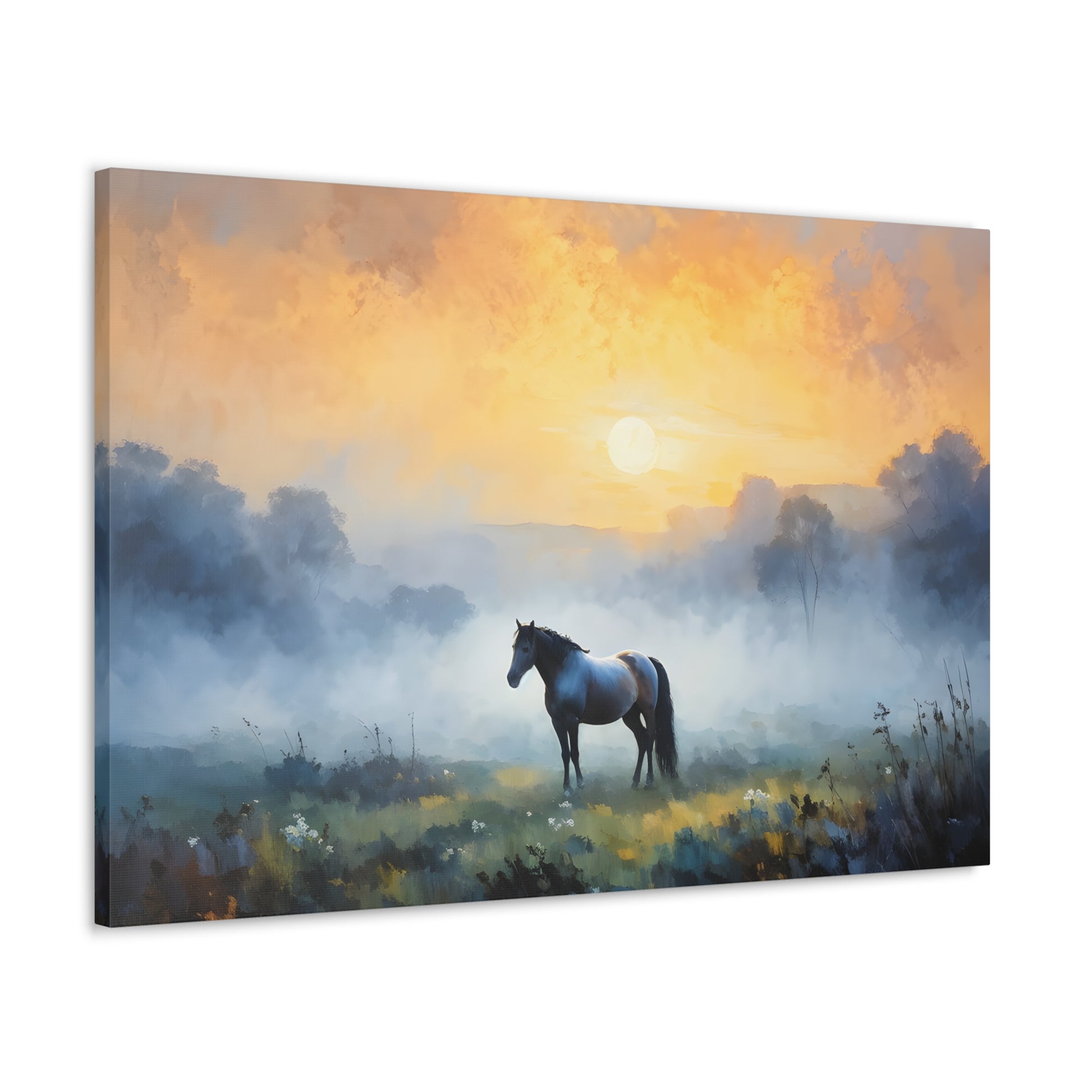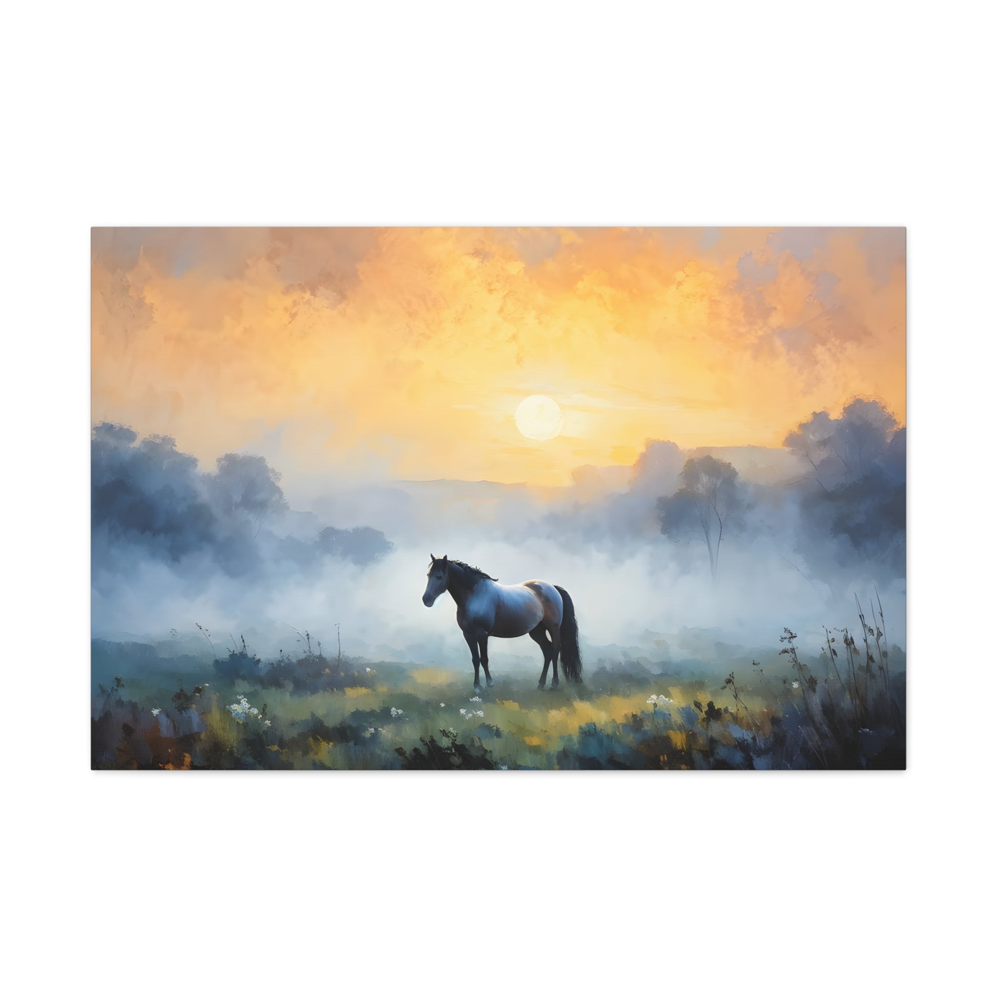 "Tranquil Meadows" captures the serene beauty of a horse grazing in a misty field at sunrise. Painted on high-quality cotton canvas, this artwork brings the calm and quiet of nature into your indoor spaces, perfect for creating a peaceful and reflective atmosphere.