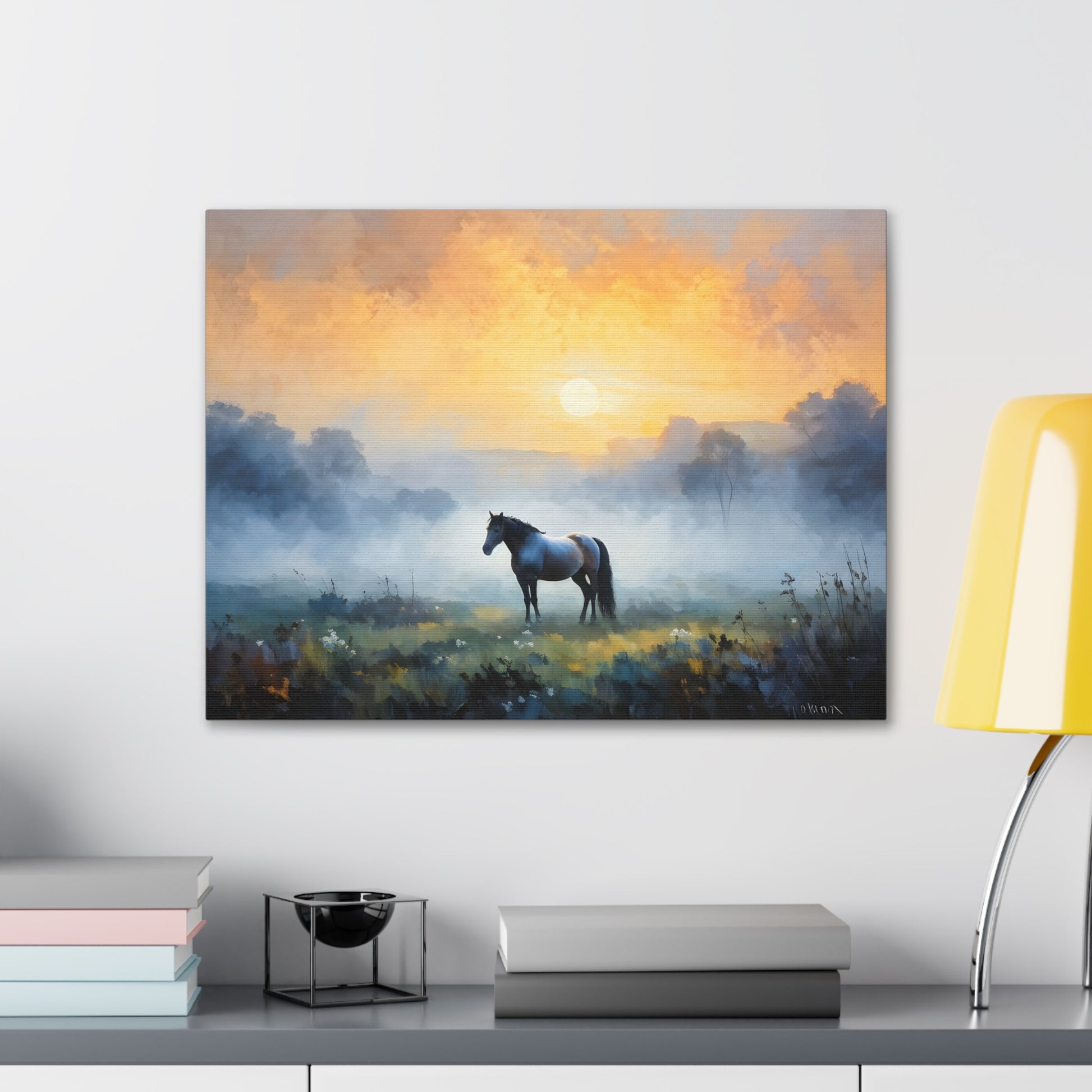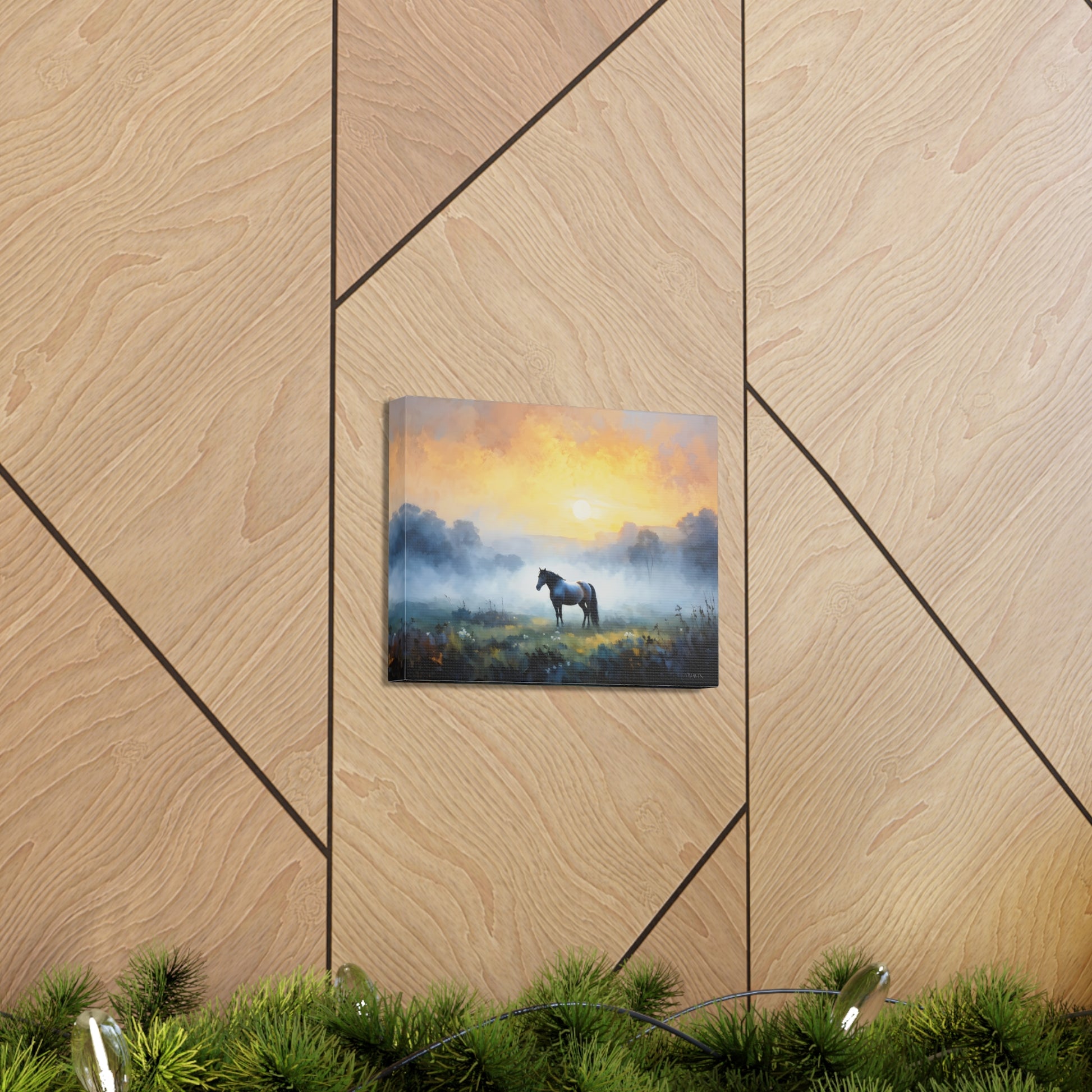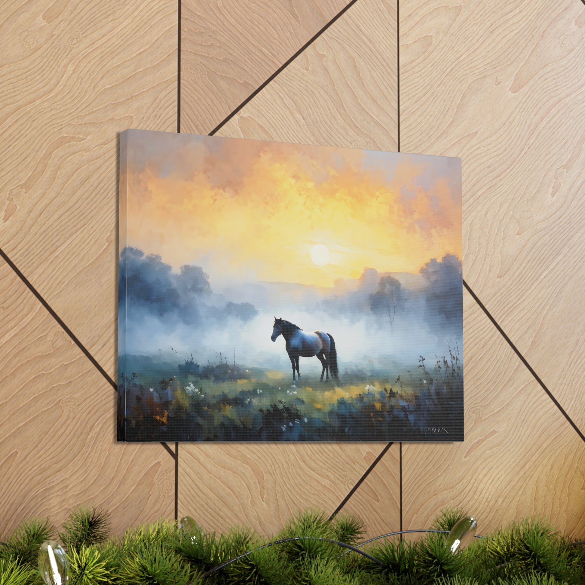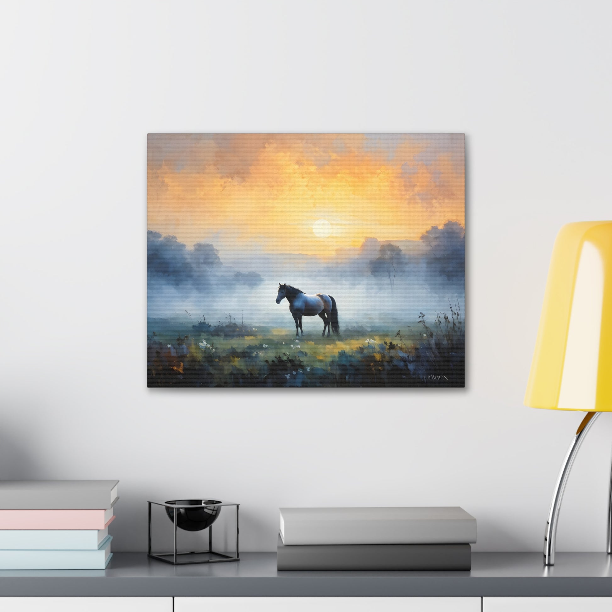 "Tranquil Meadows" captures the serene beauty of a horse grazing in a misty field at sunrise. Painted on high-quality cotton canvas, this artwork brings the calm and quiet of nature into your indoor spaces, perfect for creating a peaceful and reflective atmosphere.