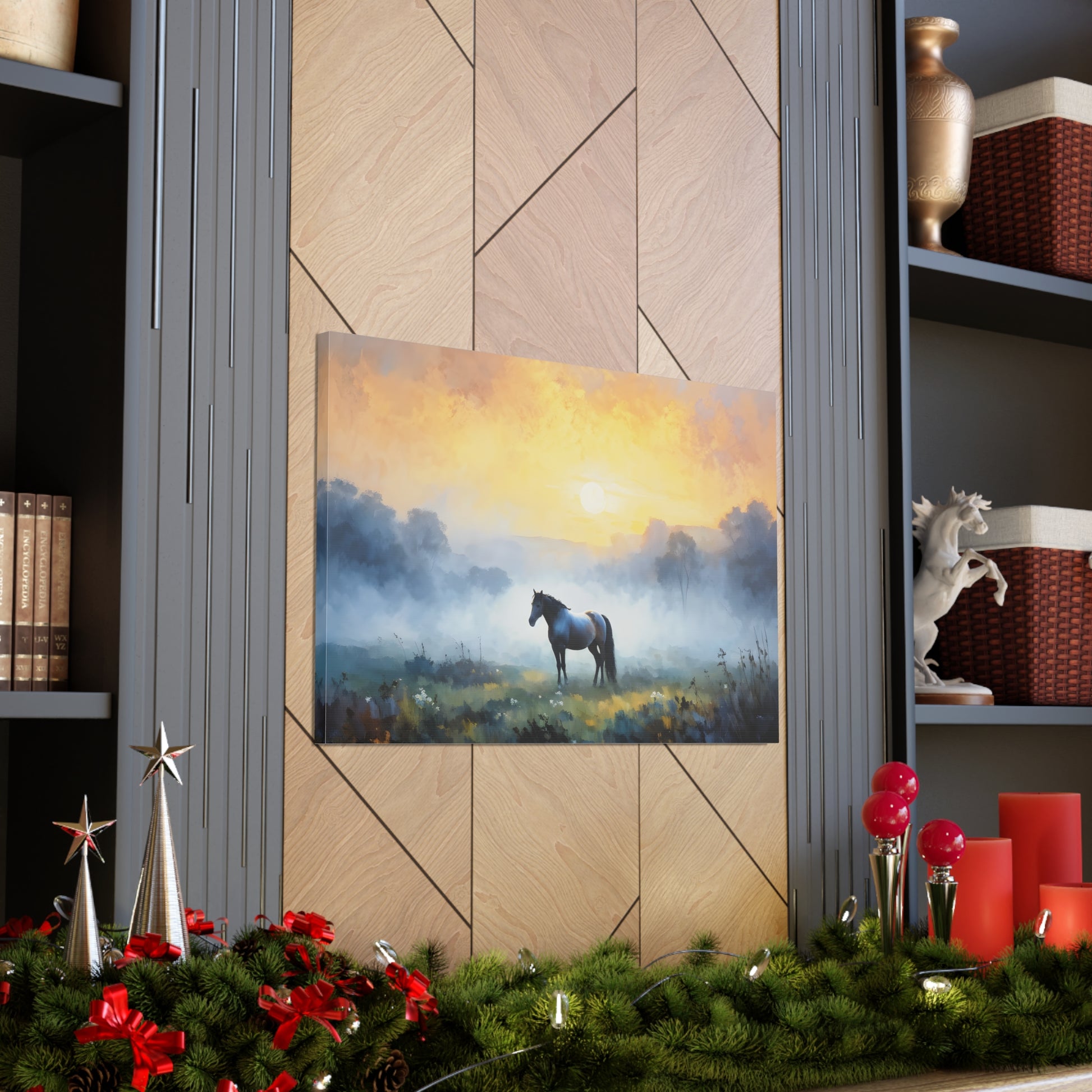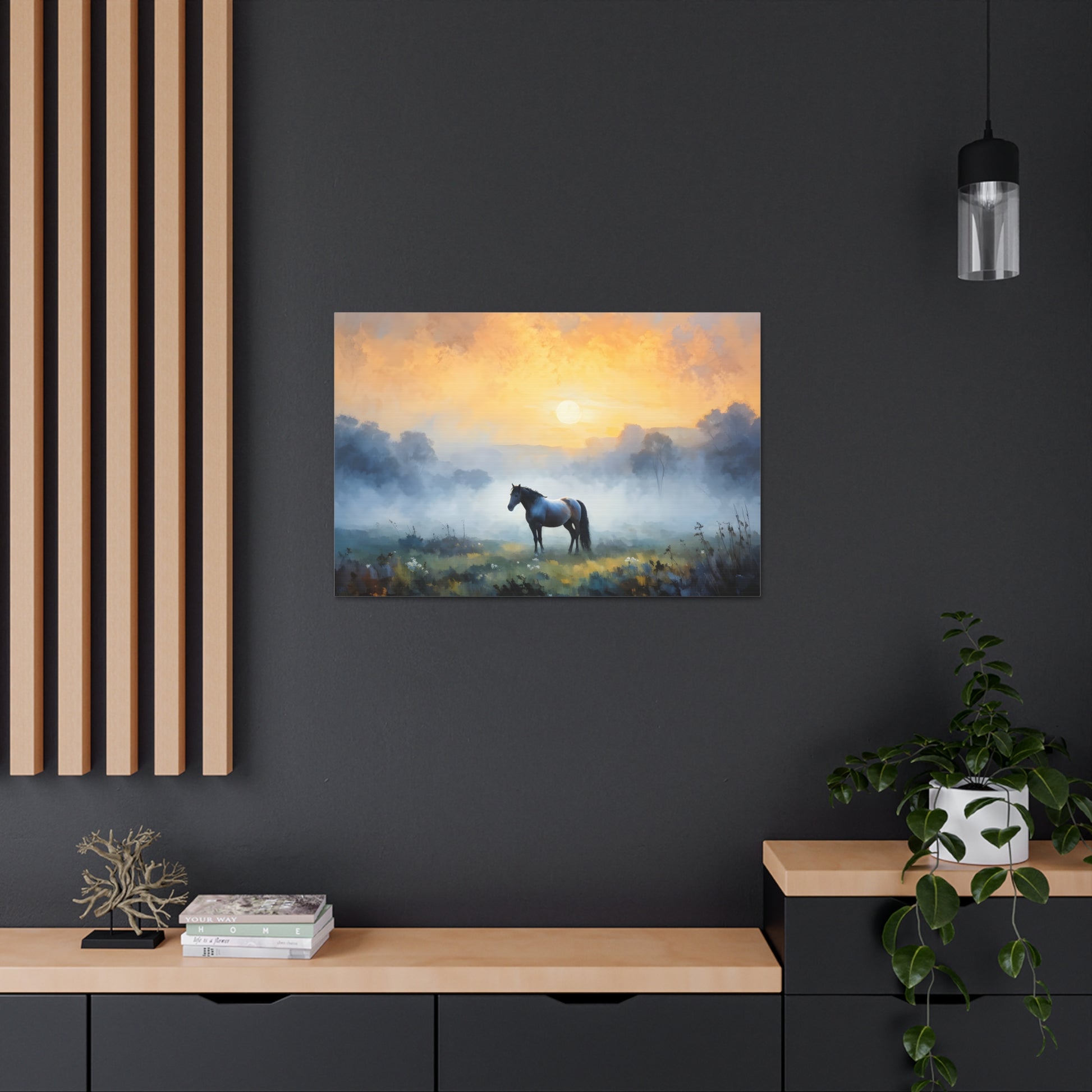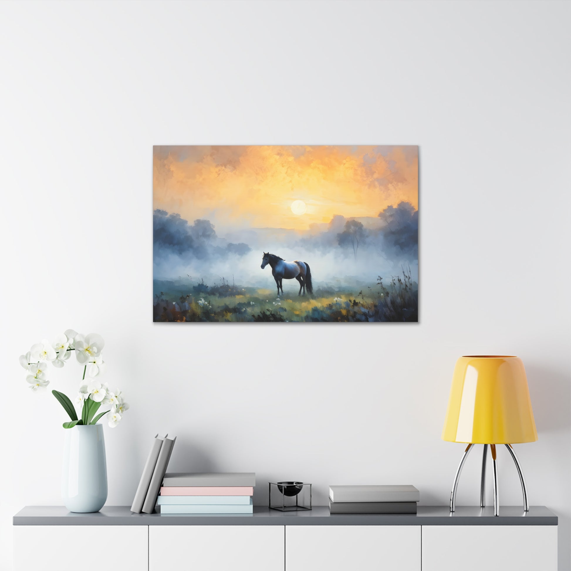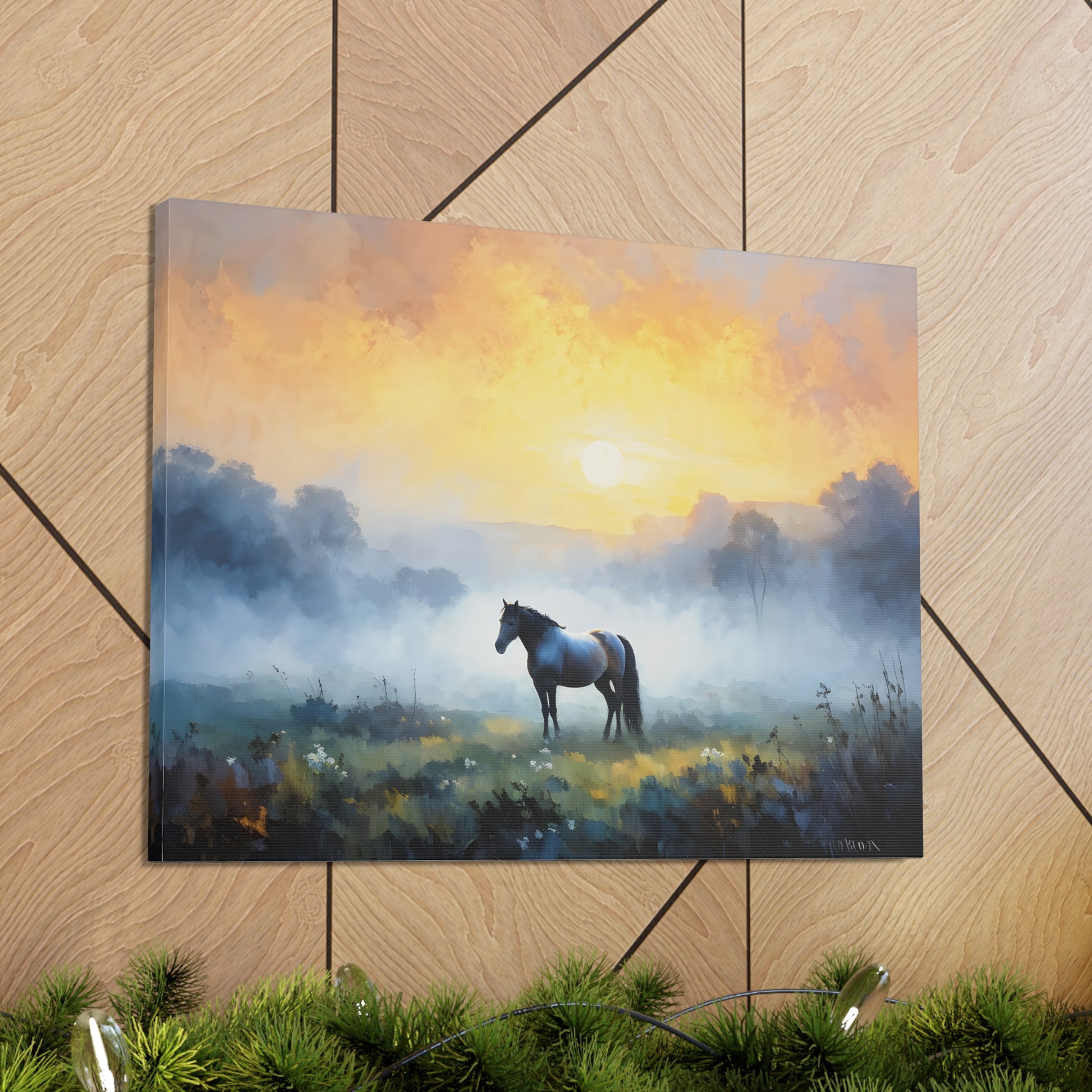"Tranquil Meadows" captures the serene beauty of a horse grazing in a misty field at sunrise. Painted on high-quality cotton canvas, this artwork brings the calm and quiet of nature into your indoor spaces, perfect for creating a peaceful and reflective atmosphere.