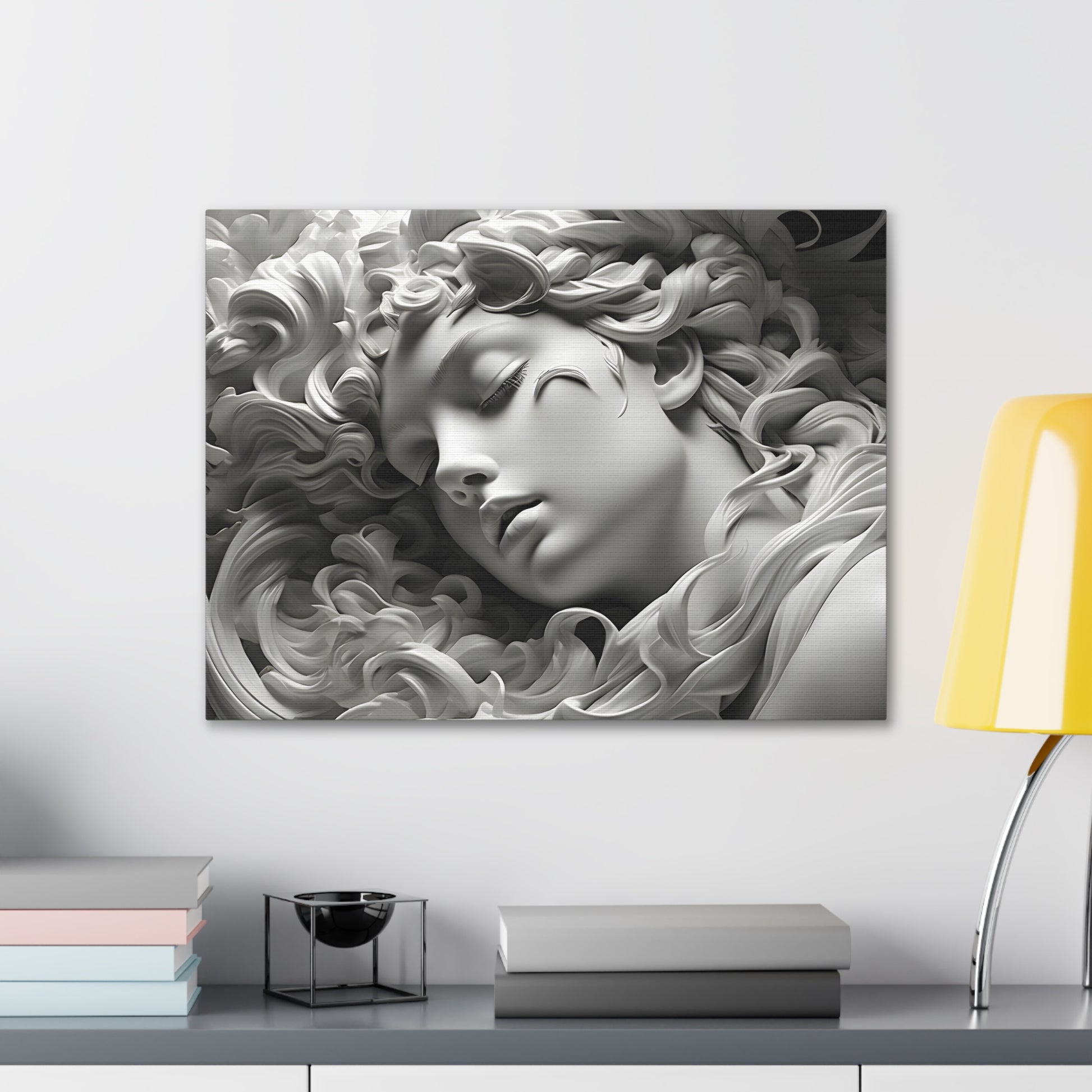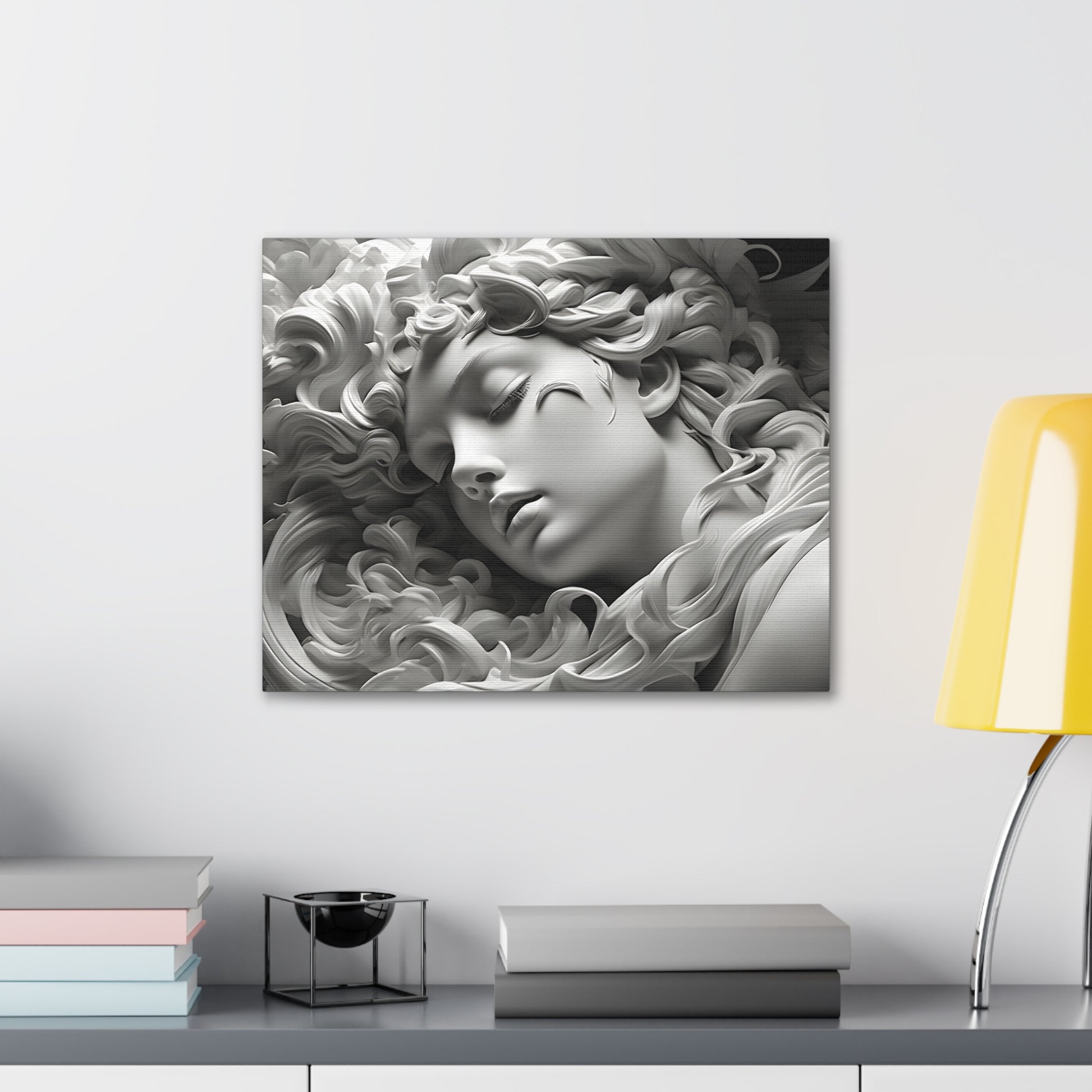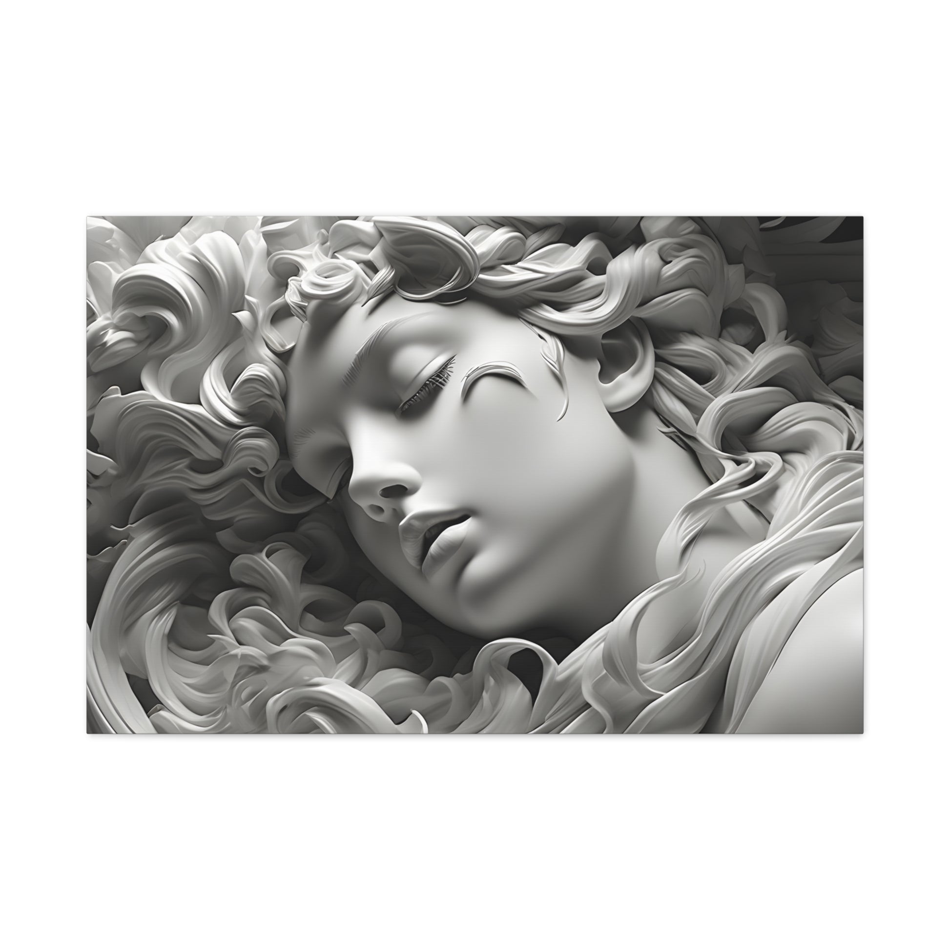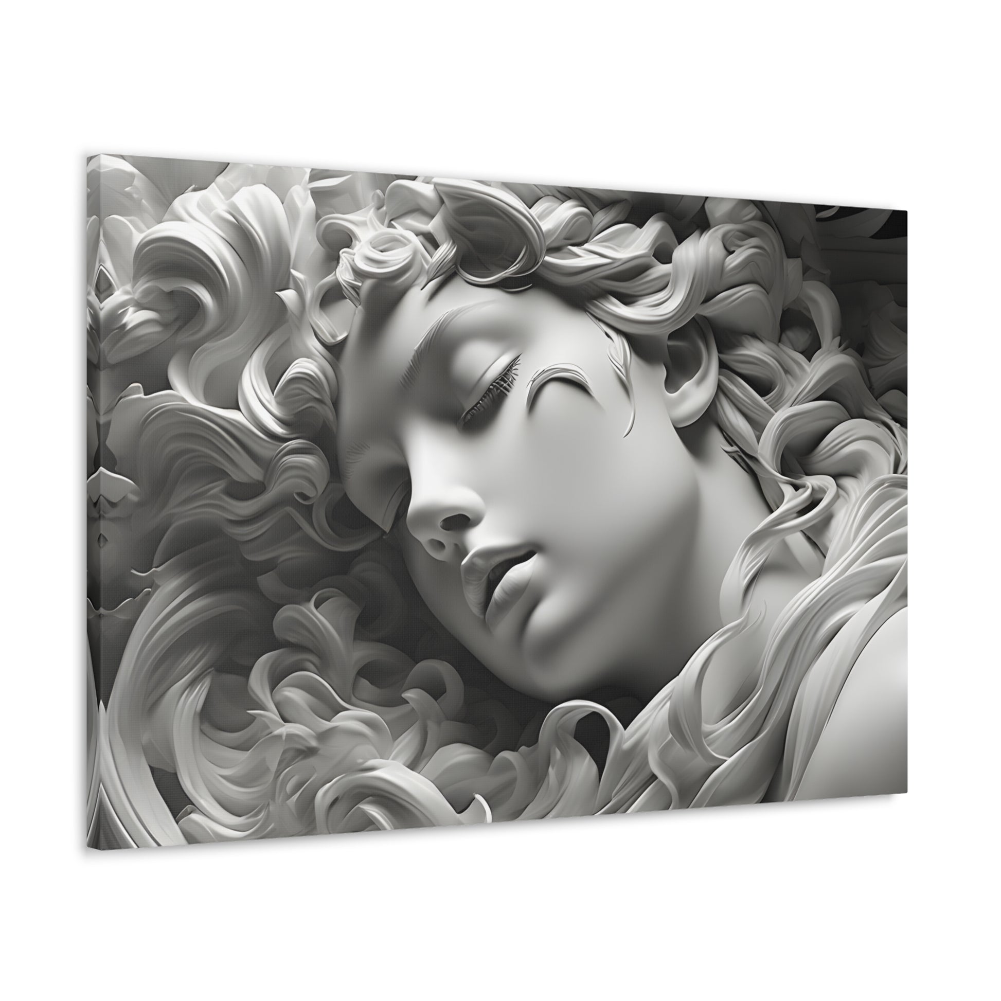 Indulge your space with "Tranquil Slumber," a serene black and white canvas artwork featuring a sculpted woman's head in peaceful repose, capturing the essence of tranquil slumber and relaxation.