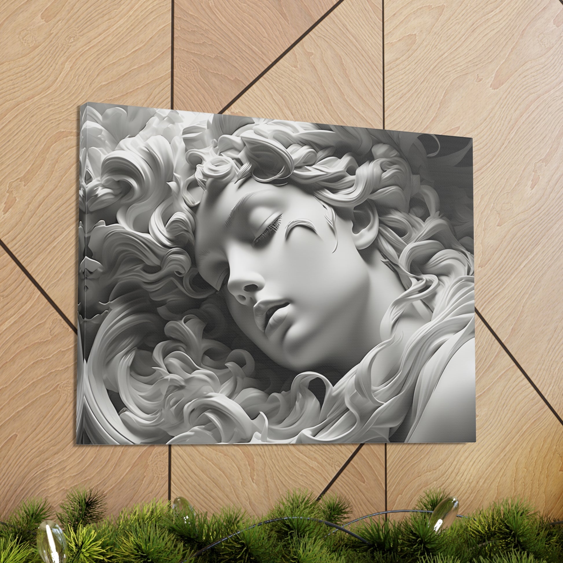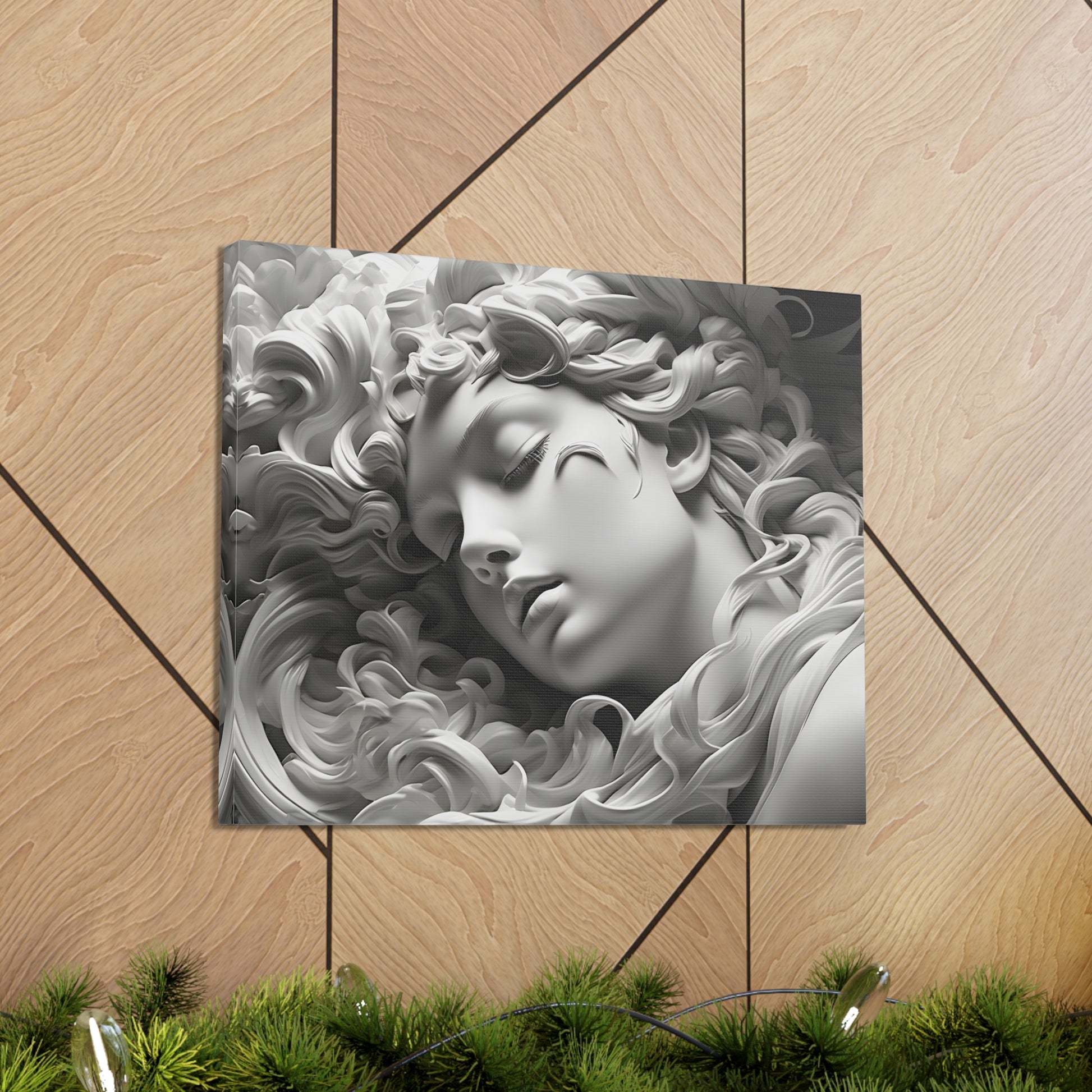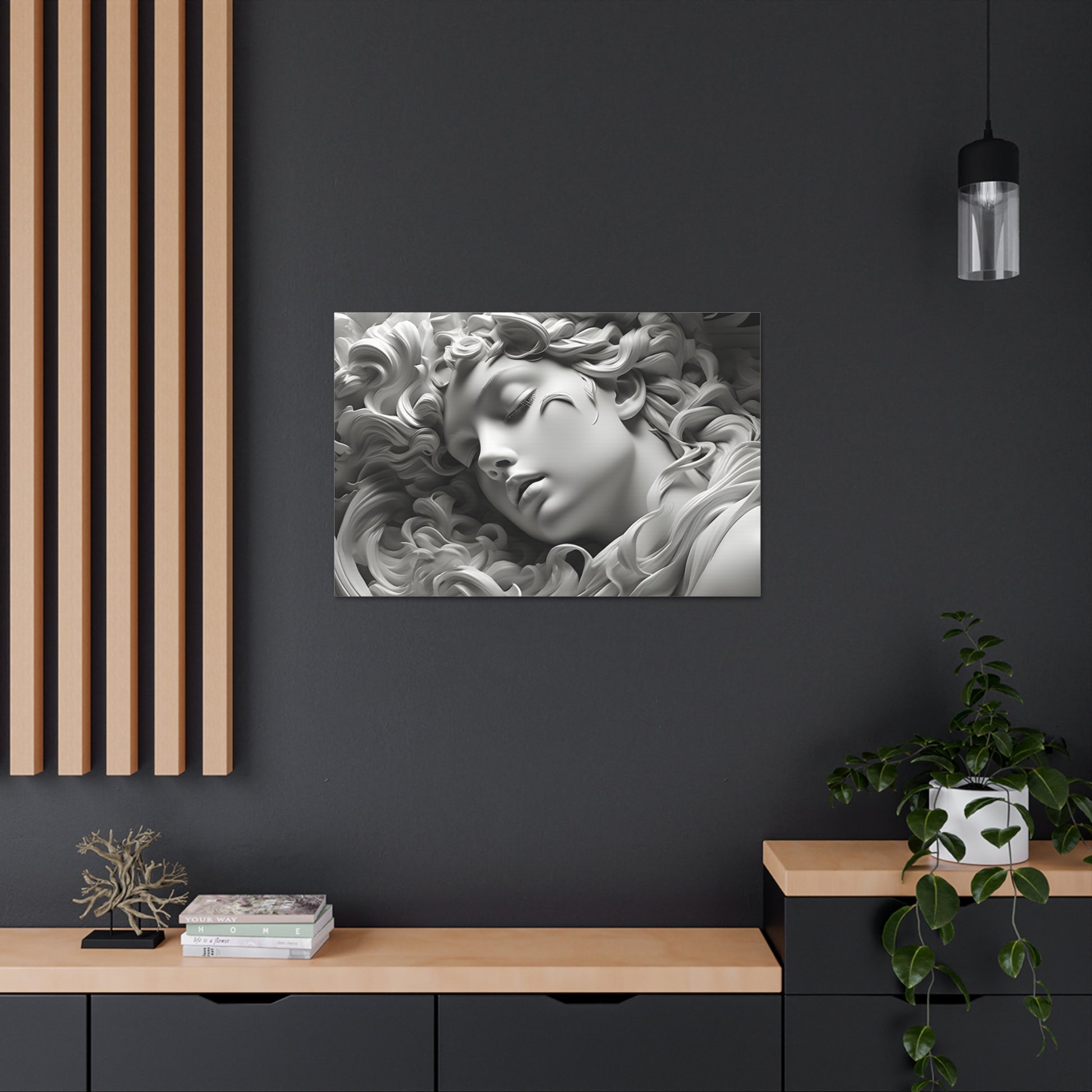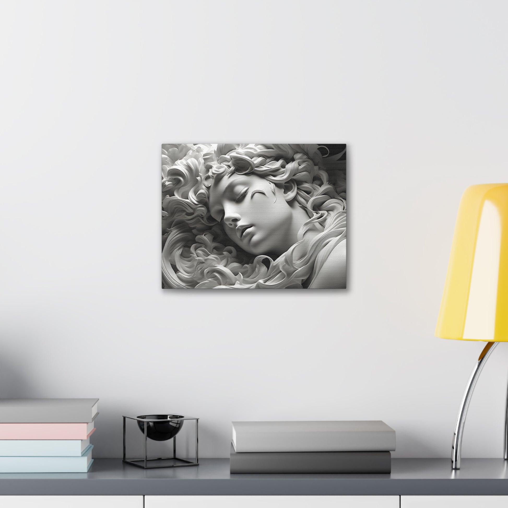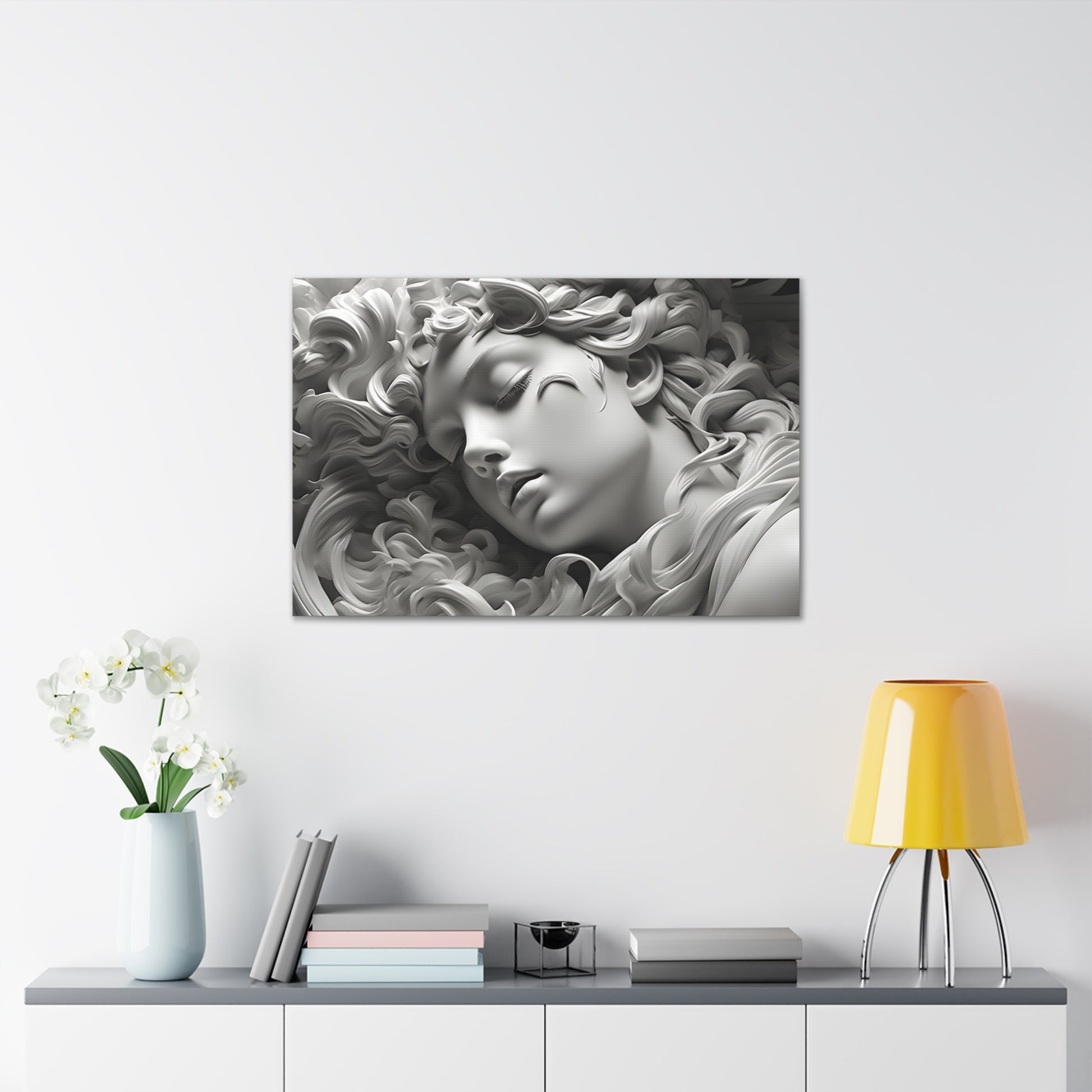 Indulge your space with "Tranquil Slumber," a serene black and white canvas artwork featuring a sculpted woman's head in peaceful repose, capturing the essence of tranquil slumber and relaxation.