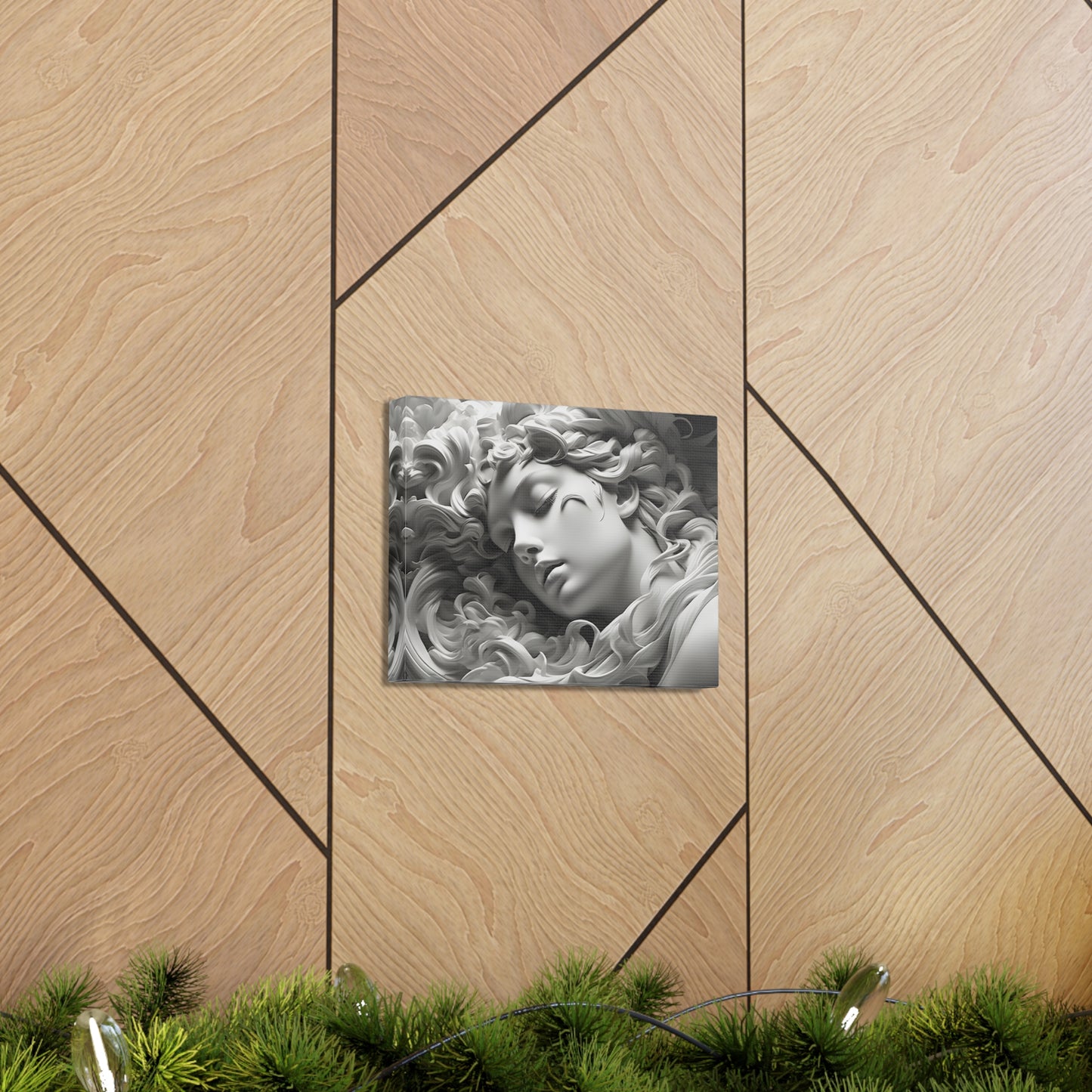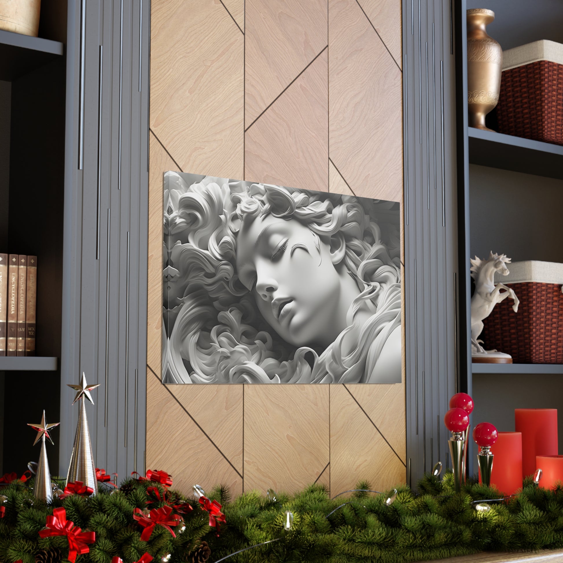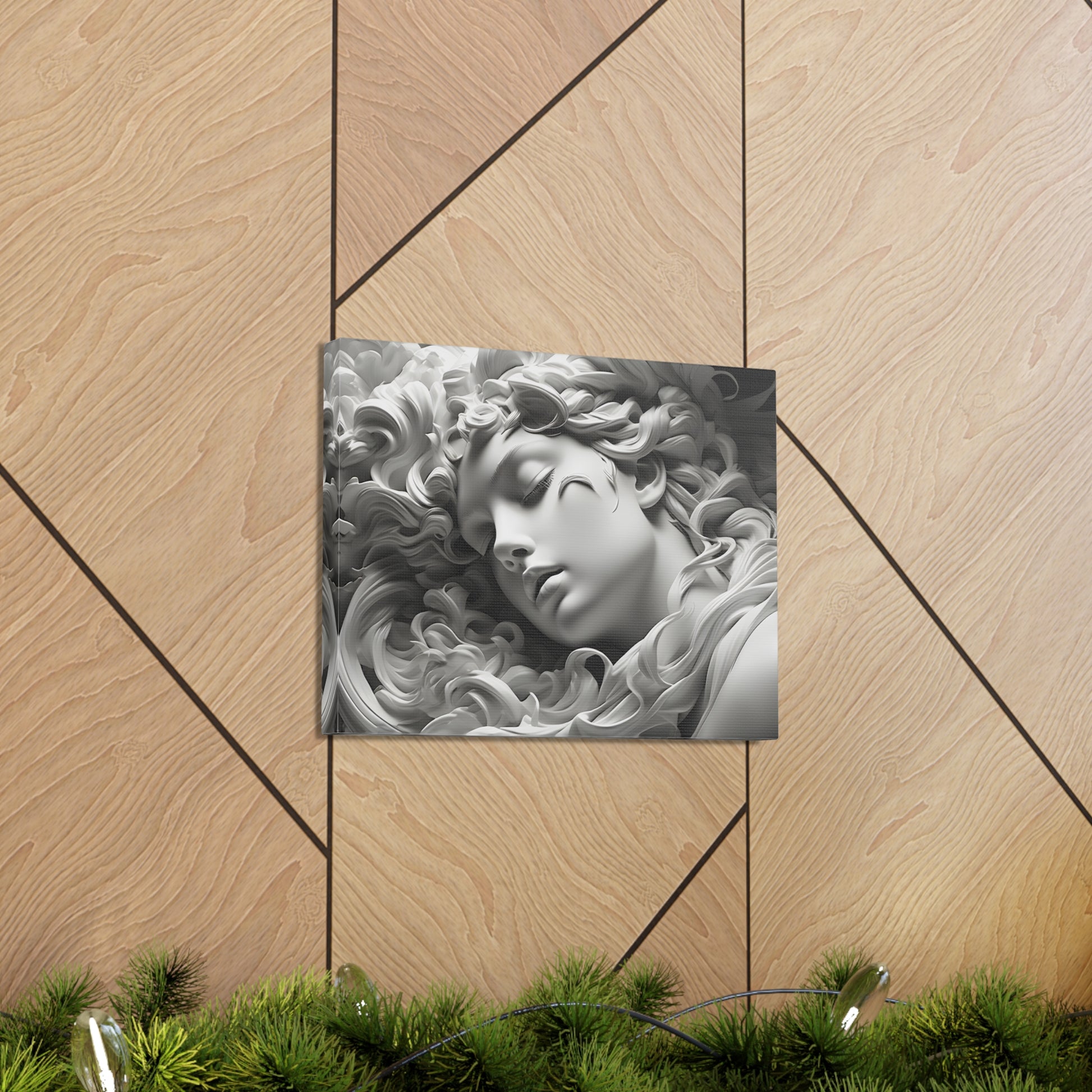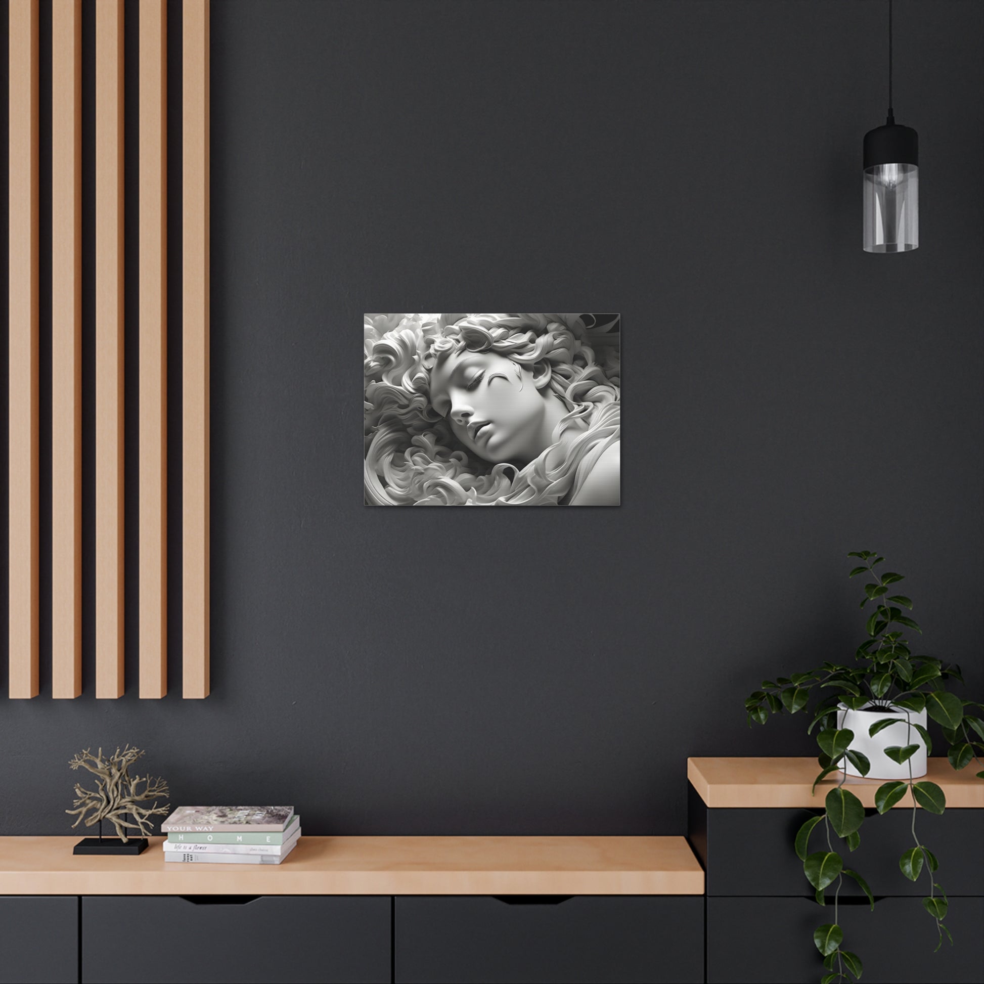 Indulge your space with "Tranquil Slumber," a serene black and white canvas artwork featuring a sculpted woman's head in peaceful repose, capturing the essence of tranquil slumber and relaxation.