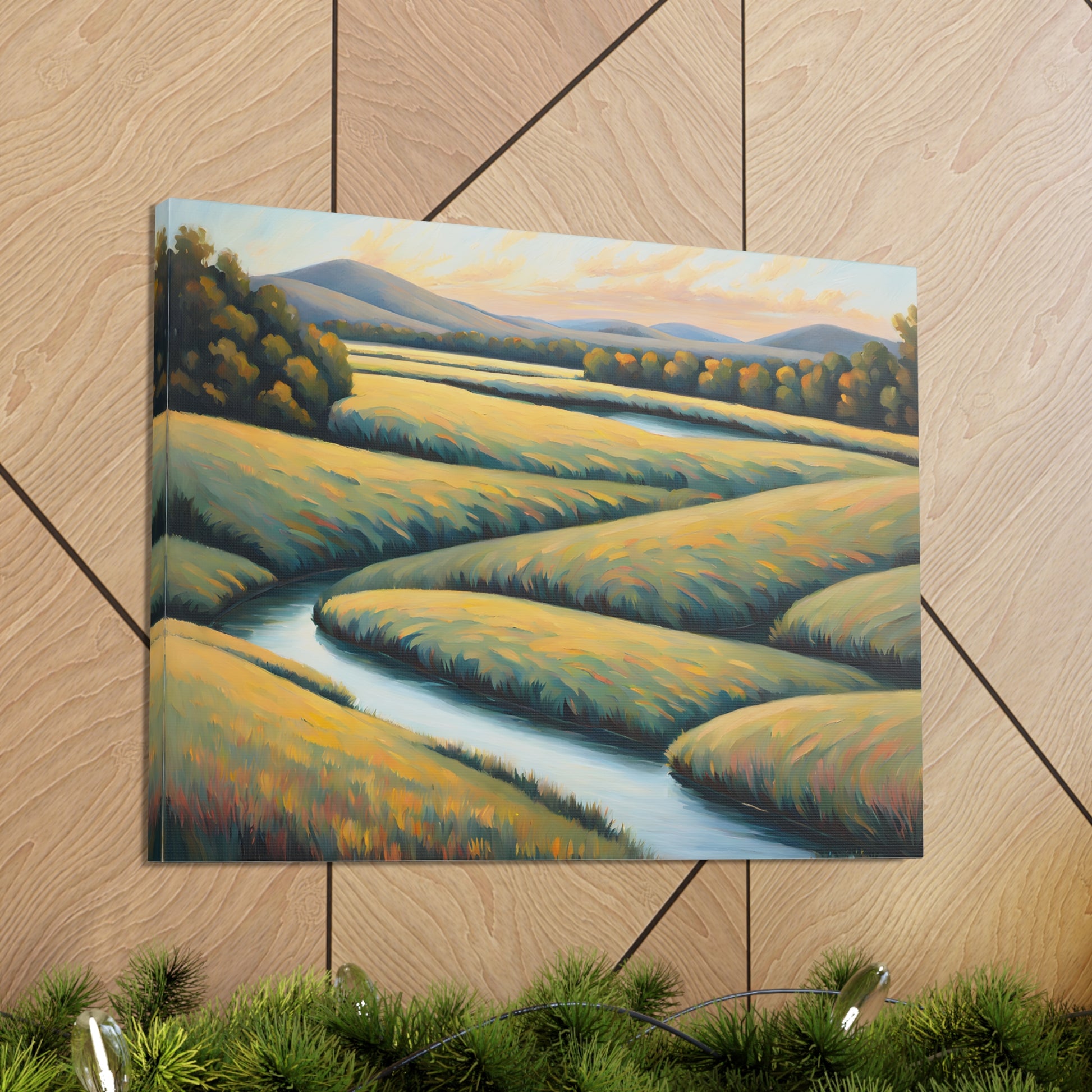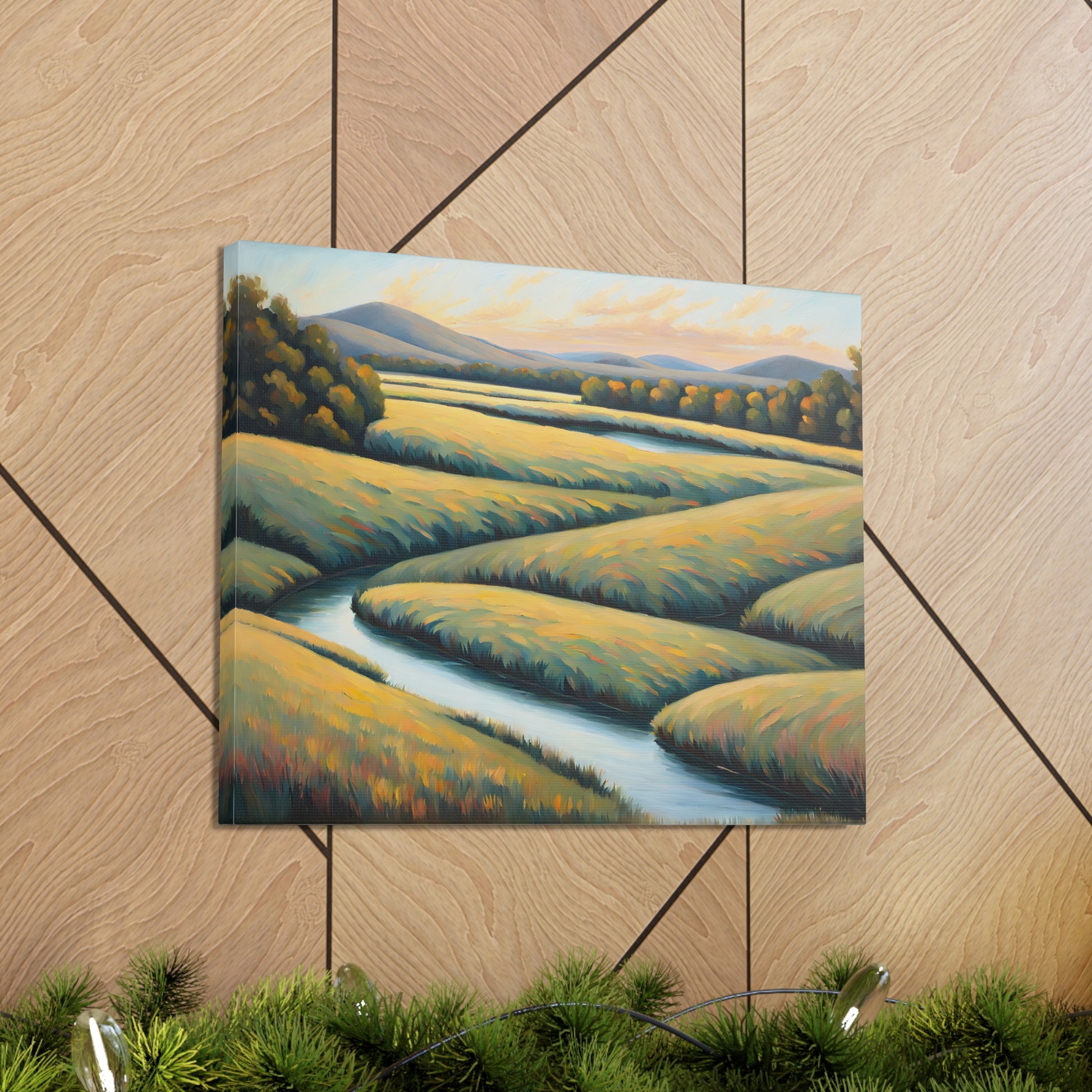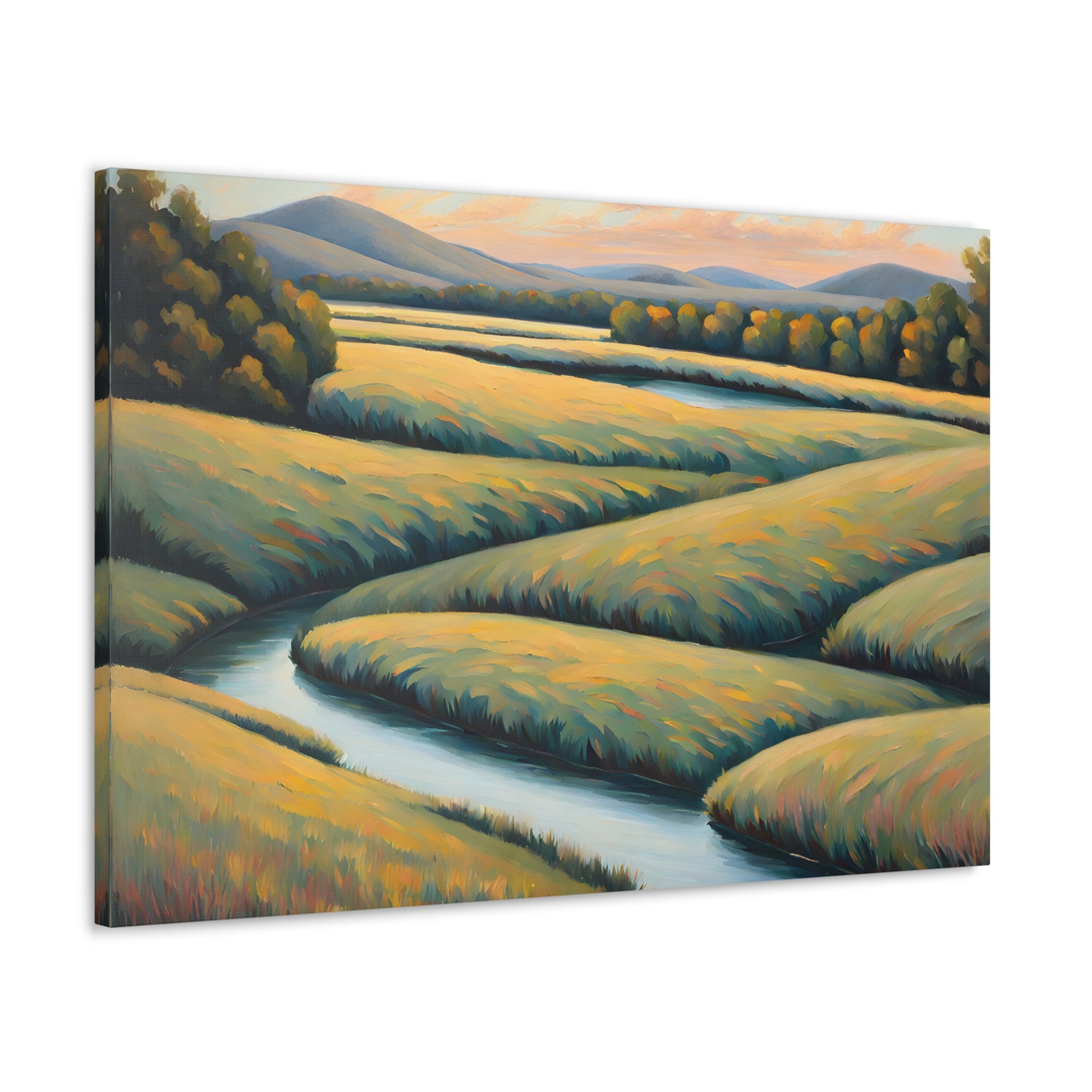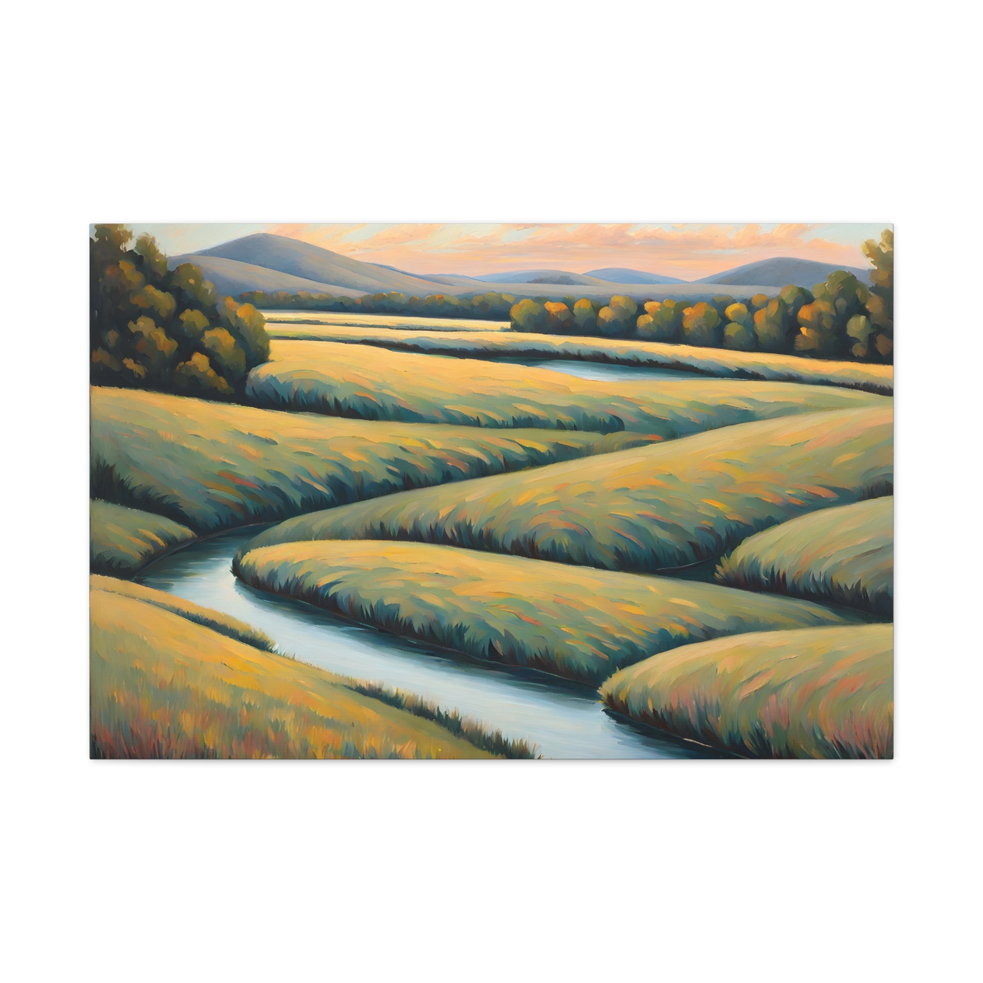 Valley Winds depicts the serene flow of a winding river through golden fields, capturing the essence of a peaceful, sunlit landscape. Rendered on premium cotton canvas, this piece brings calm and natural beauty into any space.