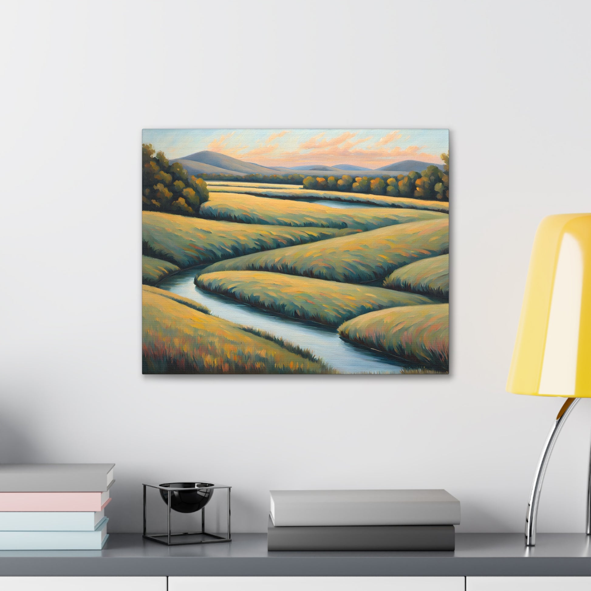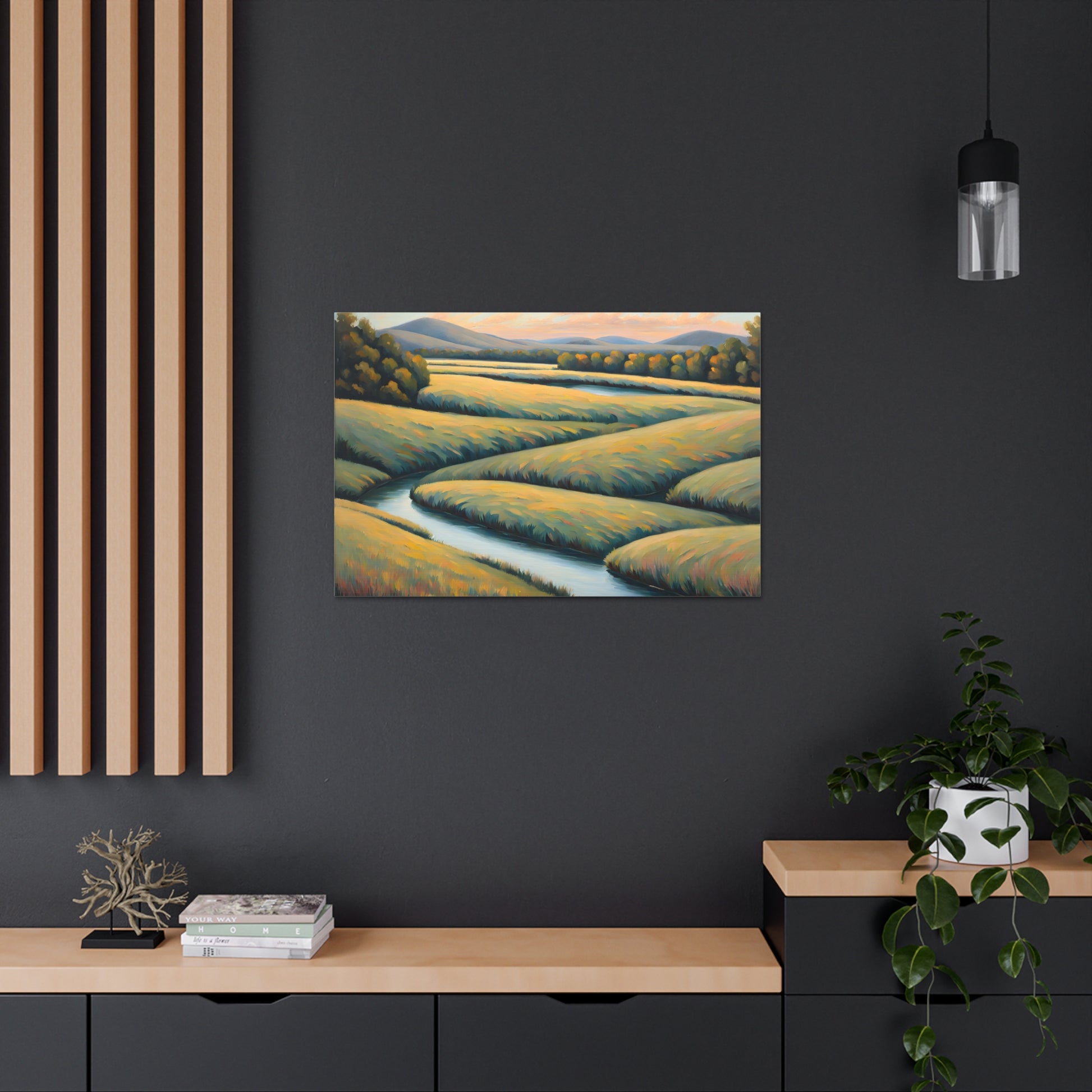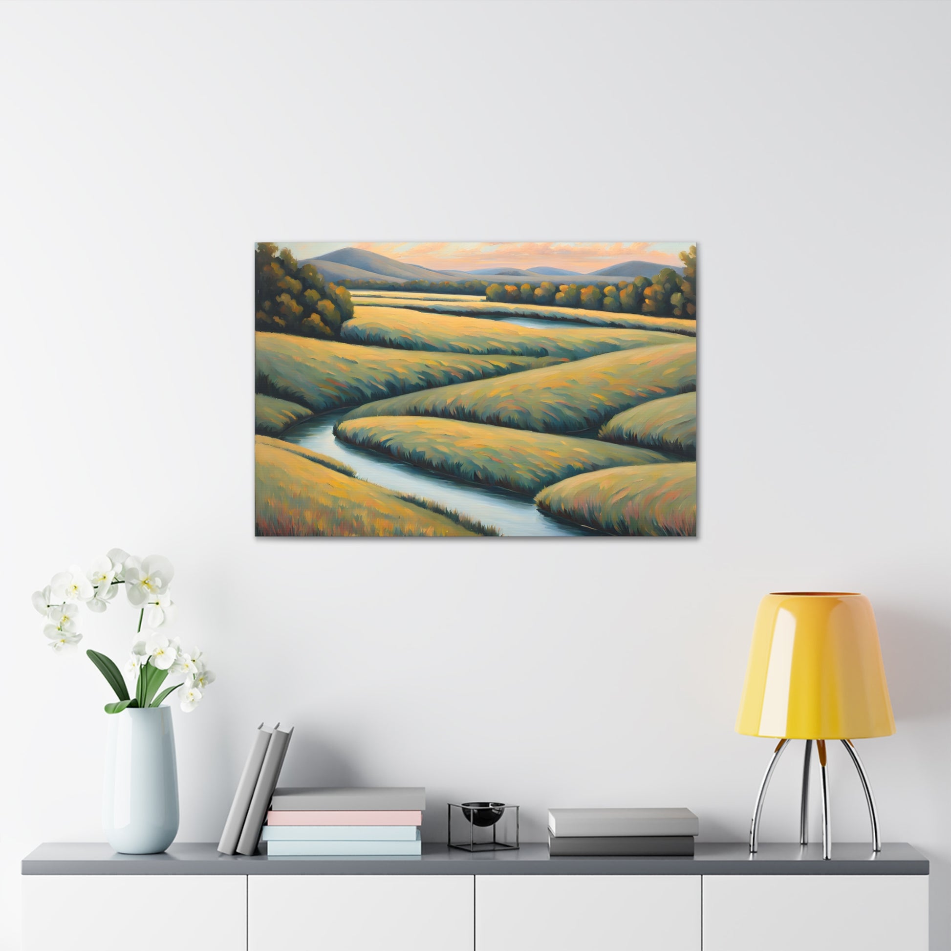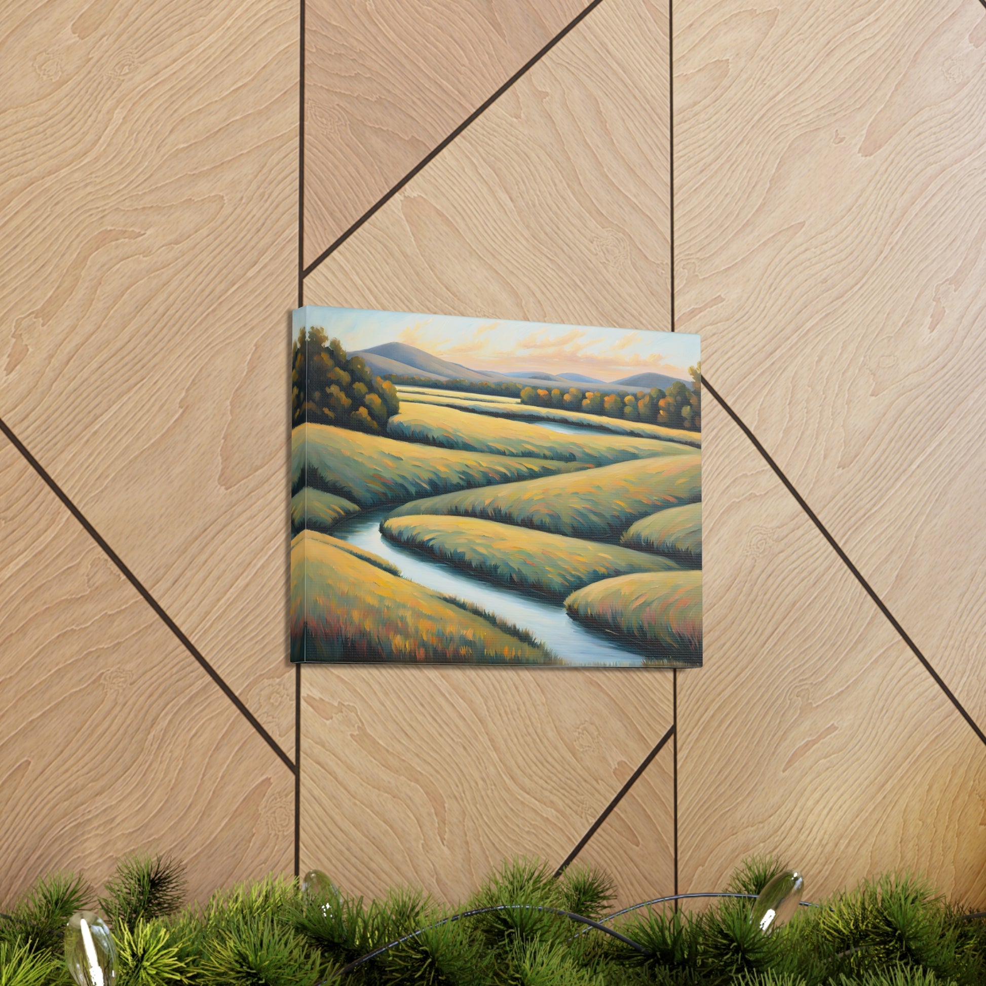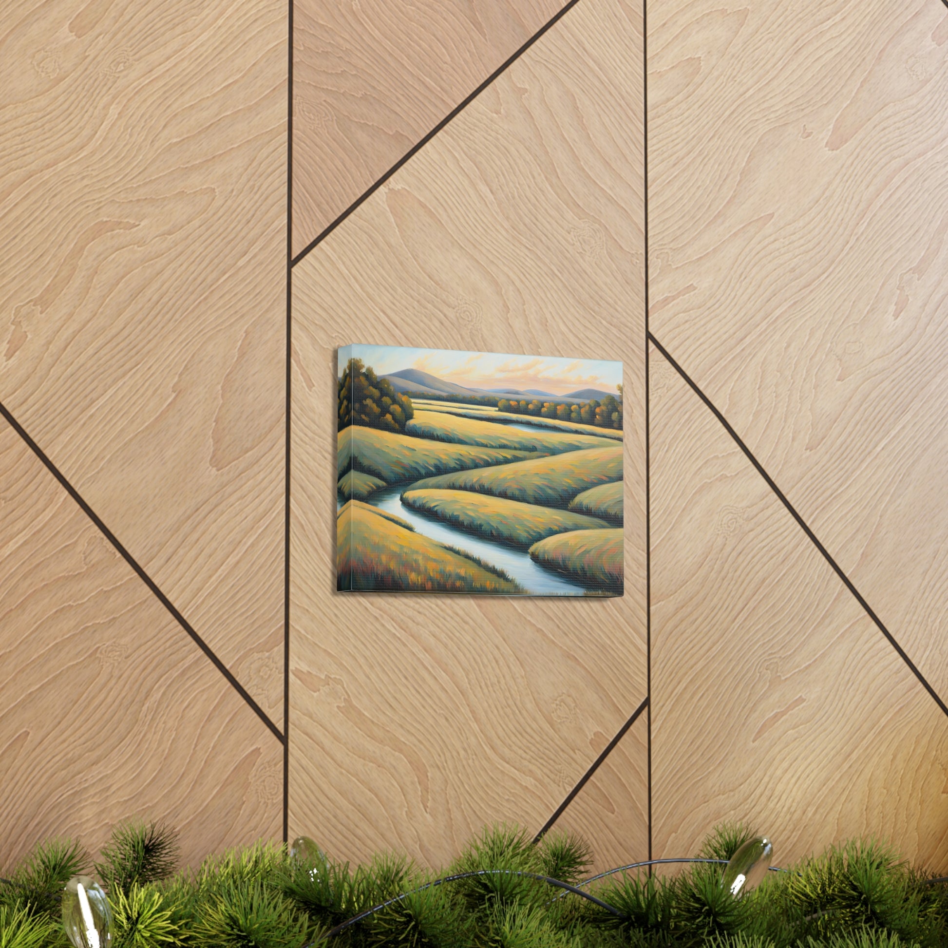 Valley Winds depicts the serene flow of a winding river through golden fields, capturing the essence of a peaceful, sunlit landscape. Rendered on premium cotton canvas, this piece brings calm and natural beauty into any space.