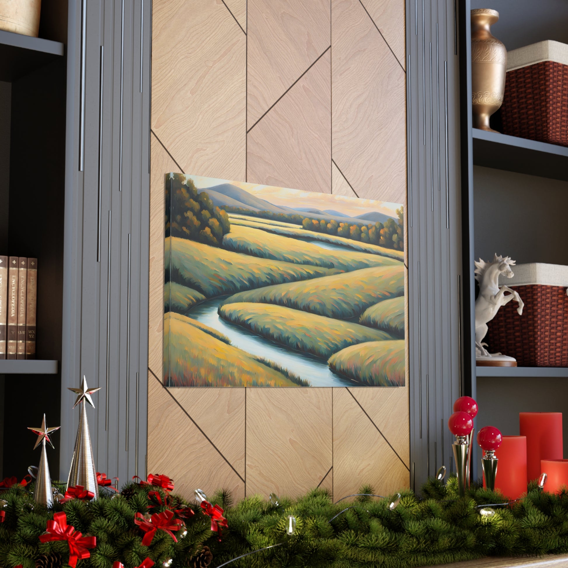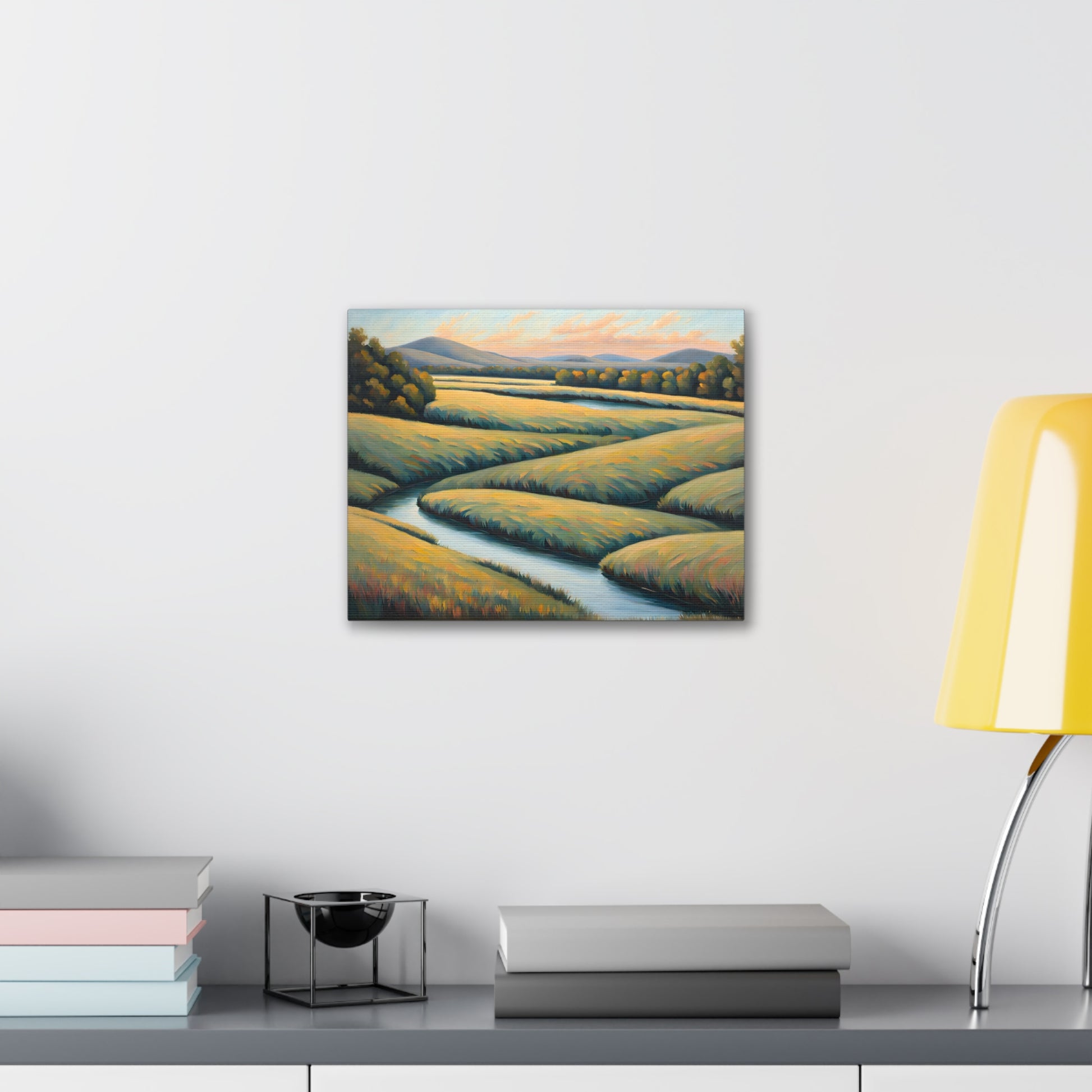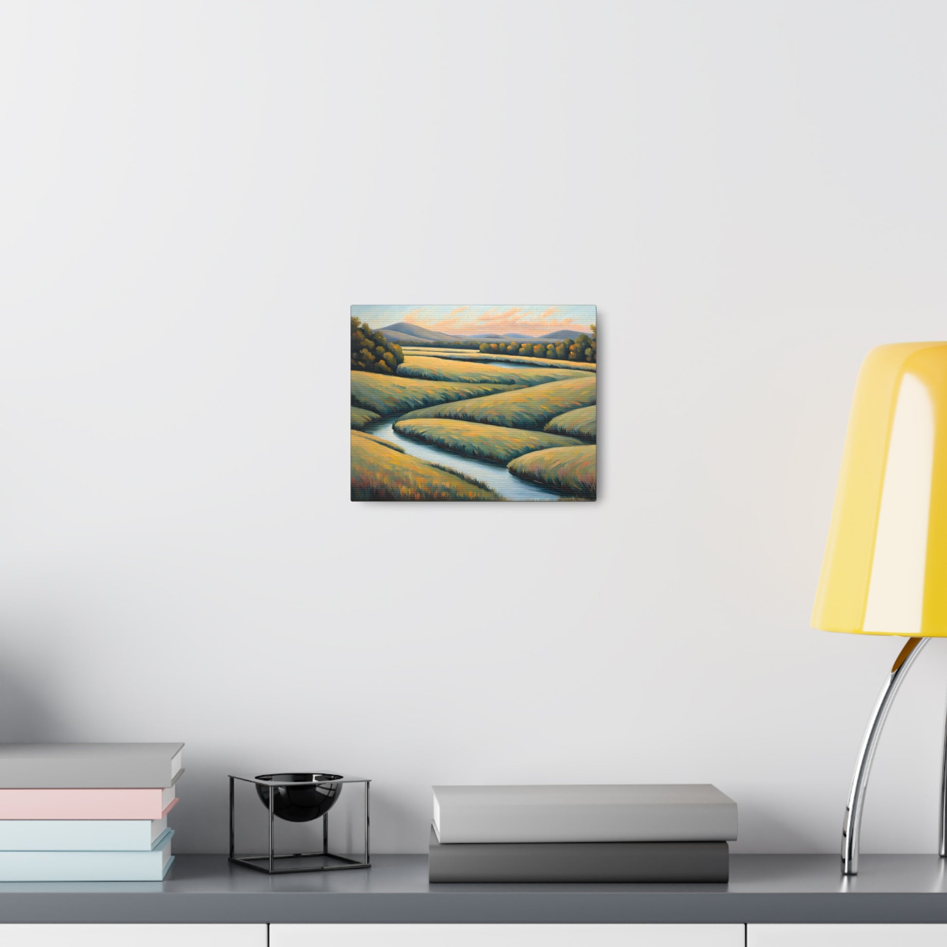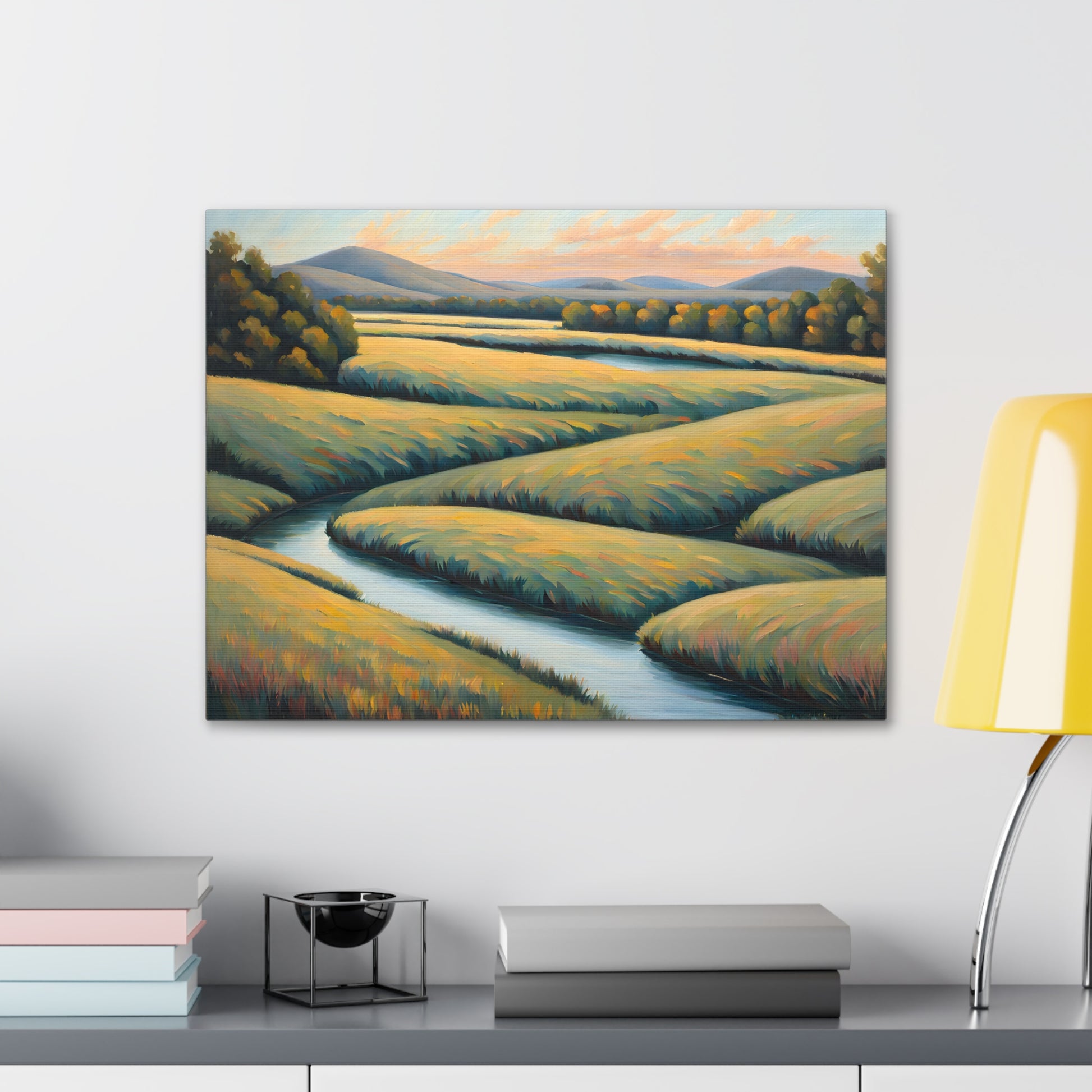 Valley Winds depicts the serene flow of a winding river through golden fields, capturing the essence of a peaceful, sunlit landscape. Rendered on premium cotton canvas, this piece brings calm and natural beauty into any space.