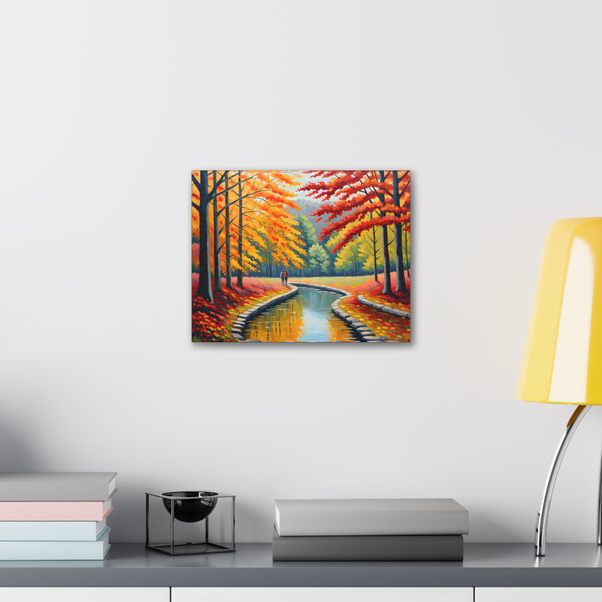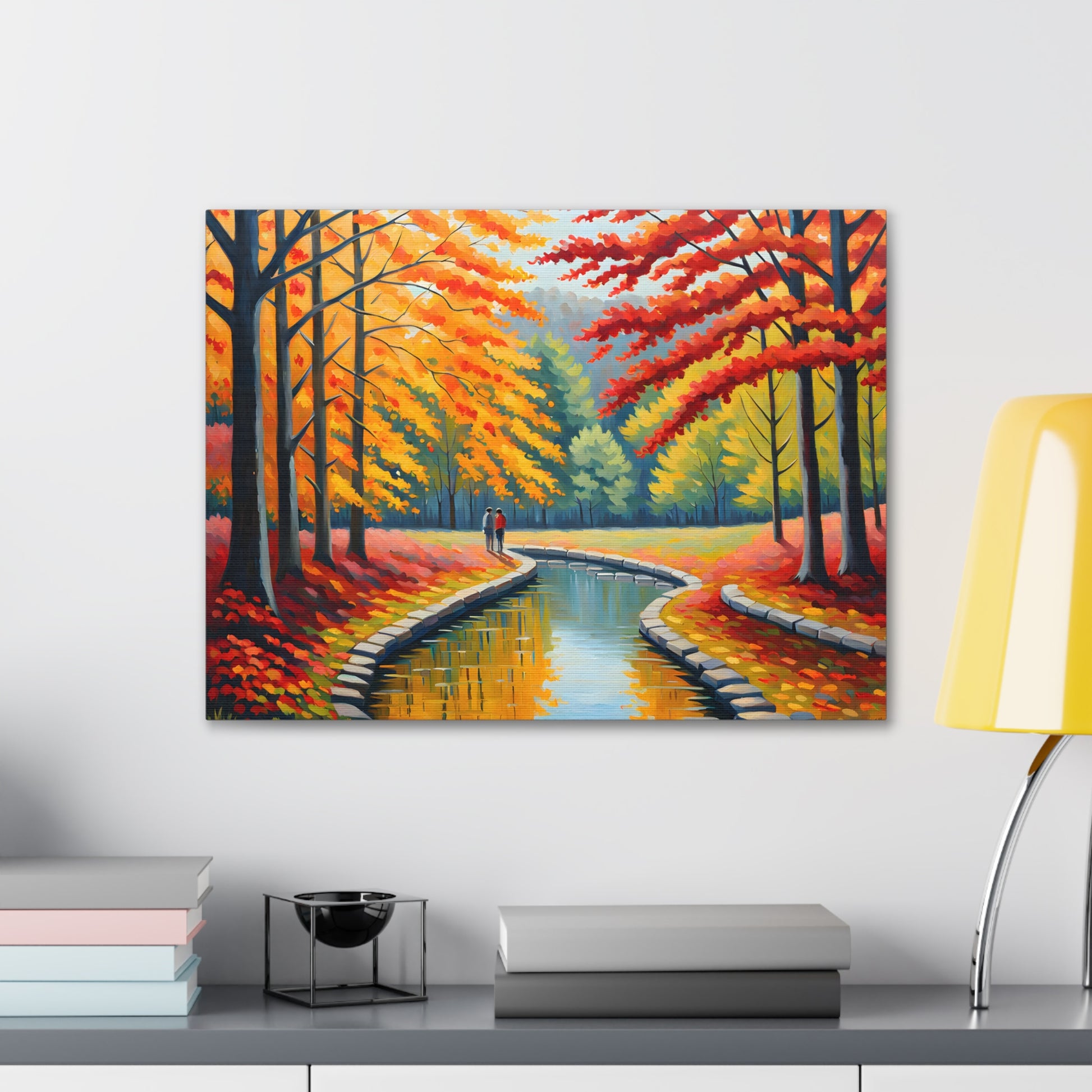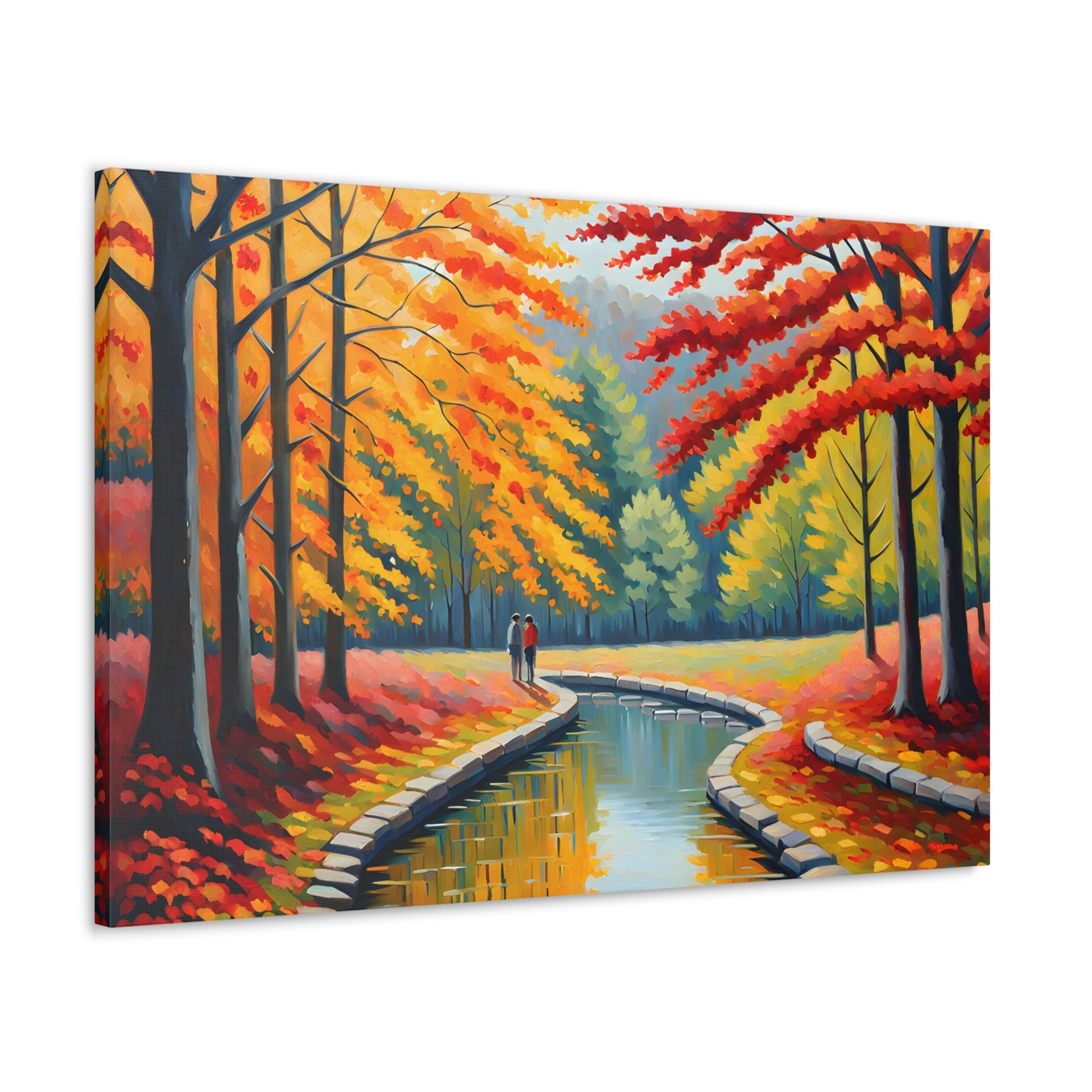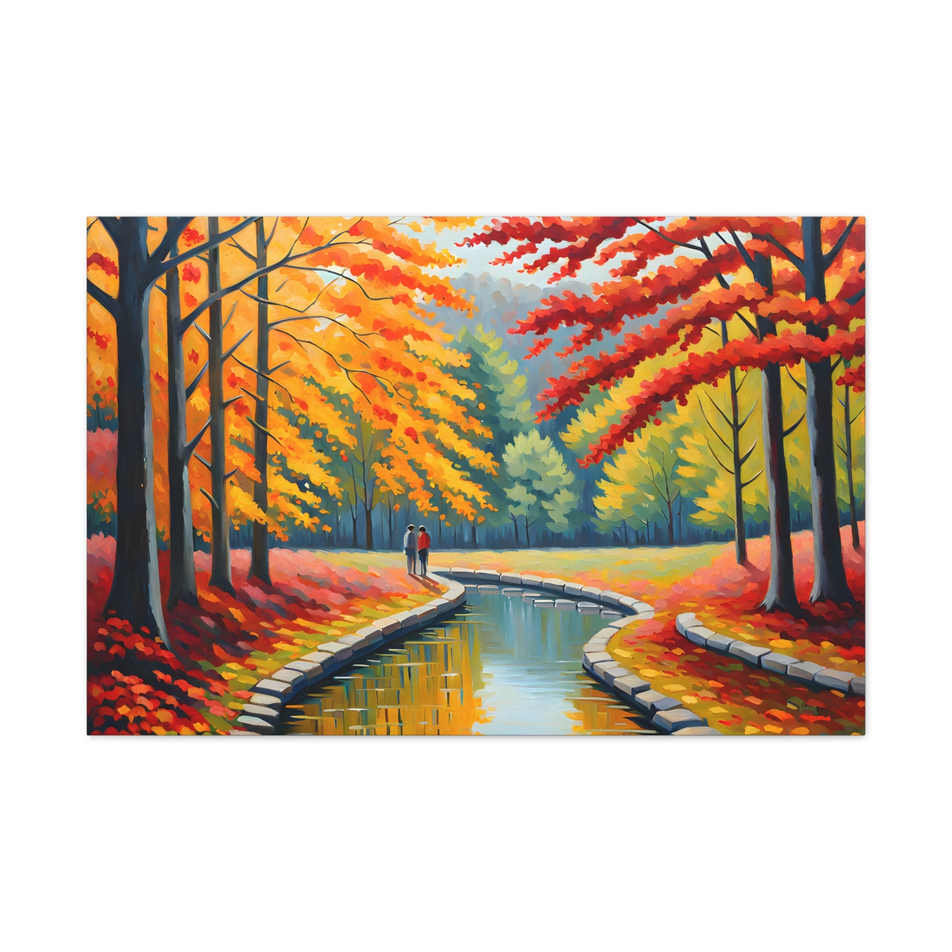 Step into the beauty of autumn with "Velvet Flow." This oil painting of a couple strolling beside a gently flowing canal, surrounded by vibrant autumn trees, adds a touch of warmth and nostalgia to your living space.