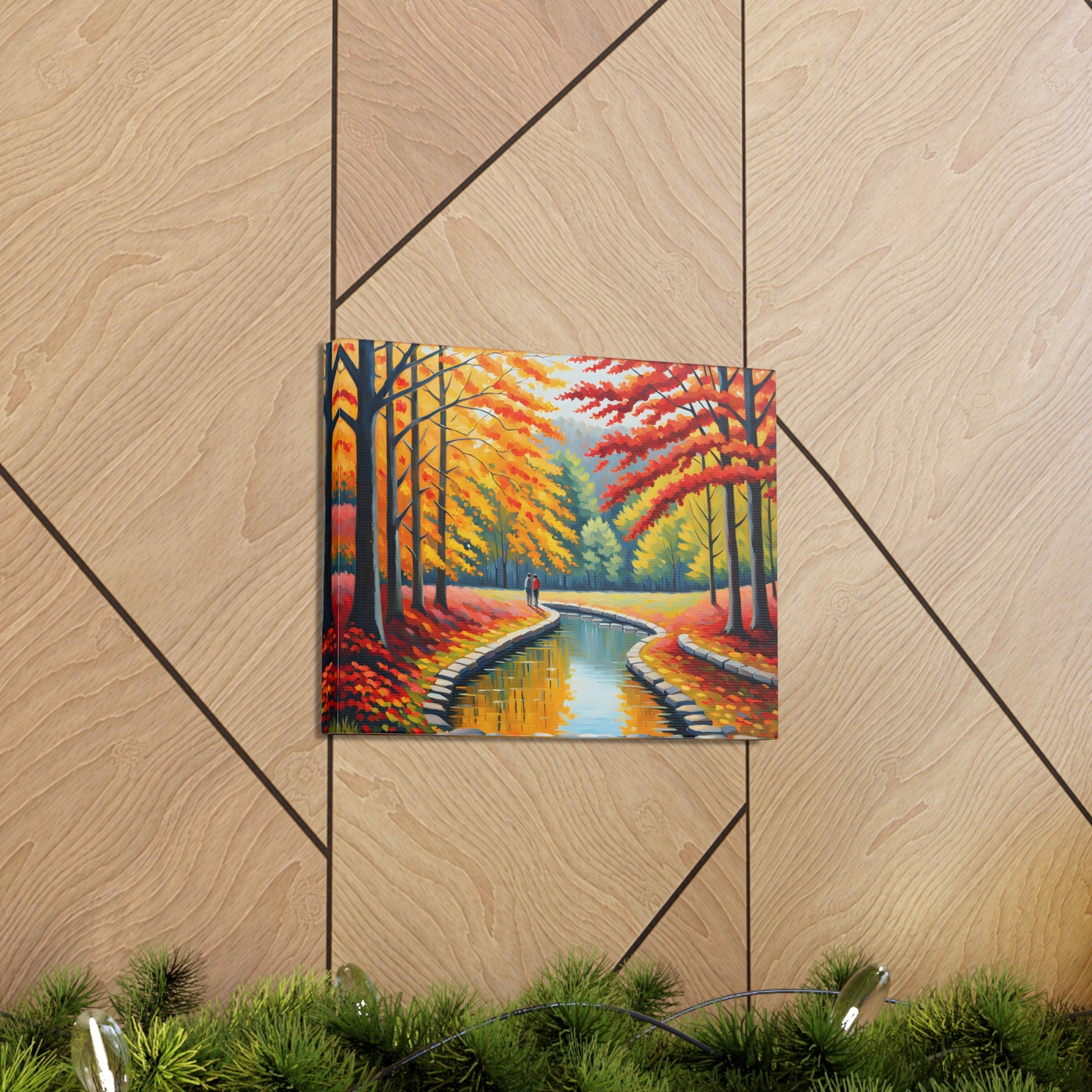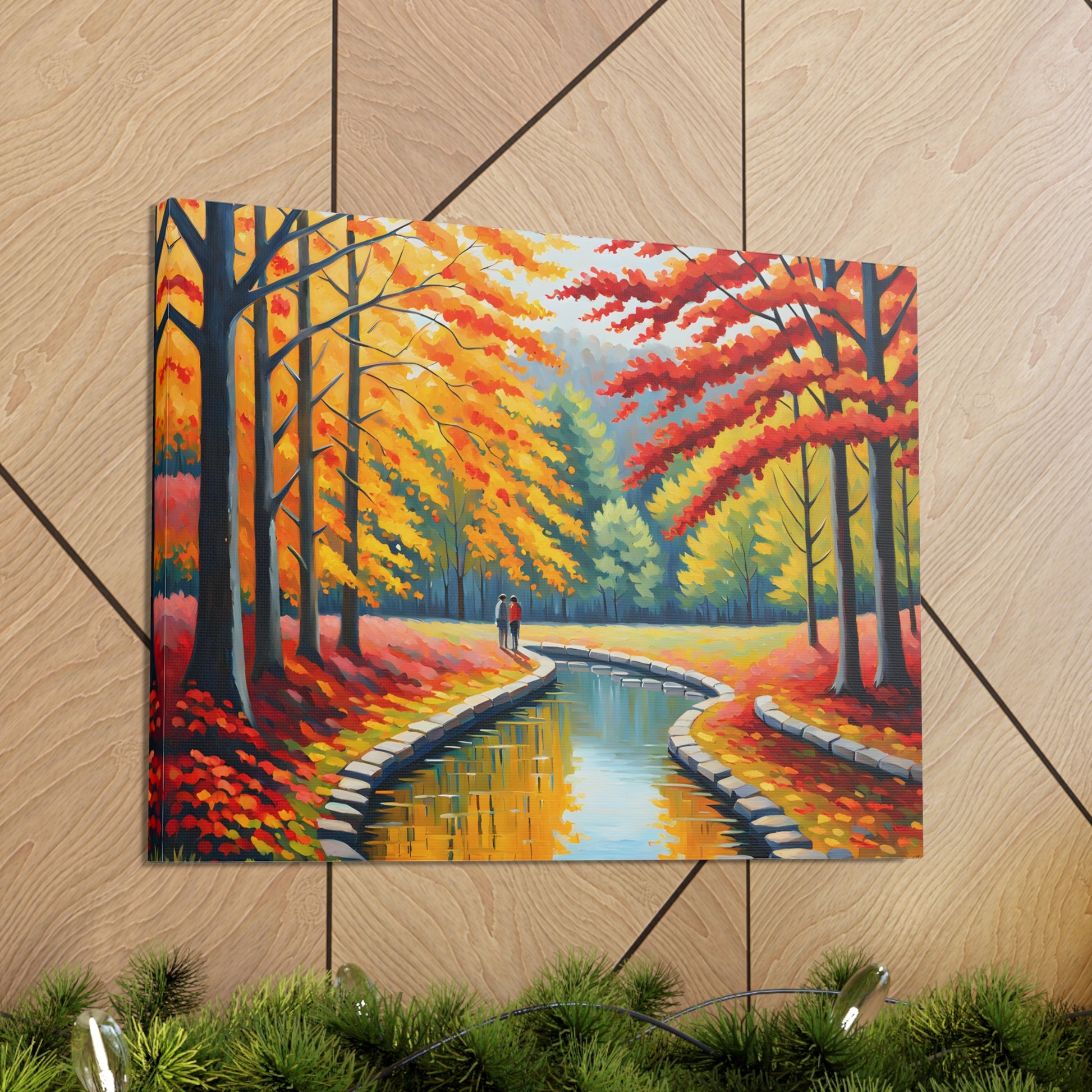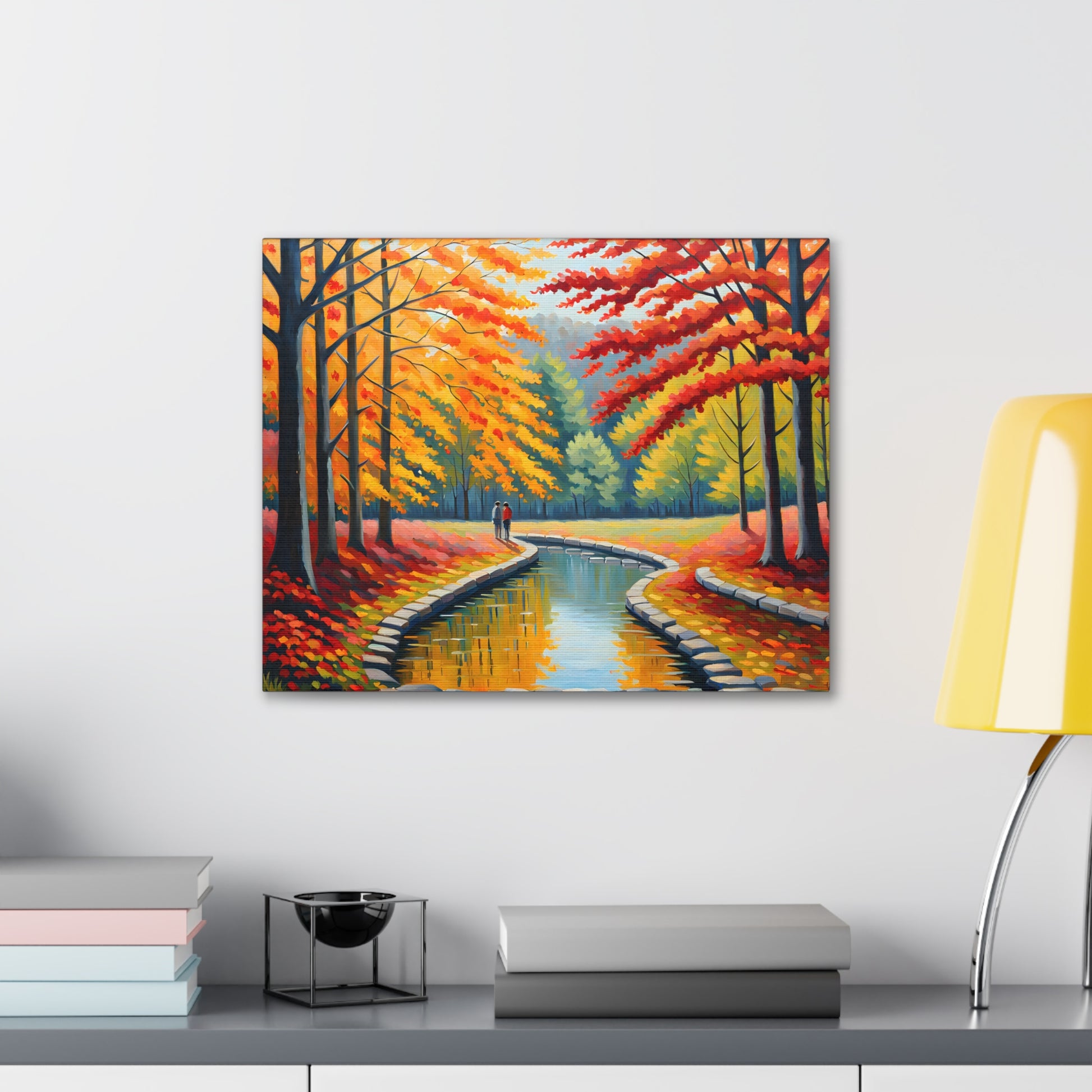 Step into the beauty of autumn with "Velvet Flow." This oil painting of a couple strolling beside a gently flowing canal, surrounded by vibrant autumn trees, adds a touch of warmth and nostalgia to your living space.