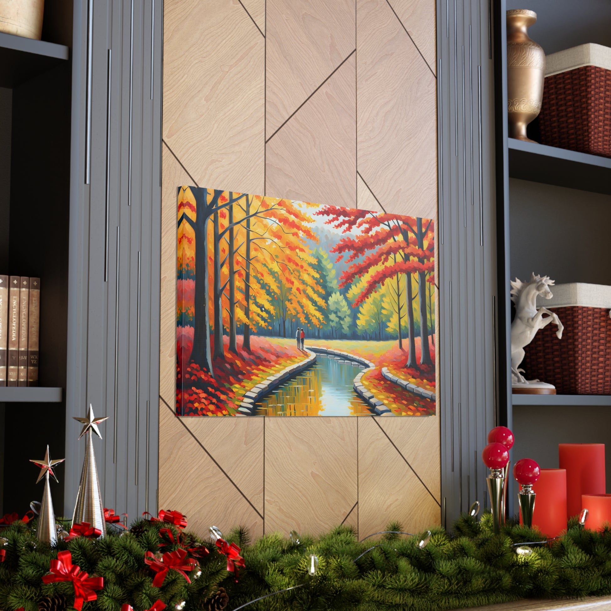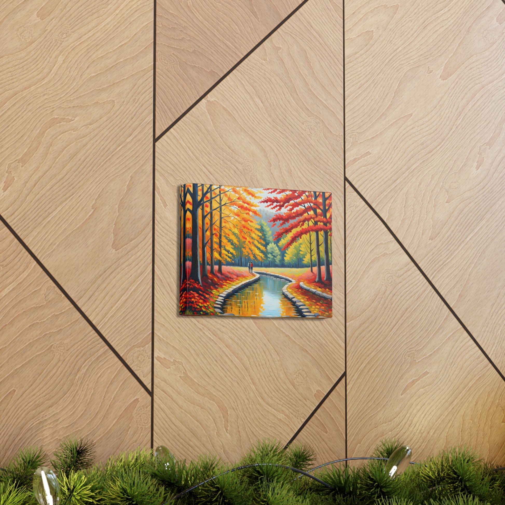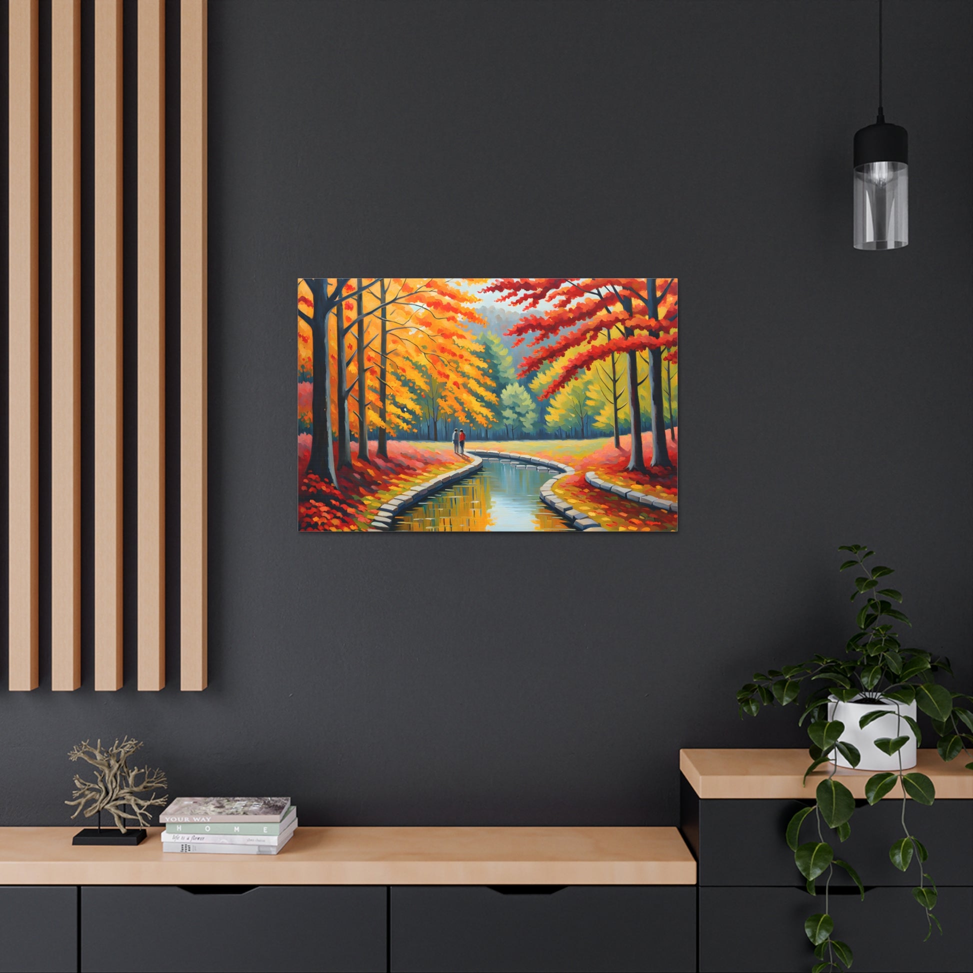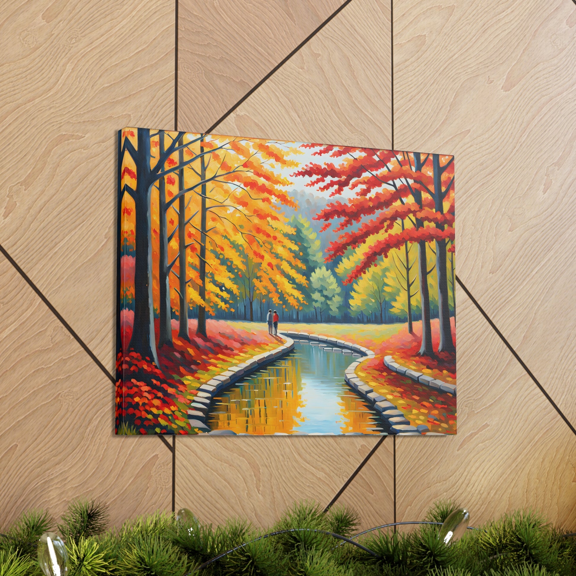Step into the beauty of autumn with "Velvet Flow." This oil painting of a couple strolling beside a gently flowing canal, surrounded by vibrant autumn trees, adds a touch of warmth and nostalgia to your living space.