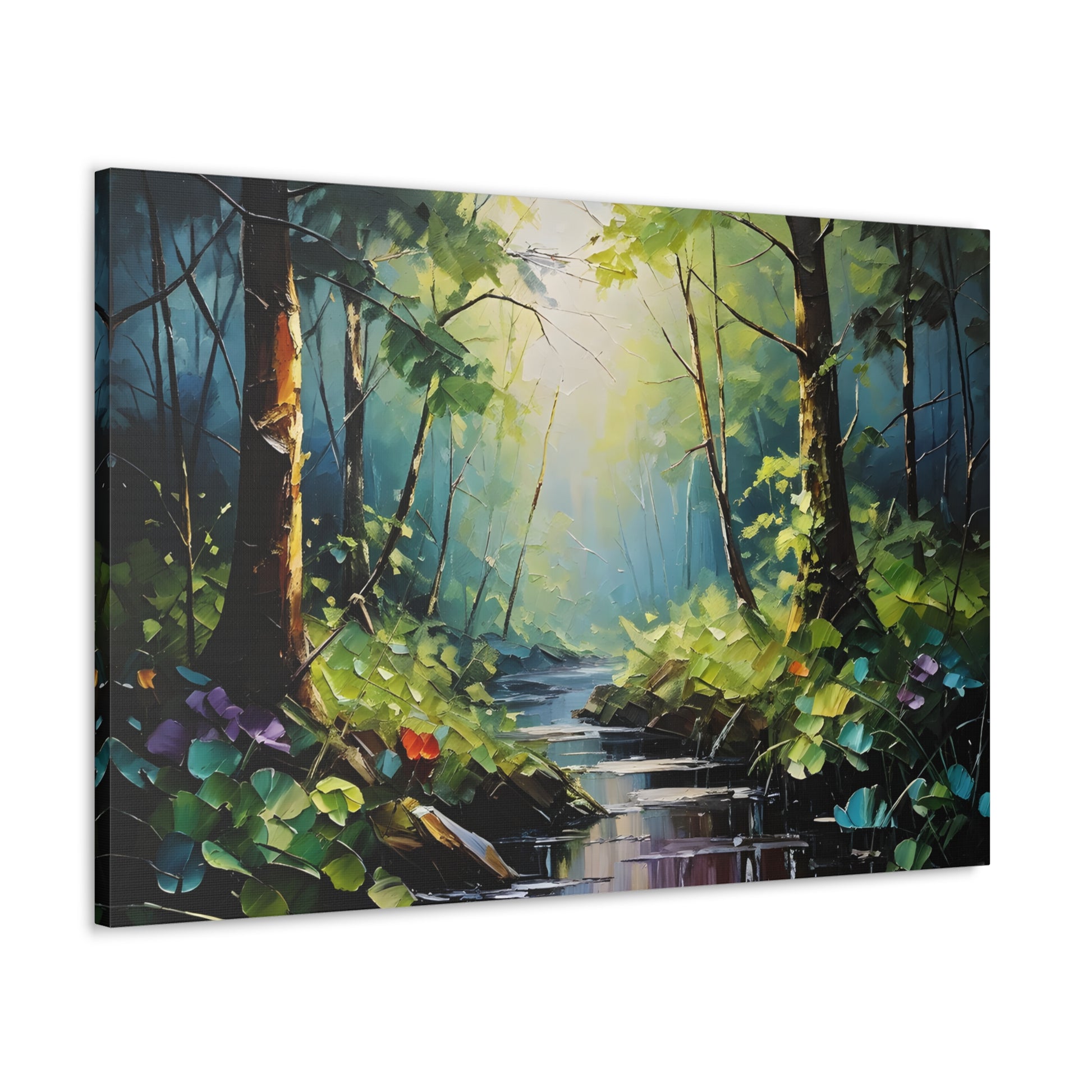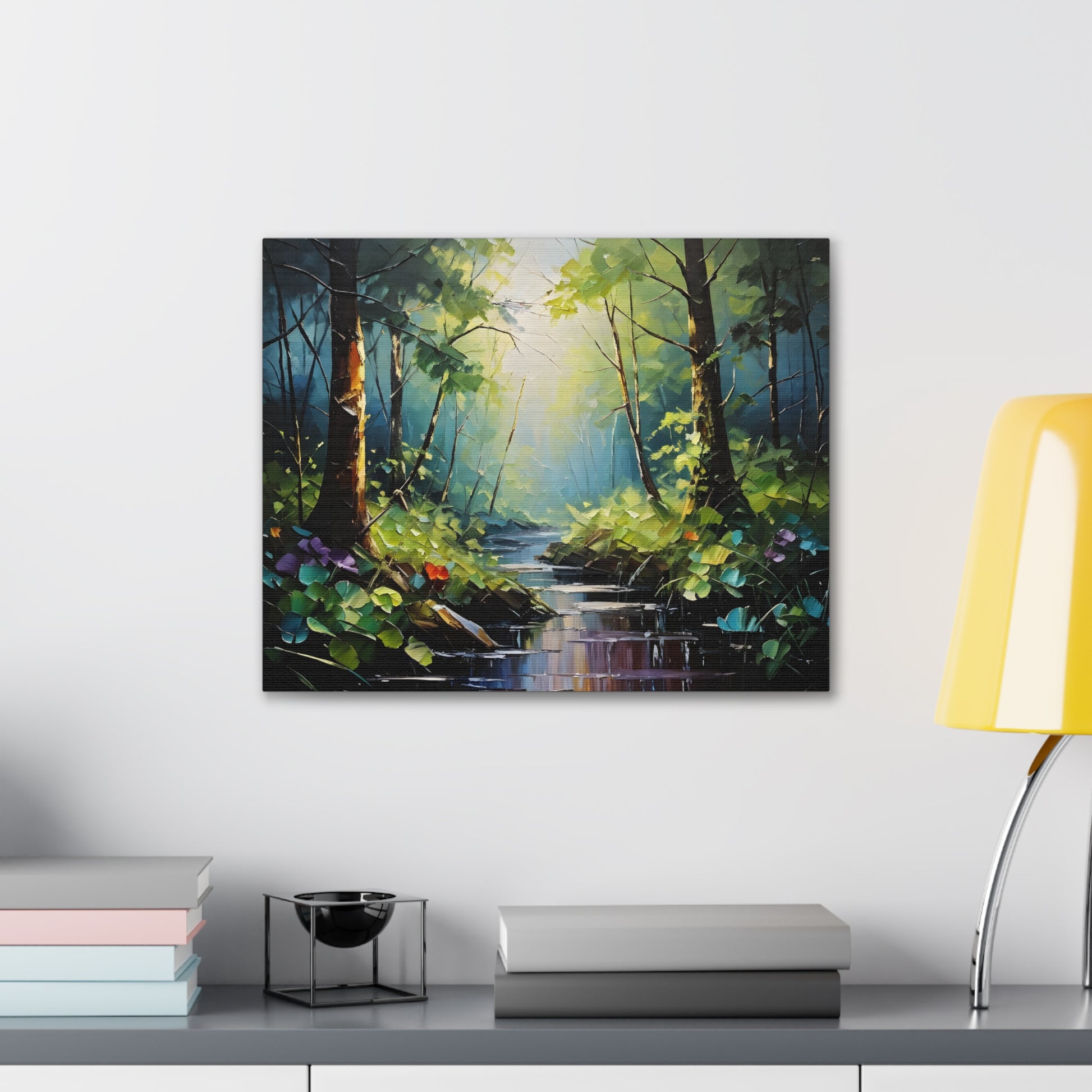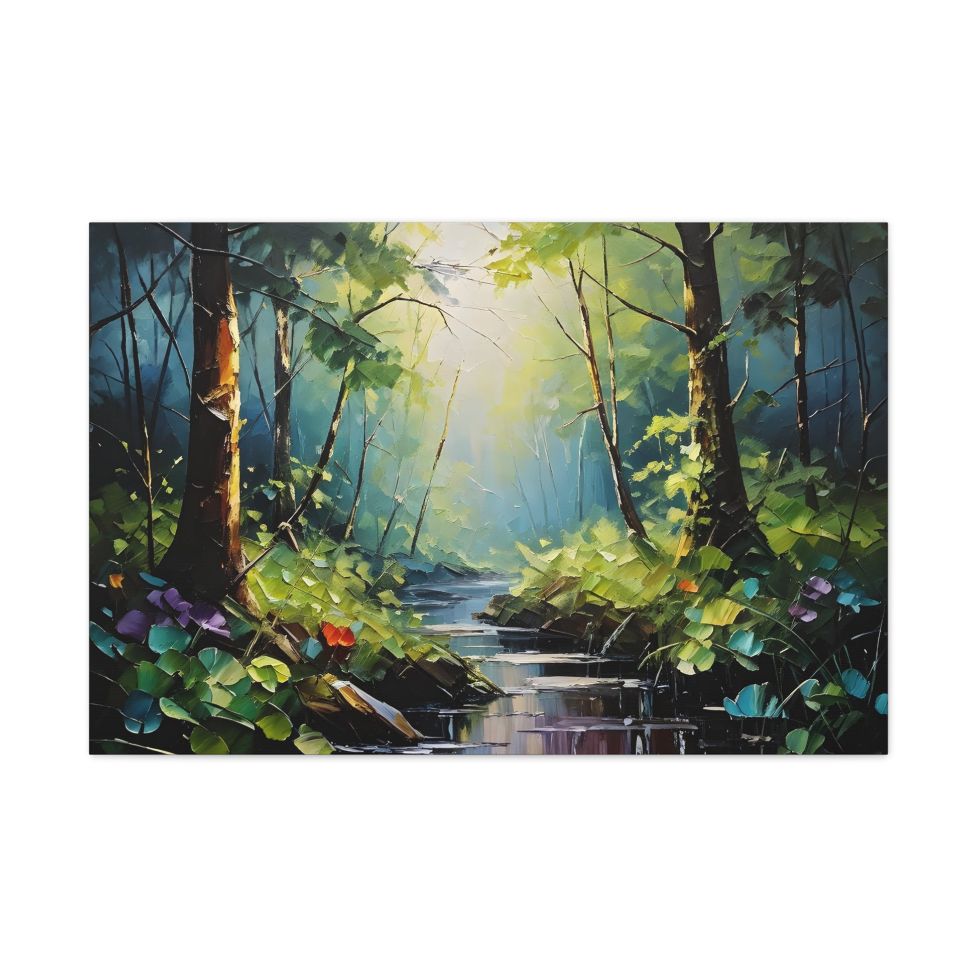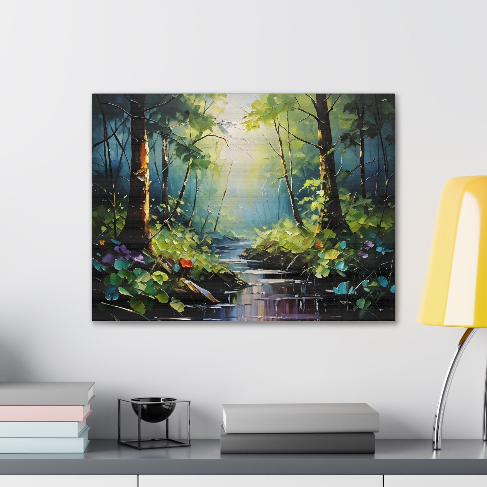 Step into a lush, sunlit forest with "Verdant Glade." This oil painting on cotton canvas captures the peaceful essence of a forest glade, where light filters through the canopy above. NB! For indoor use only, this piece is ideal for adding a touch of nature to your living room or study.