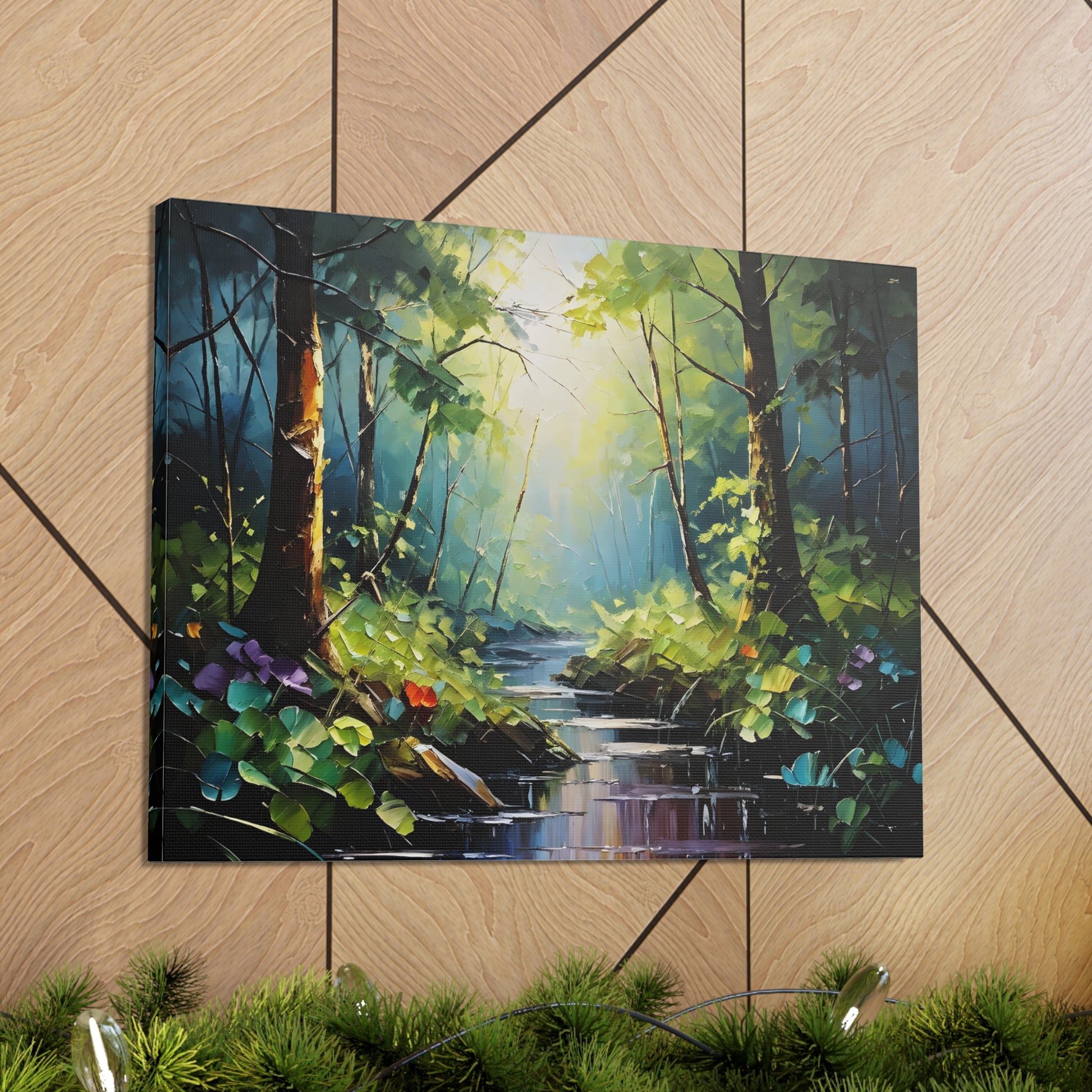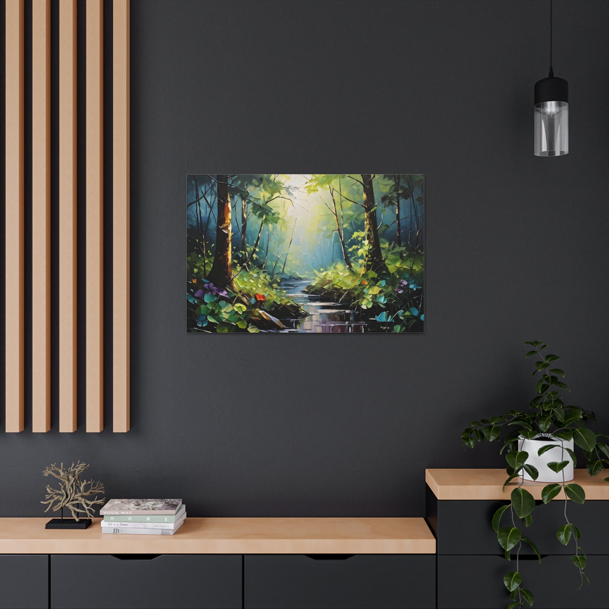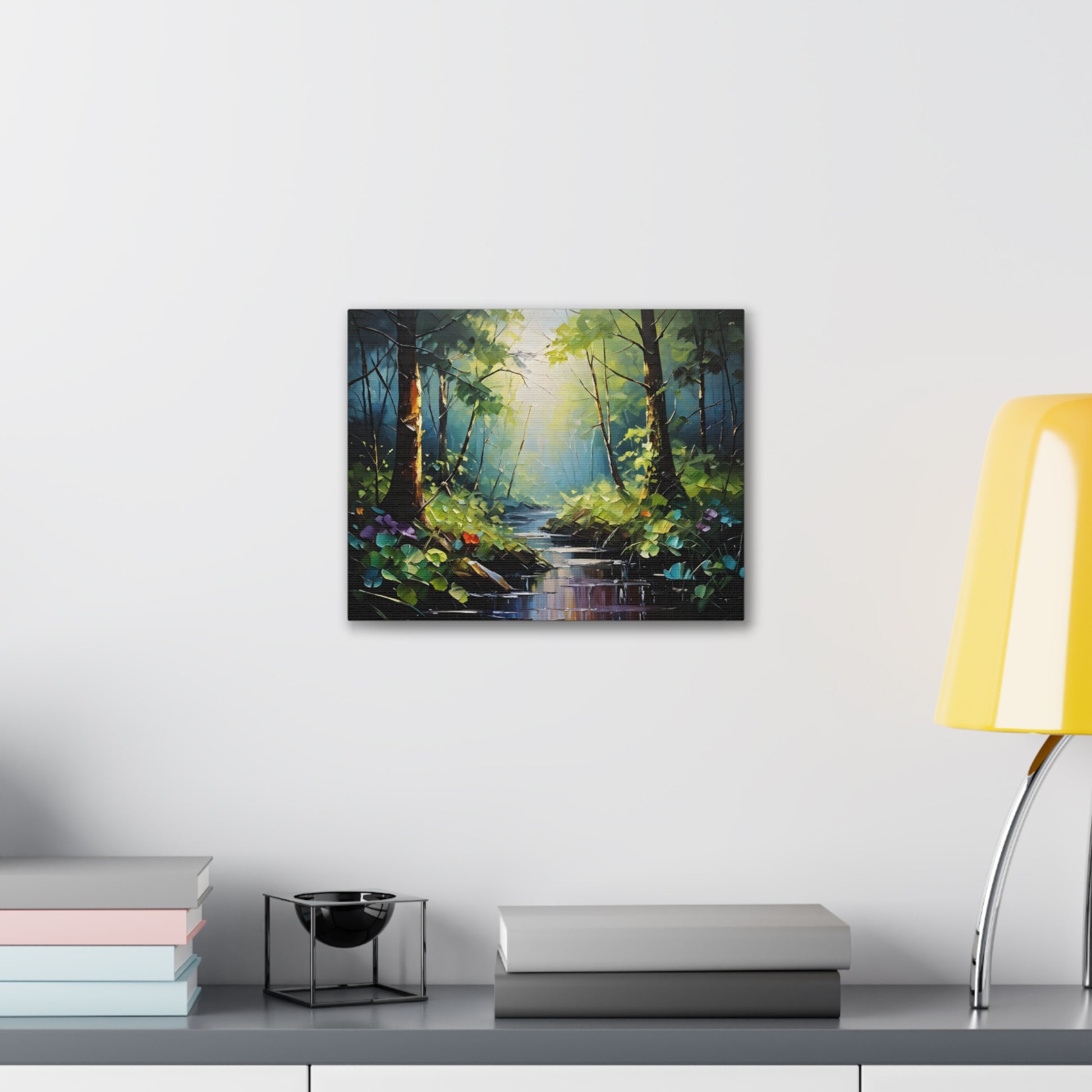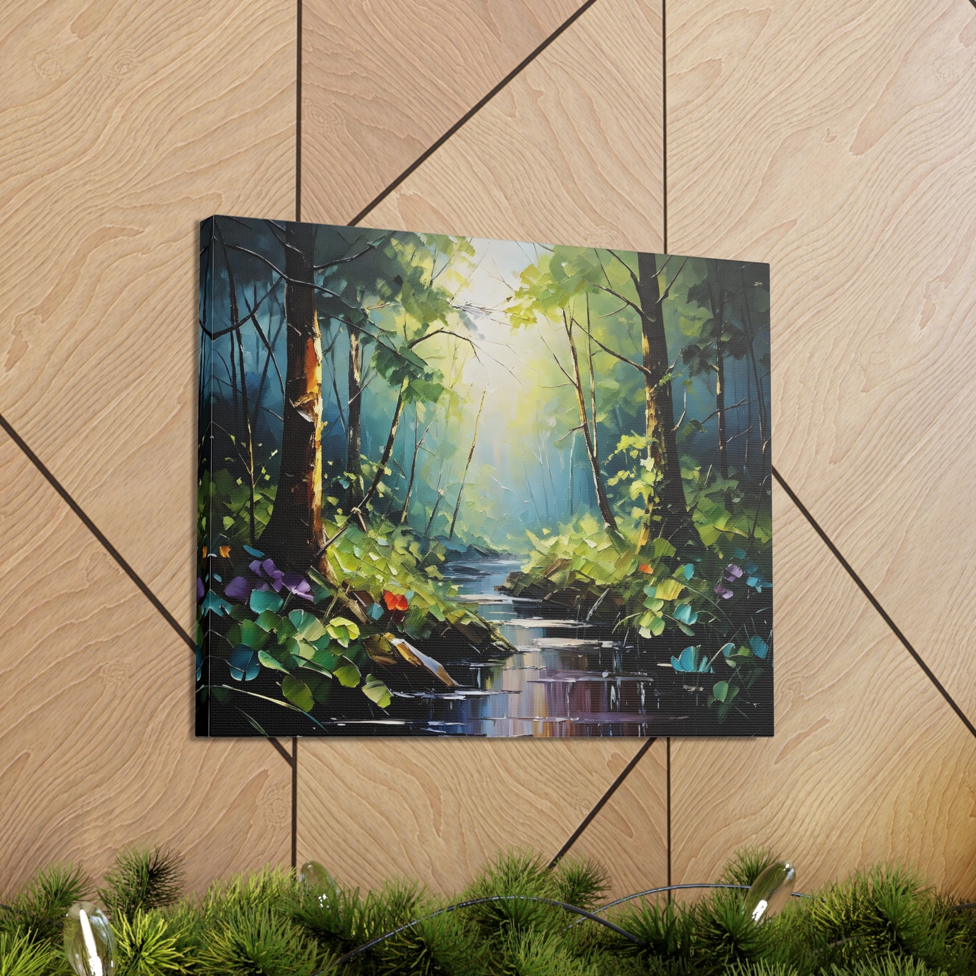 Step into a lush, sunlit forest with "Verdant Glade." This oil painting on cotton canvas captures the peaceful essence of a forest glade, where light filters through the canopy above. NB! For indoor use only, this piece is ideal for adding a touch of nature to your living room or study.