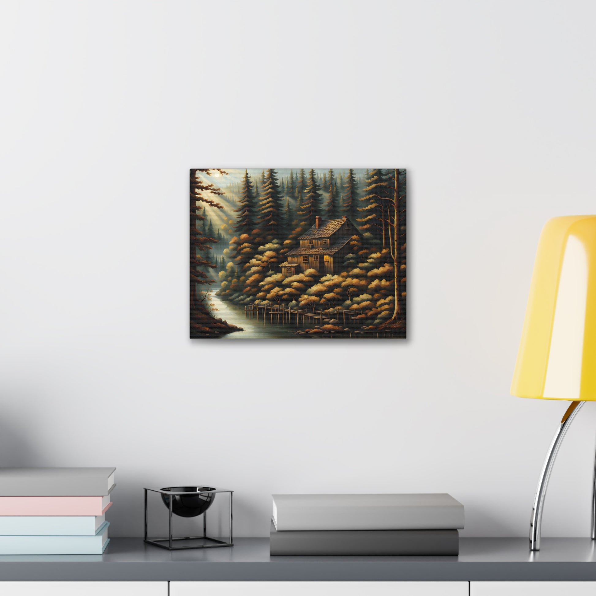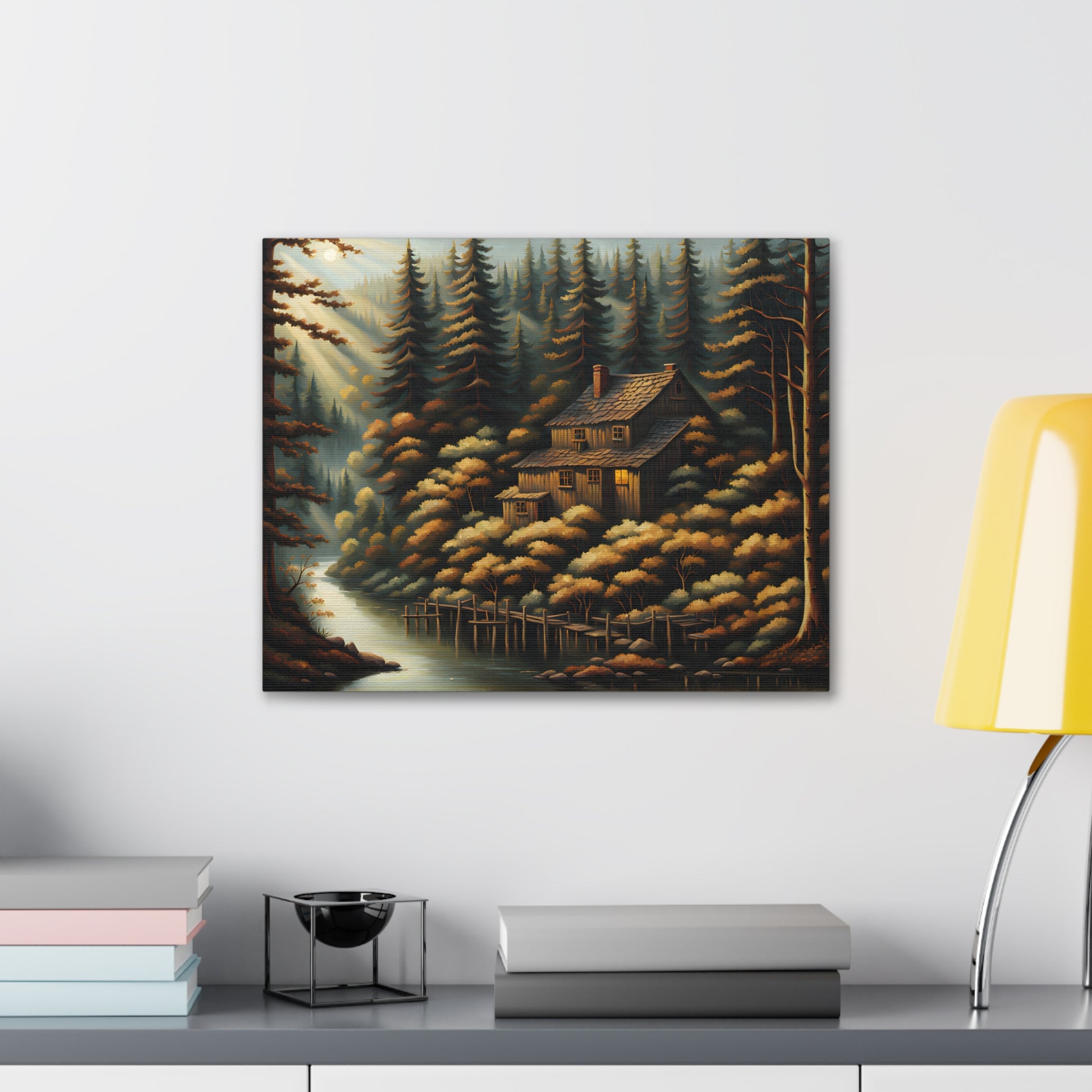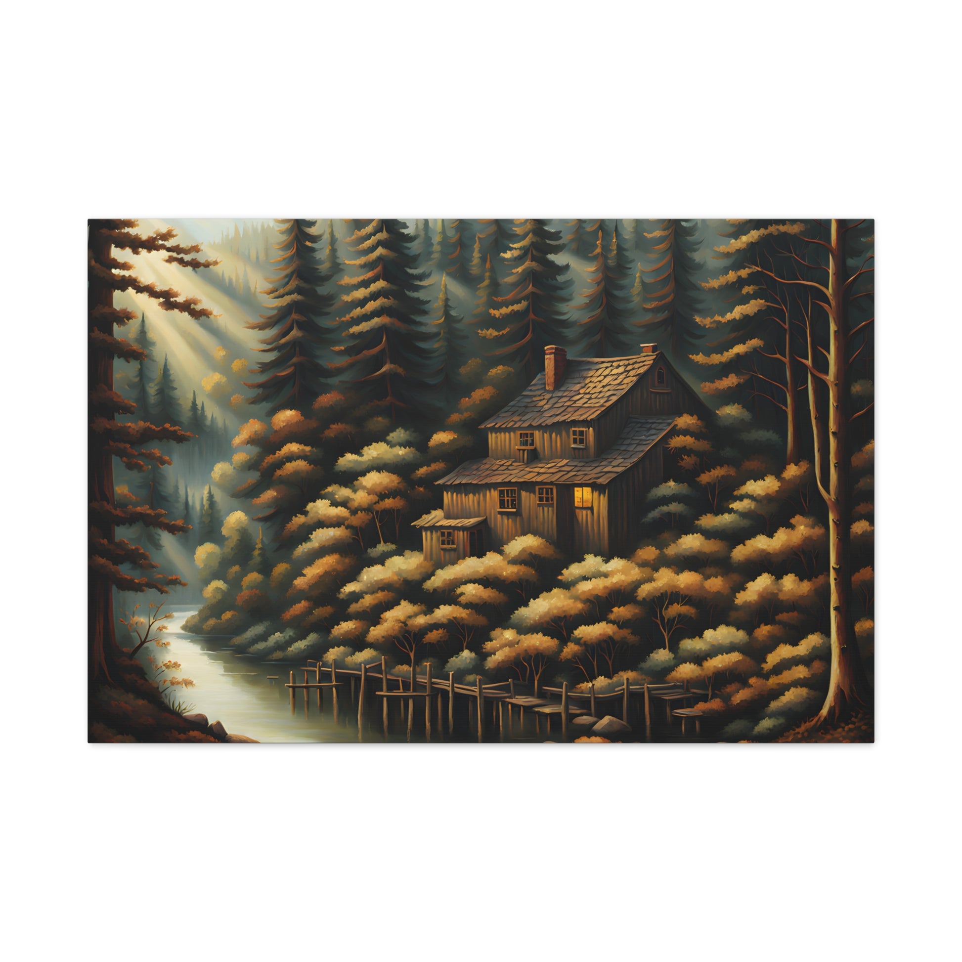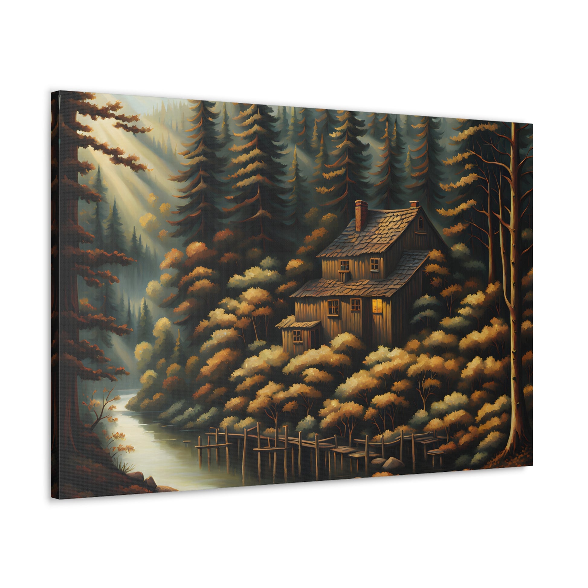 Escape to a forest sanctuary with "Verdant Retreat." This oil painting depicts a cozy cabin hidden among lush trees and bathed in sunlight, bringing a sense of peace and tranquility to any room.