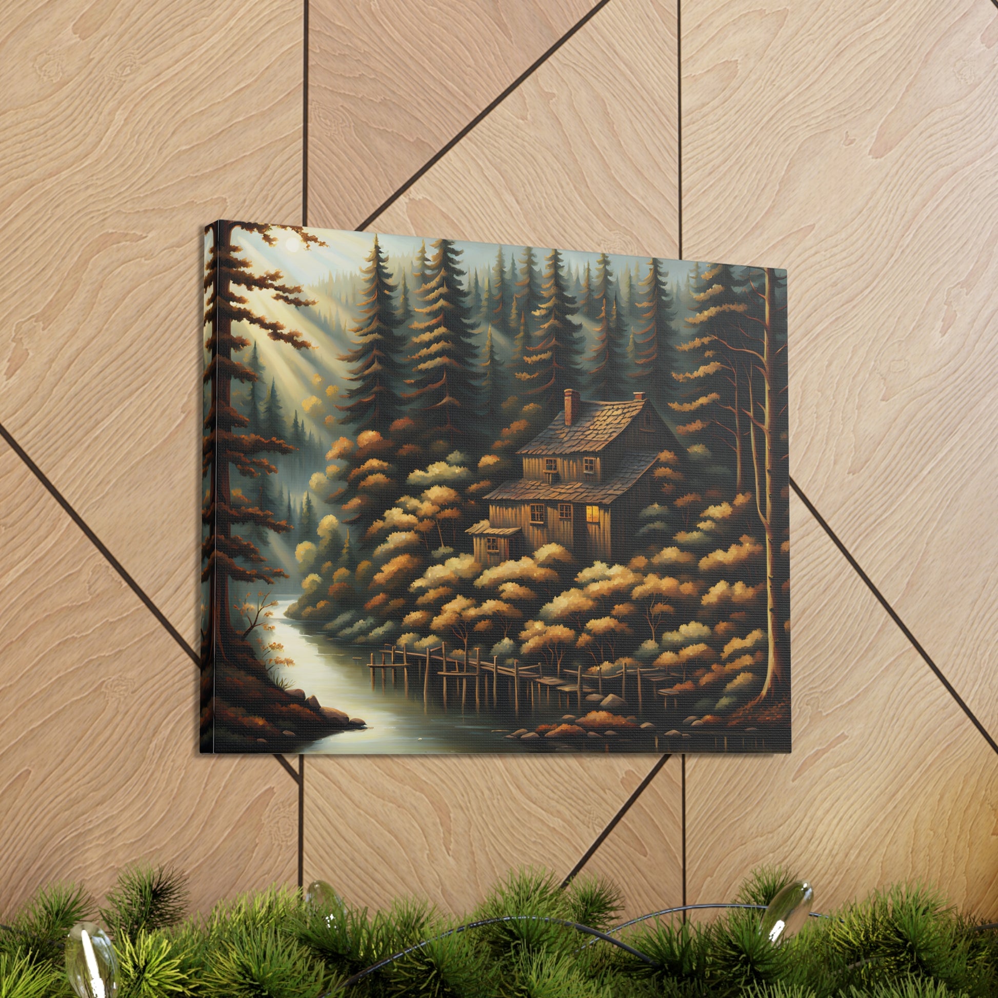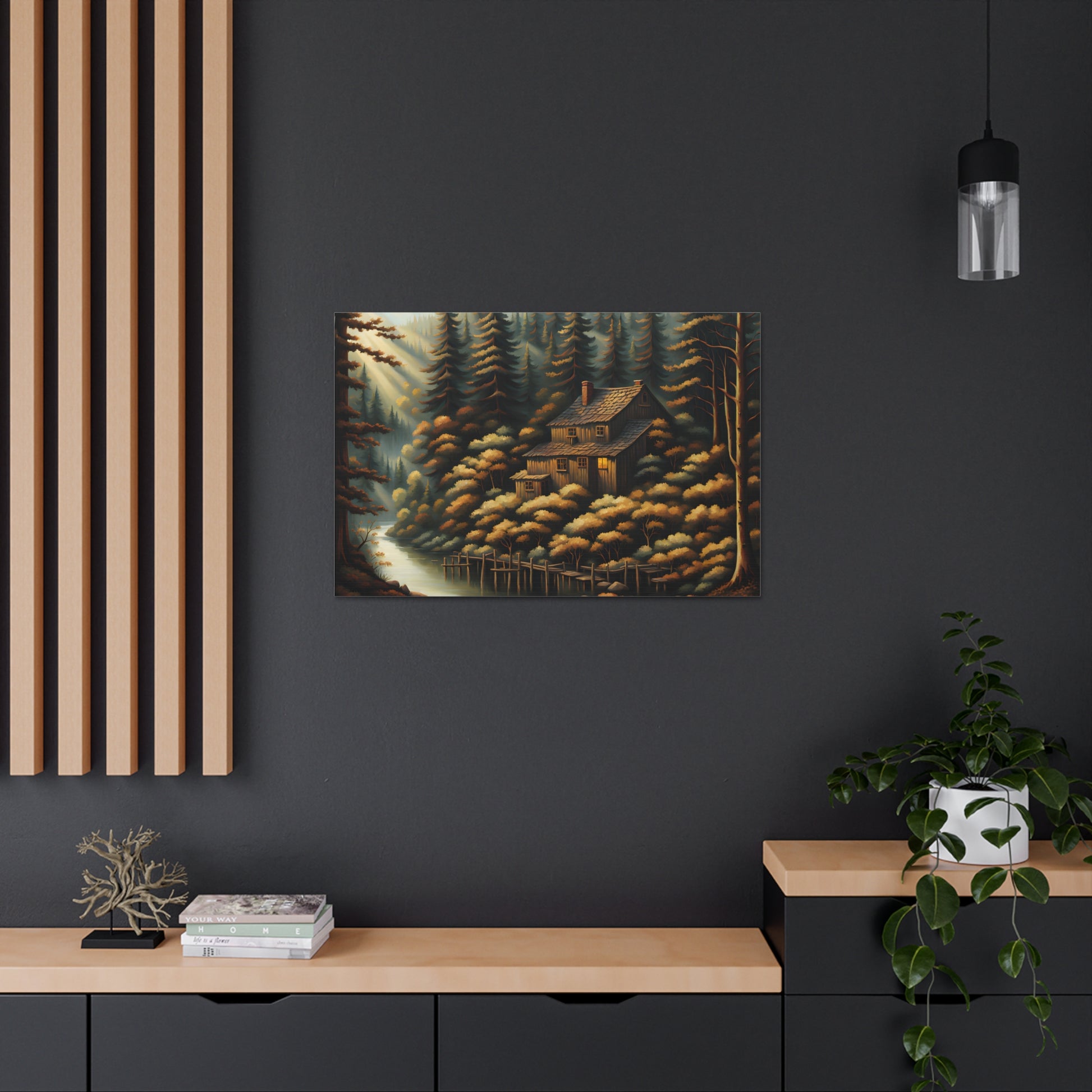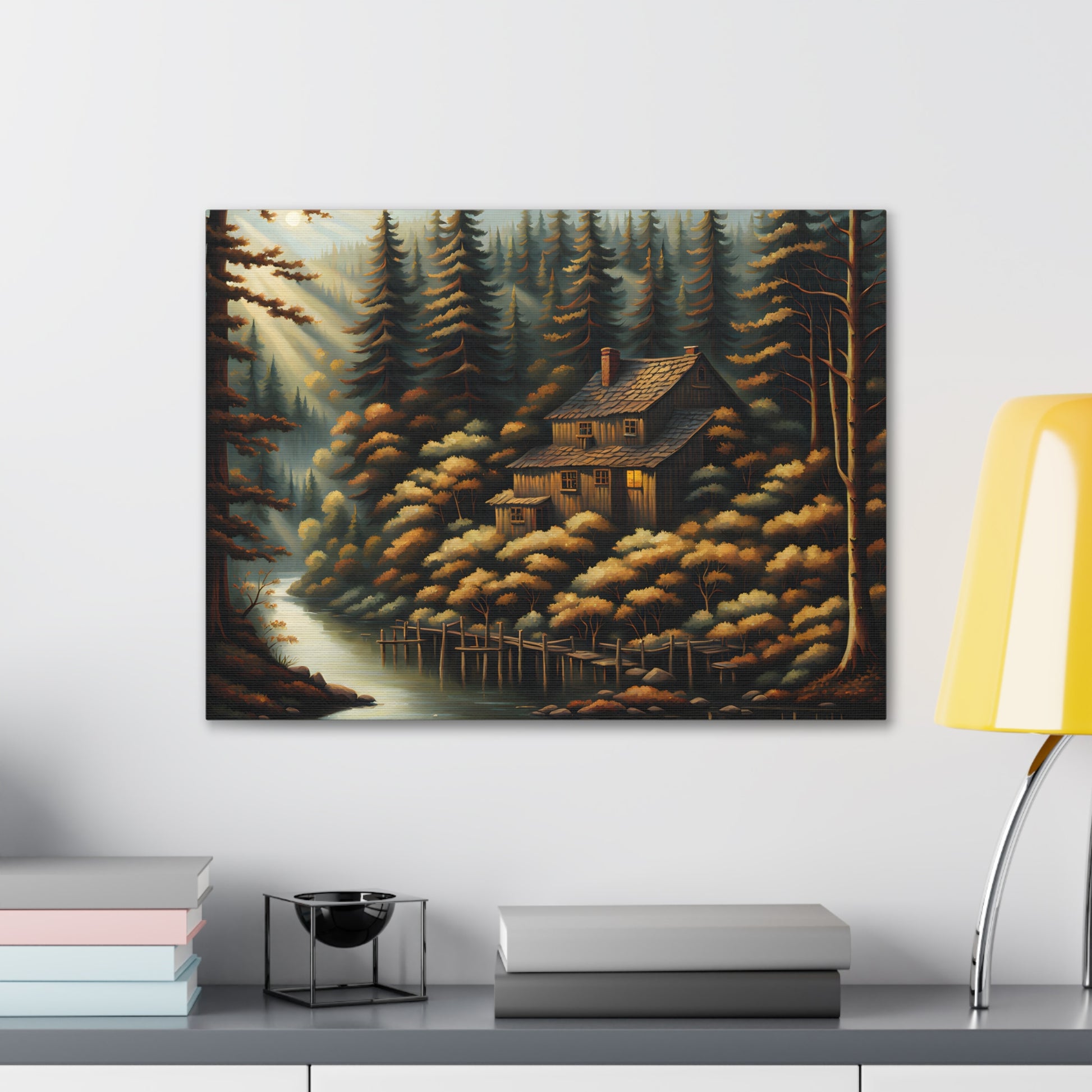 Escape to a forest sanctuary with "Verdant Retreat." This oil painting depicts a cozy cabin hidden among lush trees and bathed in sunlight, bringing a sense of peace and tranquility to any room.