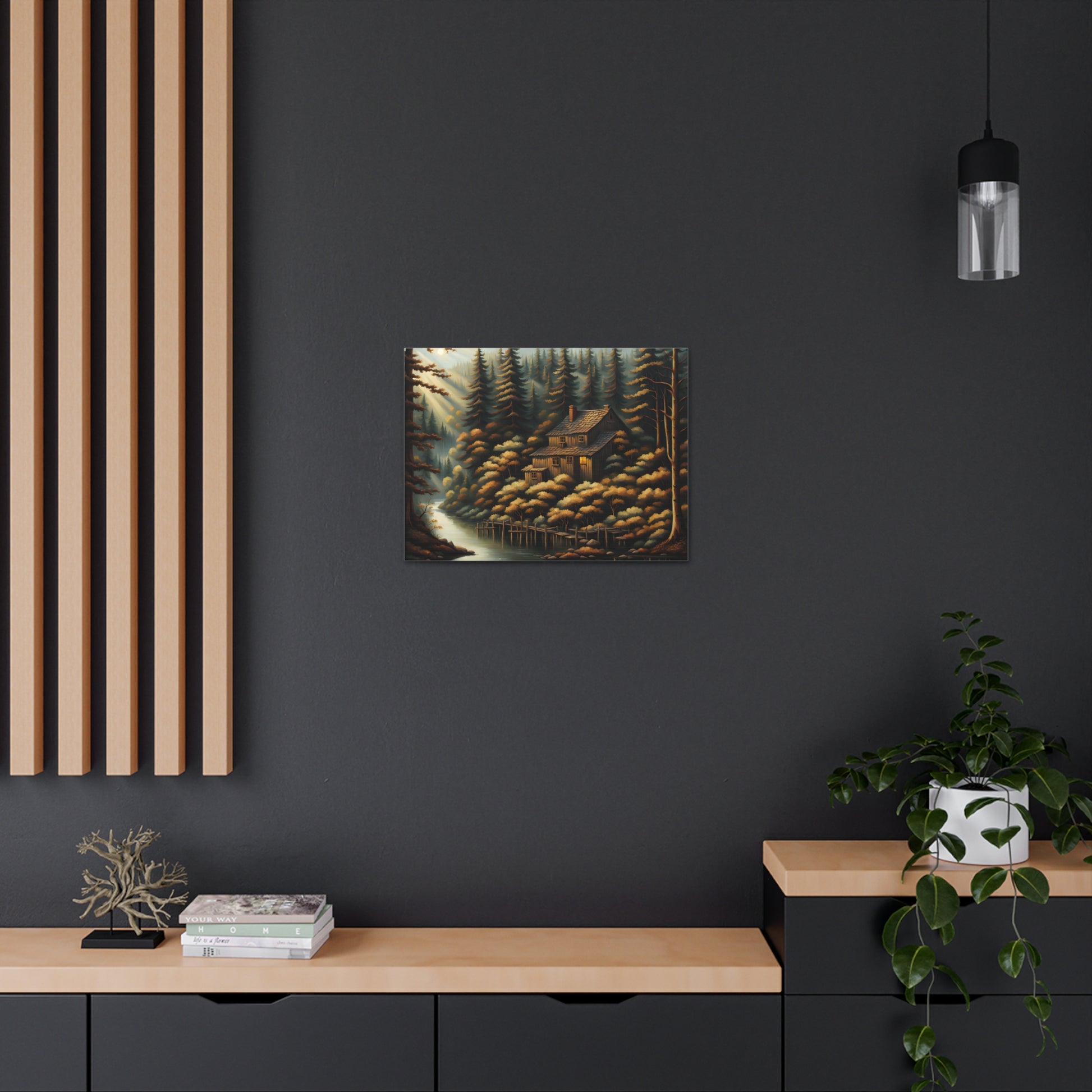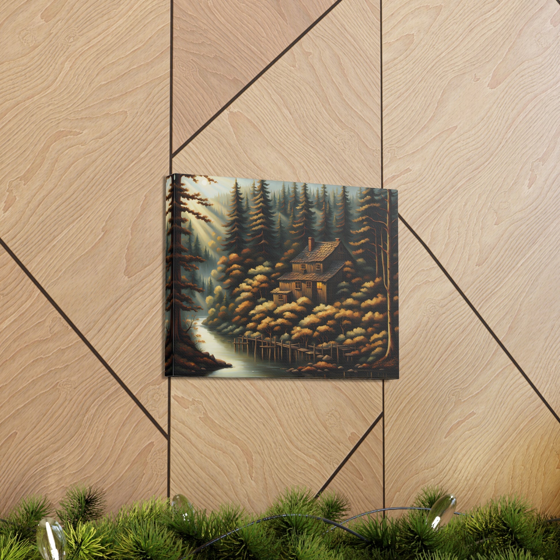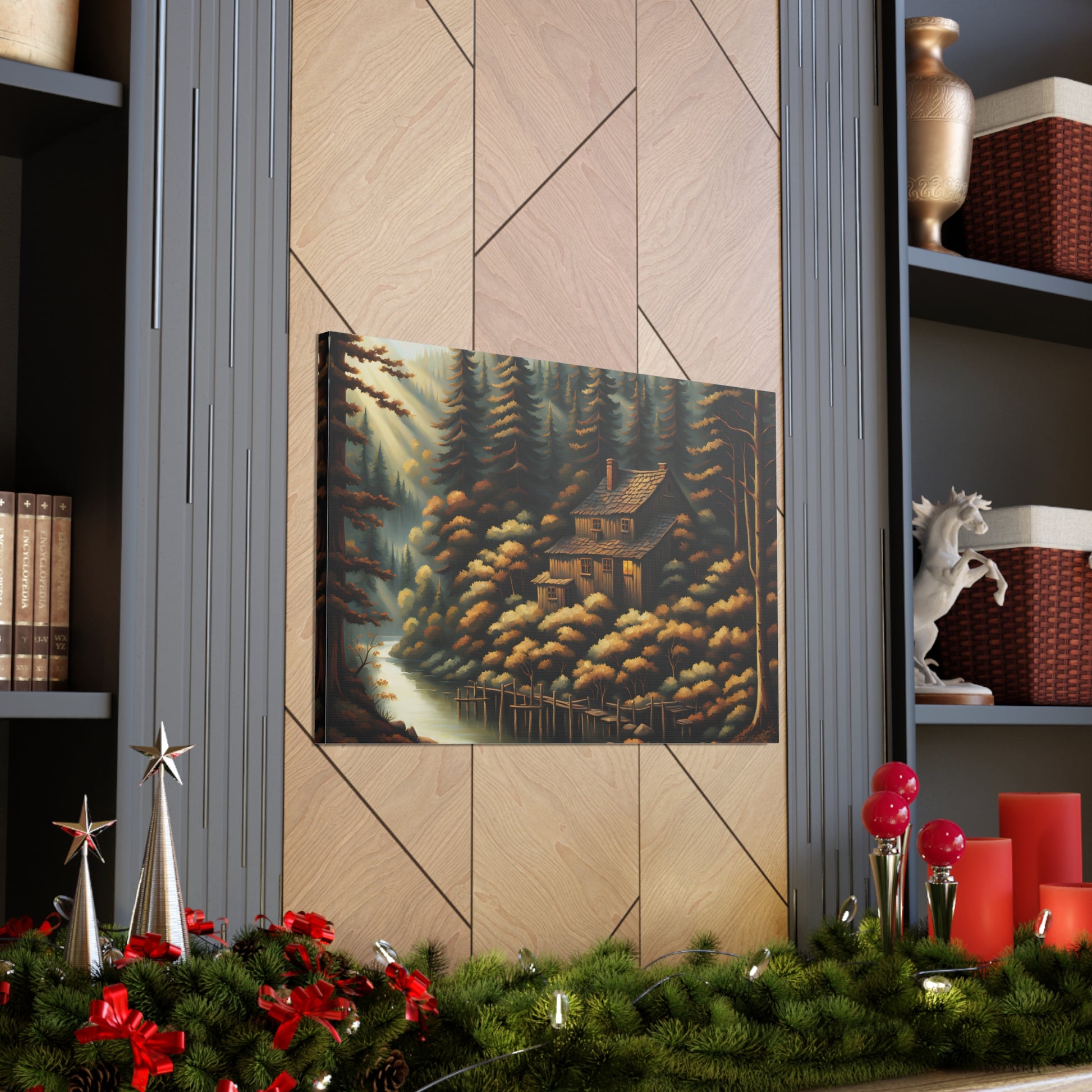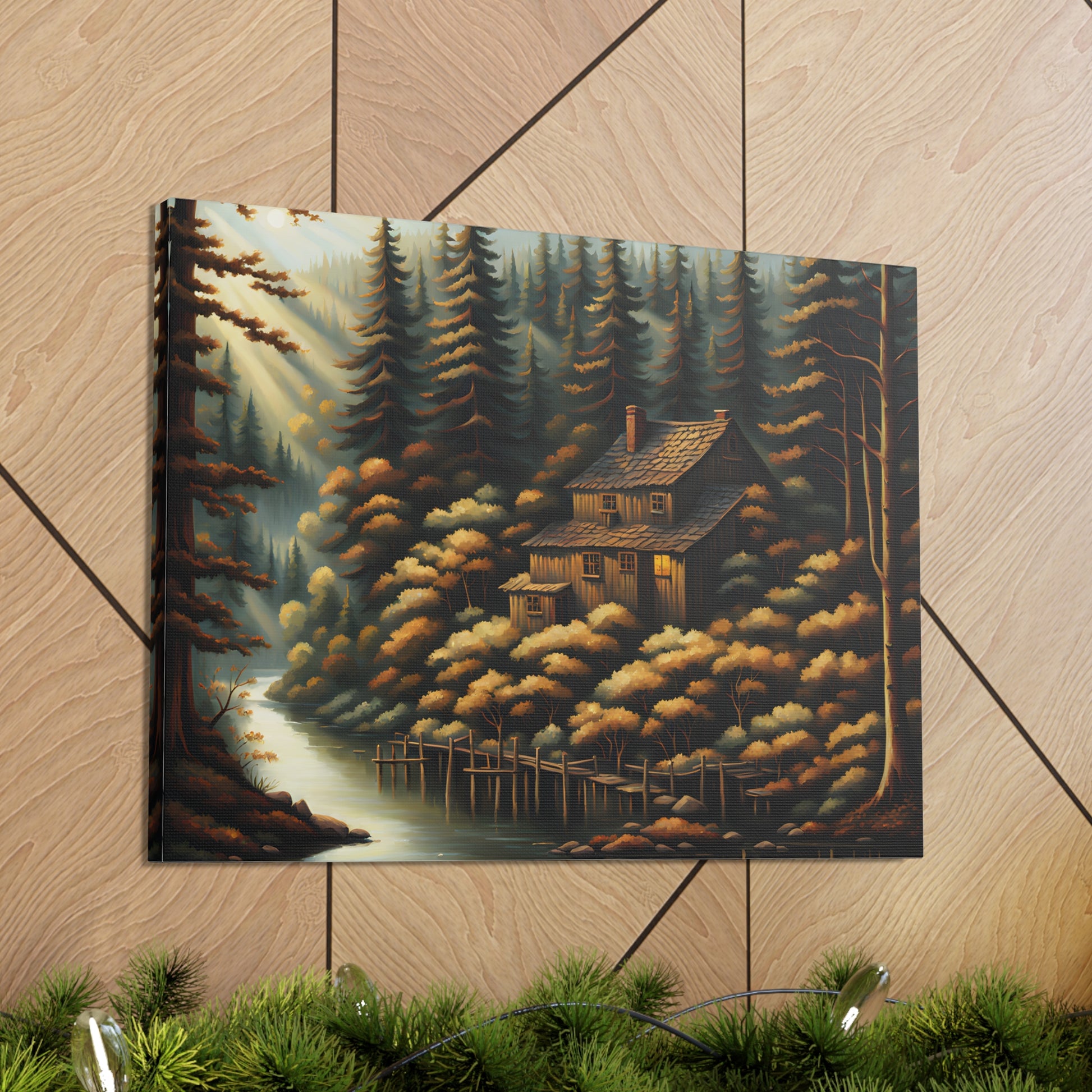 Escape to a forest sanctuary with "Verdant Retreat." This oil painting depicts a cozy cabin hidden among lush trees and bathed in sunlight, bringing a sense of peace and tranquility to any room.