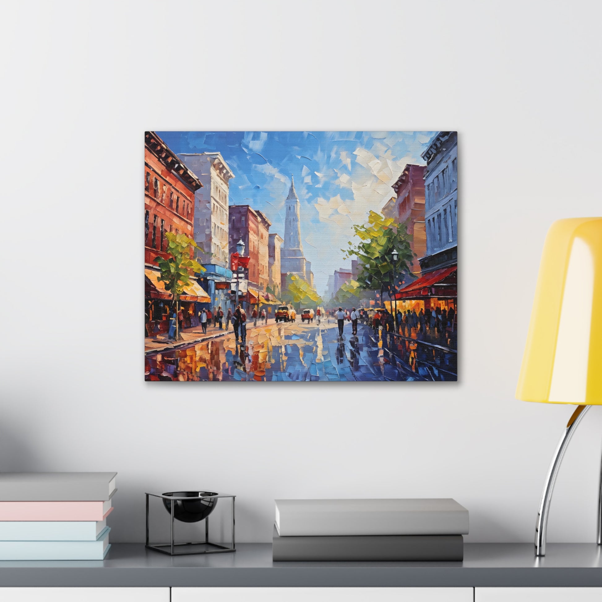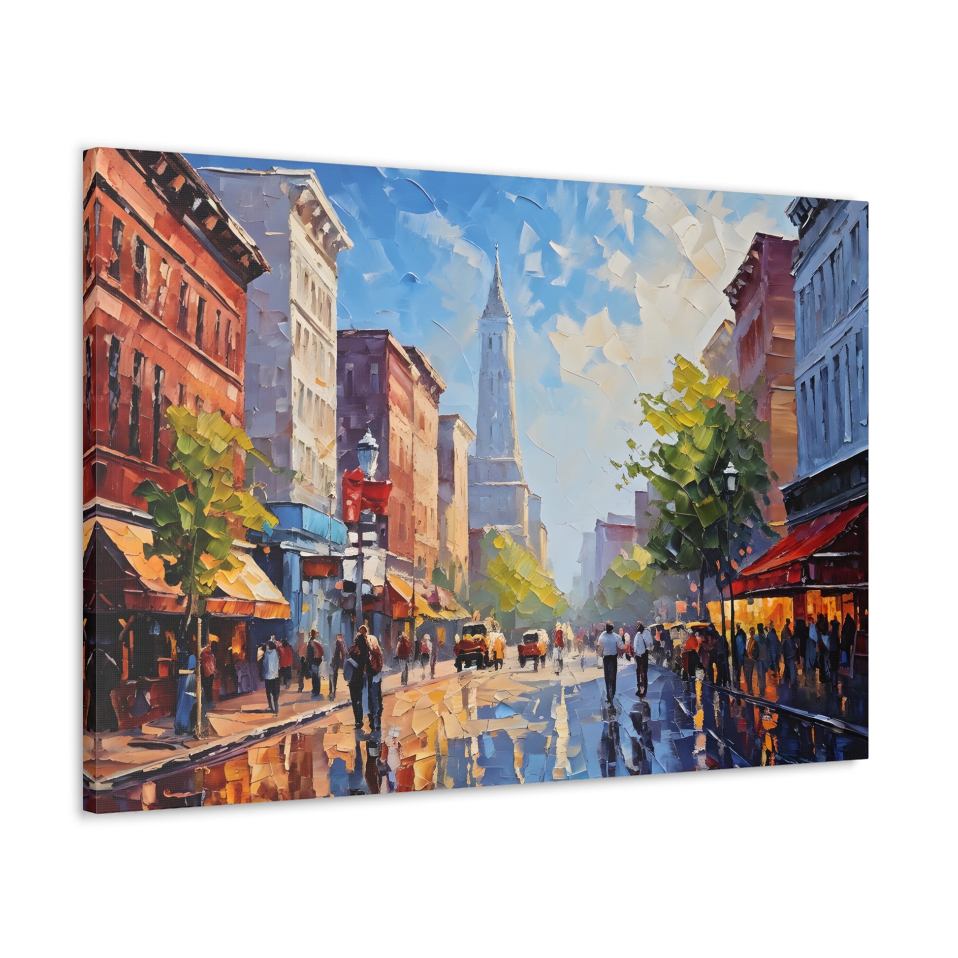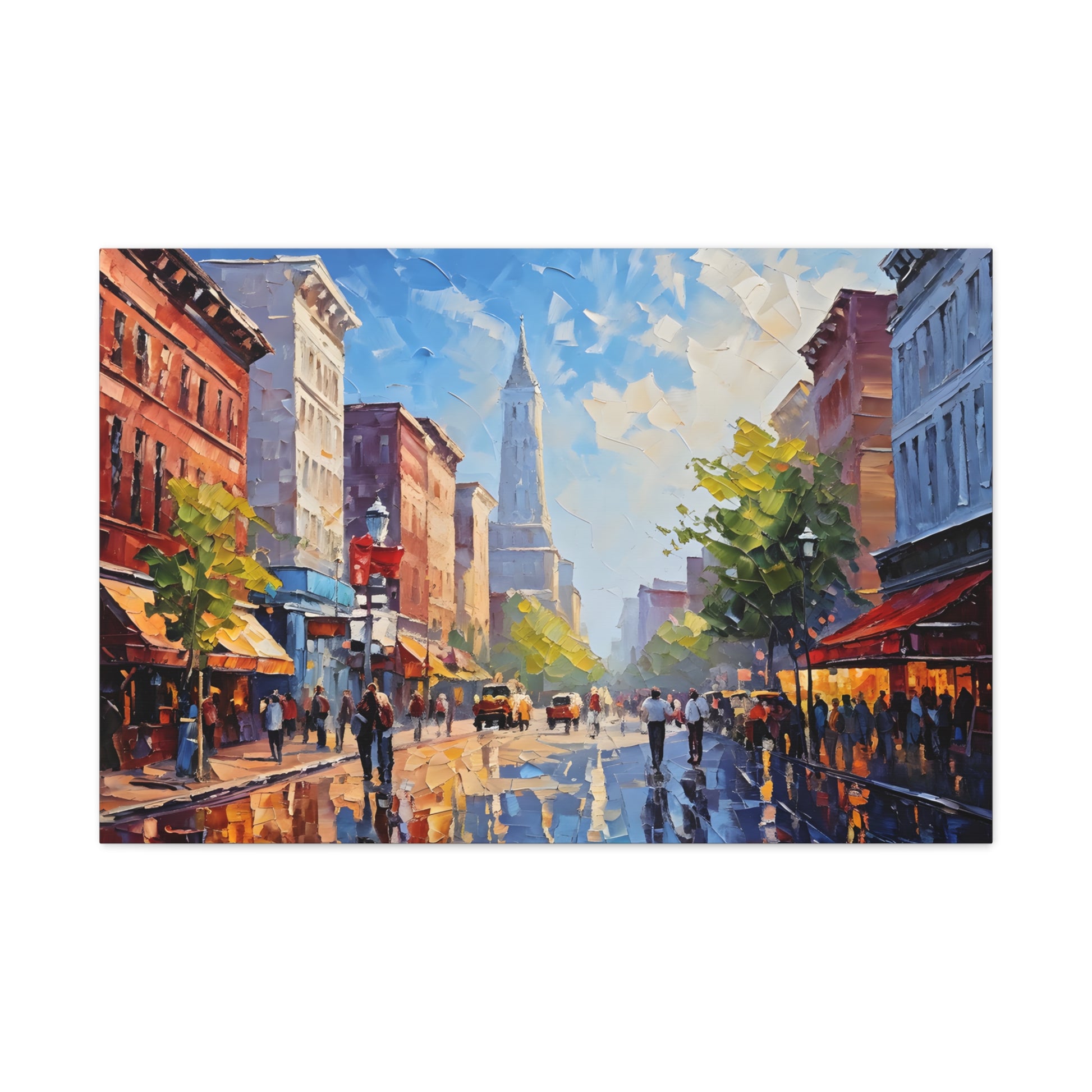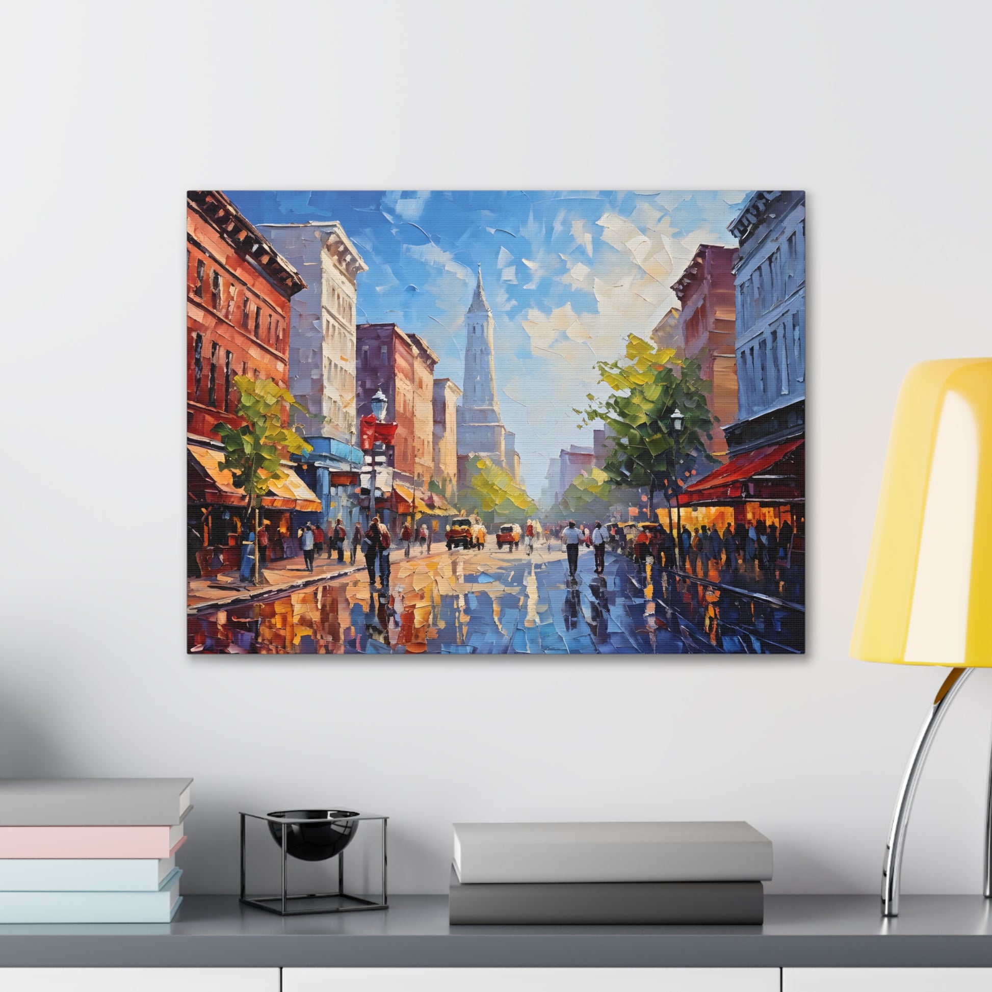 Vivid and full of life, "Vibrant Energy" portrays a bustling city street illuminated by vibrant colors. The textured brushwork and lively scene make this painting a dynamic centerpiece for modern interiors.