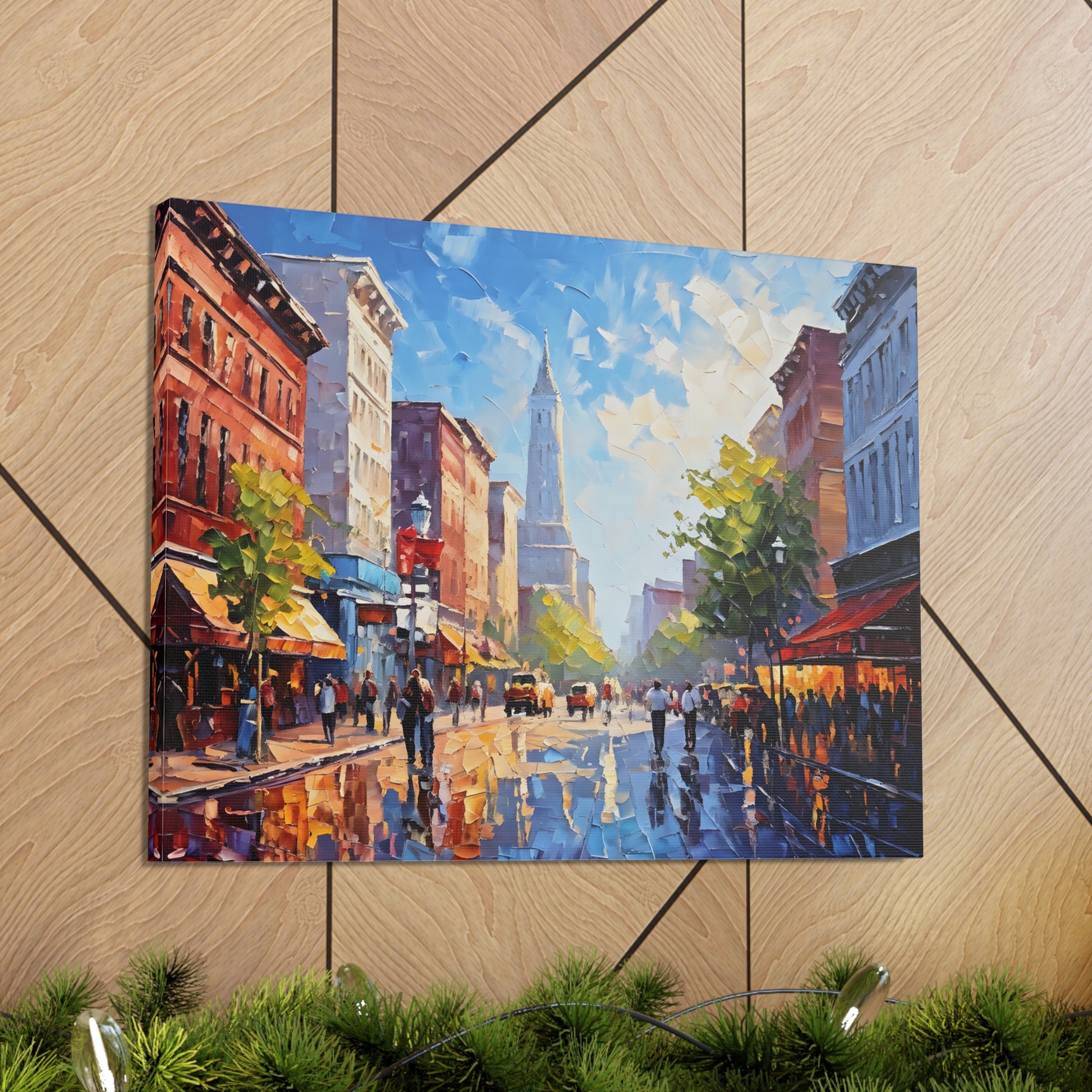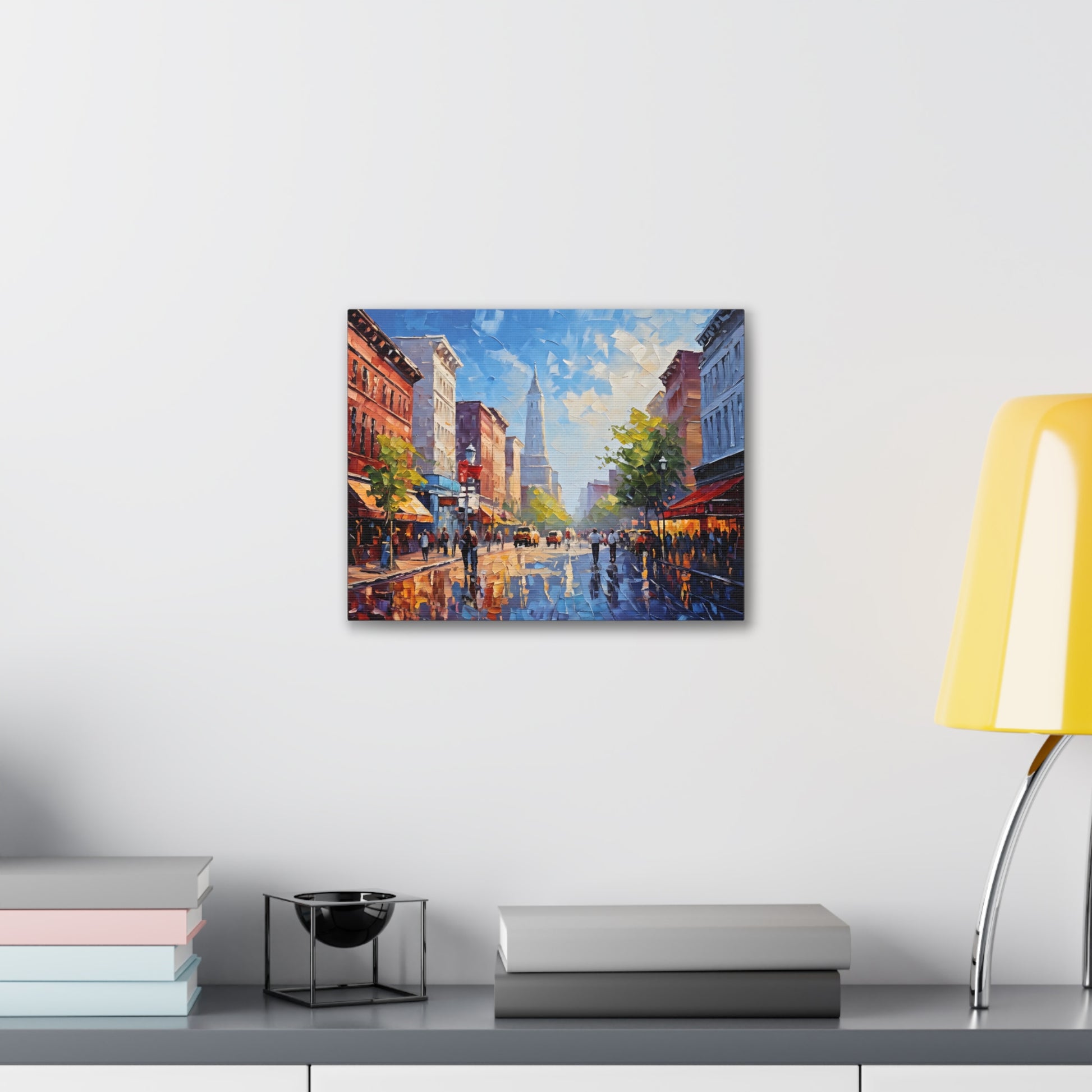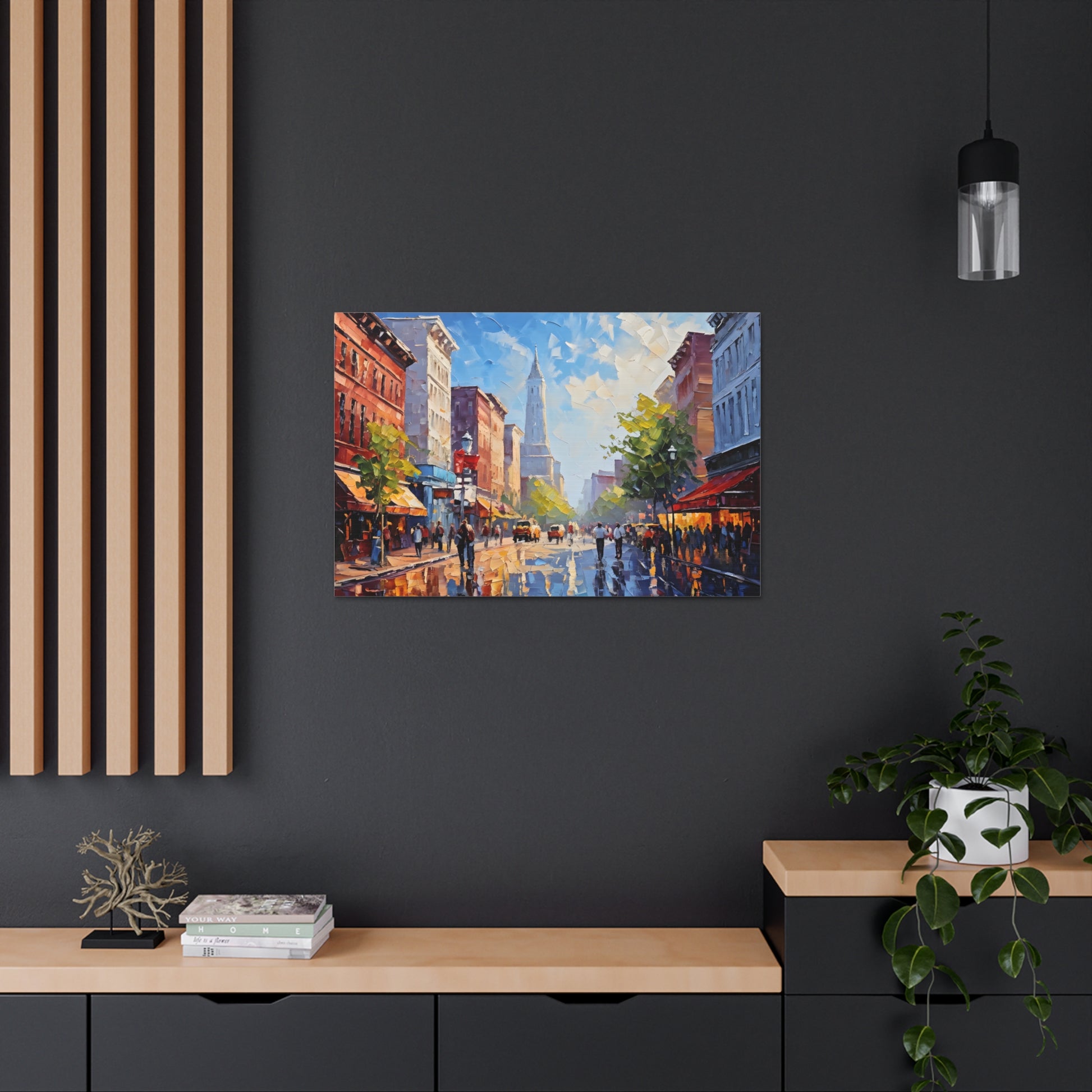 Vivid and full of life, "Vibrant Energy" portrays a bustling city street illuminated by vibrant colors. The textured brushwork and lively scene make this painting a dynamic centerpiece for modern interiors.
