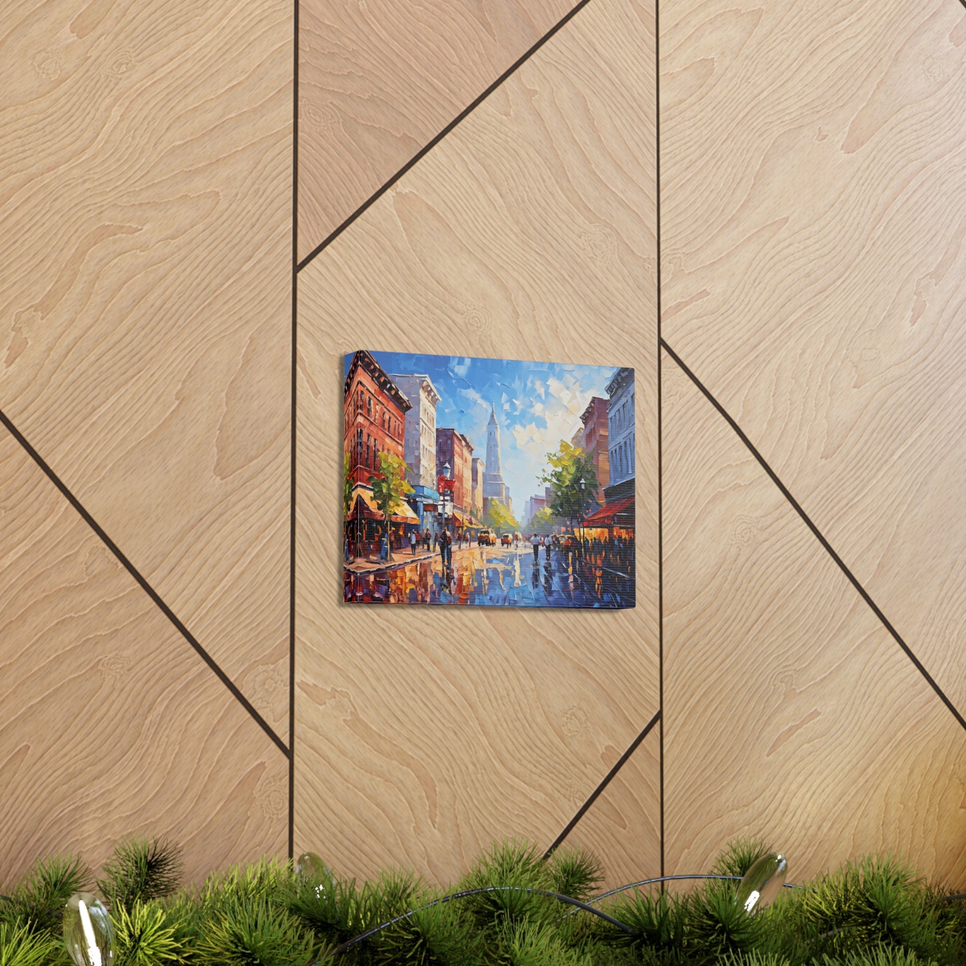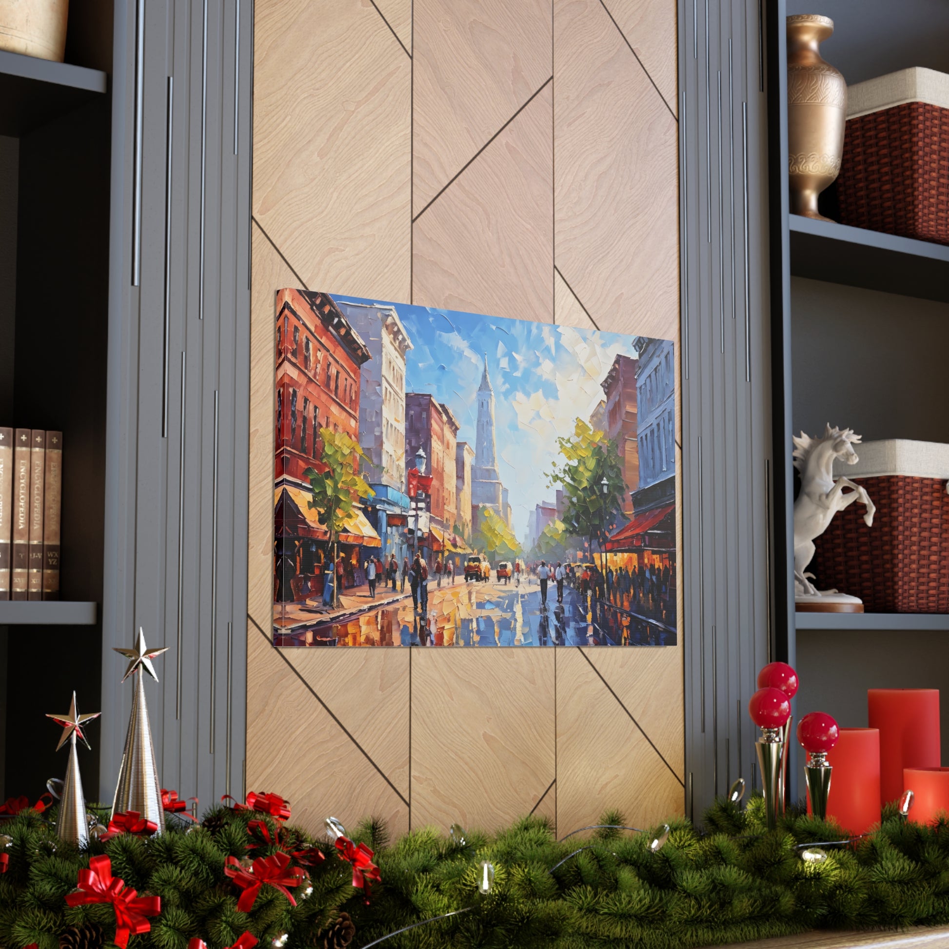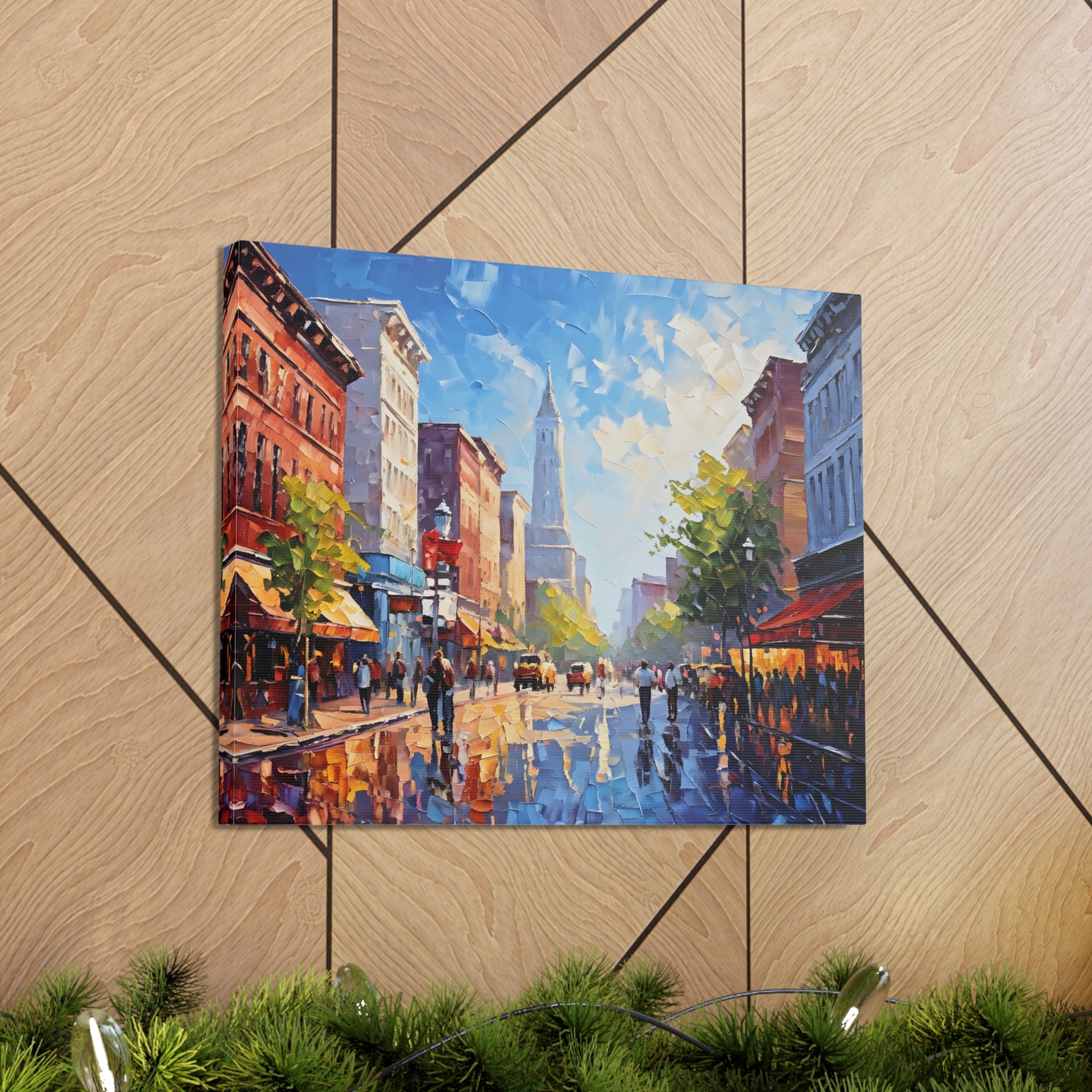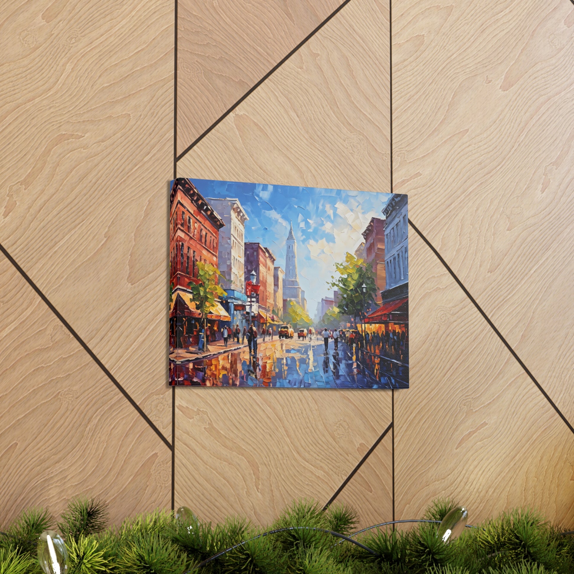 Vivid and full of life, "Vibrant Energy" portrays a bustling city street illuminated by vibrant colors. The textured brushwork and lively scene make this painting a dynamic centerpiece for modern interiors.
