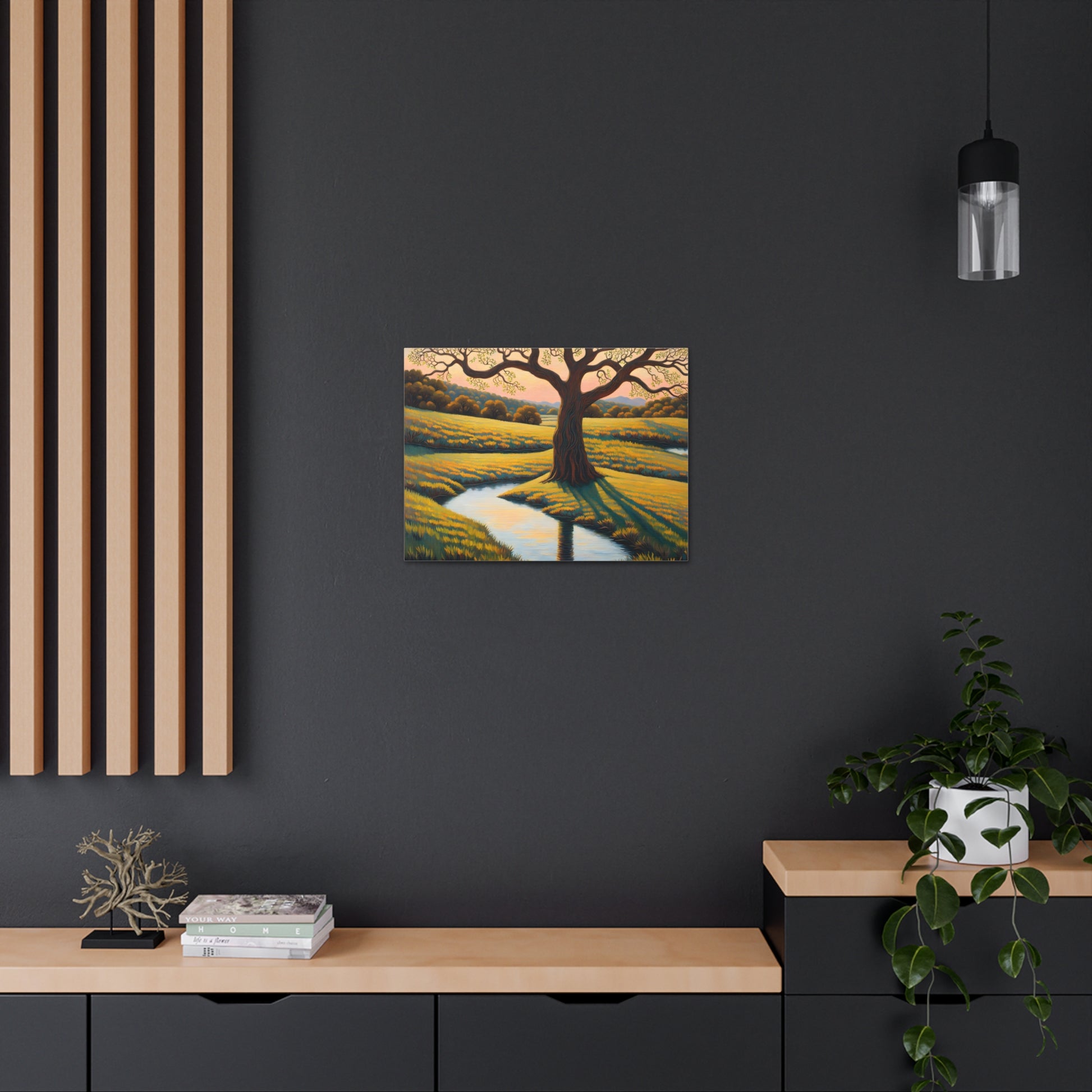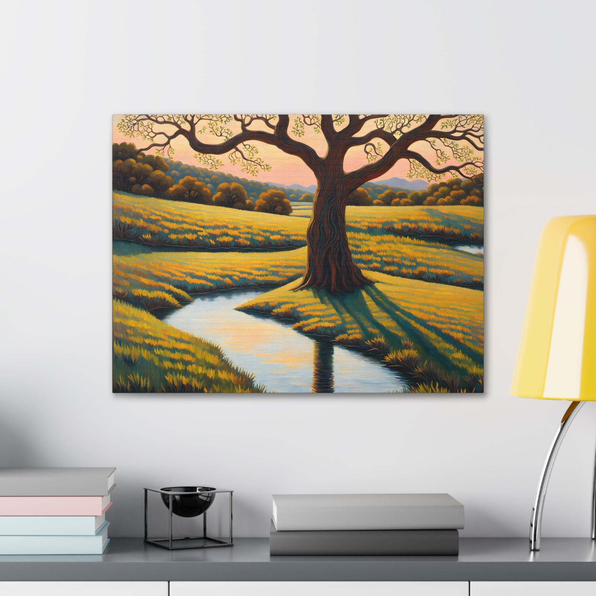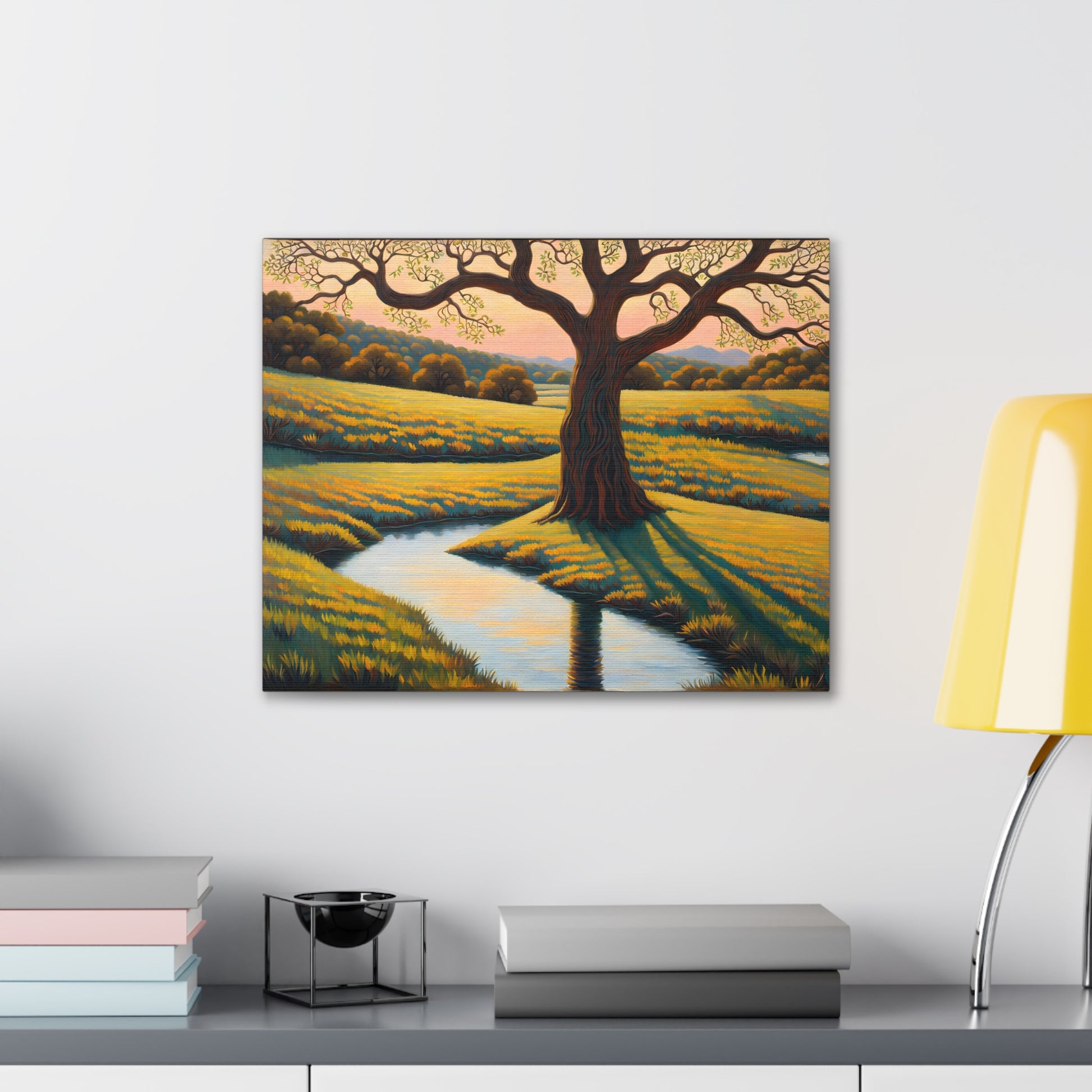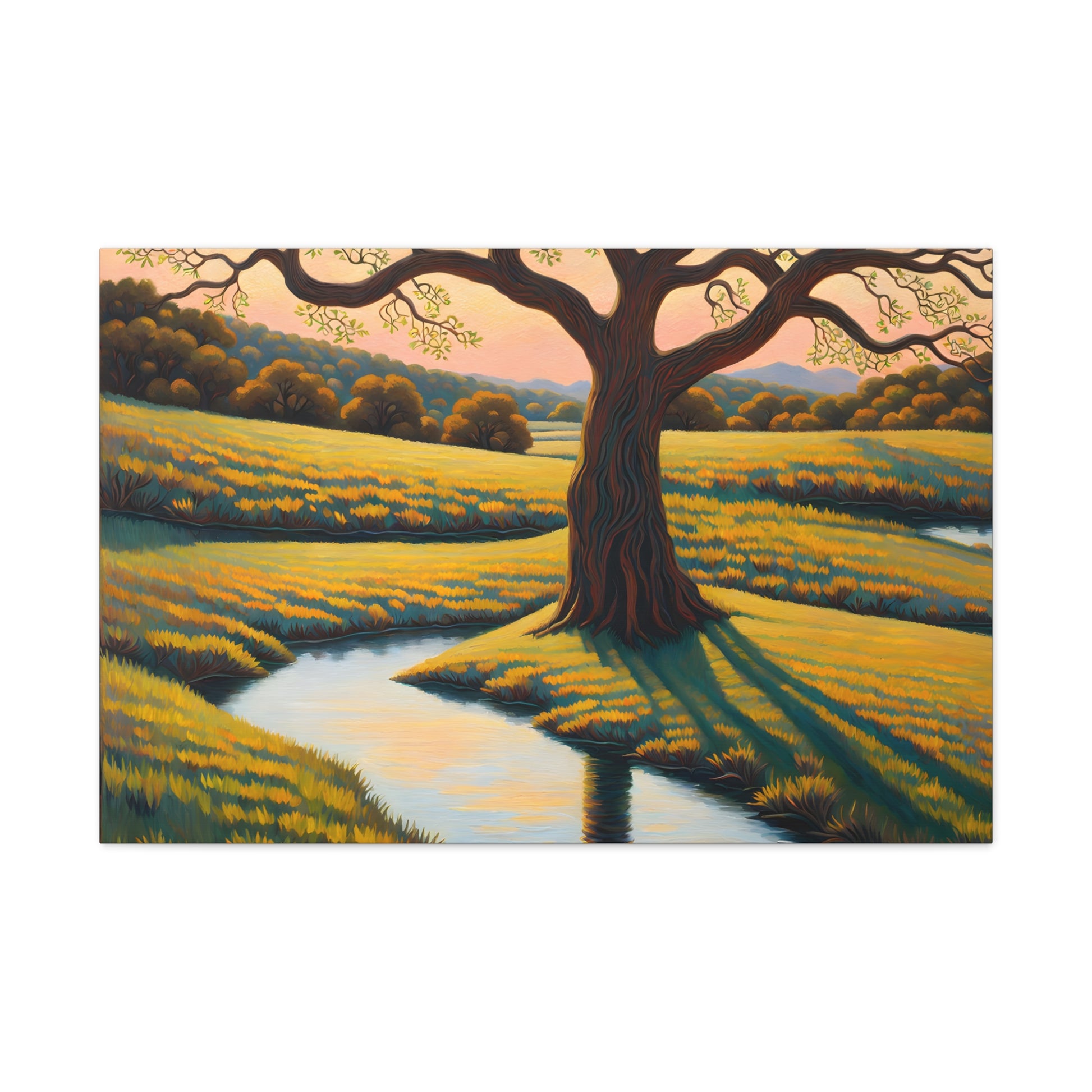 "Whispering Field" depicts a solitary tree standing amidst a rolling landscape, bathed in the warm glow of sunset. Crafted on premium cotton canvas, this oil painting brings the tranquility of an open field into your home. NB! For indoor use only, it's perfect for creating a serene and expansive feel in any room.