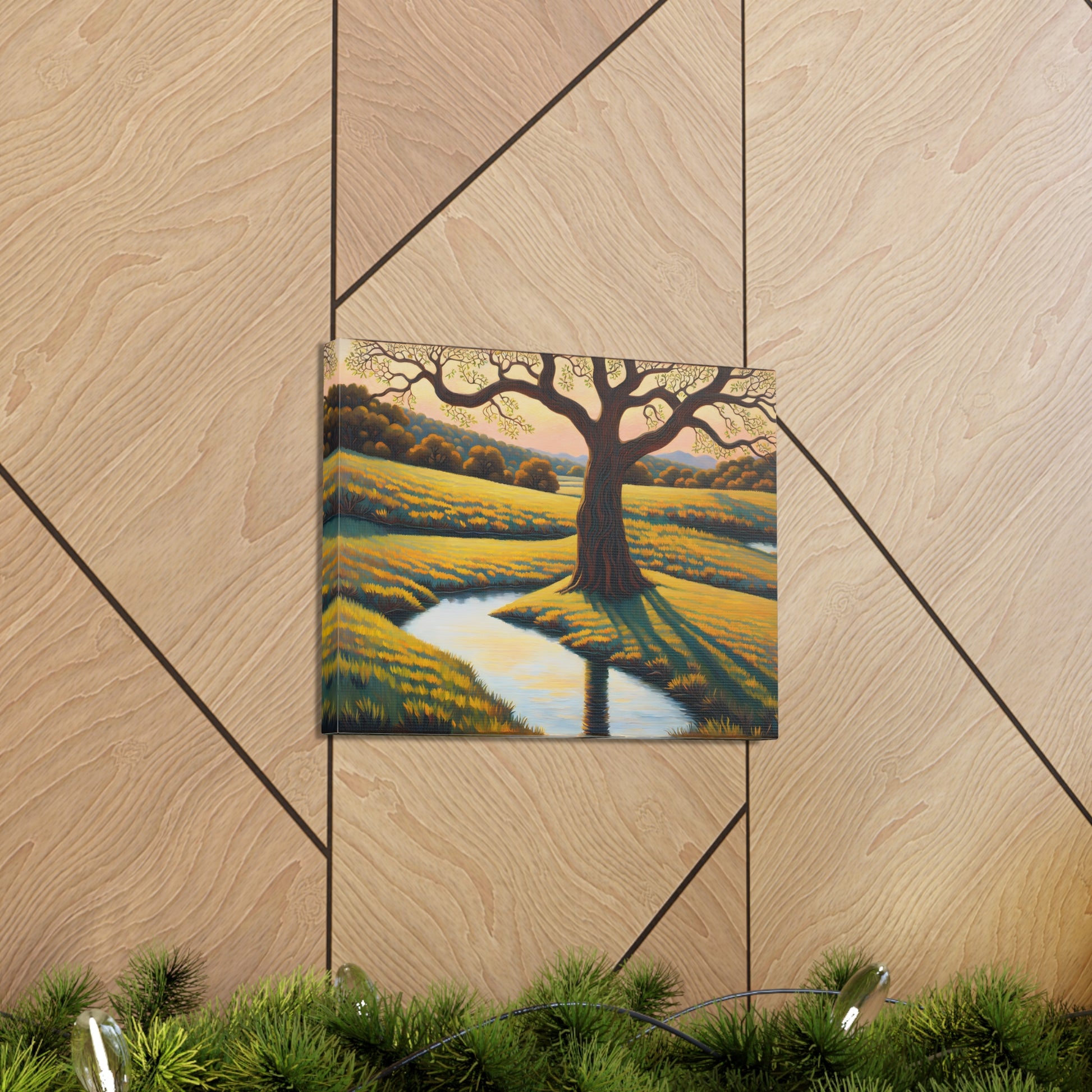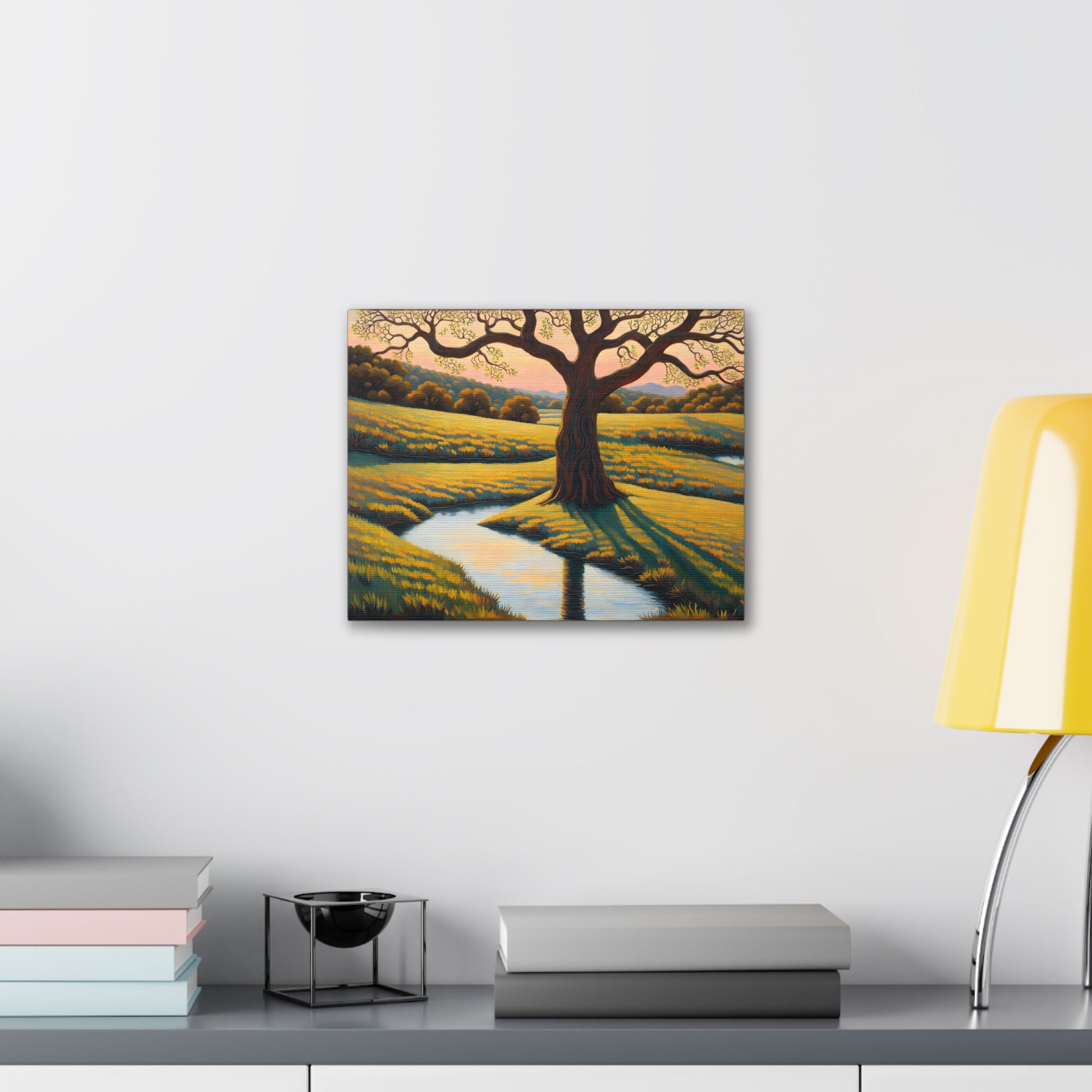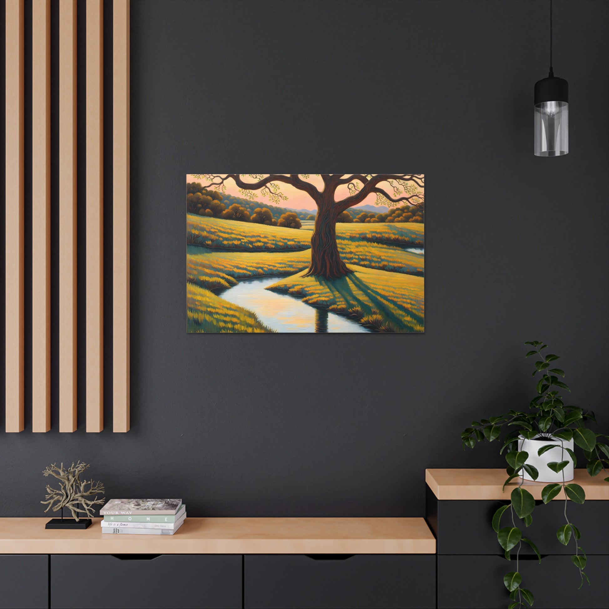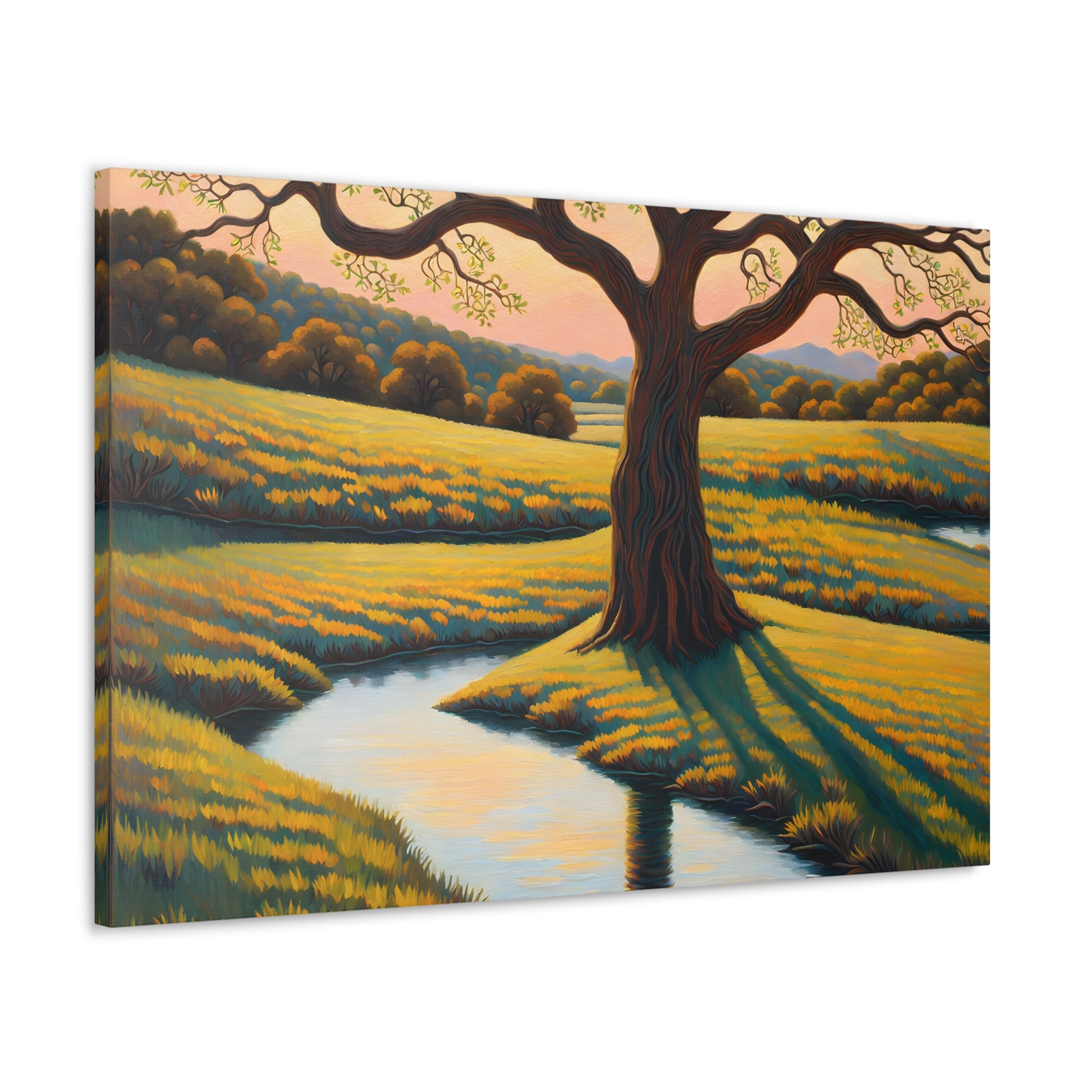 "Whispering Field" depicts a solitary tree standing amidst a rolling landscape, bathed in the warm glow of sunset. Crafted on premium cotton canvas, this oil painting brings the tranquility of an open field into your home. NB! For indoor use only, it's perfect for creating a serene and expansive feel in any room.