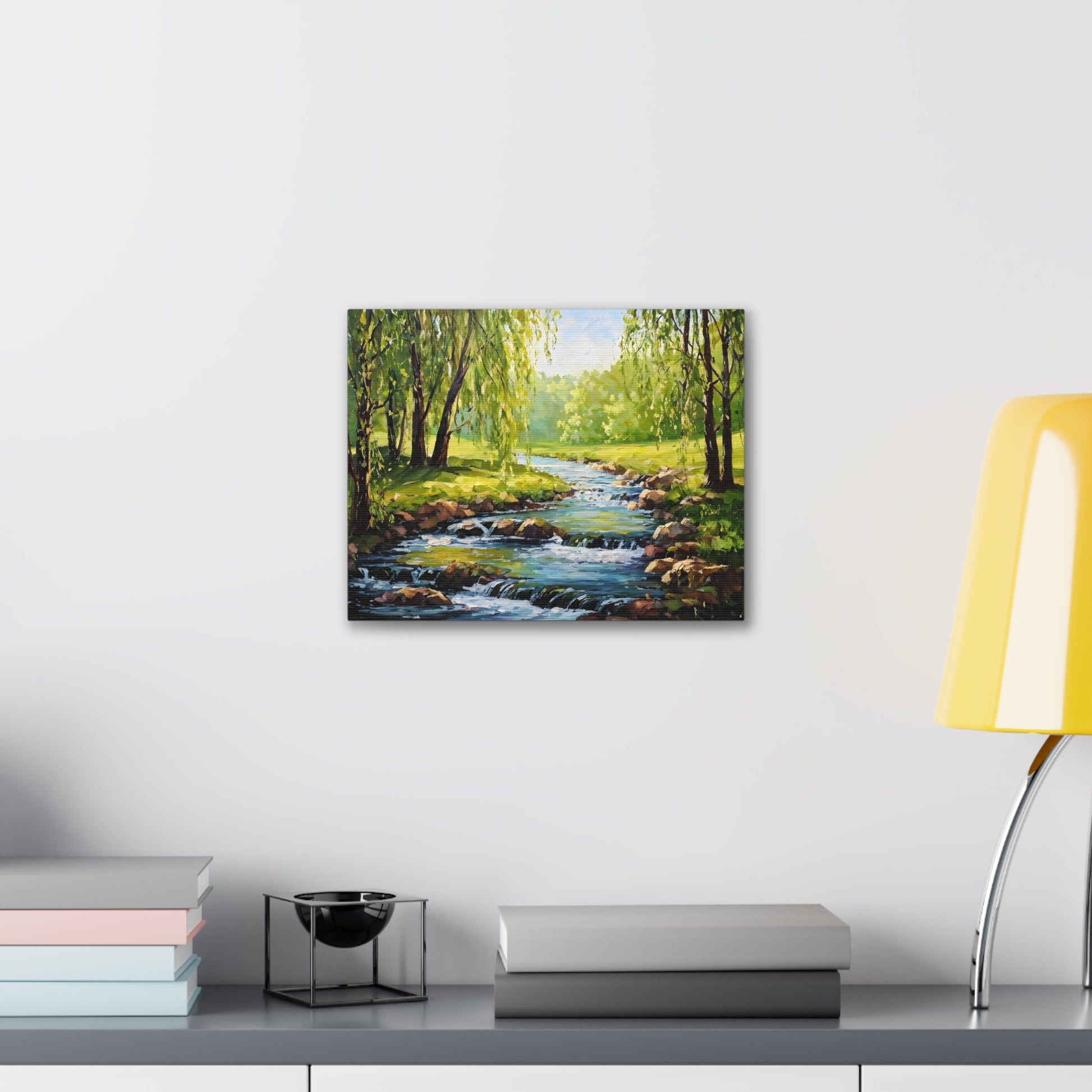 "Whispering Glade" is an enchanting oil painting that captures the peaceful essence of a forest glade bathed in sunlight. Painted on high-quality cotton canvas, this piece showcases lush greenery and a softly flowing stream, creating a serene and soothing scene. Perfect for bringing a touch of tranquility to your indoor space, "Whispering Glade" is designed for indoor use only.