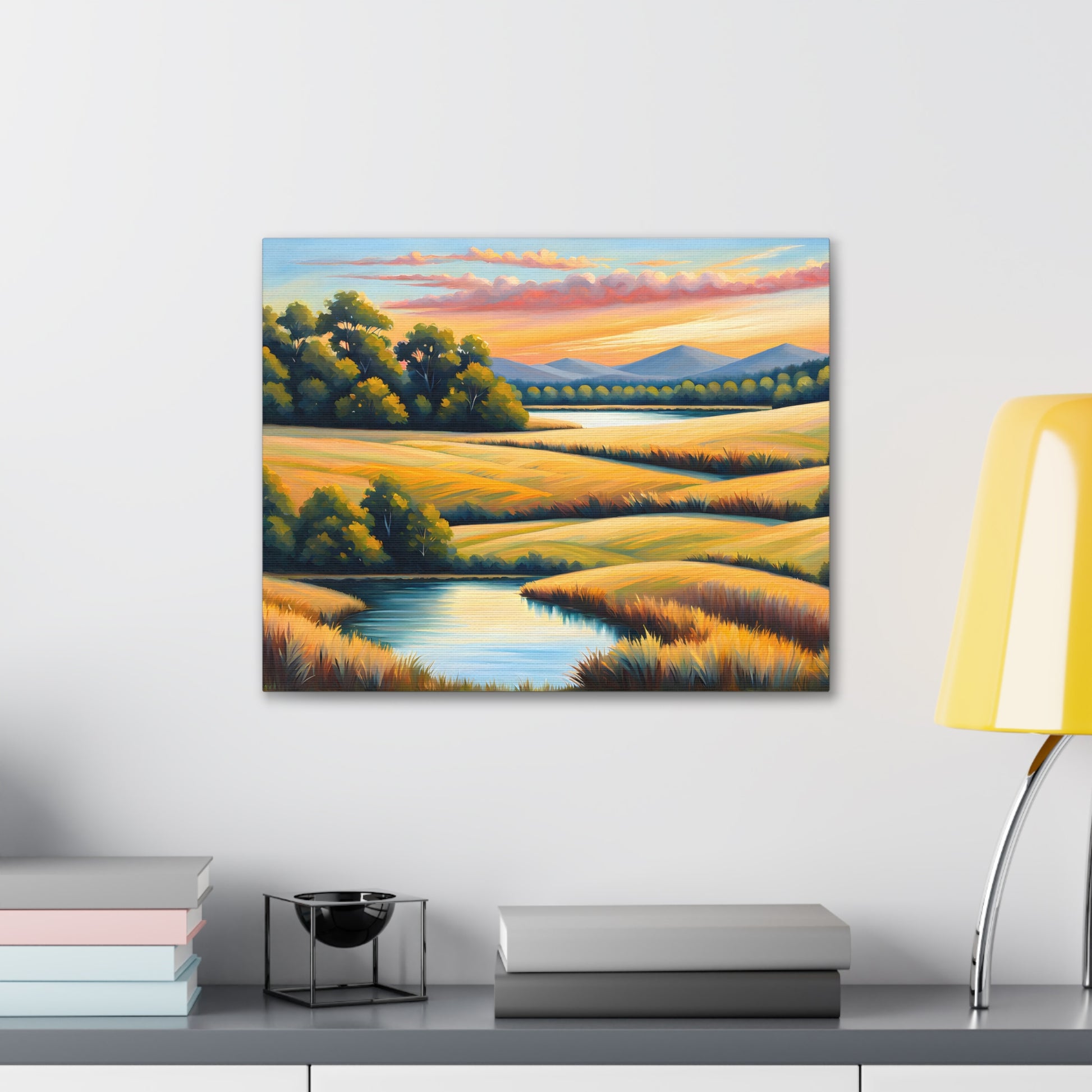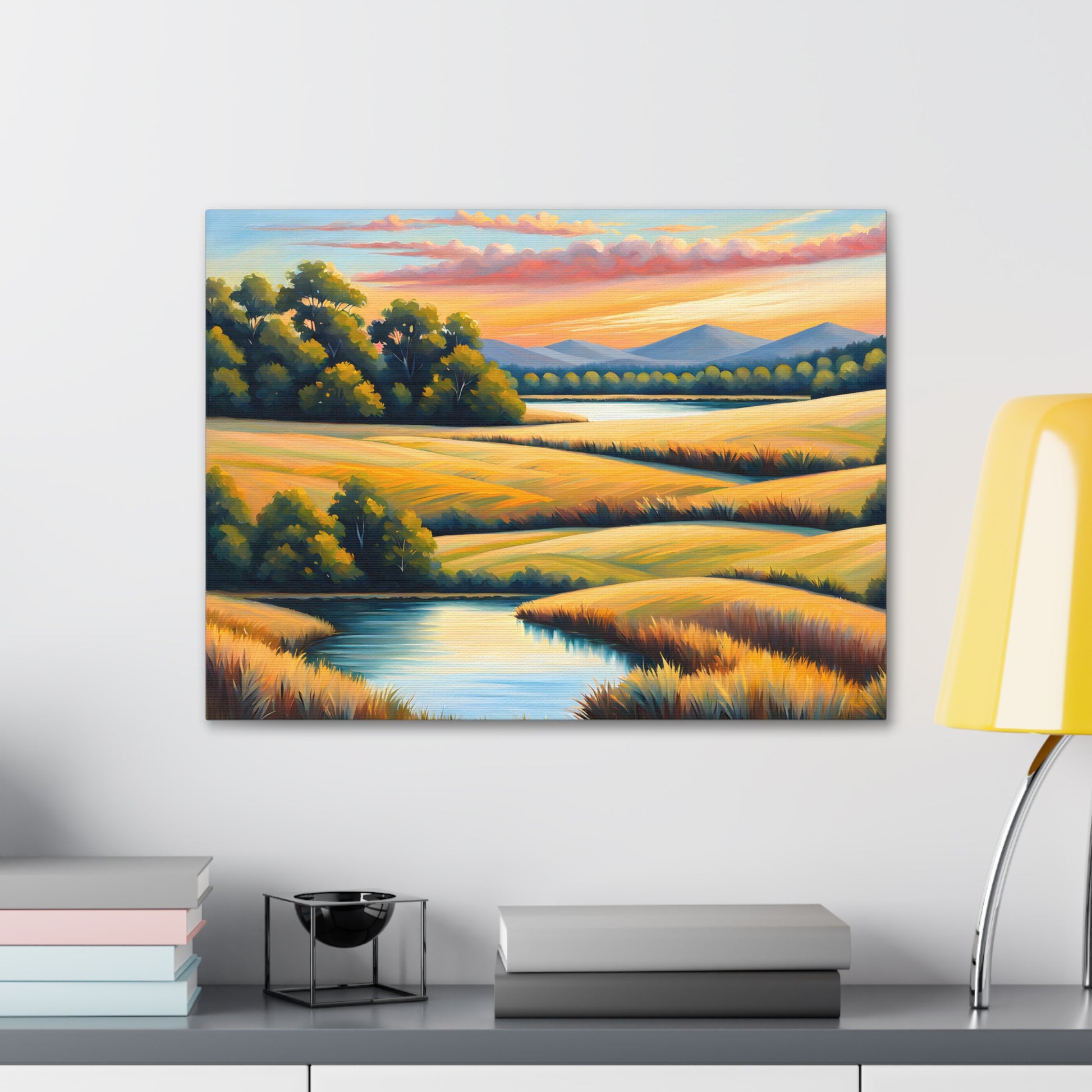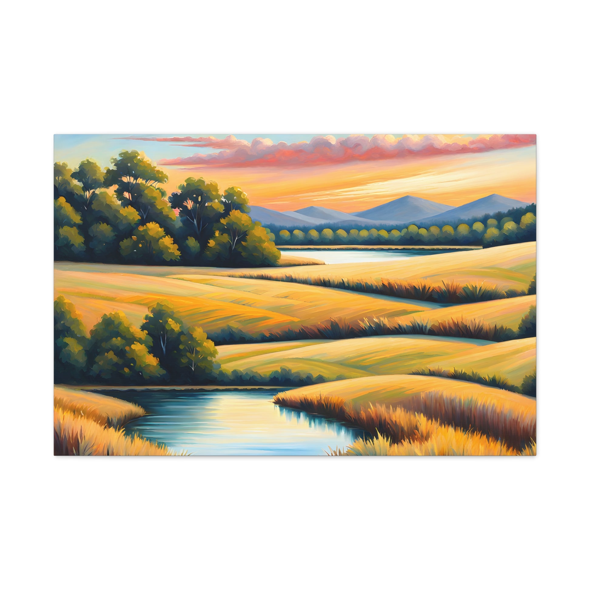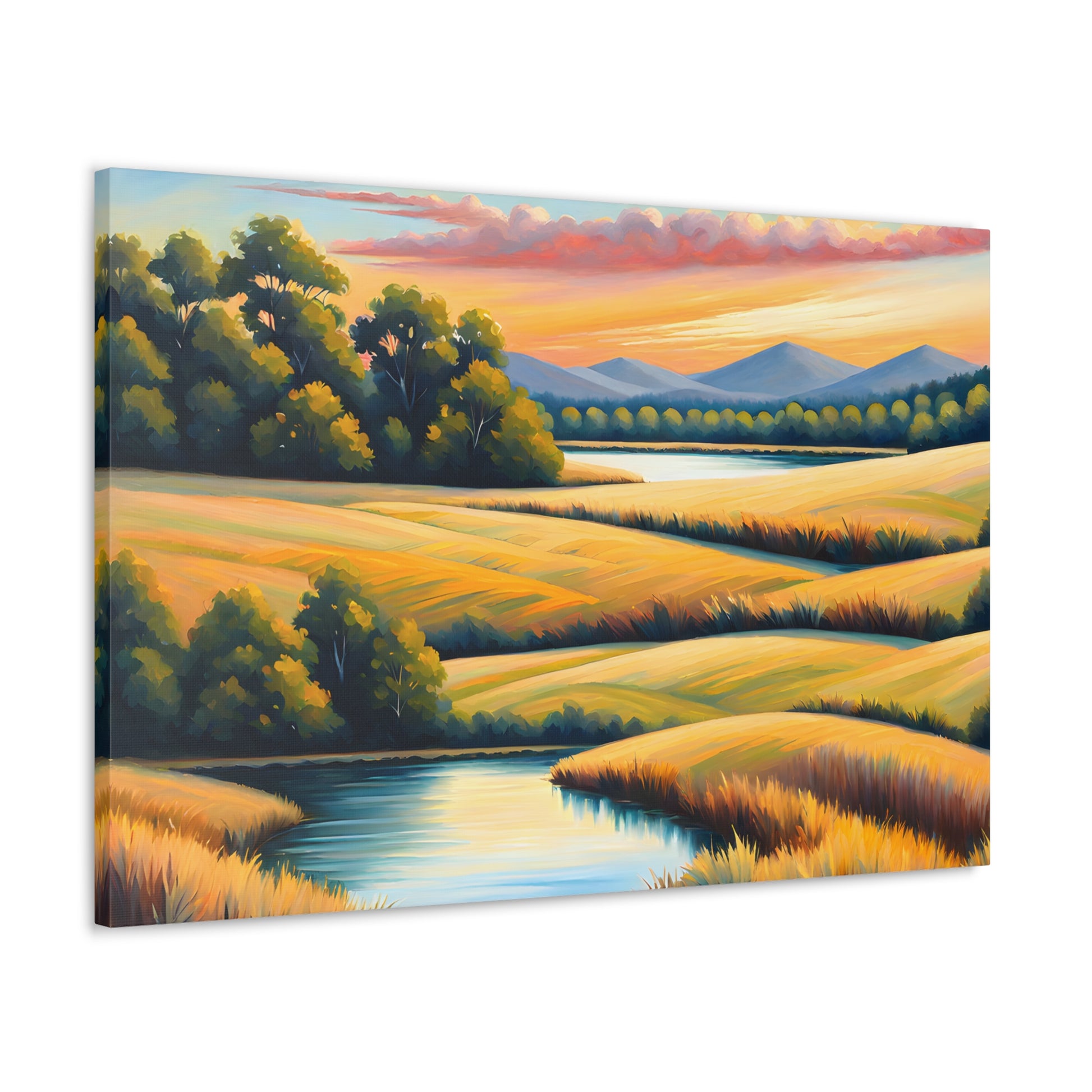 Escape to the calm of "Whispering Meadows," where golden fields stretch out under a soft, colorful sky. This oil painting captures the peaceful beauty of nature’s quiet moments, perfect for bringing warmth to your home.