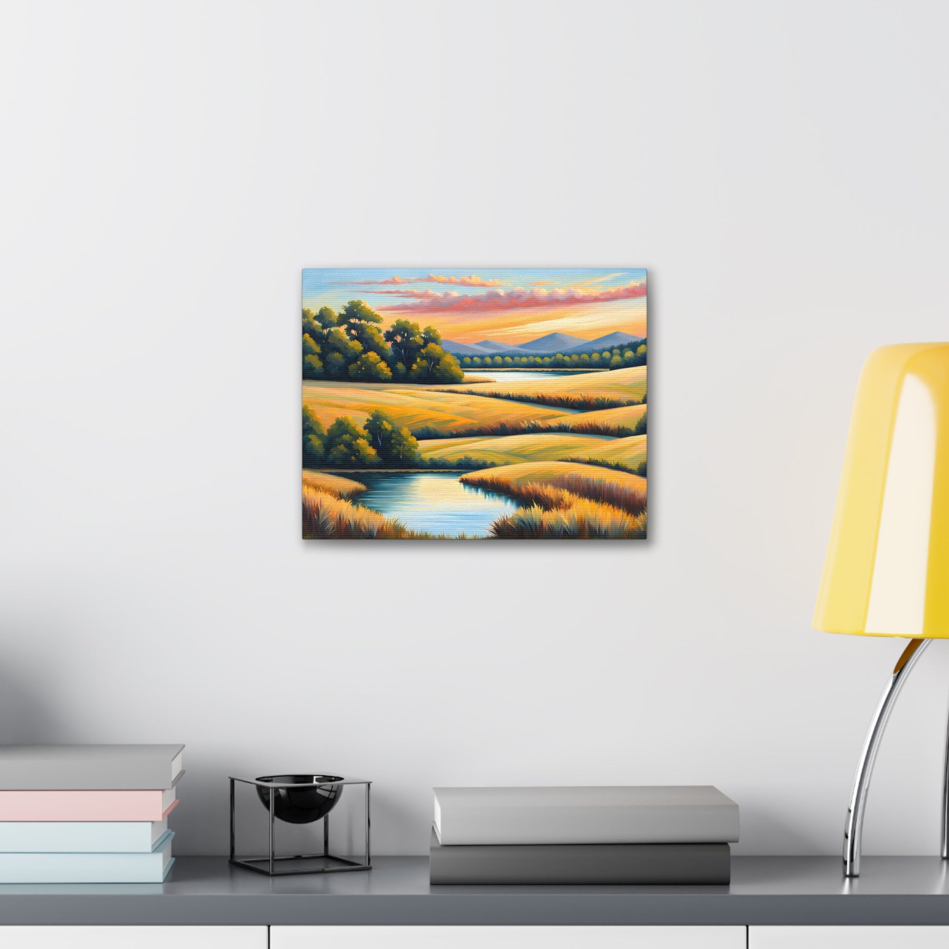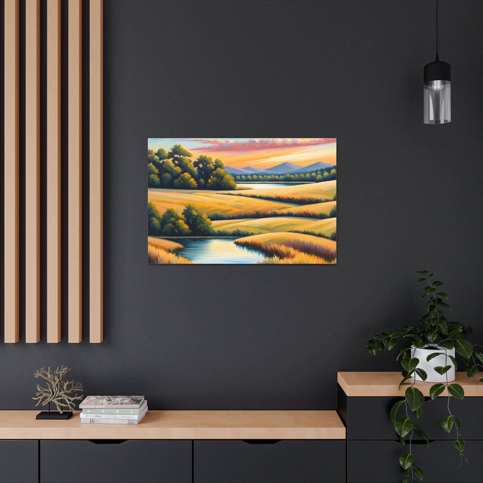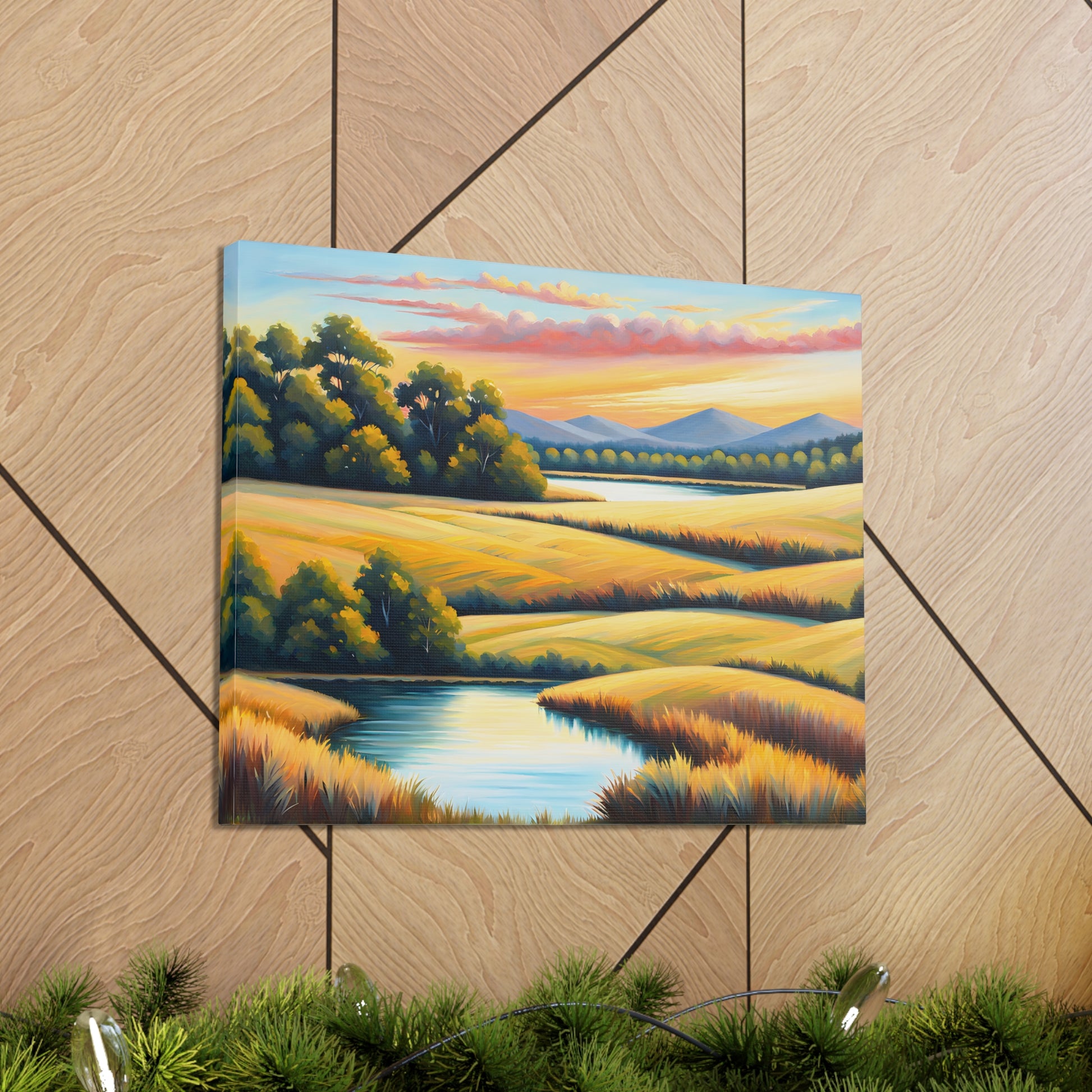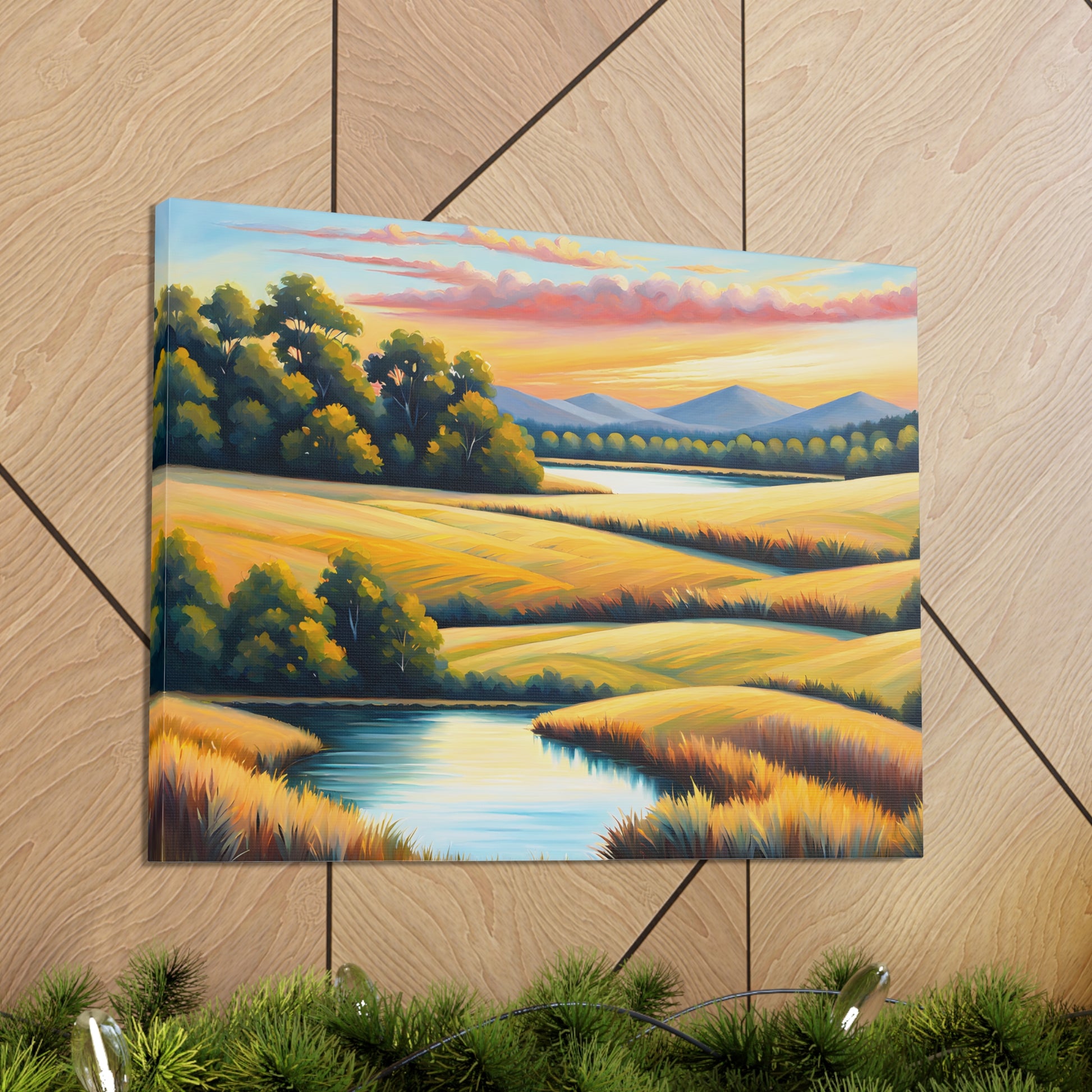Escape to the calm of "Whispering Meadows," where golden fields stretch out under a soft, colorful sky. This oil painting captures the peaceful beauty of nature’s quiet moments, perfect for bringing warmth to your home.