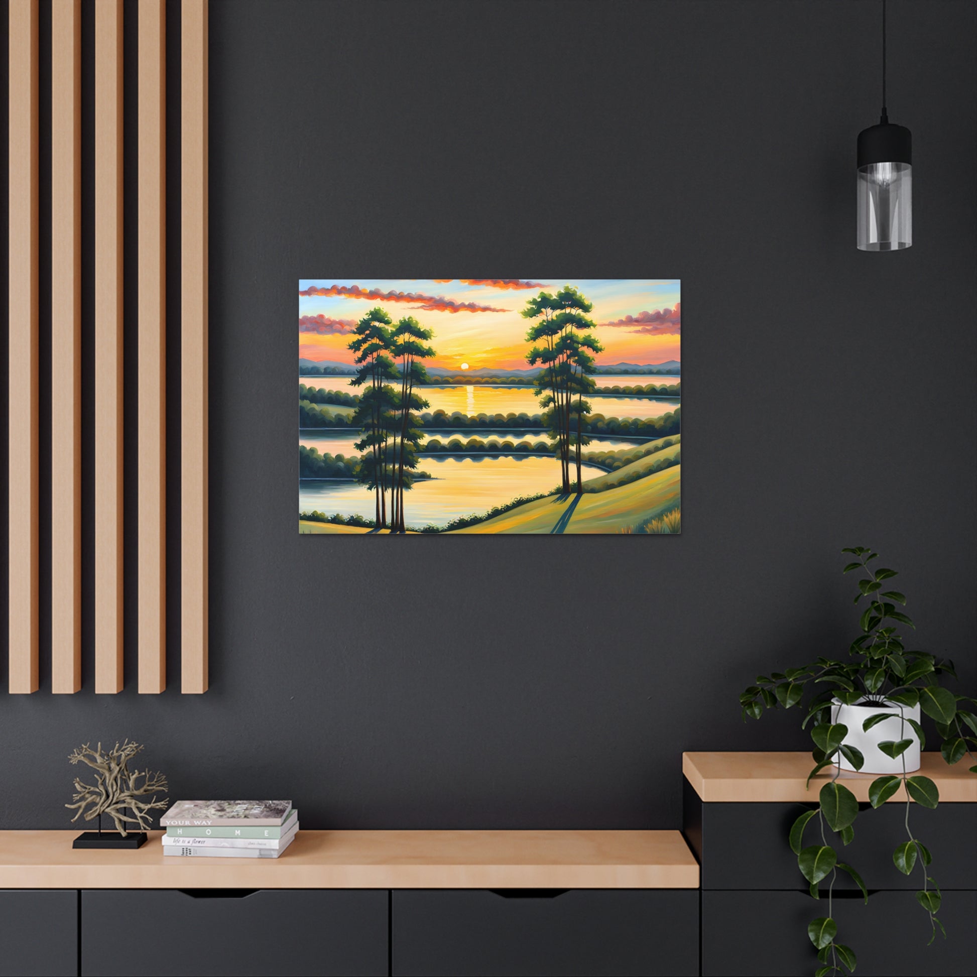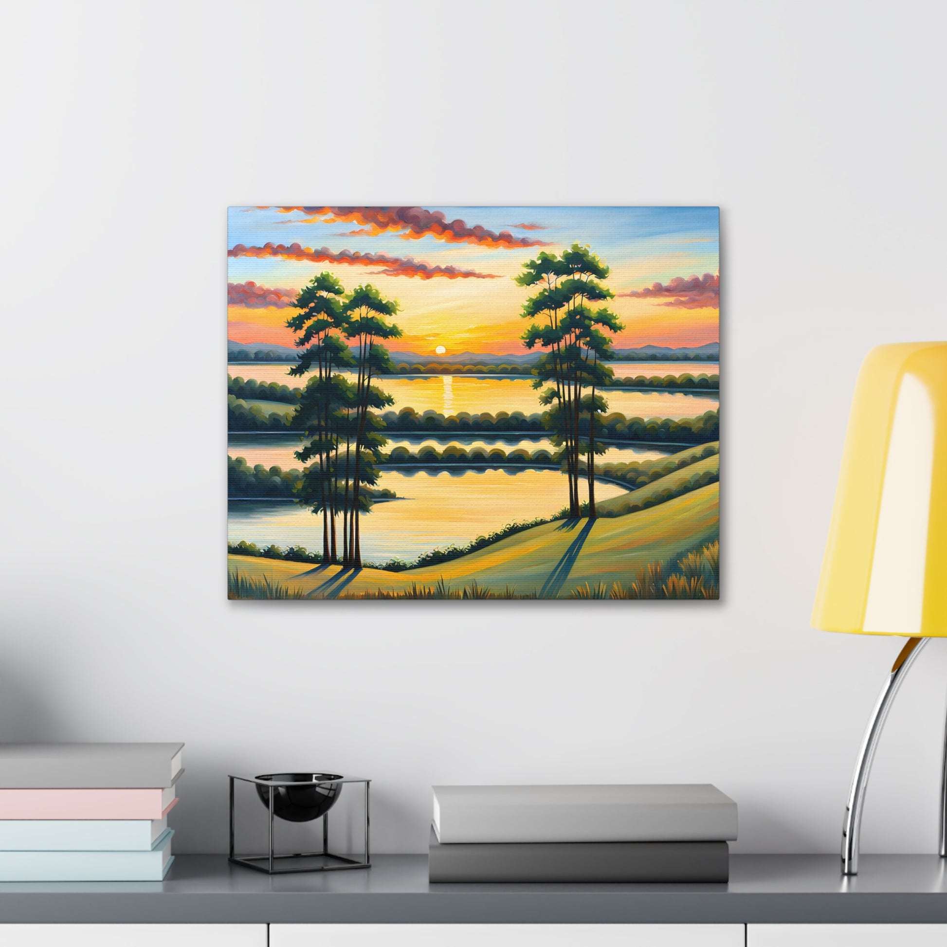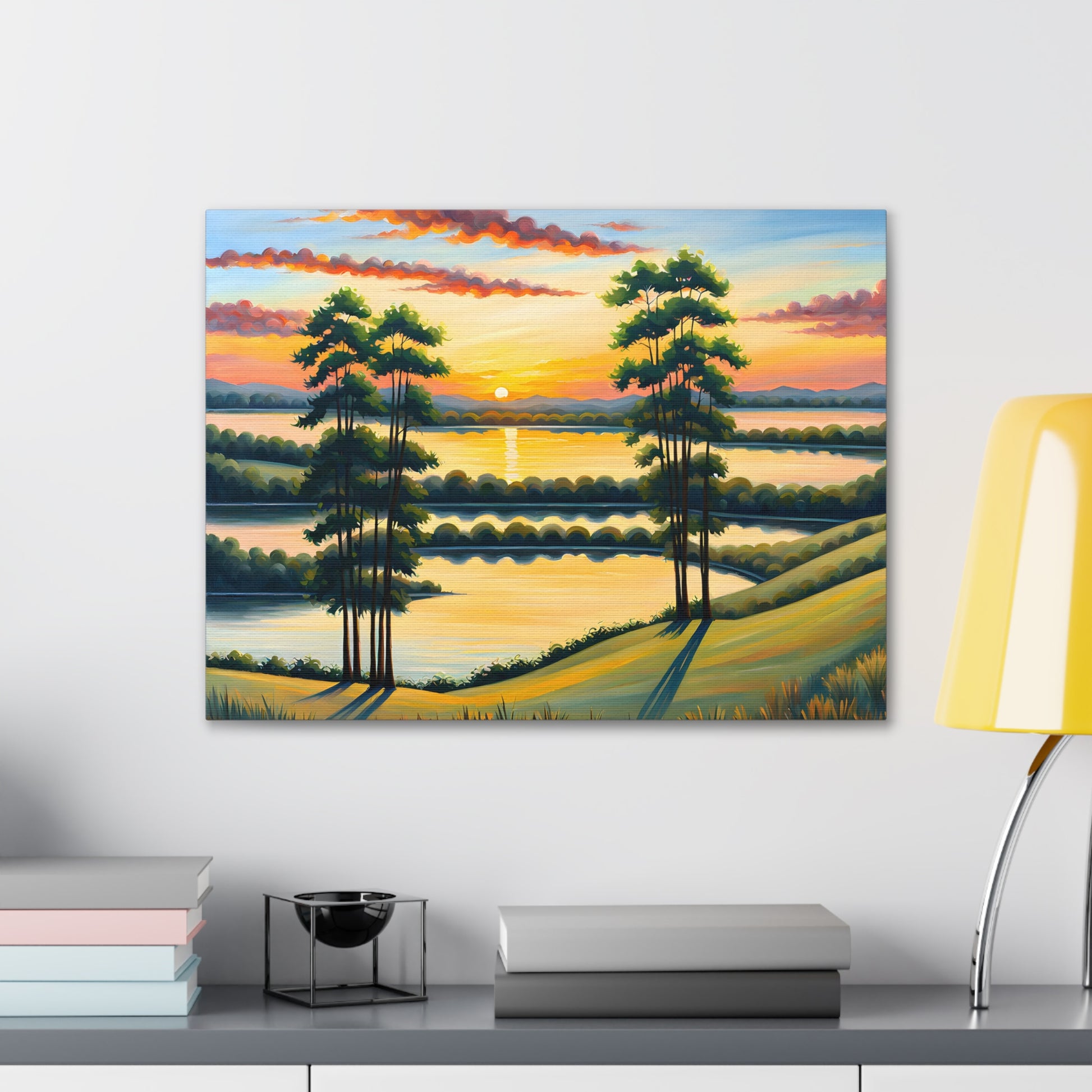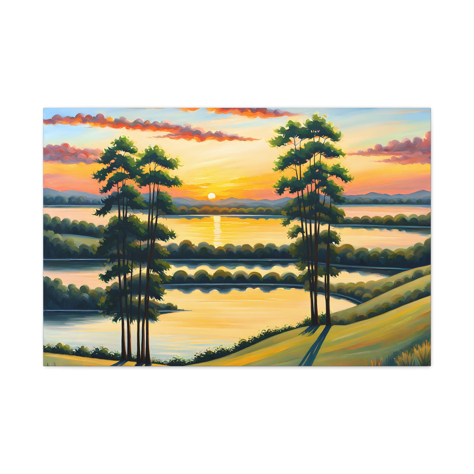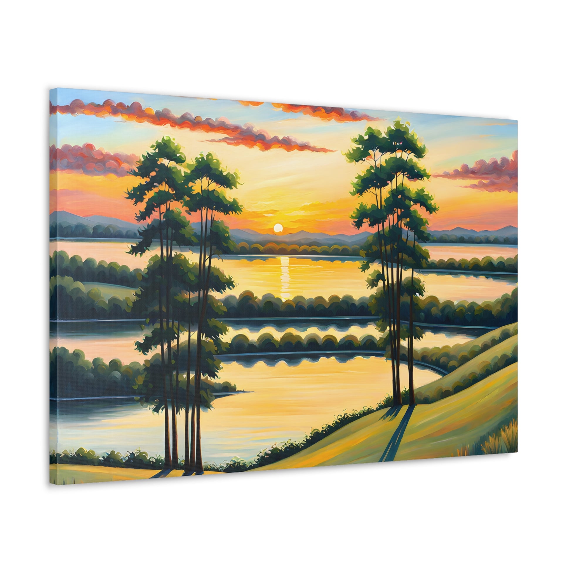 Let the calming beauty of nature flow into your home with "Whispering Willows." This serene landscape captures the gentle swaying of trees and the glow of the setting sun over peaceful waters, creating a tranquil atmosphere perfect for any space.