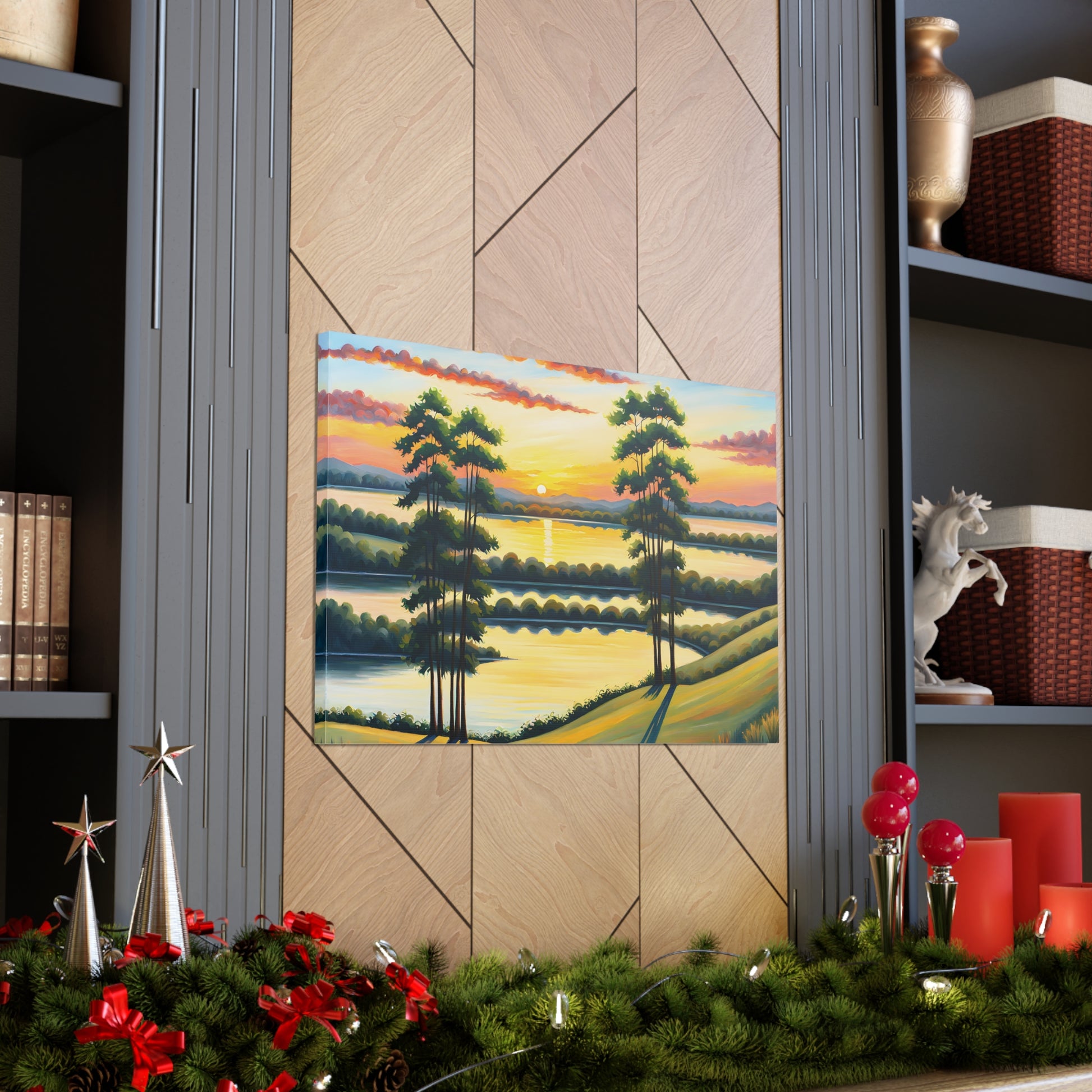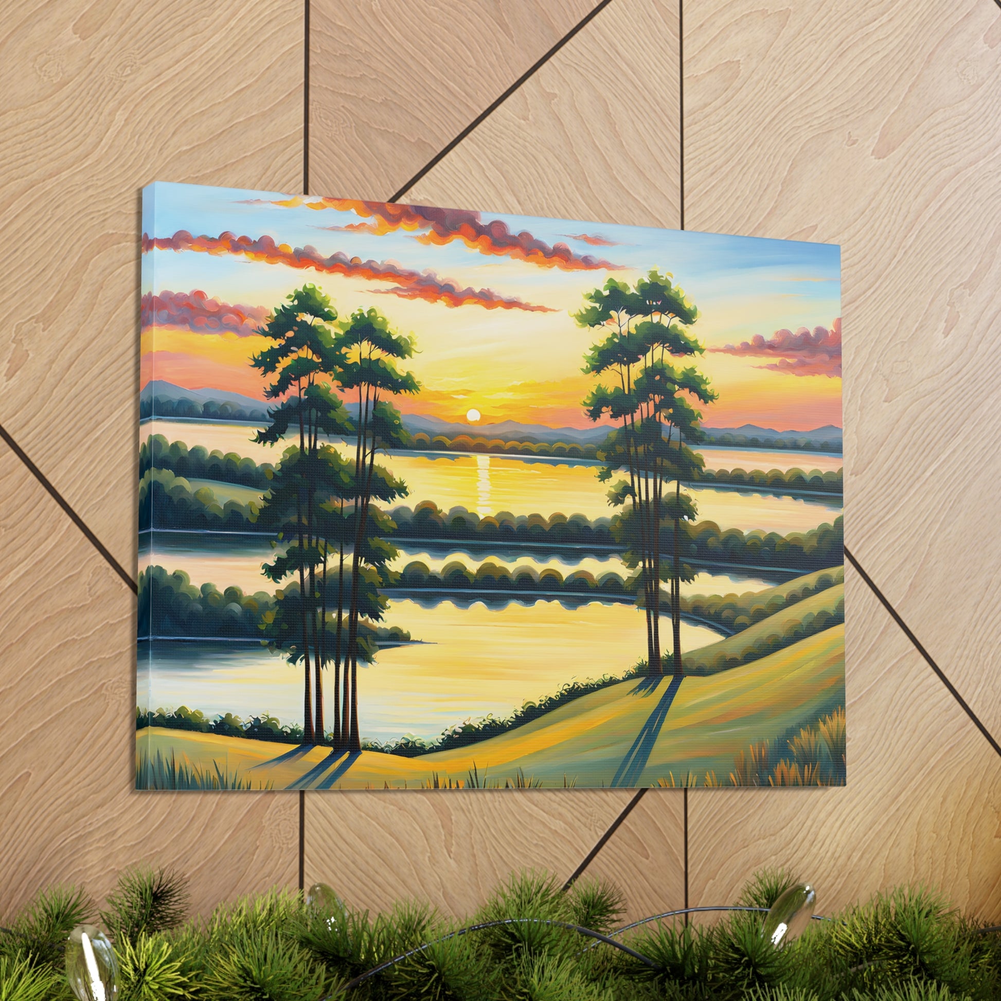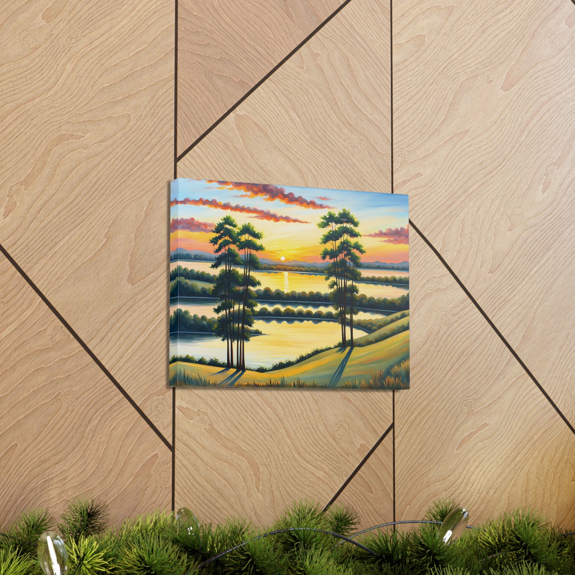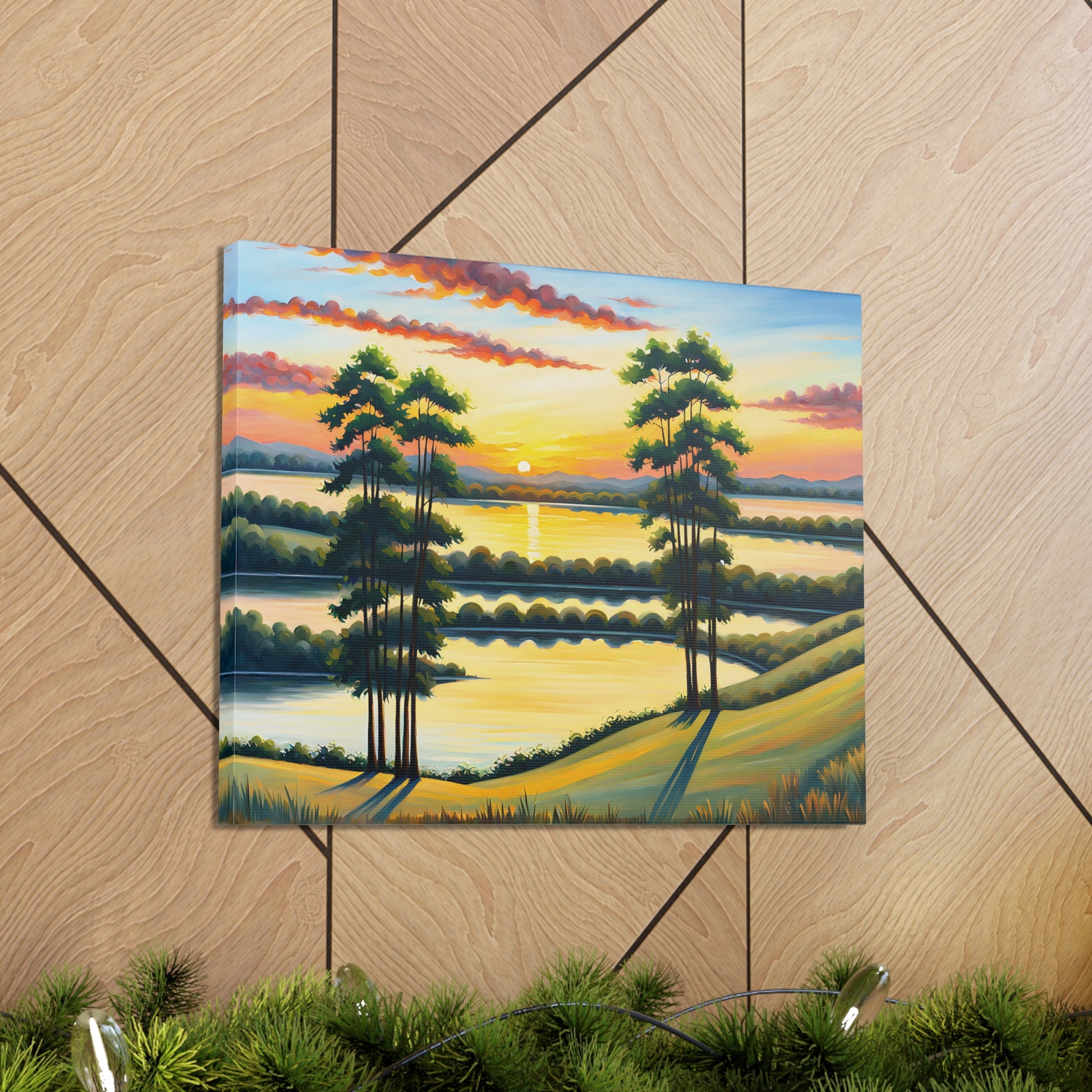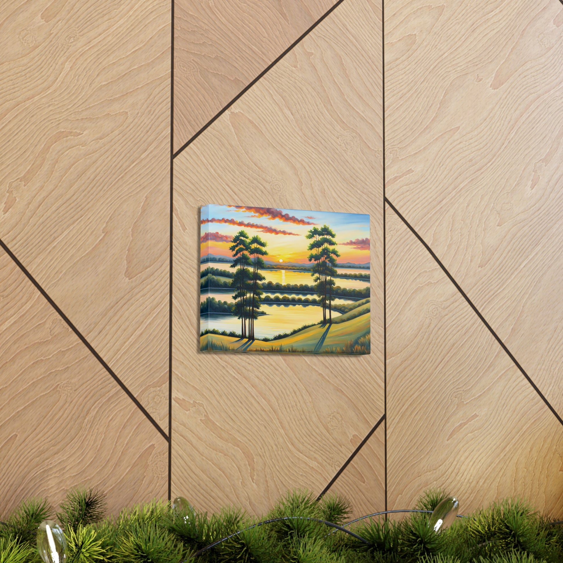 Let the calming beauty of nature flow into your home with "Whispering Willows." This serene landscape captures the gentle swaying of trees and the glow of the setting sun over peaceful waters, creating a tranquil atmosphere perfect for any space.