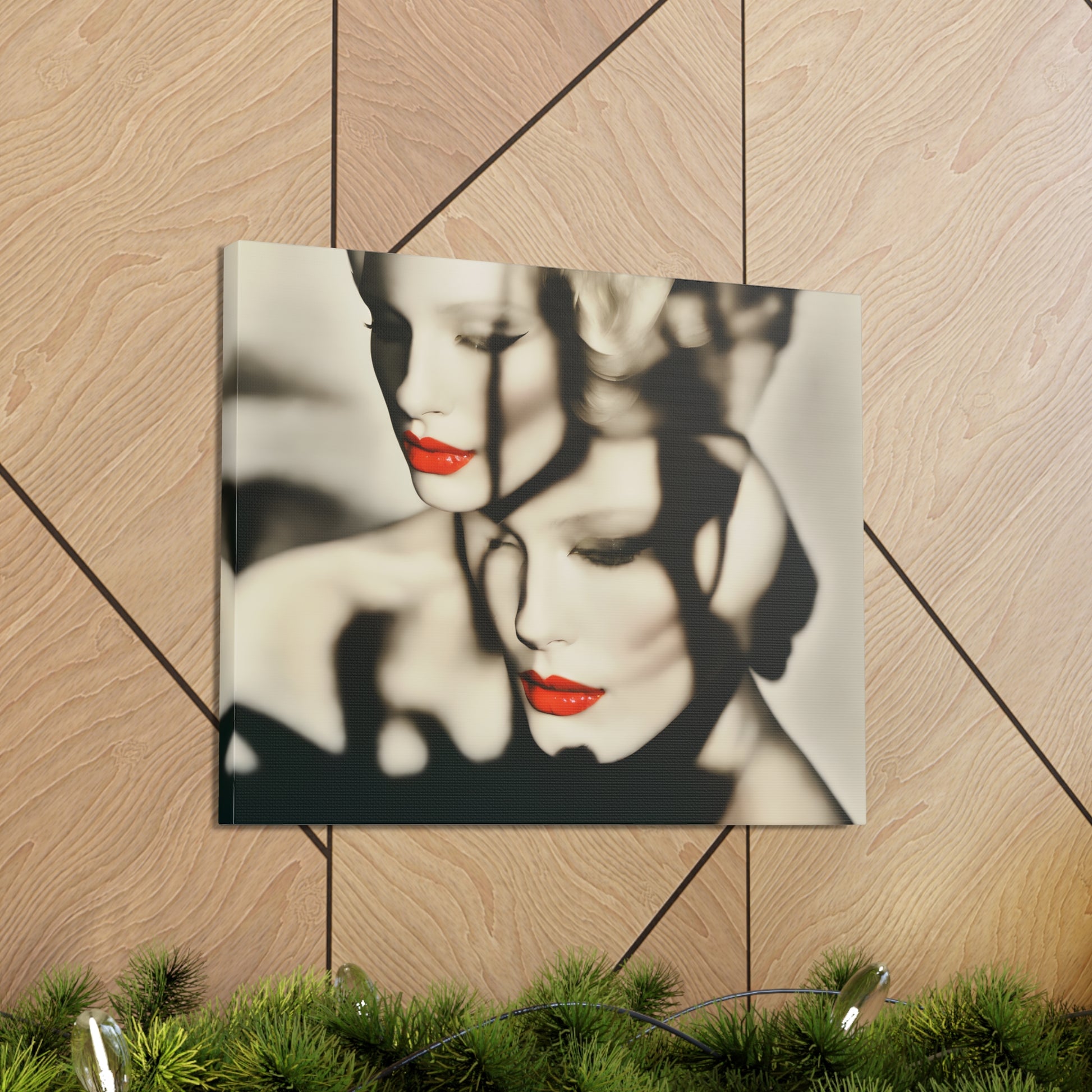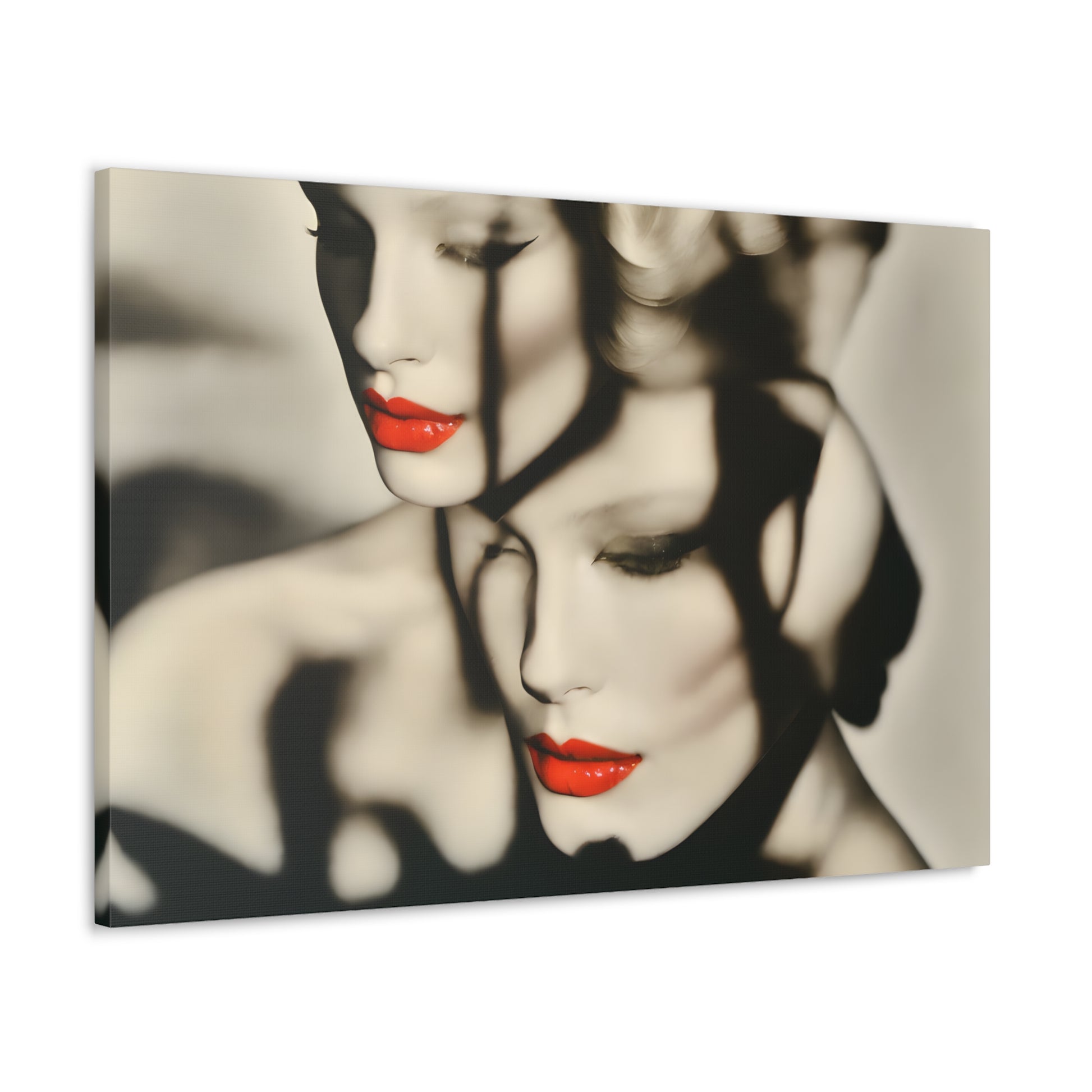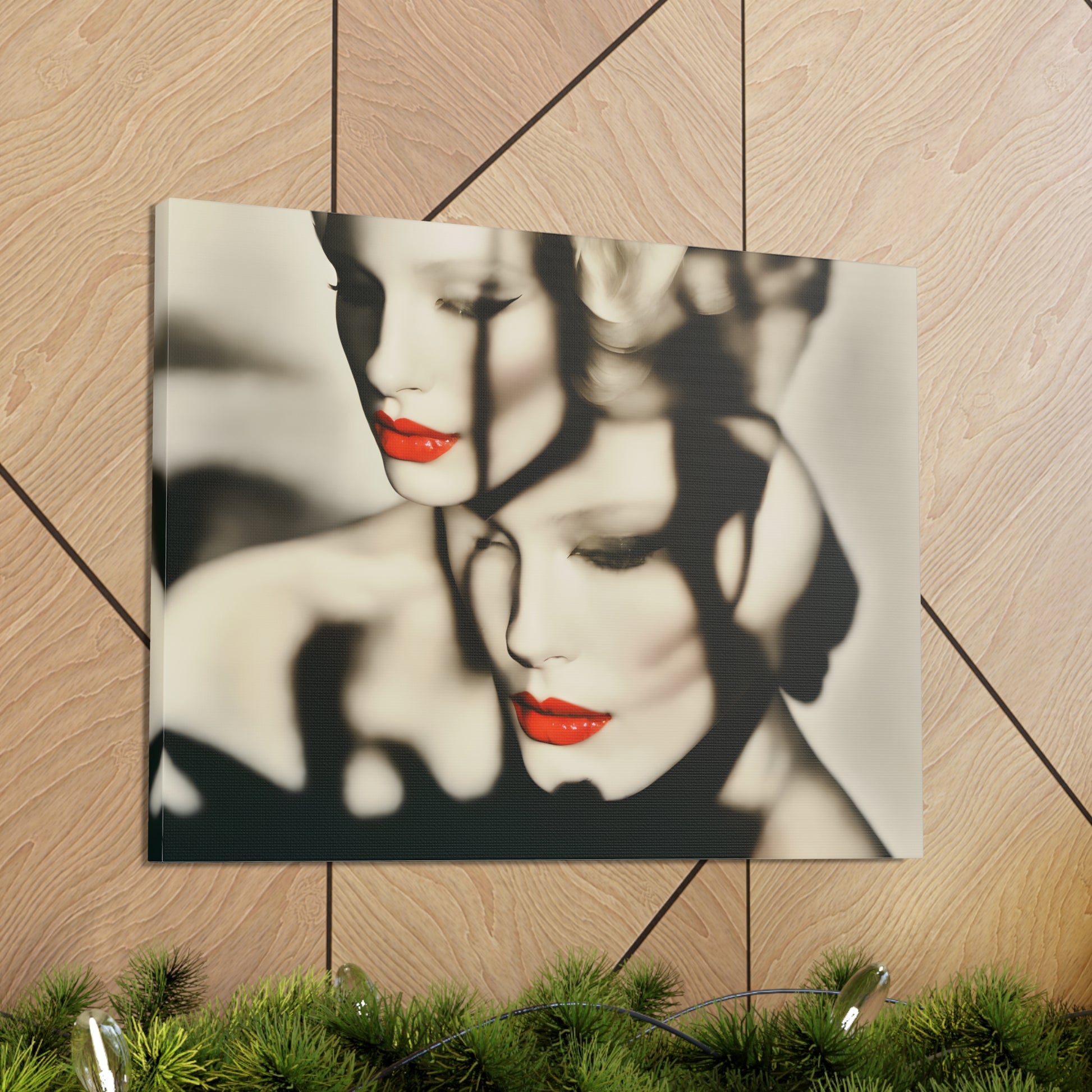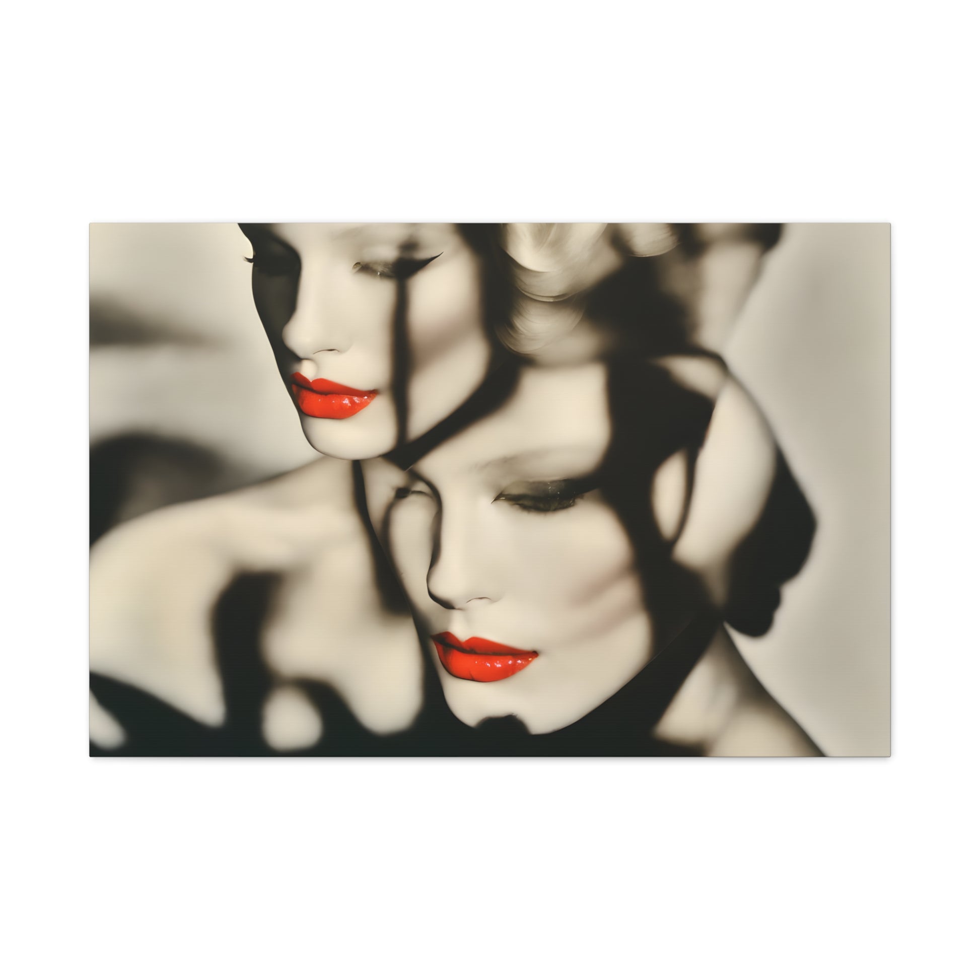 Indulge in the timeless allure of "Whispers of Elegance: Iconic Wall Décor." This captivating canvas artwork weaves a narrative of refined beauty and sophistication, featuring a repeating pattern of a lady with closed eyes and scarlet lips, gracefully adorned in hues of white and grey.