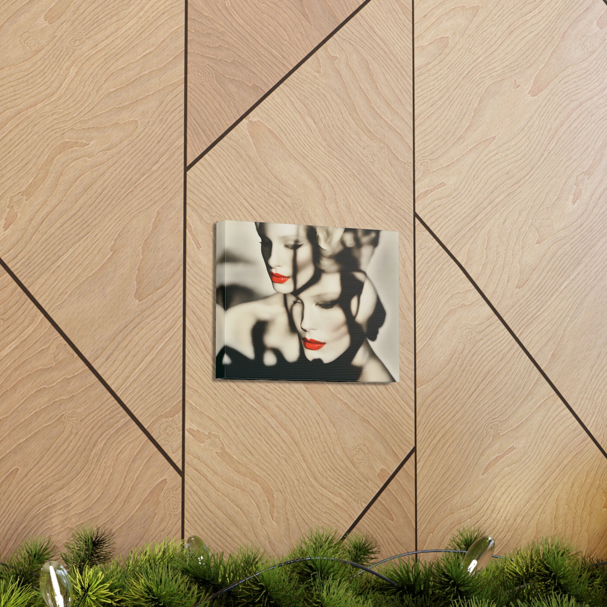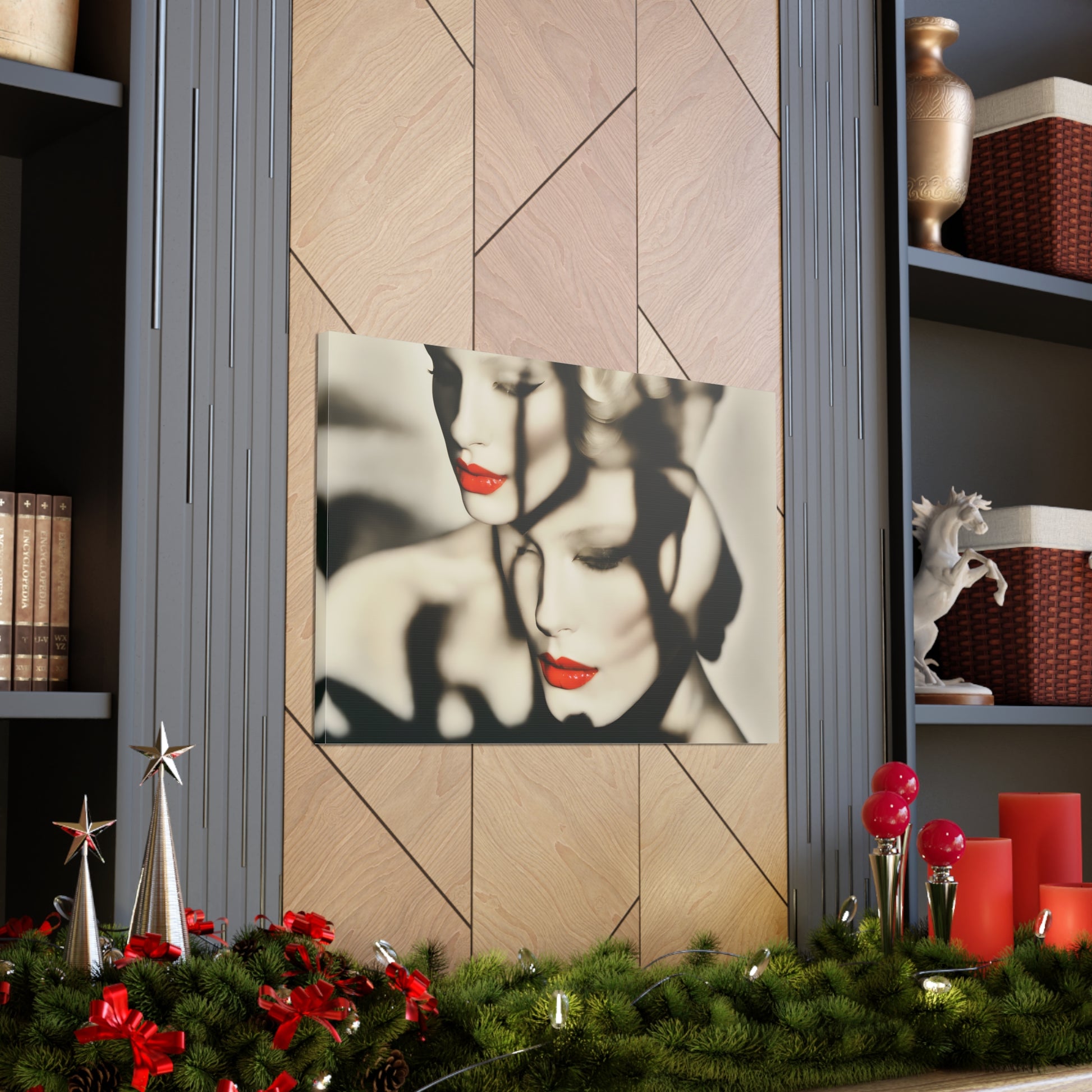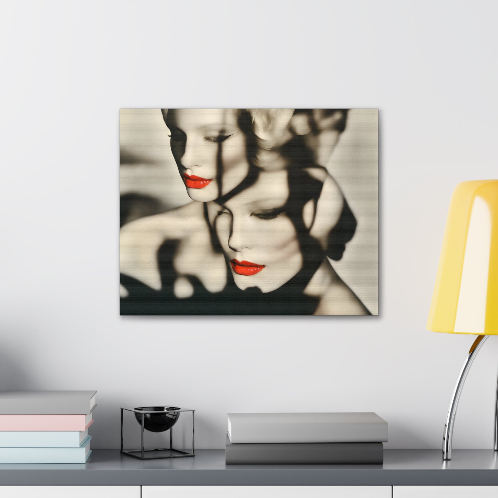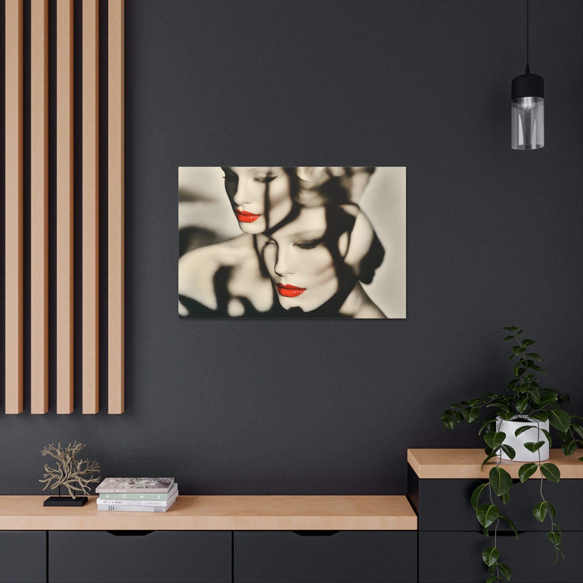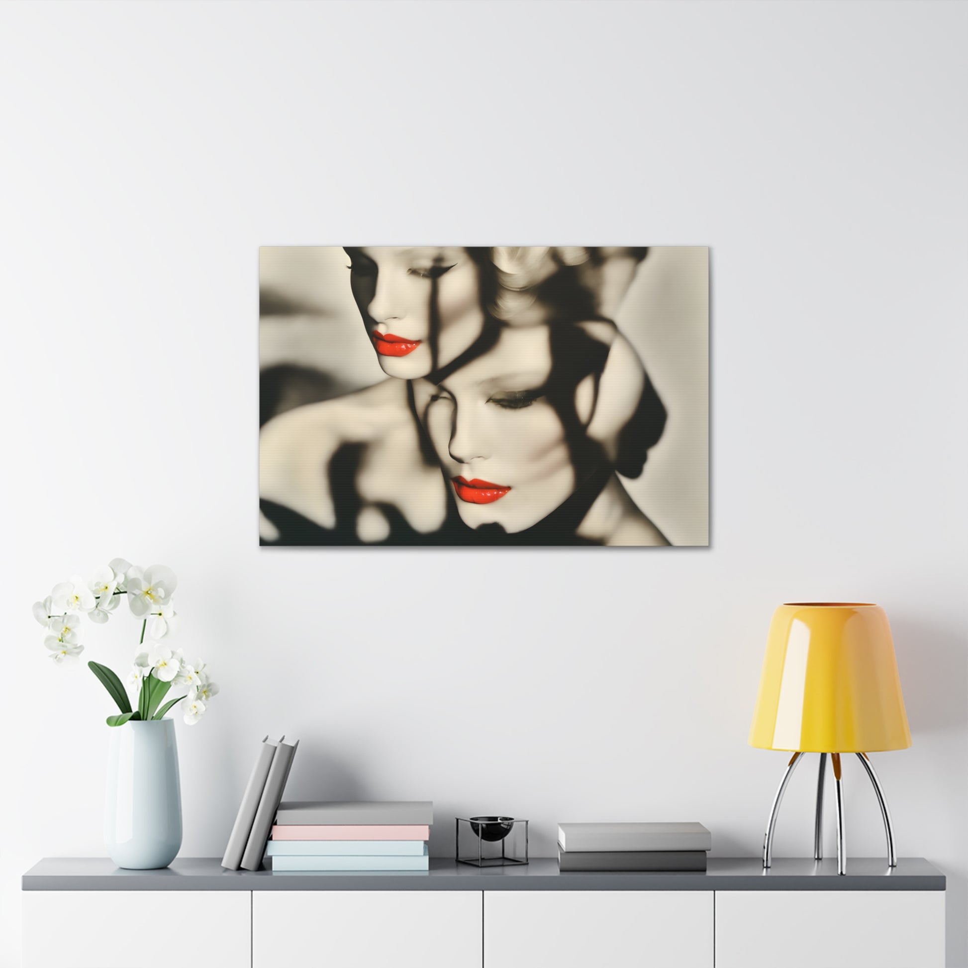 Indulge in the timeless allure of "Whispers of Elegance: Iconic Wall Décor." This captivating canvas artwork weaves a narrative of refined beauty and sophistication, featuring a repeating pattern of a lady with closed eyes and scarlet lips, gracefully adorned in hues of white and grey.